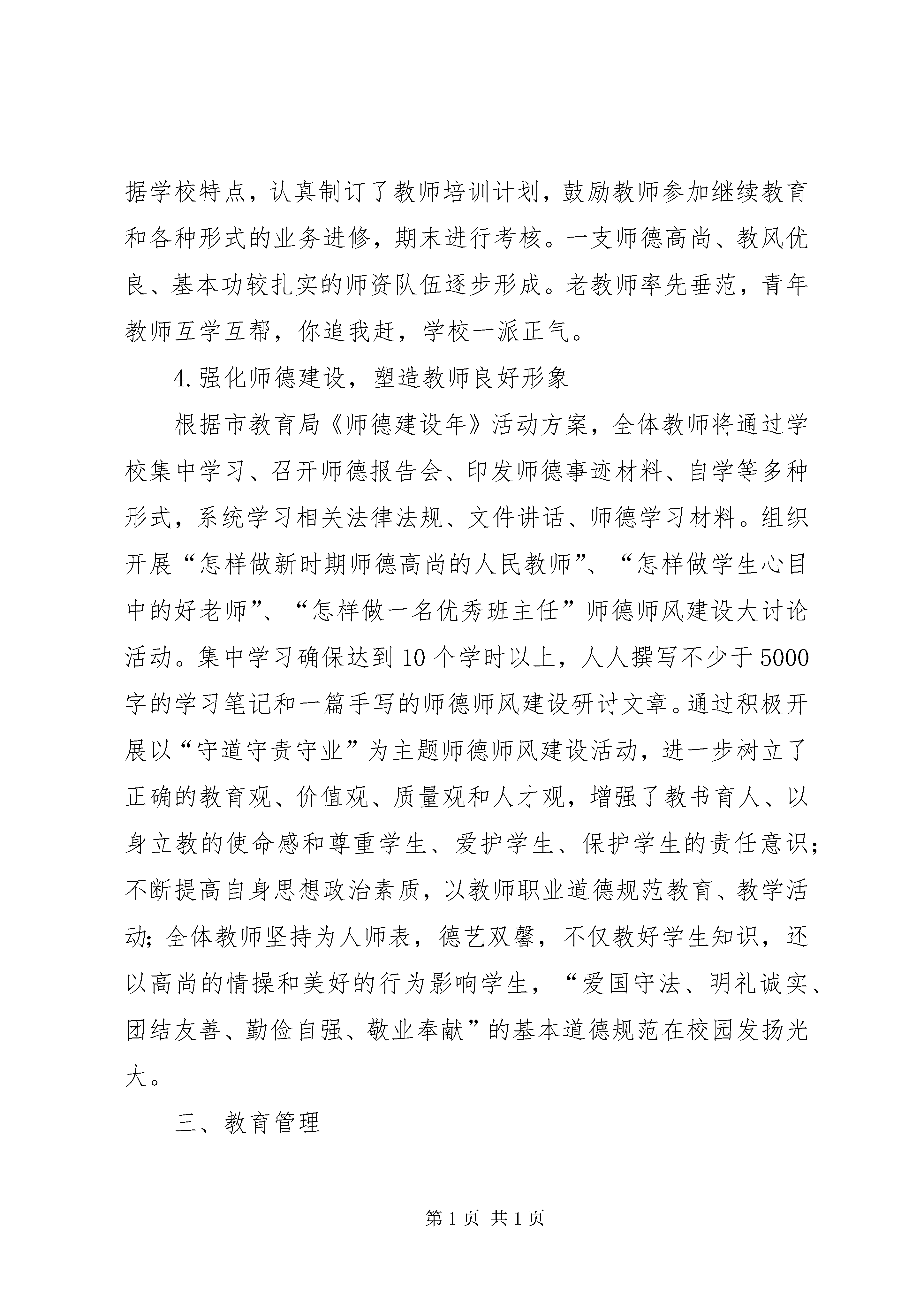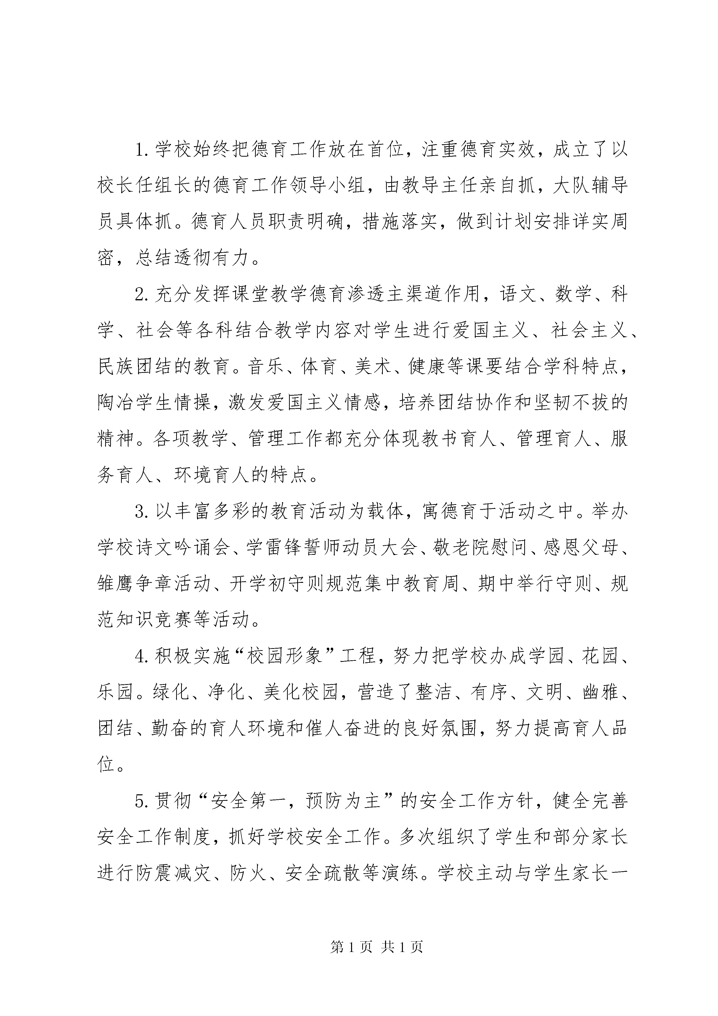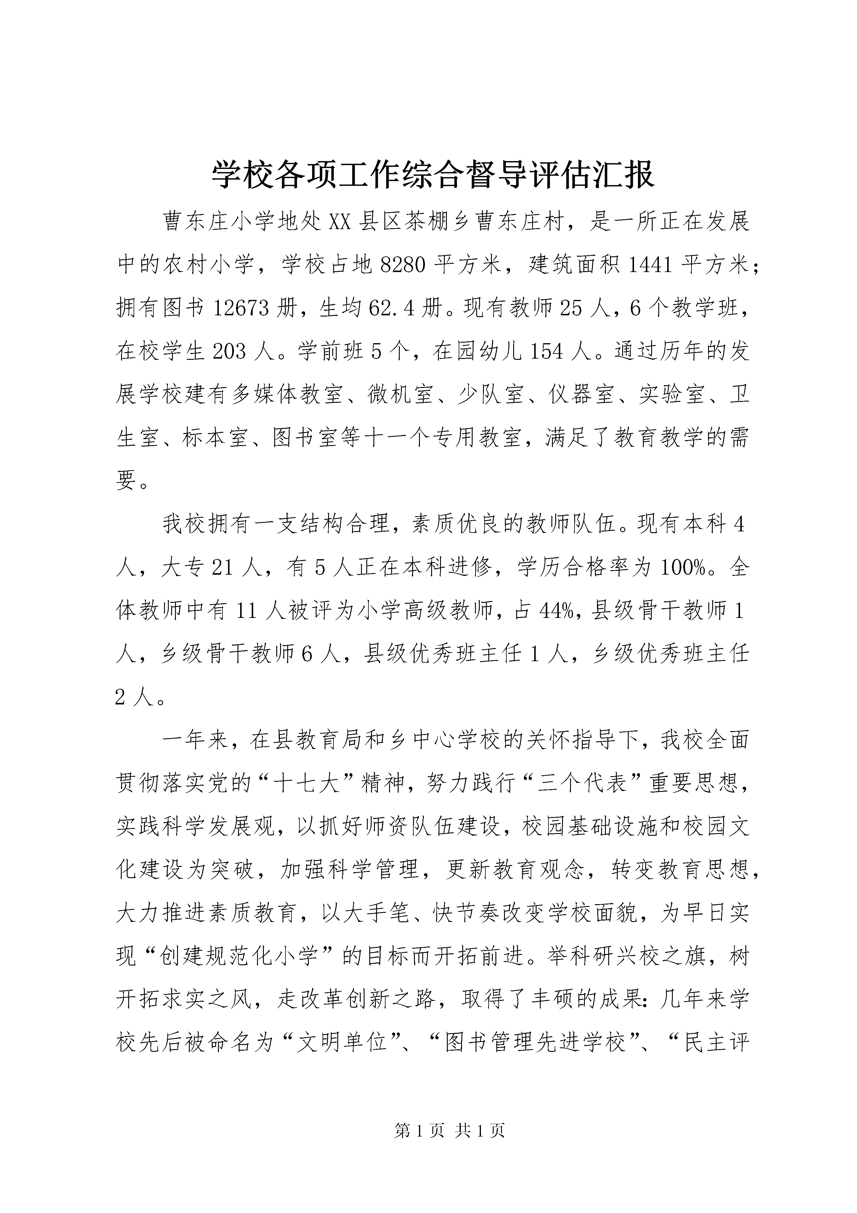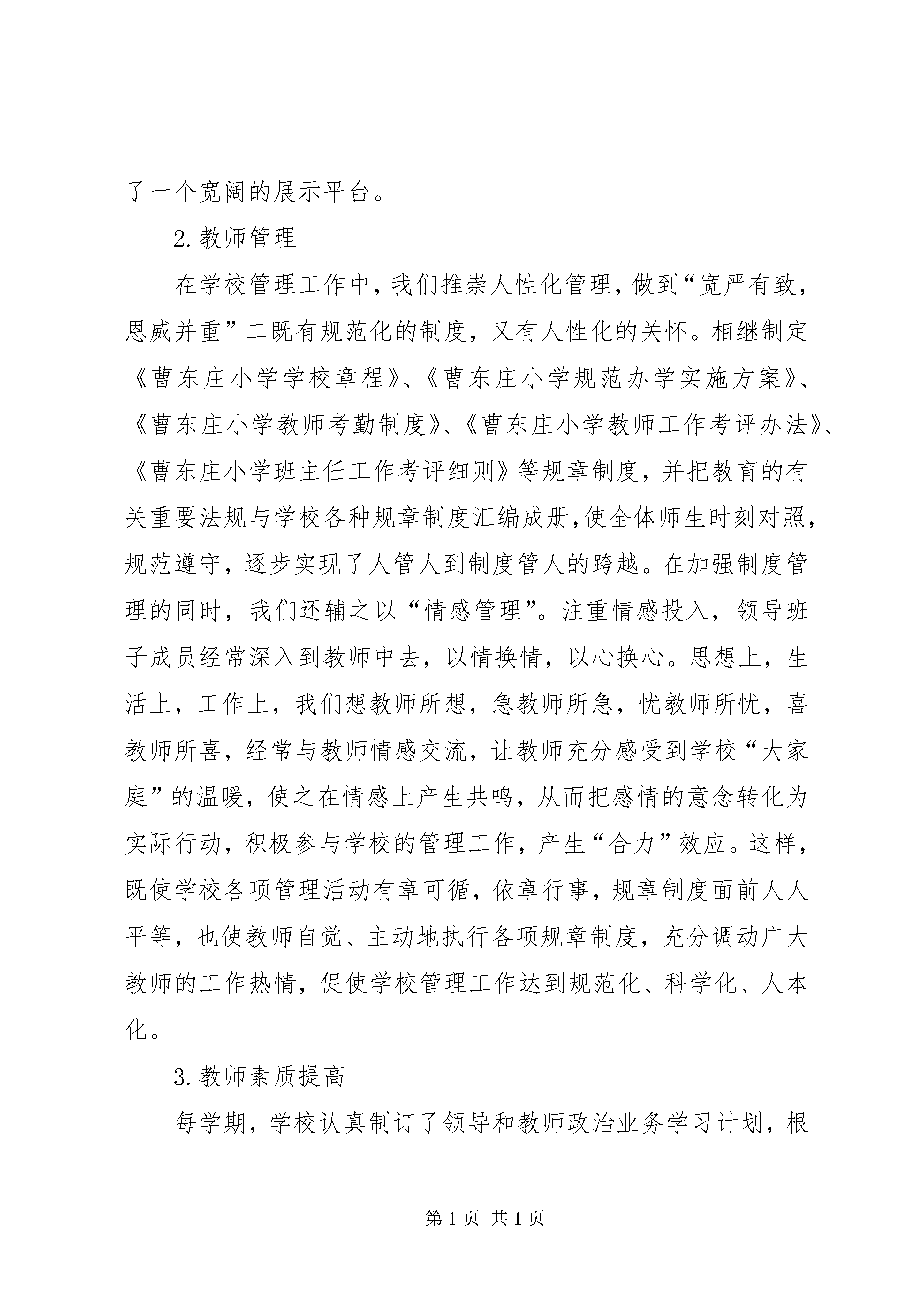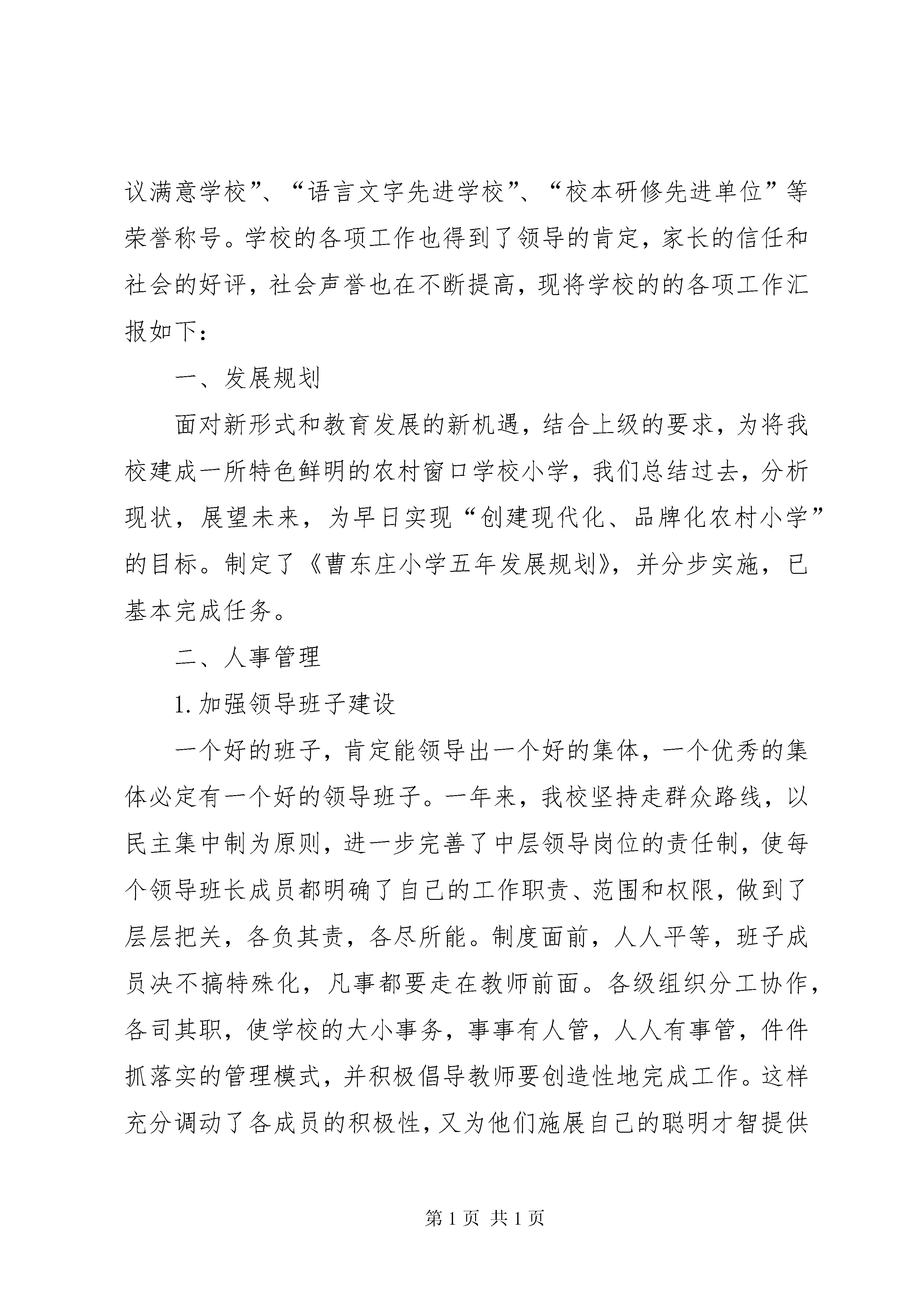 学校各项工作综合督导评估汇报曹东庄小学地处XX县区茶棚乡曹东庄村,是一所正在发展中的农村小学,学校占地8280平方米,建筑面积1441平方米;拥有图书12673册,生均62.4册。现有教师25人,6个教学班,在校学生203人。学前班5个,在园幼儿154人。通过历年的发展学校建有多媒体教室、微机室、少队室、仪器室、实验室、卫生室、标本室、图书室等十一个专用教室,满足了教育教学的需要。我校拥有一支结构合理,素质优良的教师队伍。现有本科4人,大专21人,有5人正在本科进修,学历合格率为100%。全体教师中有11人被评为小学高级教师,占44%,县级骨干教师1人,乡级骨干教师6人,县级优秀班主任1人,乡级优秀班主任2人。一年来,在县教育局和乡中心学校的关怀指导下,我校全面贯彻落实党的“十七大”精神,努力践行“三个代表”重要思想,实践科学发展观,以抓好师资队伍建设,校园基础设施和校园文化建设为突破,加强科学管理,更新教育观念,转变教育思想,大力推进素质教育,以大手笔、快节奏改变学校面貌,为早日实现“创建规范化小学”的目标而开拓前进。举科研兴校之旗,树开拓求实之风,走改革创新之路,取得了丰硕的成果:几年来学校先后被命名为“文明单位”、“图书管理先进学校”、“民主评议满意学校”、“语言文字先进学校”、“校本研修先进单位”等荣誉称号。学校的各项工作也得到了领导的肯定,家长的信任和社会的好评,社会声誉也在不断提高,现将学校的的各项工作汇报如下:一、发展规划面对新形式和教育发展的新机遇,结合上级的要求,为将我校建成一所特色鲜明的农村窗口学校小学,我们总结过去,分析现状,展望未来,为早日实现“创建现代化、品牌化农村小学”的目标。制定了《曹东庄小学五年发展规划》,并分步实施,已基本完成任务。二、人事管理1.加强领导班子建设一个好的班子,肯定能领导出一个好的集体,一个优秀的集体必定有一个好的领导班子。一年来,我校坚持走群众路线,以民主集中制为原则,进一步完善了中层领导岗位的责任制,使每个领导班长成员都明确了自己的工作职责、范围和权限,做到了层层把关,各负其责,各尽所能。制度面前,人人平等,班子成员决不搞特殊化,凡事都要走在教师前面。各级组织分工协作,各司其职,使学校的大小事务,事事有人管,人人有事管,件件抓落实的管理模式,并积极倡导教师要创造性地完成工作。这样充分调动了各成员的积极性,又为他们施展自己的聪明才智提供了一个宽阔的展示平台。2.教师管理在学校管理工作中,我们推崇人性化管理,做到“宽严有致,恩威并重”二既有规范化的制度,又有人性化的关怀。相继制定《曹东庄小学学校章程》、《曹东庄小学规范办学实施方案》、《曹东庄小学教师考勤制度》、《曹东庄小学教师工作考评办法》、《曹东庄小学班主任工作考评细则》等规章制度,并把教育的有关重要法规与学校各种规章制度汇编成册,使全体师生时刻对照,规范遵守,逐步实现了人管人到制度管人的跨越。在加强制度管理的同时,我们还辅之以“情感管理”。注重情感投入,领导班子成员经常深入到教师中去,以情换情,以心换心。思想上,生活上,工作上,我们想教师所想,急教师所急,忧教师所忧,喜教师所喜,经常与教师情感交流,让教师充分感受到学校“大家庭”的温暖,使之在情感上产生共鸣,从而把感情的意念转化为实际行动,积极参与学校的管理工作,产生“合力”效应。这样,既使学校各项管理活动有章可循,依章行事,规章制度面前人人平等,也使教师自觉、主动地执行各项规章制度,充分调动广大教师的工作热情,促使学校管理工作达到规范化、科学化、人本化。3.教师素质提高每学期,学校认真制订了领导和教师政治业务学习计划,根据学校特点,认真制订了教师培训计划,鼓励教师参加继续教育和各种形式的业务进修,期末进行考核。一支师德高尚、教风优良、基本功较扎实的师资队伍逐步形成。老教师率先垂范,青年教师互学互帮,你追我赶,学校一派正气。4.强化师德建设,塑造教师良好形象根据市教育局《师德建设年》活动方案,全体教师将通过学校集中学习、召开师德报告会、印发师德事迹材料、自学等多种形式,系统学习相关法律法规、文件讲话、师德学习材料。组织开展“怎样做新时期师德高尚的人民教师”、“怎样做学生心目中的好老师”、“怎样做一名优秀班主任”师德师风建设大讨论活动。集中学习确保达到10个学时以上,人人撰写不少于5000字的学习笔记和一篇手写的师德师风建设研讨文章。通过积极开展以“守道守责守业”为主题师德师风建设活动,进一步树立了正确的教育观、价值观、质量观和人才观,增强了教书育人、以身立教的使命感和尊重学生、爱护学生、保护学生的责任意识;不断提高自身思想政治素质,以教师职业道德规范教育、教学活动;全体教师坚持为人师表,德艺双馨,不仅教好学生知识,还以高尚的情操和美好的行为影响学生