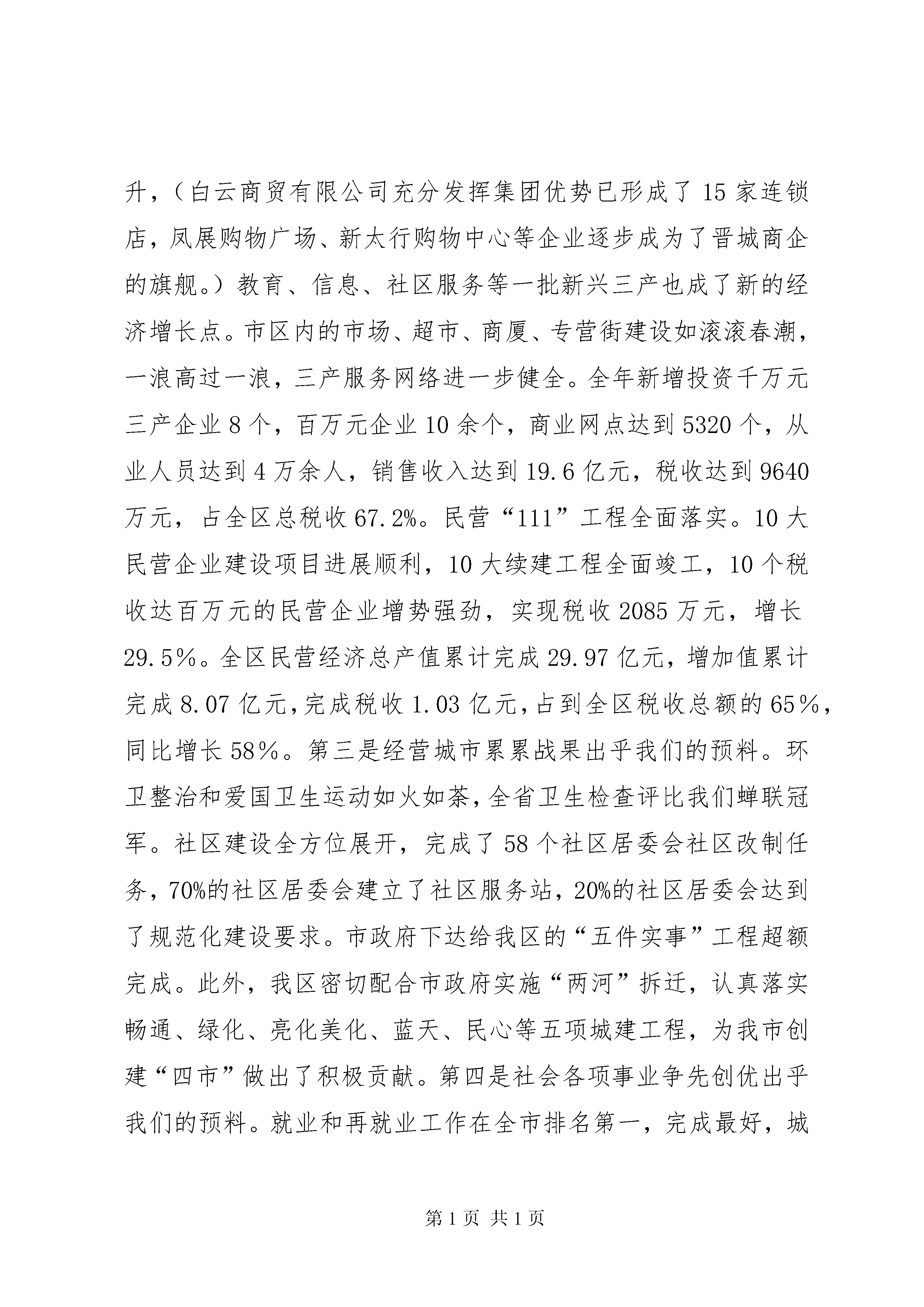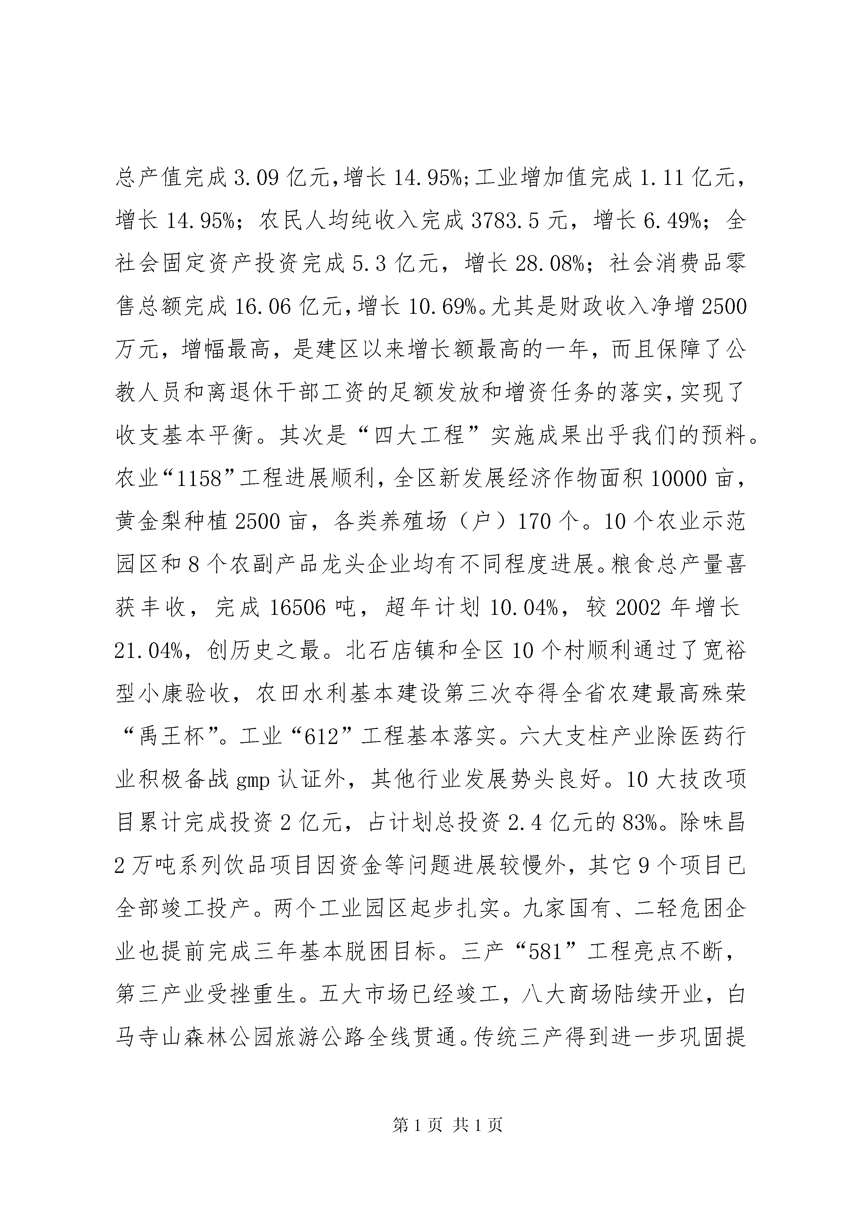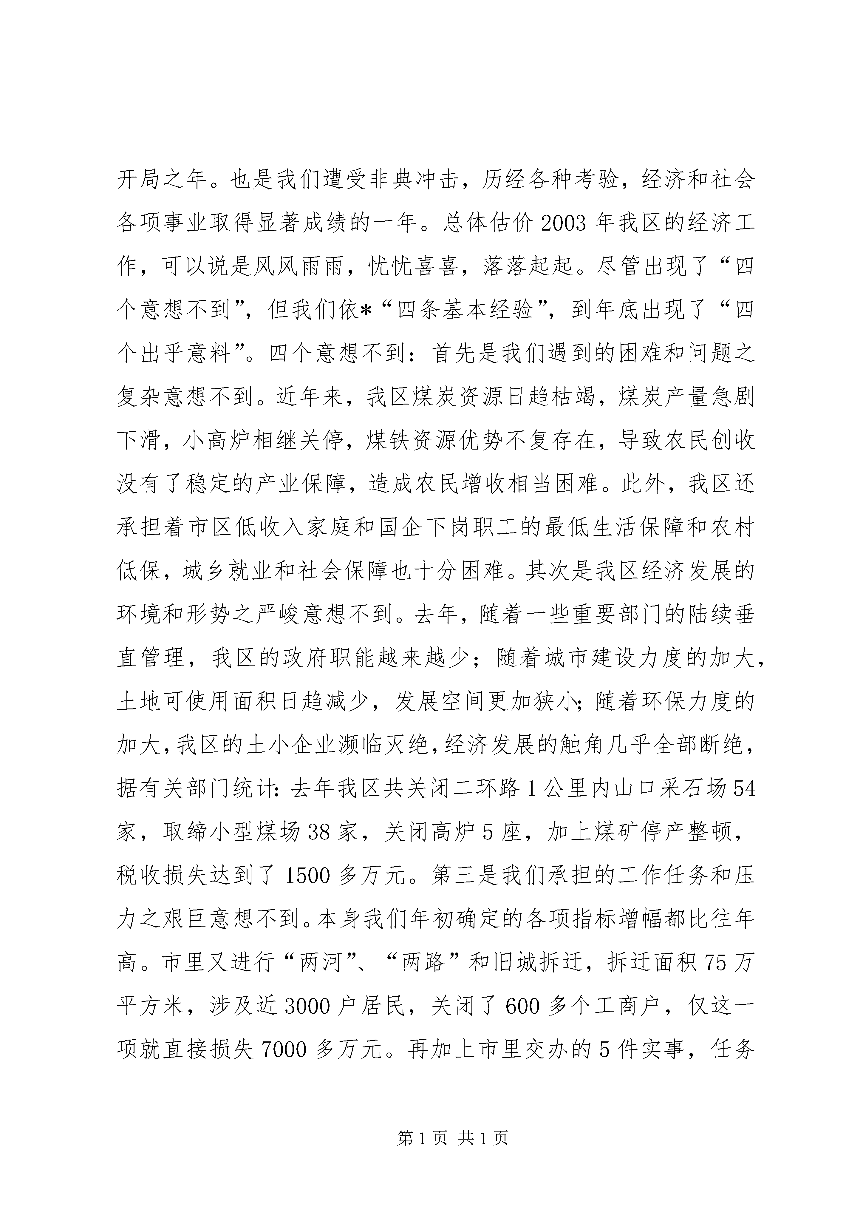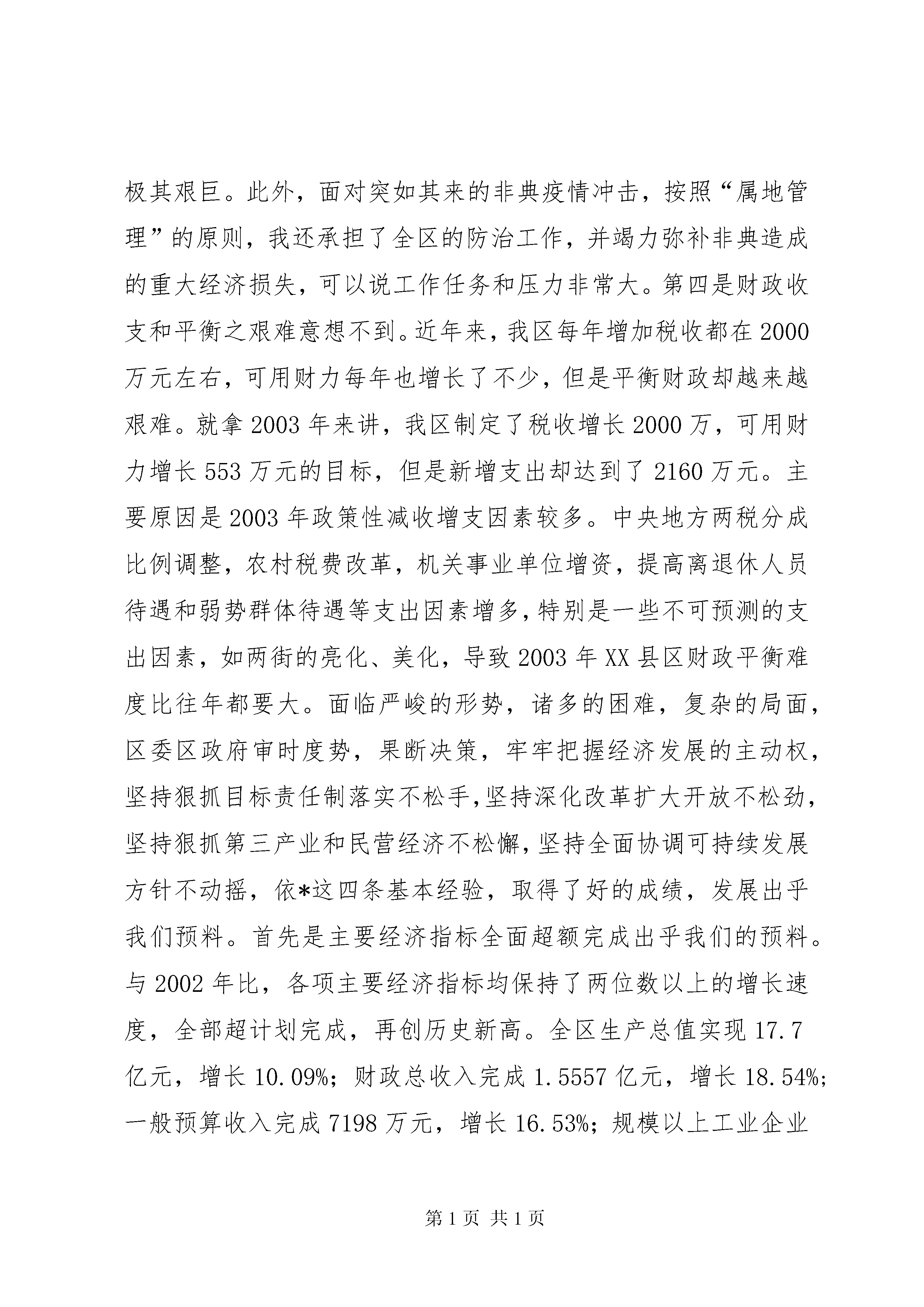 在全区经济工作会议上的讲话(三)在全区经济工作会议上的讲话(三)同志们:按照区委的统一安排,年前我们召开了区委五届三次全体扩大会议,就今年全区工作做了总体安排。原计划上月初就召开经济工作会议,由于市里今年目标确定等原因,一直推迟到今天。这次会议的主要目的和任务是:认真回顾总结2003年经济工作,全面安排部署2004年经济工作,进一步动员全区上下按照党的十六届三中全会,中央、省市经济工作会议以及区委五届三次全体扩大会议精神,统一思想,认清形势,明确任务,争先发展,努力夺取2004年经济工作的新胜利。刚才,候区长宣读了《2004年经济目标和项目建设考核办法》,8个镇办和5个部门的负责同志又签订了目标责任书,立下了军令状,今年就是要拿这个考核办法和这份责任书来衡量工作,论功行赏。接下来,还要为区三级干部暨劳模表彰会受表彰的民营工功臣举行授牌仪式,希望同志们振奋精神,再鼓干劲,把这次会议精神贯彻好,落实好,把全年各项目标任务完成好,实现好。下面,我先讲四点意见,李书记还要作重要讲话。一、关于2003年经济工作的总体估价2003年是我区深入贯彻落实党的十六大和十六届三中全会精神,全面建设小康社会的开局之年。也是我们遭受非典冲击,历经各种考验,经济和社会各项事业取得显著成绩的一年。总体估价2003年我区的经济工作,可以说是风风雨雨,忧忧喜喜,落落起起。尽管出现了“四个意想不到”,但我们依*“四条基本经验”,到年底出现了“四个出乎意料”。四个意想不到:首先是我们遇到的困难和问题之复杂意想不到。近年来,我区煤炭资源日趋枯竭,煤炭产量急剧下滑,小高炉相继关停,煤铁资源优势不复存在,导致农民创收没有了稳定的产业保障,造成农民增收相当困难。此外,我区还承担着市区低收入家庭和国企下岗职工的最低生活保障和农村低保,城乡就业和社会保障也十分困难。其次是我区经济发展的环境和形势之严峻意想不到。去年,随着一些重要部门的陆续垂直管理,我区的政府职能越来越少;随着城市建设力度的加大,土地可使用面积日趋减少,发展空间更加狭小;随着环保力度的加大,我区的土小企业濒临灭绝,经济发展的触角几乎全部断绝,据有关部门统计:去年我区共关闭二环路1公里内山口采石场54家,取缔小型煤场38家,关闭高炉5座,加上煤矿停产整顿,税收损失达到了1500多万元。第三是我们承担的工作任务和压力之艰巨意想不到。本身我们年初确定的各项指标增幅都比往年高。市里又进行“两河”、“两路”和旧城拆迁,拆迁面积75万平方米,涉及近3000户居民,关闭了600多个工商户,仅这一项就直接损失7000多万元。再加上市里交办的5件实事,任务极其艰巨。此外,面对突如其来的非典疫情冲击,按照“属地管理”的原则,我还承担了全区的防治工作,并竭力弥补非典造成的重大经济损失,可以说工作任务和压力非常大。第四是财政收支和平衡之艰难意想不到。近年来,我区每年增加税收都在2000万元左右,可用财力每年也增长了不少,但是平衡财政却越来越艰难。就拿2003年来讲,我区制定了税收增长2000万,可用财力增长553万元的目标,但是新增支出却达到了2160万元。主要原因是2003年政策性减收增支因素较多。中央地方两税分成比例调整,农村税费改革,机关事业单位增资,提高离退休人员待遇和弱势群体待遇等支出因素增多,特别是一些不可预测的支出因素,如两街的亮化、美化,导致2003年XX县区财政平衡难度比往年都要大。面临严峻的形势,诸多的困难,复杂的局面,区委区政府审时度势,果断决策,牢牢把握经济发展的主动权,坚持狠抓目标责任制落实不松手,坚持深化改革扩大开放不松劲,坚持狠抓第三产业和民营经济不松懈,坚持全面协调可持续发展方针不动摇,依*这四条基本经验,取得了好的成绩,发展出乎我们预料。首先是主要经济指标全面超额完成出乎我们的预料。与2002年比,各项主要经济指标均保持了两位数以上的增长速度,全部超计划完成,再创历史新高。全区生产总值实现17.7亿元,增长10.09%;财政总收入完成1.5557亿元,增长18.54%;一般预算收入完成7198万元,增长16.53%;规模以上工业企业总产值完成3.09亿元,增长14.95%;工业增加值完成1.11亿元,增长14.95%;农民人均纯收入完成3783.5元,增长6.49%;全社会固定资产投资完成5.3亿元,增长28.08%;社会消费品零售总额完成16.06亿元,增长10.69%。尤其是财政收入净增2500万元,增幅最高,是建区以来增长额最高的一年,而且保障了公教人员和离退休干部工资的足额发放和增资任务的落实,实现了收支基本平衡。其次是“四大工程”实施成果出乎我们的预料。农业“1158”工程进展顺利,全区新发展经济作物面积10000亩,黄金梨种植2500亩,各类养殖场(户)170个