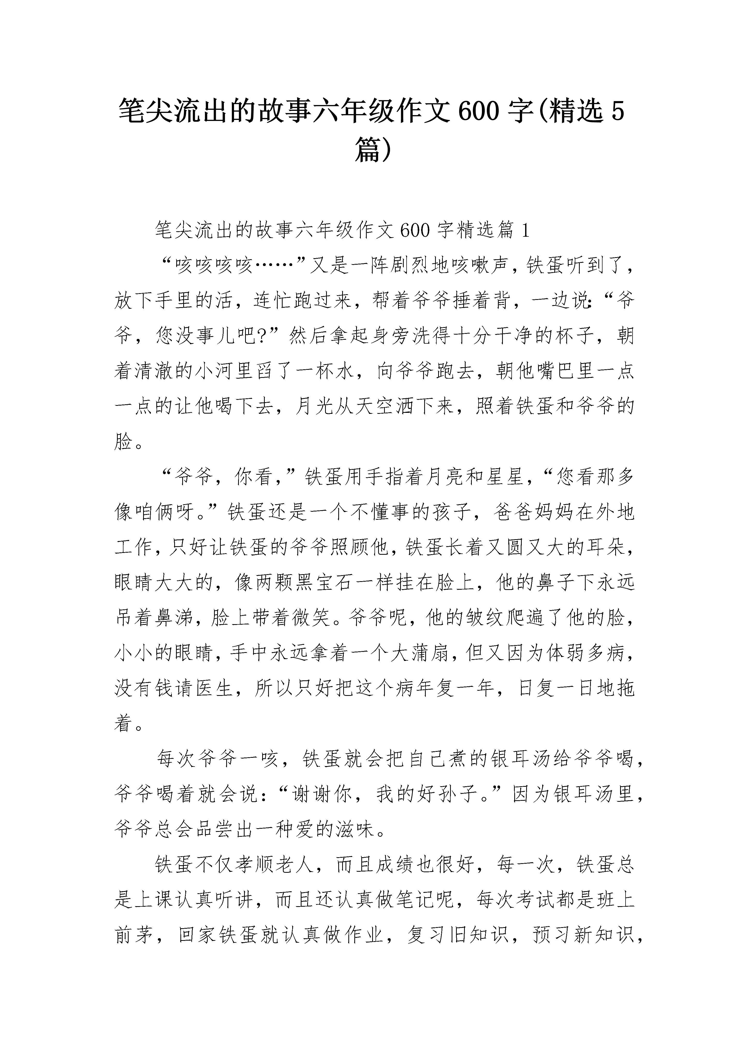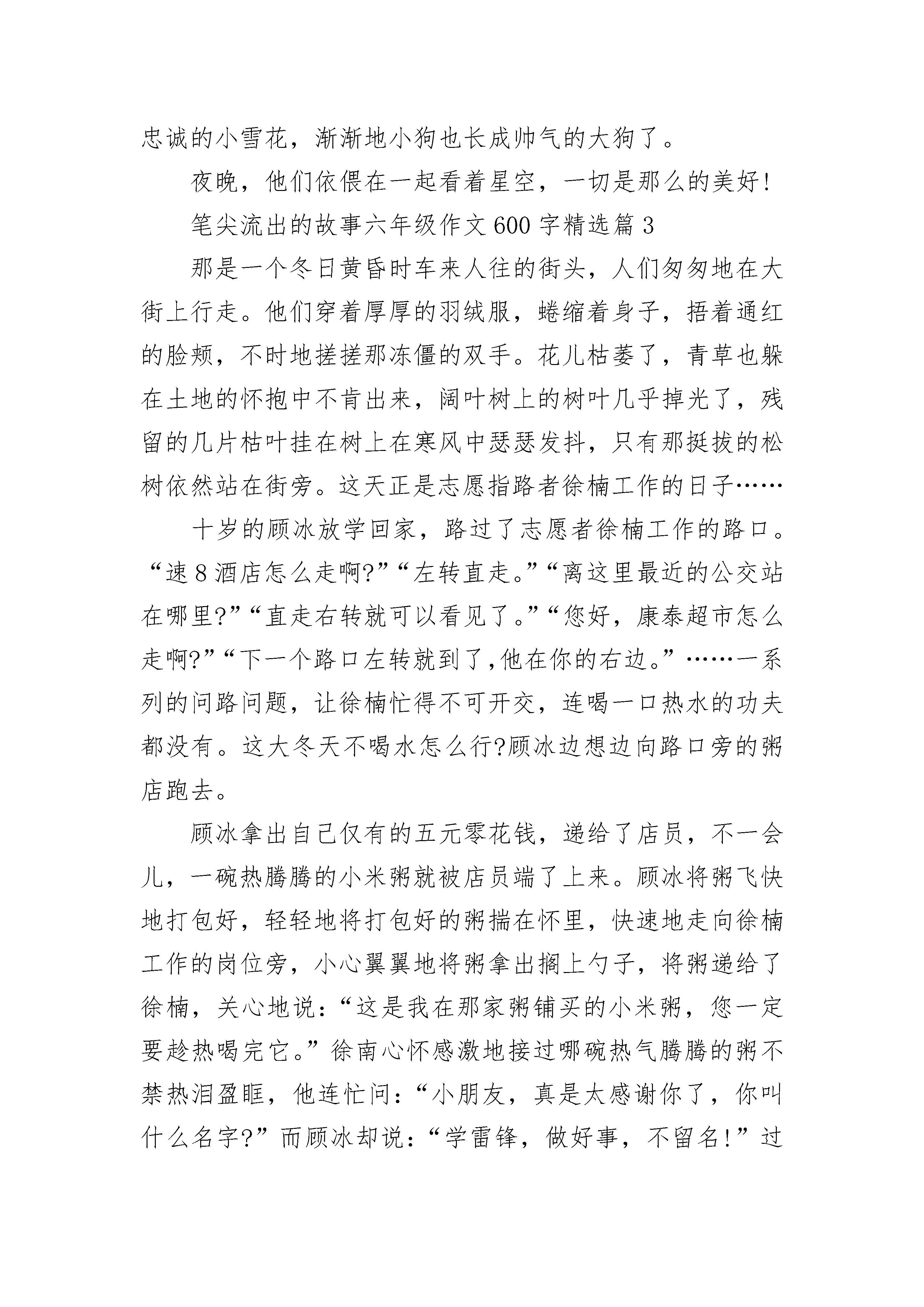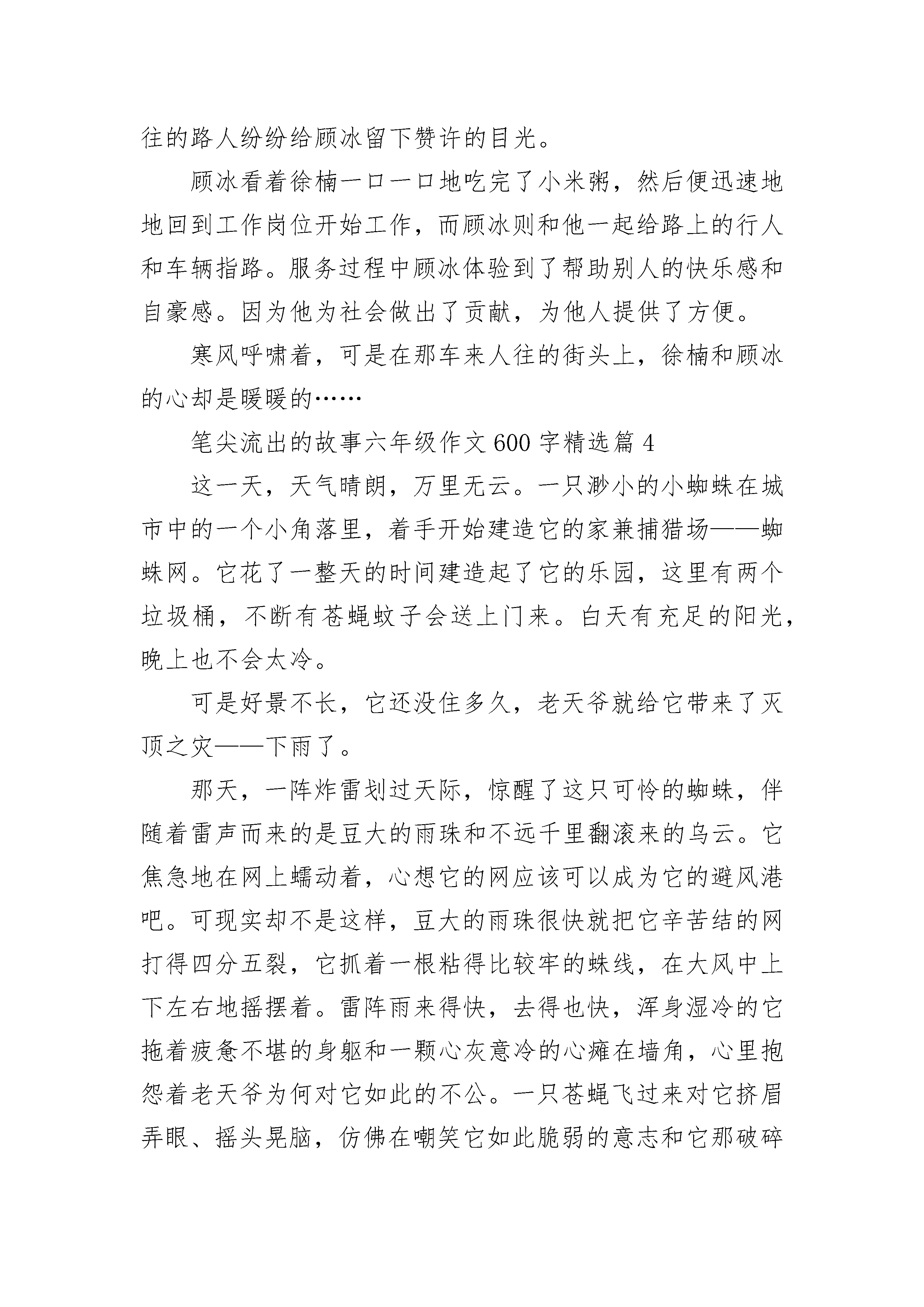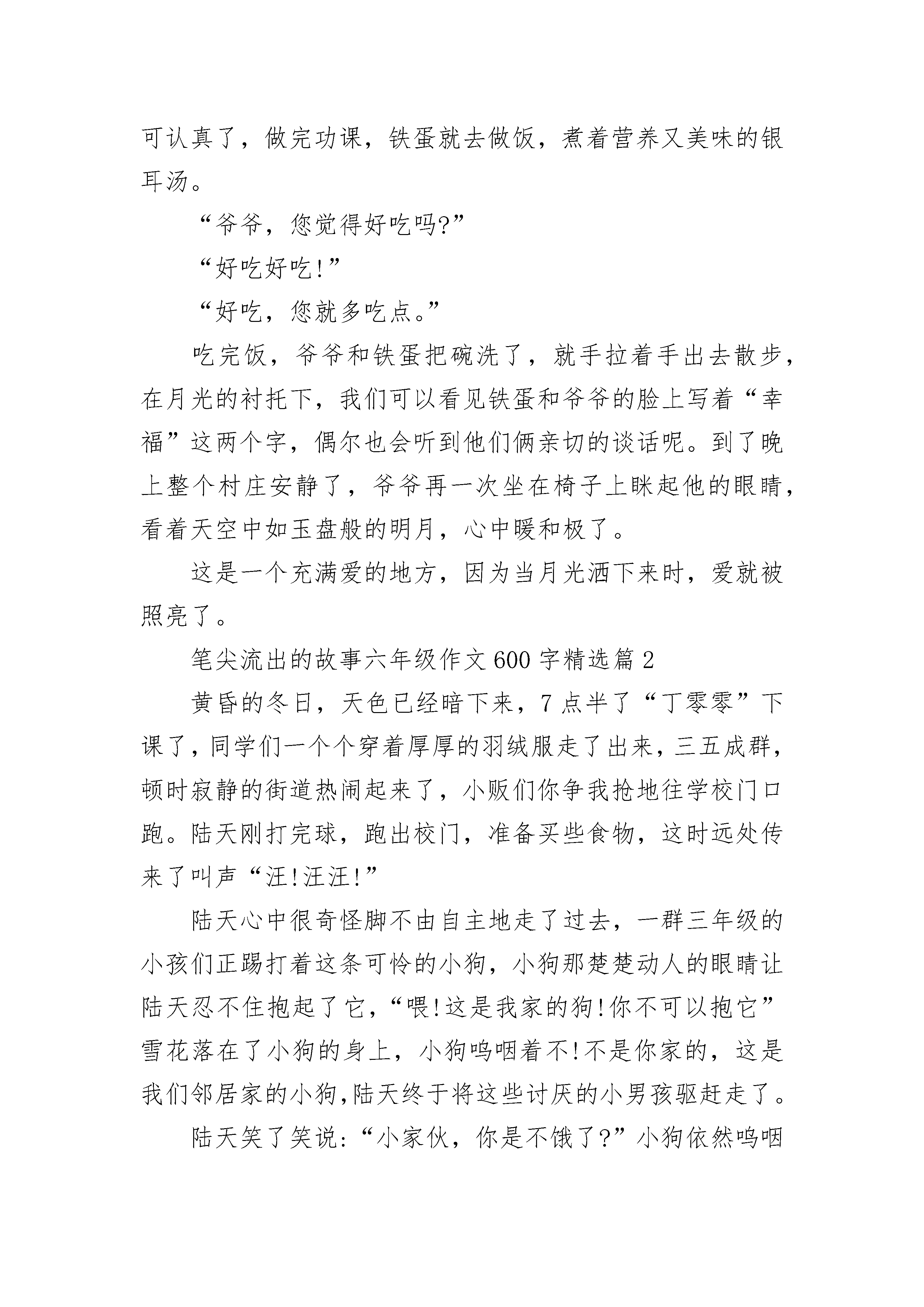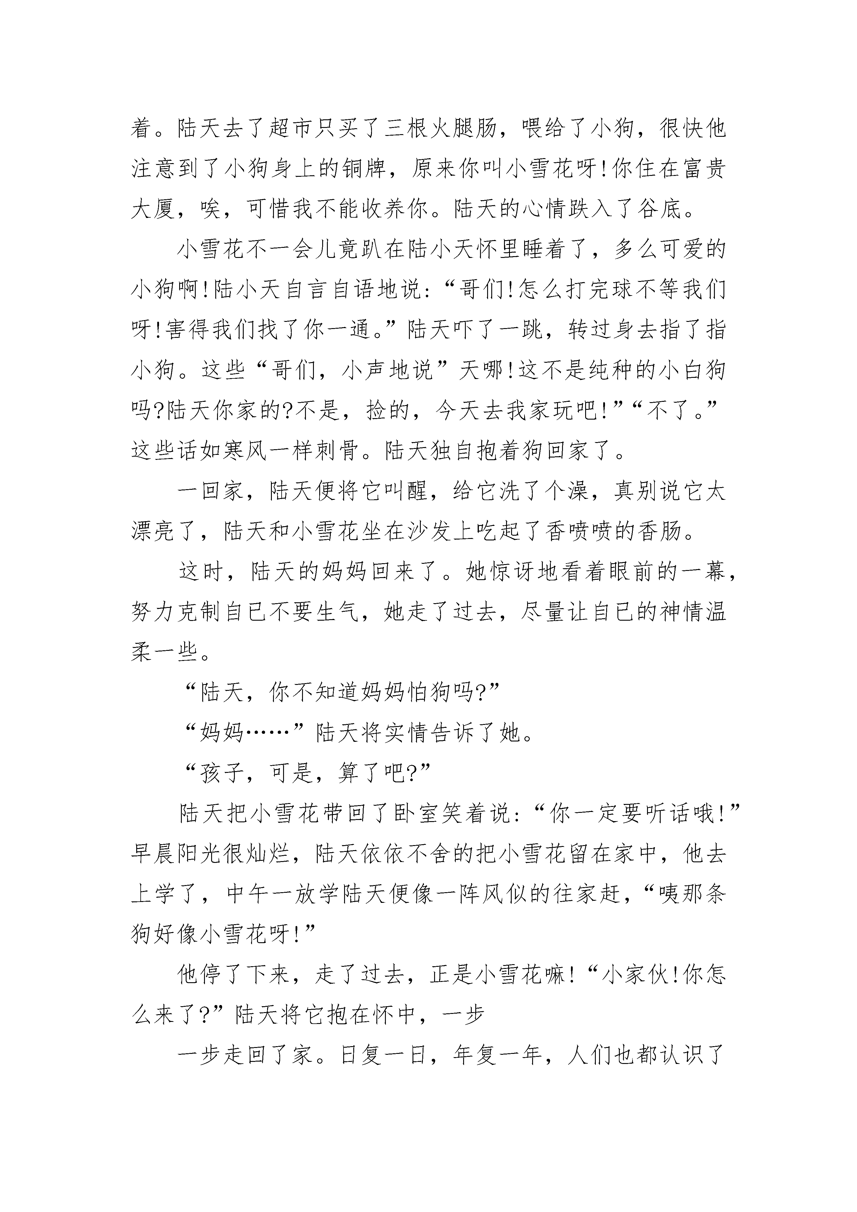 笔尖流出的故事六年级作文600字(精选5篇)笔尖流出的故事六年级作文600字精选篇1“咳咳咳咳……”又是一阵剧烈地咳嗽声,铁蛋听到了,放下手里的活,连忙跑过来,帮着爷爷捶着背,一边说:“爷爷,您没事儿吧?”然后拿起身旁洗得十分干净的杯子,朝着清澈的小河里舀了一杯水,向爷爷跑去,朝他嘴巴里一点一点的让他喝下去,月光从天空洒下来,照着铁蛋和爷爷的脸。“爷爷,你看,”铁蛋用手指着月亮和星星,“您看那多像咱俩呀。”铁蛋还是一个不懂事的孩子,爸爸妈妈在外地工作,只好让铁蛋的爷爷照顾他,铁蛋长着又圆又大的耳朵,眼睛大大的,像两颗黑宝石一样挂在脸上,他的鼻子下永远吊着鼻涕,脸上带着微笑。爷爷呢,他的皱纹爬遍了他的脸,小小的眼睛,手中永远拿着一个大蒲扇,但又因为体弱多病,没有钱请医生,所以只好把这个病年复一年,日复一日地拖着。每次爷爷一咳,铁蛋就会把自己煮的银耳汤给爷爷喝,爷爷喝着就会说:“谢谢你,我的好孙子。”因为银耳汤里,爷爷总会品尝出一种爱的滋味。铁蛋不仅孝顺老人,而且成绩也很好,每一次,铁蛋总是上课认真听讲,而且还认真做笔记呢,每次考试都是班上前茅,回家铁蛋就认真做作业,复习旧知识,预习新知识,可认真了,做完功课,铁蛋就去做饭,煮着营养又美味的银耳汤。“爷爷,您觉得好吃吗?”“好吃好吃!”“好吃,您就多吃点。”吃完饭,爷爷和铁蛋把碗洗了,就手拉着手出去散步,在月光的衬托下,我们可以看见铁蛋和爷爷的脸上写着“幸福”这两个字,偶尔也会听到他们俩亲切的谈话呢。到了晚上整个村庄安静了,爷爷再一次坐在椅子上眯起他的眼睛,看着天空中如玉盘般的明月,心中暖和极了。这是一个充满爱的地方,因为当月光洒下来时,爱就被照亮了。笔尖流出的故事六年级作文600字精选篇2黄昏的冬日,天色已经暗下来,7点半了“丁零零”下课了,同学们一个个穿着厚厚的羽绒服走了出来,三五成群,顿时寂静的街道热闹起来了,小贩们你争我抢地往学校门口跑。陆天刚打完球,跑出校门,准备买些食物,这时远处传来了叫声“汪!汪汪!”陆天心中很奇怪脚不由自主地走了过去,一群三年级的小孩们正踢打着这条可怜的小狗,小狗那楚楚动人的眼睛让陆天忍不住抱起了它,“喂!这是我家的狗!你不可以抱它”雪花落在了小狗的身上,小狗呜咽着不!不是你家的,这是我们邻居家的小狗,陆天终于将这些讨厌的小男孩驱赶走了。陆天笑了笑说:“小家伙,你是不饿了?”小狗依然呜咽着。陆天去了超市只买了三根火腿肠,喂给了小狗,很快他注意到了小狗身上的铜牌,原来你叫小雪花呀!你住在富贵大厦,唉,可惜我不能收养你。陆天的心情跌入了谷底。小雪花不一会儿竟趴在陆小天怀里睡着了,多么可爱的小狗啊!陆小天自言自语地说:“哥们!怎么打完球不等我们呀!害得我们找了你一通。”陆天吓了一跳,转过身去指了指小狗。这些“哥们,小声地说”天哪!这不是纯种的小白狗吗?陆天你家的?不是,捡的,今天去我家玩吧!”“不了。”这些话如寒风一样刺骨。陆天独自抱着狗回家了。一回家,陆天便将它叫醒,给它洗了个澡,真别说它太漂亮了,陆天和小雪花坐在沙发上吃起了香喷喷的香肠。这时,陆天的妈妈回来了。她惊讶地看着眼前的一幕,努力克制自已不要生气,她走了过去,尽量让自已的神情温柔一些。“陆天,你不知道妈妈怕狗吗?”“妈妈……”陆天将实情告诉了她。“孩子,可是,算了吧?”陆天把小雪花带回了卧室笑着说:“你一定要听话哦!”早晨阳光很灿烂,陆天依依不舍的把小雪花留在家中,他去上学了,中午一放学陆天便像一阵风似的往家赶,“咦那条狗好像小雪花呀!”他停了下来,走了过去,正是小雪花嘛!“小家伙!你怎么来了?”陆天将它抱在怀中,一步一步走回了家。日复一日,年复一年,人们也都认识了忠诚的小雪花,渐渐地小狗也长成帅气的大狗了。夜晚,他们依偎在一起看着星空,一切是那么的美好!笔尖流出的故事六年级作文600字精选篇3那是一个冬日黄昏时车来人往的街头,人们匆匆地在大街上行走。他们穿着厚厚的羽绒服,蜷缩着身子,捂着通红的脸颊,不时地搓搓那冻僵的双手。花儿枯萎了,青草也躲在土地的怀抱中不肯出来,阔叶树上的树叶几乎掉光了,残留的几片枯叶挂在树上在寒风中瑟瑟发抖,只有那挺拔的松树依然站在街旁。这天正是志愿指路者徐楠工作的日子……十岁的顾冰放学回家,路过了志愿者徐楠工作的路口。“速8酒店怎么走啊?”“左转直走。”“离这里最近的公交站在哪里?”“直走右转就可以看见了。”“您好,康泰超市怎么走啊?”“下一个路口左转就到了,他在你的右边。”……一系列的问路问题,让徐楠忙得不可开交,连喝一口热水的功夫都没有。这大冬天不喝水怎么行?顾冰边想边向路口旁的粥店跑去。顾冰拿出自己仅有的五元零花钱,递给了店员,不一会儿,一碗热腾腾的小米粥就被店员端了上来。顾冰将粥飞快地打包好,轻轻地将打包好的粥揣在怀里,快速地走向徐楠工作的岗位旁,小心翼翼