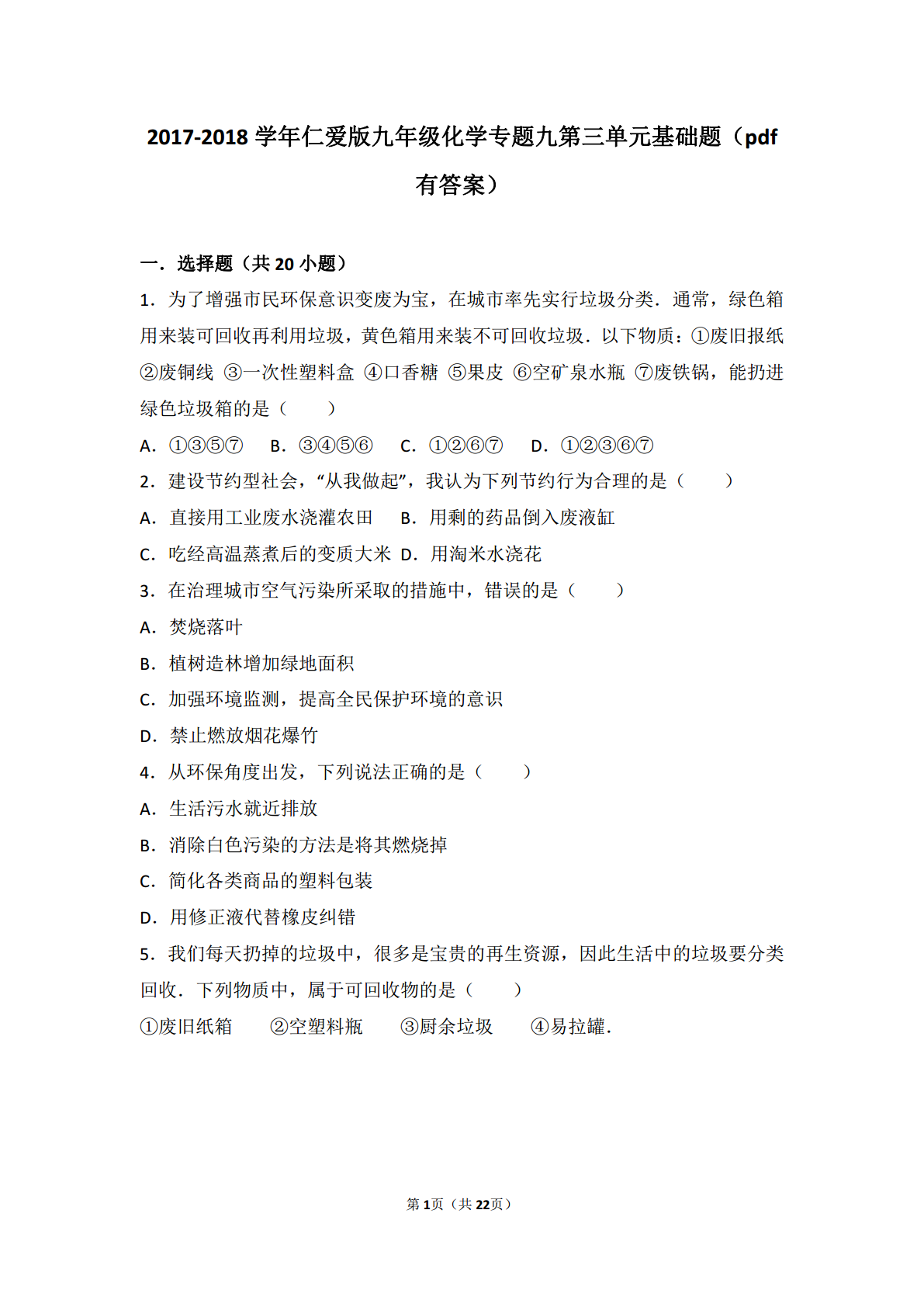 2017-2018学年仁爱版九年级化学专题九第三单元基础题(pdf有答案)一.选择题(共20小题)1.为了增强市民环保意识变废为宝,在城市率先实行垃圾分类.通常,绿色箱用来装可回收再利用垃圾,黄色箱用来装不可回收垃圾.以下物质:①废旧报纸②废铜线③一次性塑料盒④口香糖⑤果皮⑥空矿泉水瓶⑦废铁锅,能扔进绿色垃圾箱的是()A.①③⑤⑦B.③④⑤⑥C.①②⑥⑦D.①②③⑥⑦2.建设节约型社会,“从我做起”,我认为下列节约行为合理的是()A.直接用工业废水浇灌农田B.用剩的药品倒入废液缸C.吃经高温蒸煮后的变质大米D.用淘米水浇花3.在治理城市空气污染所采取的措施中,错误的是()A.焚烧落叶B.植树造林增加绿地面积C.加强环境监测,提高全民保护环境的意识D.禁止燃放烟花爆竹4.从环保角度出发,下列说法正确的是()A.生活污水就近排放B.消除白色污染的方法是将其燃烧掉C.简化各类商品的塑料包装D.用修正液代替橡皮纠错5.我们每天扔掉的垃圾中,很多是宝贵的再生资源,因此生活中的垃圾要分类回收.下列物质中,属于可回收物的是()①废旧纸箱②空塑料瓶③厨余垃圾④易拉罐.()A.①②③B.①③④C.①②④D.①②③④6.某校同学提出下列建议:①开发新能源,减少化石燃料的燃烧;②开发生产无汞电池;③垃圾分类;④垃圾减量;⑤提倡使用一次性发泡塑料餐具和塑料袋;⑥提倡不使用含磷洗衣粉;⑦农业上合理地使用化肥和农药.你认为可以采纳的是()A.①②③④⑥⑦B.②③④⑤⑥⑦C.①②③⑤⑥⑦D.全部7.近几年我国不少水域多次发生严重的“赤潮”、“水华”现象.下列措施能防止“赤潮”、“水华”现象发生的是()①在水域沿岸新建的住宅小区、宾馆、饭店、医院等要采用生活污水净化装置,从根本上解决生活污水排入水域的问题②沿岸城市居民禁止使用含磷的洗衣粉③禁止用该水域的水灌溉农田,或者作为生活用水④向该水域中加入大量的净水剂和消毒剂以改善水质.A.①②B.②④C.①②④D.①②③④8.1998年科学家在南极洲发现大批企鹅死亡,经解剖化验发现其体内含有超量氰化物和大量含铅等有害物质,下列各项中可能造成此后果的主要原因是()A.人口增长、人类用水量加大B.食物链被破坏,企鹅食物不足C.工厂废水、人类生活污水的任意排放D.二氧化碳气体增多,全球气候变暖9.学习化学能让我们更好的认识生活和世界.下列说法中,正确的是()A.为了牟取暴利,捕杀、贩卖野生动物B.污水未经处理就直接排放C.香烟烟气中含有尼古丁等有毒物质,吸烟有害健康D.天然物质都无毒无害()10.对湖泊出现的“水华”现象,下列叙述不正确的是()A.生活污水不经处理排入湖泊,容易引发藻类过度繁殖B.湖水温度升高是引起藻类大量繁殖的主要因素C.藻类植物过度繁殖,会破坏湖泊原有生态系统D.藻类植物过度繁殖可导致鱼虾死亡11.导致水体富营养化的元素主要是()A.PB.HC.OD.C12.水华现象是在特定的环境条件下,海水中某些浮游植物、原生动物或细菌爆发性增殖或高度聚集而引起水体变色的一种有害生态现象.大量工农业废水和生活污水排入海洋,其中相当一部分未经处理就直接排入海洋,导致近海、港湾富营养化程度日趋严重.对湖泊出现的“水华”现象,下列叙述不正确的是()A.生活污水不经处理排入湖泊,容易引发藻类过度繁殖B.湖水温度升高是引起藻类大量繁殖的主要因素C.藻类植物过度繁殖,会破坏湖泊原有生态系统D.藻类植物过度繁殖可导致鱼虾死亡13.2001年9月11日,美国遭受恐怖分子的袭击.这次恐怖袭击可能造成的后果是①纽约世贸大厦被毁,上百吨的制冷剂“氟利昂”泄漏到大气中,对臭氧层起破坏作用;②造成美国经济的衰退;③造成世界人心恐慌,不安定;④造成严重的“温室效应”()A.①④B.①②③C.①③④D.②③④14.臭氧(化学式为O3)可应用于游泳池、生活用水、污水的杀菌和消毒,大气中的臭氧层能有效阻挡紫外线.长期吸入大量臭氧会引起口干舌燥,咳嗽等不适症状.臭氧发生器是在高压电极的作用下将空气中的氧气转化为臭氧的装置.下列说法正确的是()A.氧气转化为臭氧是物理变化B.臭氧分子的相对分子质量为36C.一个臭氧分子中含有3个氧原子D.臭氧对人的身体健康不利,应该拒绝使用臭氧15.今年春天,不同寻常的低温导致北极上空差点形成臭氧洞.臭氧(O3)属于()()A.氧气B.空气污染物C.有机物D.稀有气体16.化学肥料和农药对农业的高产丰收具有重要作用,下列有关说法错误的是()A.残留农药可通过农作物转移到人体中