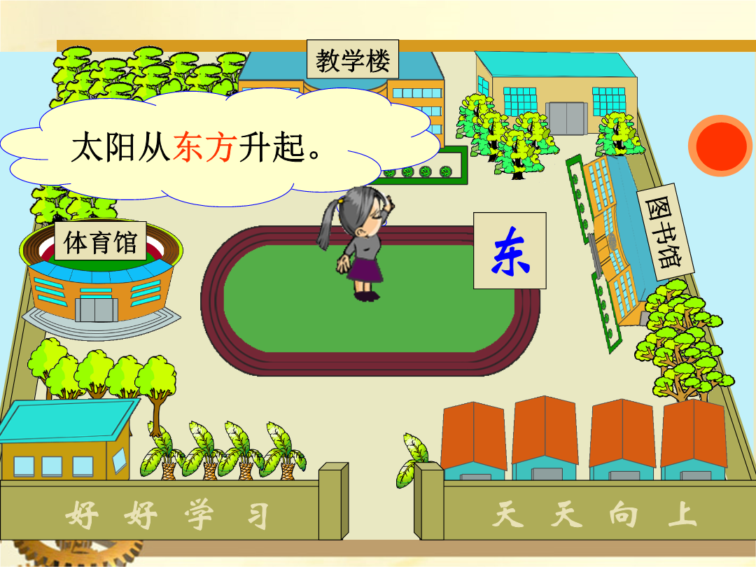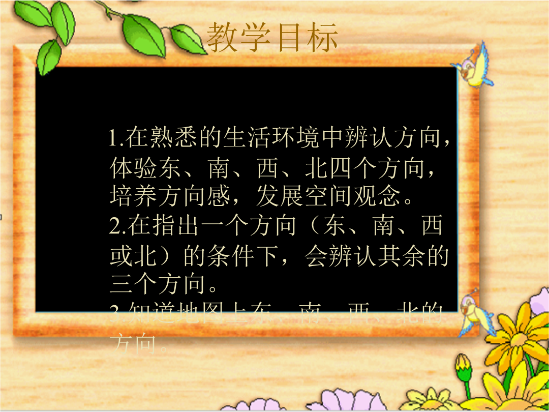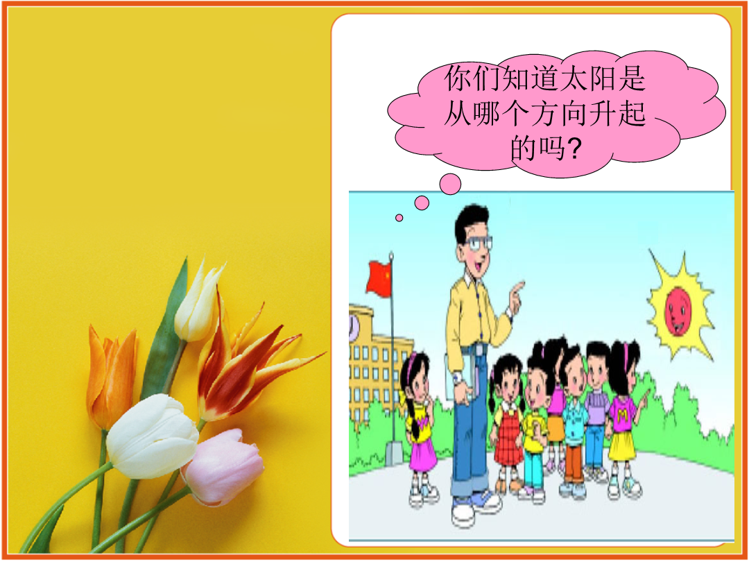 东南西北教学目标你们知道太阳是从哪个方向升起的吗?早晨,太阳从东方升起。努力吧!晚上,当你面对北极星时,你的后面是()面,你的左面是()面,你的右面是()面。你的家乡在北京的哪个方向?小结