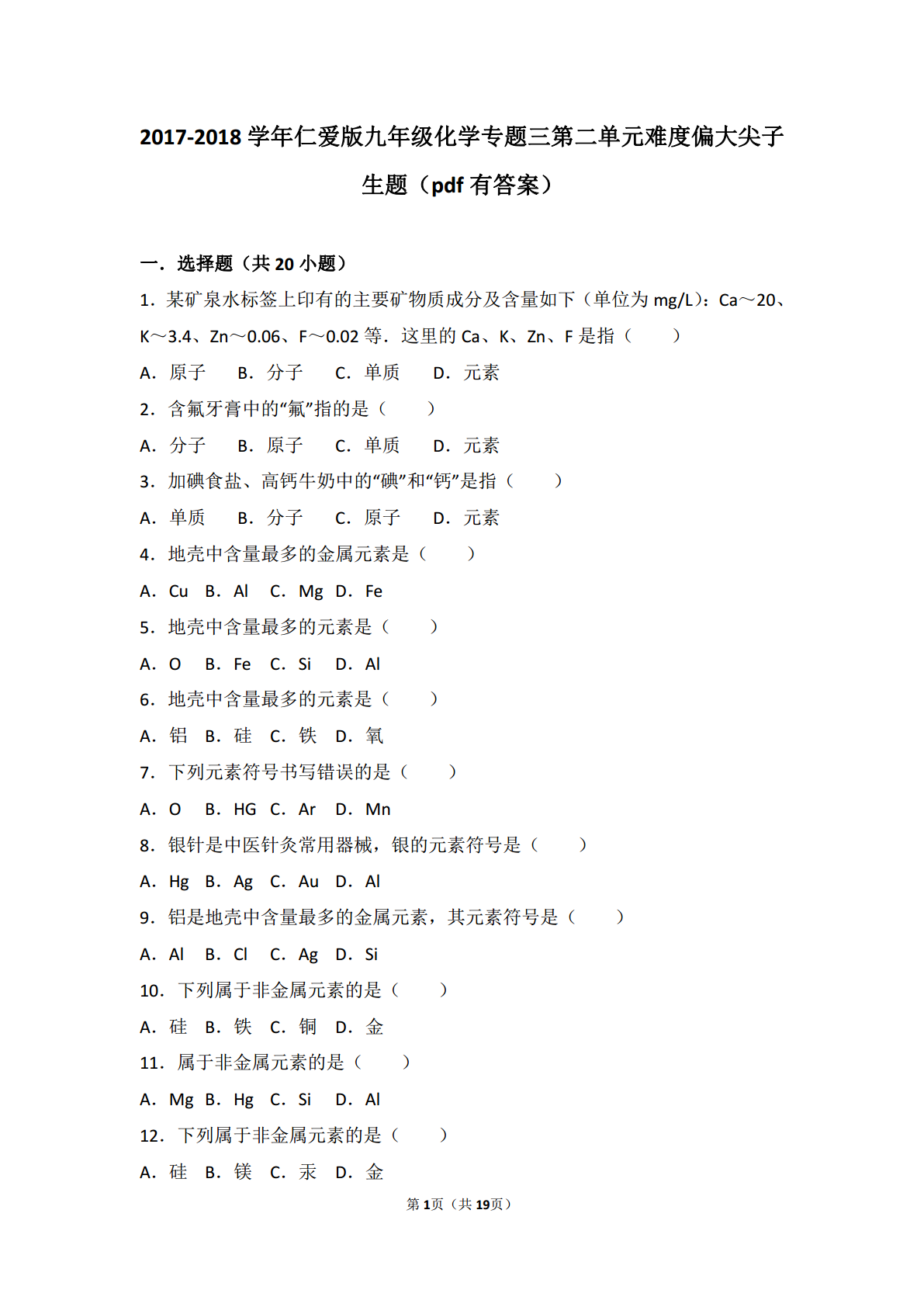 试题-全国-2018_2017-2018学年九年级化学上册 专题三 物质的构成 第二单元 组成物质的元素难度偏大尖子生题(pdf,含解析)(新版)湘教版.pdf