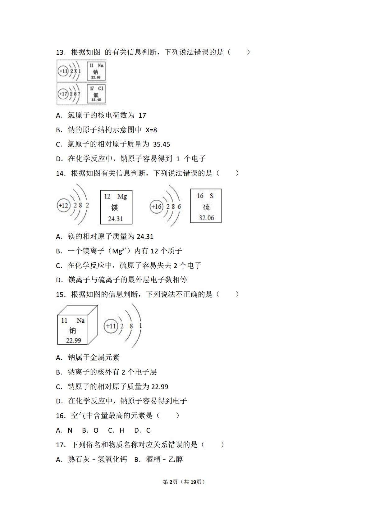 2017-2018学年仁爱版九年级化学专题三第二单元难度偏大尖子生题(pdf有答案)一.选择题(共20小题)1.某矿泉水标签上印有的主要矿物质成分及含量如下(单位为mg/L):Ca~20、K~3.4、Zn~0.06、F~0.02等.这里的Ca、K、Zn、F是指()A.原子B.分子C.单质D.元素2.含氟牙膏中的“氟”指的是()A.分子B.原子C.单质D.元素3.加碘食盐、高钙牛奶中的“碘”和“钙”是指()A.单质B.分子C.原子D.元素4.地壳中含量最多的金属元素是()A.CuB.AlC.MgD.Fe5.地壳中含量最多的元素是()A.OB.FeC.SiD.Al6.地壳中含量最多的元素是()A.铝B.硅C.铁D.氧7.下列元素符号书写错误的是()A.OB.HGC.ArD.Mn8.银针是中医针灸常用器械,银的元素符号是()A.HgB.AgC.AuD.Al9.铝是地壳中含量最多的金属元素,其元素符号是()A.AlB.ClC.AgD.Si10.下列属于非金属元素的是()A.硅B.铁C.铜D.金11.属于非金属元素的是()A.MgB.HgC.SiD.Al12.下列属于非金属元素的是()A.硅B.镁C.汞D.金()13.根据如图的有关信息判断,下列说法错误的是()A.氯原子的核电荷数为17B.钠的原子结构示意图中X=8C.氯原子的相对原子质量为35.45D.在化学反应中,钠原子容易得到1个电子14.根据如图有关信息判断,下列说法错误的是()A.镁的相对原子质量为24.31B.一个镁离子(Mg2+)内有12个质子C.在化学反应中,硫原子容易失去2个电子D.镁离子与硫离子的最外层电子数相等15.根据如图的信息判断,下列说法不正确的是()A.钠属于金属元素B.钠离子的核外有2个电子层C.钠原子的相对原子质量为22.99D.在化学反应中,钠原子容易得到电子16.空气中含量最高的元素是()A.NB.OC.HD.C17.下列俗名和物质名称对应关系错误的是()A.熟石灰﹣氢氧化钙B.酒精﹣乙醇()C.苏打﹣碳酸氢钠D.火碱﹣氢氧化钠18.下列原子团不相同的是()A.NaOH、Ca(OH)2B.KMnO4、K2MnO4C.NH4Cl、(NH4)2SO4D.H2SO4、ZnSO419.“化学元素观”是中学化学的核心观念之一,通过初中化学的学习,我们首先应当建立起“化学元素观”.下列有关观点正确的是()A.在化学反应中元素原子重新组合生成新物质,元素种类有可能改变B.由同种元素组成的不同物质之间不可以相互转化C.根据化学反应前后元素种类不变,通过实验可以测定物质的元素组成D.物质由元素组成,化学反应有新物质生成,所以化学反应后就有新元素出现20.植物进行光合作用可表示为:水+二氧化碳淀粉+氧气,据此可知淀粉的组成中一定含有的元素是()A.碳、氢B.碳、氧C.氢、氧D.碳、氢和氧二.解答题(共10小题)21.有媒体报道,全中国都在补钙,很多人还是缺钙,原因在于钙没有被很好的吸收,这里的“钙”指的是(填“元素”或“单质”).22.如图为A、B、C、D四种粒子的结构示意图以及溴元素在元素周期表中的信息。请按要求填空:(1)A、B、C、D四种粒子中,属于同种元素的是(填序号)。(2)由A元素和B元素形成的化合物的化学式为。(3)溴元素的原子序数是。23.元素周期表是我们学习化学的重要工具。下表是小华绘制的元素周期表的局部,依据此表回答问题:()(1)第14号元素的元素符号为;(2)地壳中含量最多的元素为(填元素符号),其原子的质子数是,在化学反应中它易(填“得到”或“失去”)电子。(3)钠元素在元素周期表中位于第周期。24.核电荷数为1~18的元素的原子结构示意图等信息如图,请回答下列问题。(1)表中不同元素最本质的区别是;第二周期中,各元素原子核外电子排布的变化规律是;同一族(纵行)中,各元素原子核外电子排布的变化规律是(2)一些元素在不同物质中可显示不同的化合价。请写出氯元素的化合价为+1、+4、+7的三种氧化物的化学式,并标出氯元素的化合价。(3)加热氧化汞可得到汞和氧气。试计算生成201克汞至少需要氧化汞的质量是多少?25.分析图中提供的信息,回答问题。(1)钙的相对原子质量为;(2)图B为钙原子的结构示意图,x的数值为;()(3)在C、D两种粒子中,与B化学性质相似的是。26.根据如图所示钠元素和氯元素的相关信息,回答问题:(1)A中的11是钠元素的数;(2)氯元