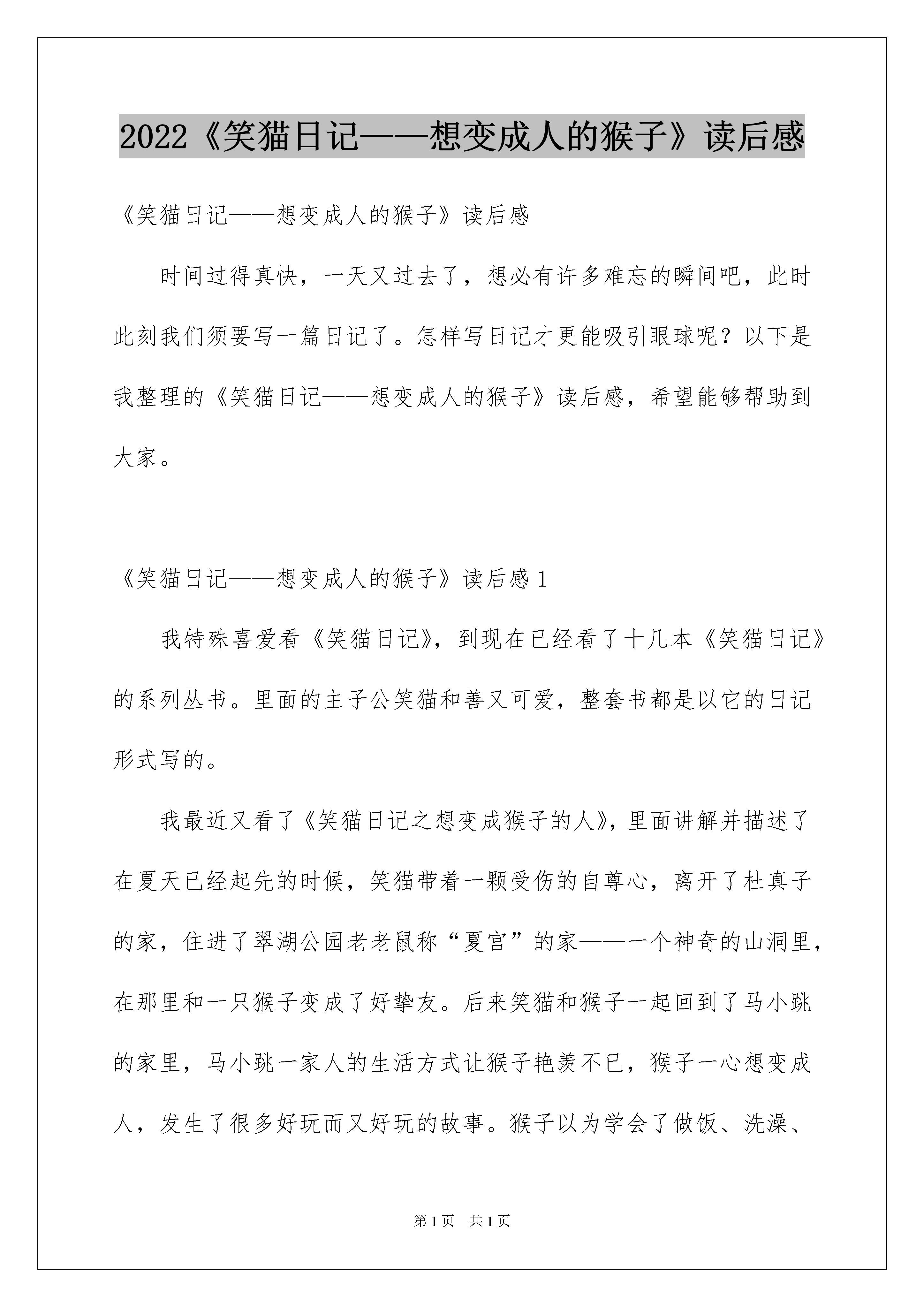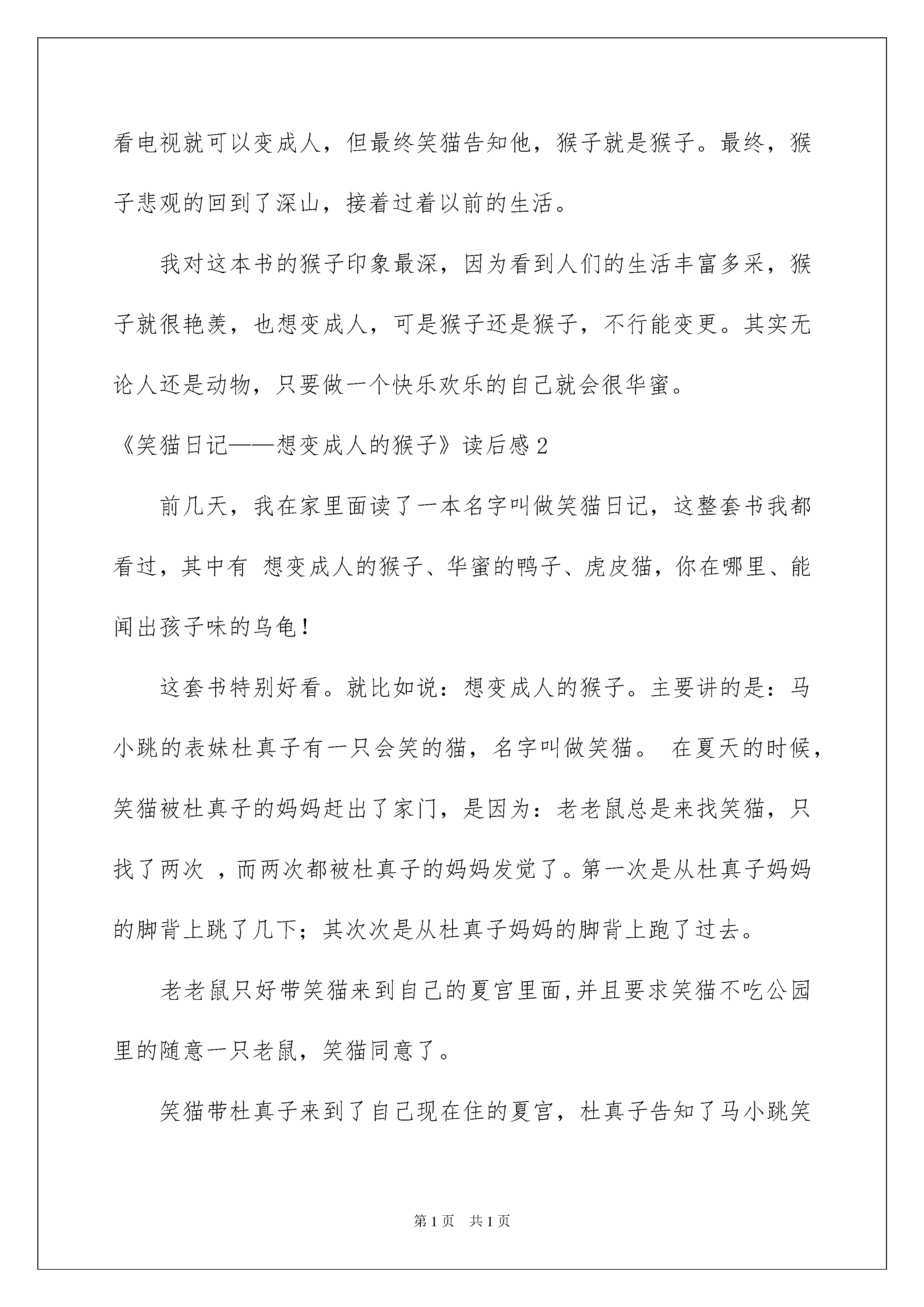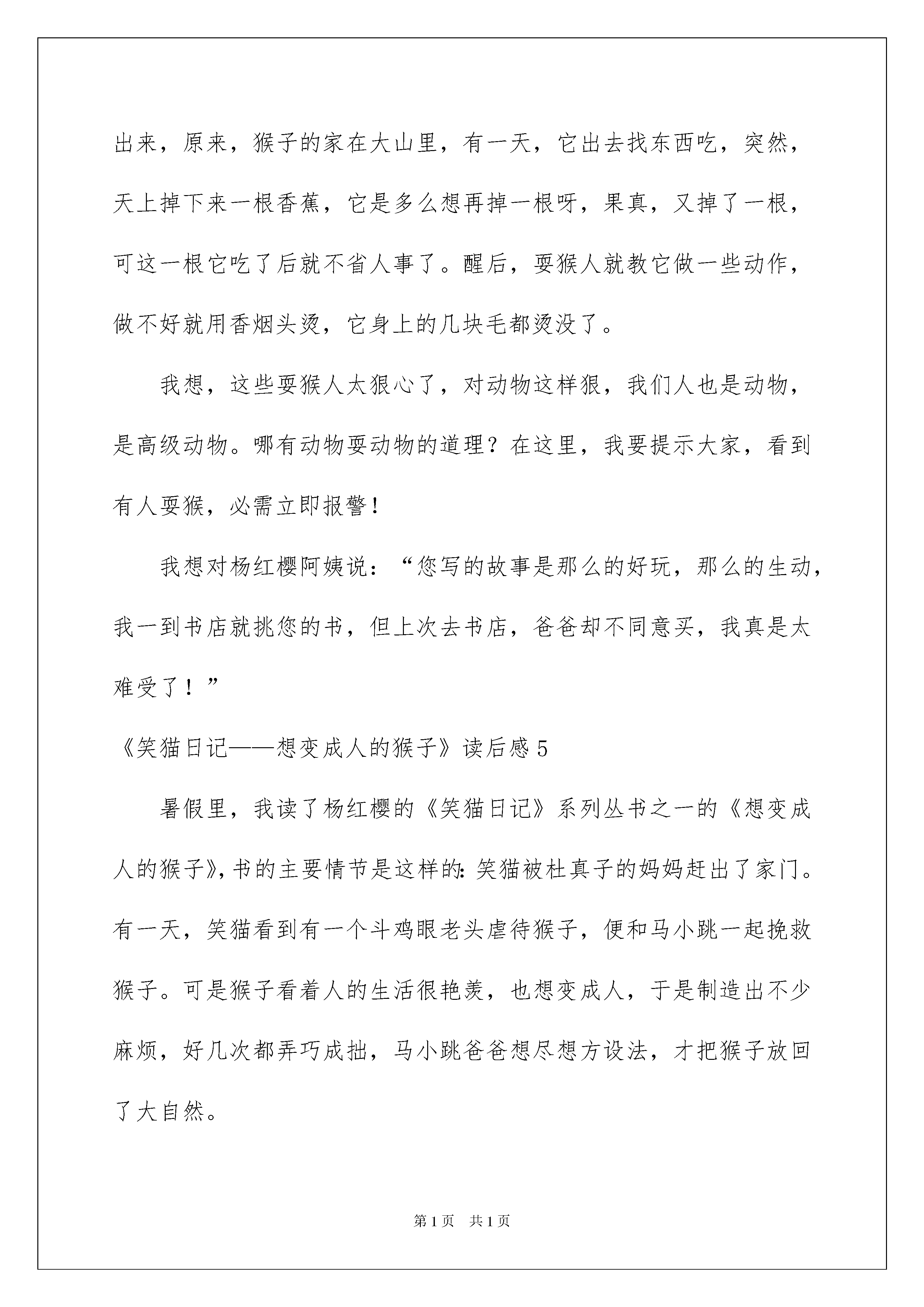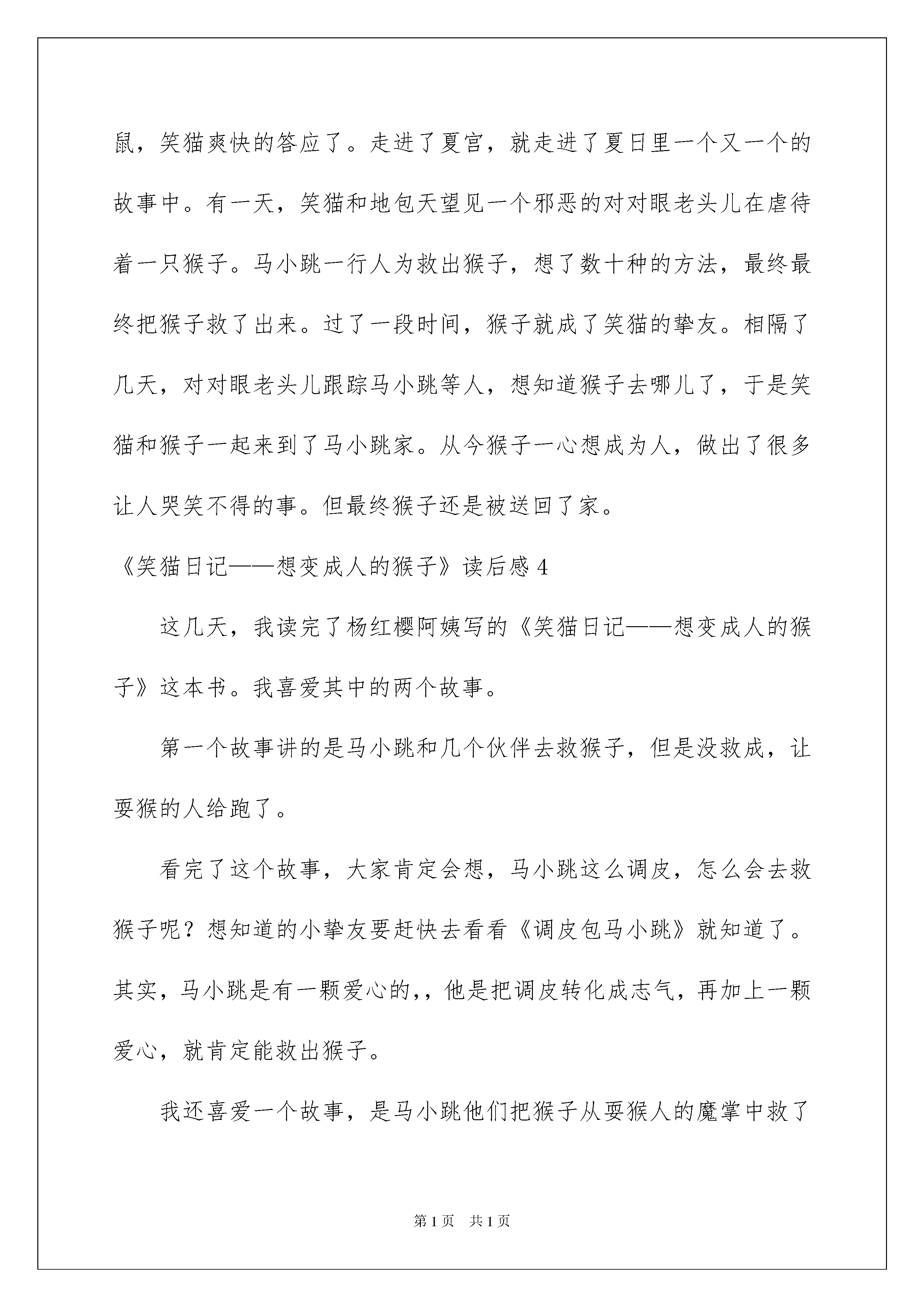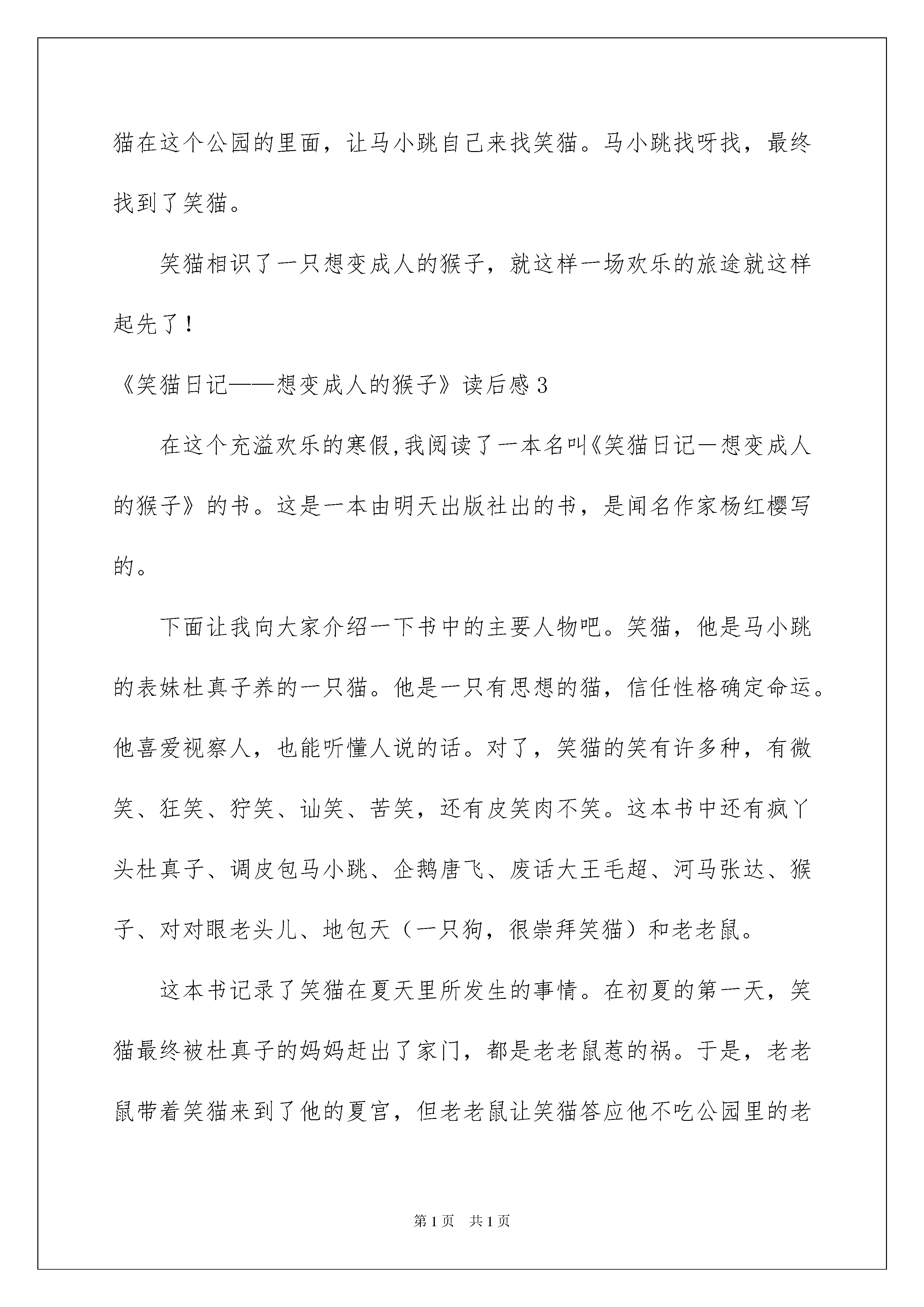 2022《笑猫日记——想变成人的猴子》读后感《笑猫日记——想变成人的猴子》读后感时间过得真快,一天又过去了,想必有许多难忘的瞬间吧,此时此刻我们须要写一篇日记了。怎样写日记才更能吸引眼球呢?以下是我整理的《笑猫日记——想变成人的猴子》读后感,希望能够帮助到大家。《笑猫日记——想变成人的猴子》读后感1我特殊喜爱看《笑猫日记》,到现在已经看了十几本《笑猫日记》的系列丛书。里面的主子公笑猫和善又可爱,整套书都是以它的日记形式写的。我最近又看了《笑猫日记之想变成猴子的人》,里面讲解并描述了在夏天已经起先的时候,笑猫带着一颗受伤的自尊心,离开了杜真子的家,住进了翠湖公园老老鼠称“夏宫”的家——一个神奇的山洞里,在那里和一只猴子变成了好挚友。后来笑猫和猴子一起回到了马小跳的家里,马小跳一家人的生活方式让猴子艳羡不已,猴子一心想变成人,发生了很多好玩而又好玩的故事。猴子以为学会了做饭、洗澡、看电视就可以变成人,但最终笑猫告知他,猴子就是猴子。最终,猴子悲观的回到了深山,接着过着以前的生活。我对这本书的猴子印象最深,因为看到人们的生活丰富多采,猴子就很艳羡,也想变成人,可是猴子还是猴子,不行能变更。其实无论人还是动物,只要做一个快乐欢乐的自己就会很华蜜。《笑猫日记——想变成人的猴子》读后感2前几天,我在家里面读了一本名字叫做笑猫日记,这整套书我都看过,其中有想变成人的猴子、华蜜的鸭子、虎皮猫,你在哪里、能闻出孩子味的乌龟!这套书特别好看。就比如说:想变成人的猴子。主要讲的是:马小跳的表妹杜真子有一只会笑的猫,名字叫做笑猫。在夏天的时候,笑猫被杜真子的妈妈赶出了家门,是因为:老老鼠总是来找笑猫,只找了两次,而两次都被杜真子的妈妈发觉了。第一次是从杜真子妈妈的脚背上跳了几下;其次次是从杜真子妈妈的脚背上跑了过去。老老鼠只好带笑猫来到自己的夏宫里面,并且要求笑猫不吃公园里的随意一只老鼠,笑猫同意了。笑猫带杜真子来到了自己现在住的夏宫,杜真子告知了马小跳笑猫在这个公园的里面,让马小跳自己来找笑猫。马小跳找呀找,最终找到了笑猫。笑猫相识了一只想变成人的猴子,就这样一场欢乐的旅途就这样起先了!《笑猫日记——想变成人的猴子》读后感3在这个充溢欢乐的寒假,我阅读了一本名叫《笑猫日记-想变成人的猴子》的书。这是一本由明天出版社出的书,是闻名作家杨红樱写的。下面让我向大家介绍一下书中的主要人物吧。笑猫,他是马小跳的表妹杜真子养的一只猫。他是一只有思想的猫,信任性格确定命运。他喜爱视察人,也能听懂人说的话。对了,笑猫的笑有许多种,有微笑、狂笑、狞笑、讪笑、苦笑,还有皮笑肉不笑。这本书中还有疯丫头杜真子、调皮包马小跳、企鹅唐飞、废话大王毛超、河马张达、猴子、对对眼老头儿、地包天(一只狗,很崇拜笑猫)和老老鼠。这本书记录了笑猫在夏天里所发生的事情。在初夏的第一天,笑猫最终被杜真子的妈妈赶出了家门,都是老老鼠惹的祸。于是,老老鼠带着笑猫来到了他的夏宫,但老老鼠让笑猫答应他不吃公园里的老鼠,笑猫爽快的答应了。走进了夏宫,就走进了夏日里一个又一个的故事中。有一天,笑猫和地包天望见一个邪恶的对对眼老头儿在虐待着一只猴子。马小跳一行人为救出猴子,想了数十种的方法,最终最终把猴子救了出来。过了一段时间,猴子就成了笑猫的挚友。相隔了几天,对对眼老头儿跟踪马小跳等人,想知道猴子去哪儿了,于是笑猫和猴子一起来到了马小跳家。从今猴子一心想成为人,做出了很多让人哭笑不得的事。但最终猴子还是被送回了家。《笑猫日记——想变成人的猴子》读后感4这几天,我读完了杨红樱阿姨写的《笑猫日记——想变成人的猴子》这本书。我喜爱其中的两个故事。第一个故事讲的是马小跳和几个伙伴去救猴子,但是没救成,让耍猴的人给跑了。看完了这个故事,大家肯定会想,马小跳这么调皮,怎么会去救猴子呢?想知道的小挚友要赶快去看看《调皮包马小跳》就知道了。其实,马小跳是有一颗爱心的,,他是把调皮转化成志气,再加上一颗爱心,就肯定能救出猴子。我还喜爱一个故事,是马小跳他们把猴子从耍猴人的魔掌中救了出来,原来,猴子的家在大山里,有一天,它出去找东西吃,突然,天上掉下来一根香蕉,它是多么想再掉一根呀,果真,又掉了一根,可这一根它吃了后就不省人事了。醒后,耍猴人就教它做一些动作,做不好就用香烟头烫,它身上的几块毛都烫没了。我想,这些耍猴人太狠心了,对动物这样狠,我们人也是动物,是高级动物。哪有动物耍动物的道理?在这里,我要提示大家,看到有人耍猴,必需立即报警!我想对杨红樱阿姨说:“您写的故事是那么的好玩,那么的生动,我一到书店就挑您的书,但上次去书店,爸爸却不同意买,我真是太难受了!”《