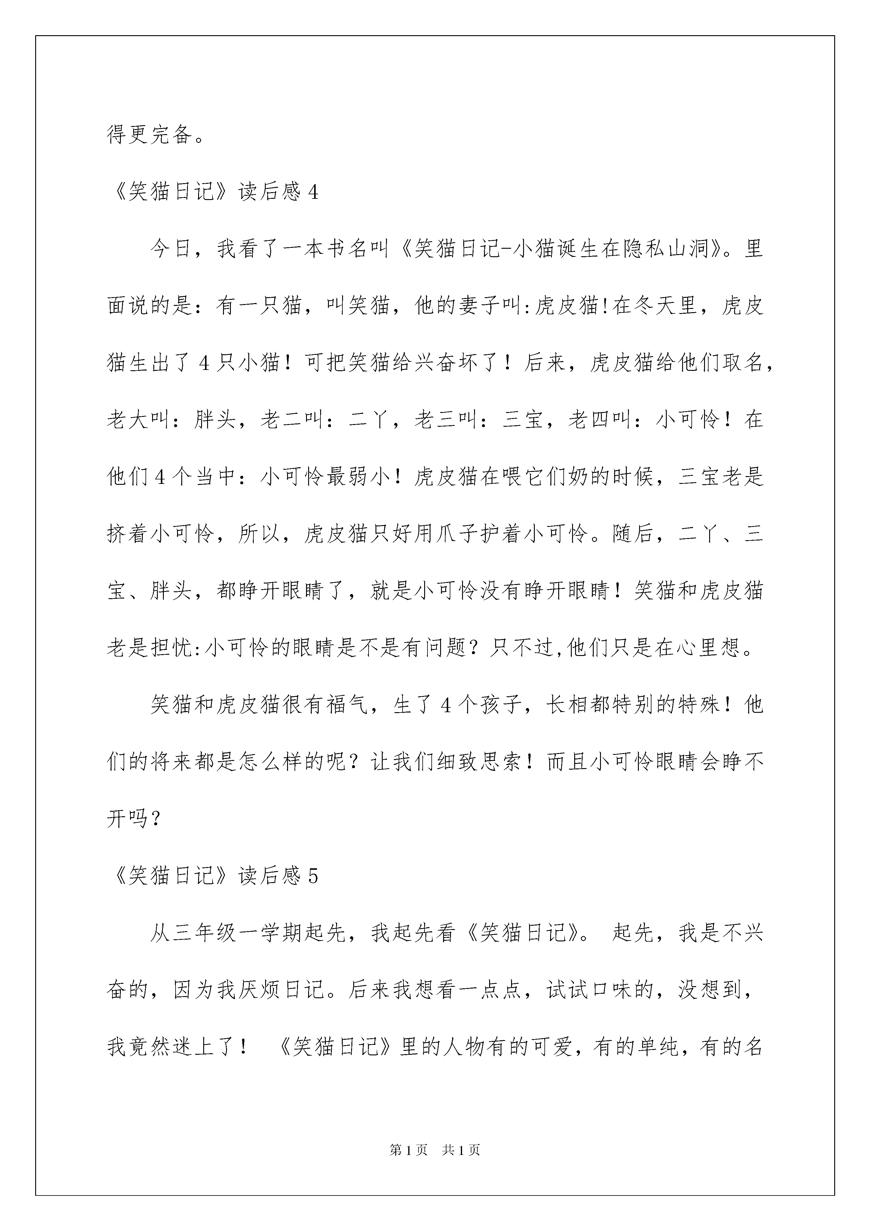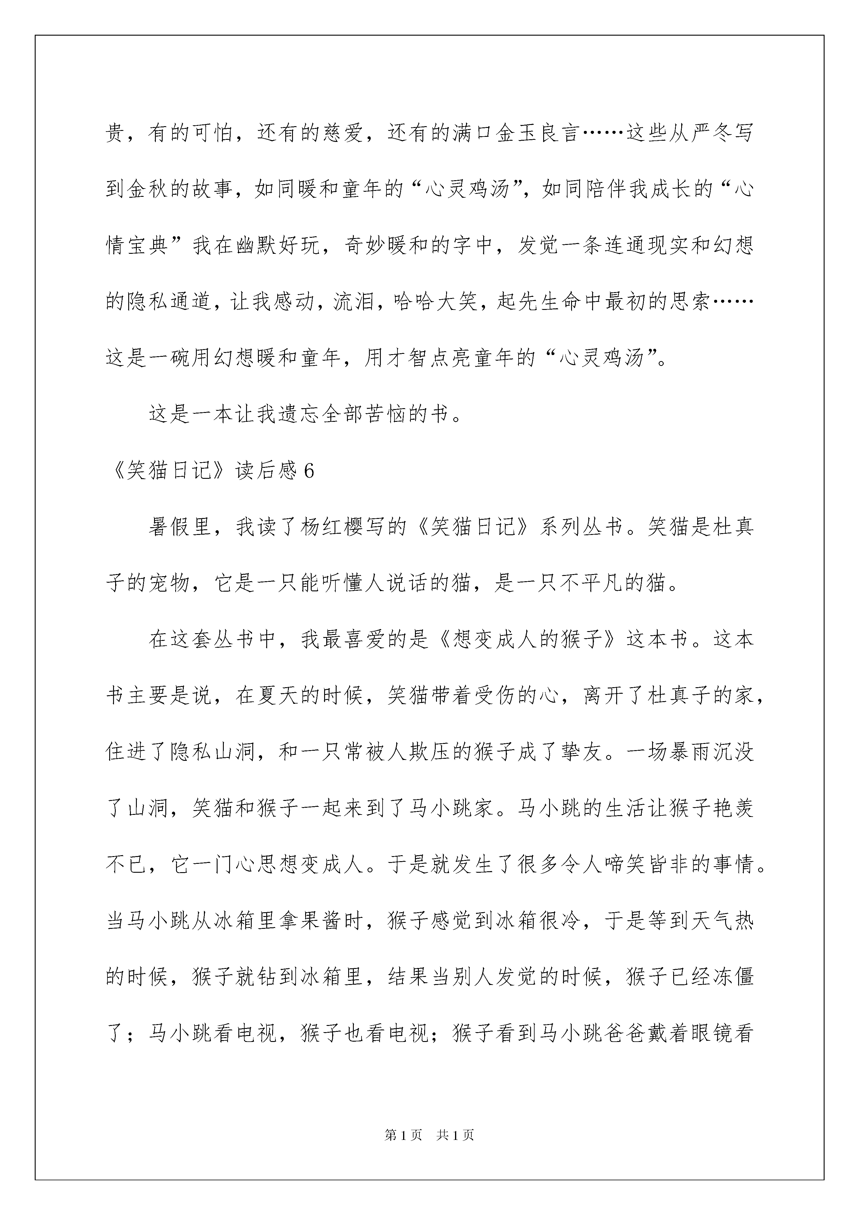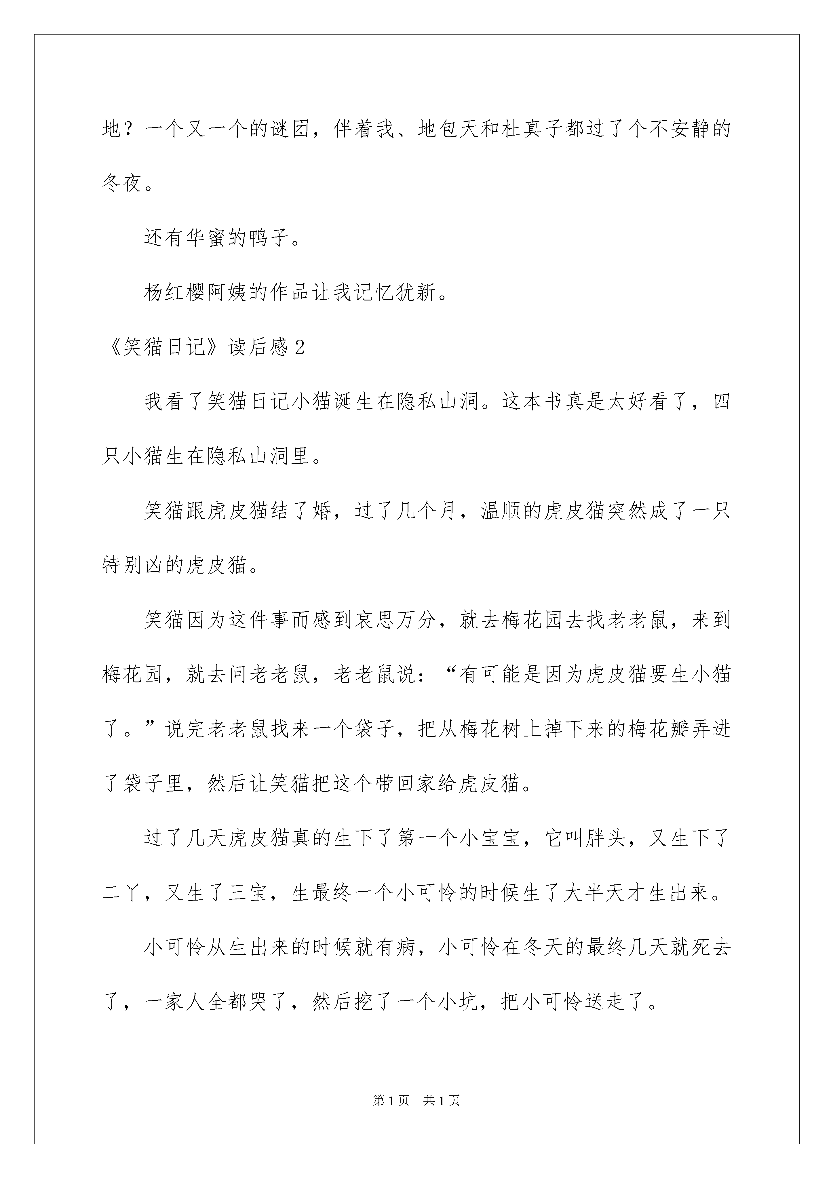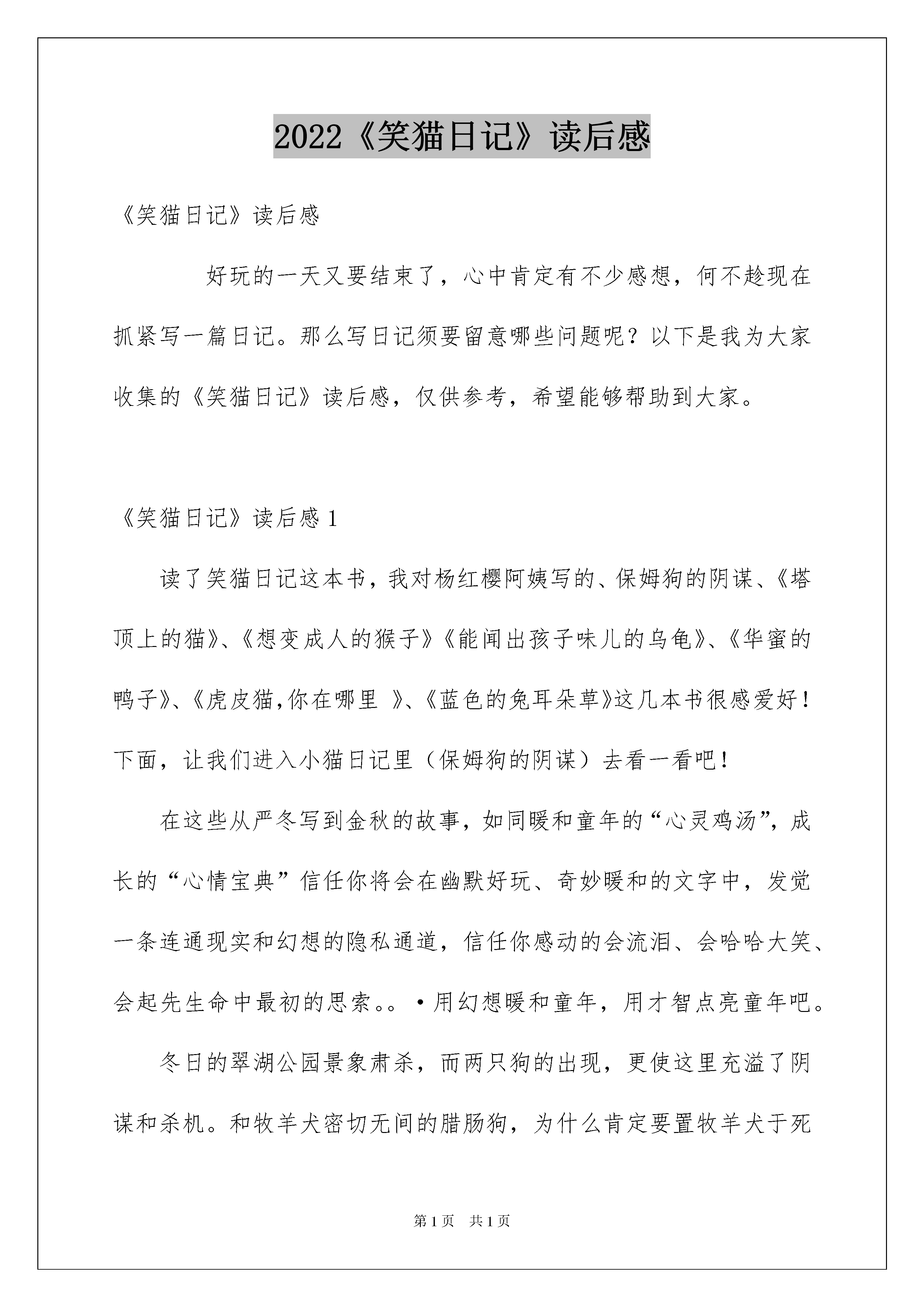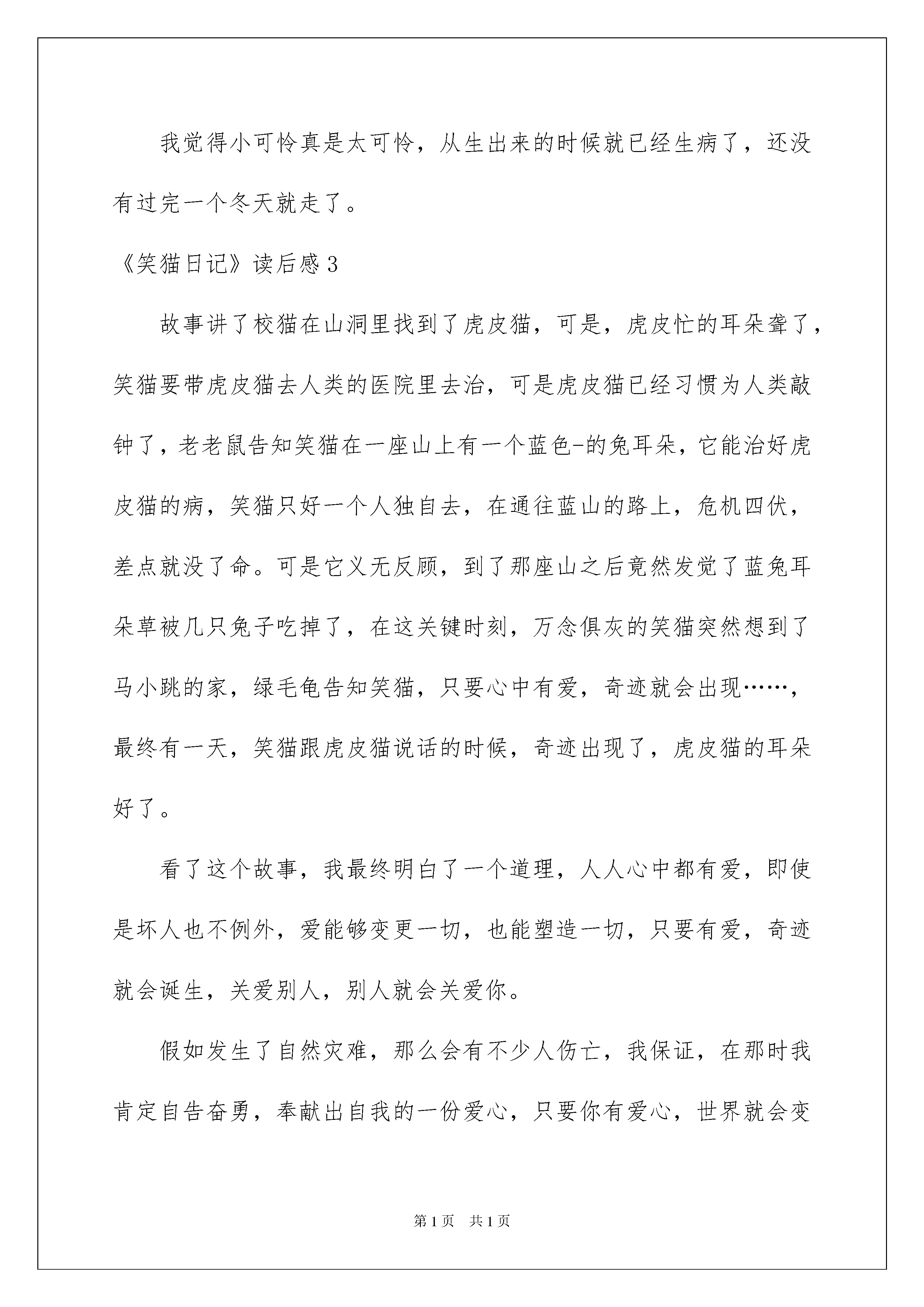 2022《笑猫日记》读后感《笑猫日记》读后感好玩的一天又要结束了,心中肯定有不少感想,何不趁现在抓紧写一篇日记。那么写日记须要留意哪些问题呢?以下是我为大家收集的《笑猫日记》读后感,仅供参考,希望能够帮助到大家。《笑猫日记》读后感1读了笑猫日记这本书,我对杨红樱阿姨写的、保姆狗的阴谋、《塔顶上的猫》、《想变成人的猴子》《能闻出孩子味儿的乌龟》、《华蜜的鸭子》、《虎皮猫,你在哪里》、《蓝色的兔耳朵草》这几本书很感爱好!下面,让我们进入小猫日记里(保姆狗的阴谋)去看一看吧!在这些从严冬写到金秋的故事,如同暖和童年的“心灵鸡汤”,成长的“心情宝典”信任你将会在幽默好玩、奇妙暖和的文字中,发觉一条连通现实和幻想的隐私通道,信任你感动的会流泪、会哈哈大笑、会起先生命中最初的思索。。·用幻想暖和童年,用才智点亮童年吧。冬日的翠湖公园景象肃杀,而两只狗的出现,更使这里充溢了阴谋和杀机。和牧羊犬密切无间的腊肠狗,为什么肯定要置牧羊犬于死地?一个又一个的谜团,伴着我、地包天和杜真子都过了个不安静的冬夜。还有华蜜的鸭子。杨红樱阿姨的作品让我记忆犹新。《笑猫日记》读后感2我看了笑猫日记小猫诞生在隐私山洞。这本书真是太好看了,四只小猫生在隐私山洞里。笑猫跟虎皮猫结了婚,过了几个月,温顺的虎皮猫突然成了一只特别凶的虎皮猫。笑猫因为这件事而感到哀思万分,就去梅花园去找老老鼠,来到梅花园,就去问老老鼠,老老鼠说:“有可能是因为虎皮猫要生小猫了。”说完老老鼠找来一个袋子,把从梅花树上掉下来的梅花瓣弄进了袋子里,然后让笑猫把这个带回家给虎皮猫。过了几天虎皮猫真的生下了第一个小宝宝,它叫胖头,又生下了二丫,又生了三宝,生最终一个小可怜的时候生了大半天才生出来。小可怜从生出来的时候就有病,小可怜在冬天的最终几天就死去了,一家人全都哭了,然后挖了一个小坑,把小可怜送走了。我觉得小可怜真是太可怜,从生出来的时候就已经生病了,还没有过完一个冬天就走了。《笑猫日记》读后感3故事讲了校猫在山洞里找到了虎皮猫,可是,虎皮忙的耳朵聋了,笑猫要带虎皮猫去人类的医院里去治,可是虎皮猫已经习惯为人类敲钟了,老老鼠告知笑猫在一座山上有一个蓝色-的兔耳朵,它能治好虎皮猫的病,笑猫只好一个人独自去,在通往蓝山的路上,危机四伏,差点就没了命。可是它义无反顾,到了那座山之后竟然发觉了蓝兔耳朵草被几只兔子吃掉了,在这关键时刻,万念俱灰的笑猫突然想到了马小跳的家,绿毛龟告知笑猫,只要心中有爱,奇迹就会出现……,最终有一天,笑猫跟虎皮猫说话的时候,奇迹出现了,虎皮猫的耳朵好了。看了这个故事,我最终明白了一个道理,人人心中都有爱,即使是坏人也不例外,爱能够变更一切,也能塑造一切,只要有爱,奇迹就会诞生,关爱别人,别人就会关爱你。假如发生了自然灾难,那么会有不少人伤亡,我保证,在那时我肯定自告奋勇,奉献出自我的一份爱心,只要你有爱心,世界就会变得更完备。《笑猫日记》读后感4今日,我看了一本书名叫《笑猫日记-小猫诞生在隐私山洞》。里面说的是:有一只猫,叫笑猫,他的妻子叫:虎皮猫!在冬天里,虎皮猫生出了4只小猫!可把笑猫给兴奋坏了!后来,虎皮猫给他们取名,老大叫:胖头,老二叫:二丫,老三叫:三宝,老四叫:小可怜!在他们4个当中:小可怜最弱小!虎皮猫在喂它们奶的时候,三宝老是挤着小可怜,所以,虎皮猫只好用爪子护着小可怜。随后,二丫、三宝、胖头,都睁开眼睛了,就是小可怜没有睁开眼睛!笑猫和虎皮猫老是担忧:小可怜的眼睛是不是有问题?只不过,他们只是在心里想。笑猫和虎皮猫很有福气,生了4个孩子,长相都特别的特殊!他们的将来都是怎么样的呢?让我们细致思索!而且小可怜眼睛会睁不开吗?《笑猫日记》读后感5从三年级一学期起先,我起先看《笑猫日记》。起先,我是不兴奋的,因为我厌烦日记。后来我想看一点点,试试口味的,没想到,我竟然迷上了!《笑猫日记》里的人物有的可爱,有的单纯,有的名贵,有的可怕,还有的慈爱,还有的满口金玉良言……这些从严冬写到金秋的故事,如同暖和童年的“心灵鸡汤”,如同陪伴我成长的“心情宝典”我在幽默好玩,奇妙暖和的字中,发觉一条连通现实和幻想的隐私通道,让我感动,流泪,哈哈大笑,起先生命中最初的思索……这是一碗用幻想暖和童年,用才智点亮童年的“心灵鸡汤”。这是一本让我遗忘全部苦恼的书。《笑猫日记》读后感6暑假里,我读了杨红樱写的《笑猫日记》系列丛书。笑猫是杜真子的宠物,它是一只能听懂人说话的猫,是一只不平凡的猫。在这套丛书中,我最喜爱的是《想变成人的猴子》这本书。这本书主要是说,在夏天的时候,笑猫带着受伤的心,离开了杜真子的家,住进了隐私山洞,和一只常