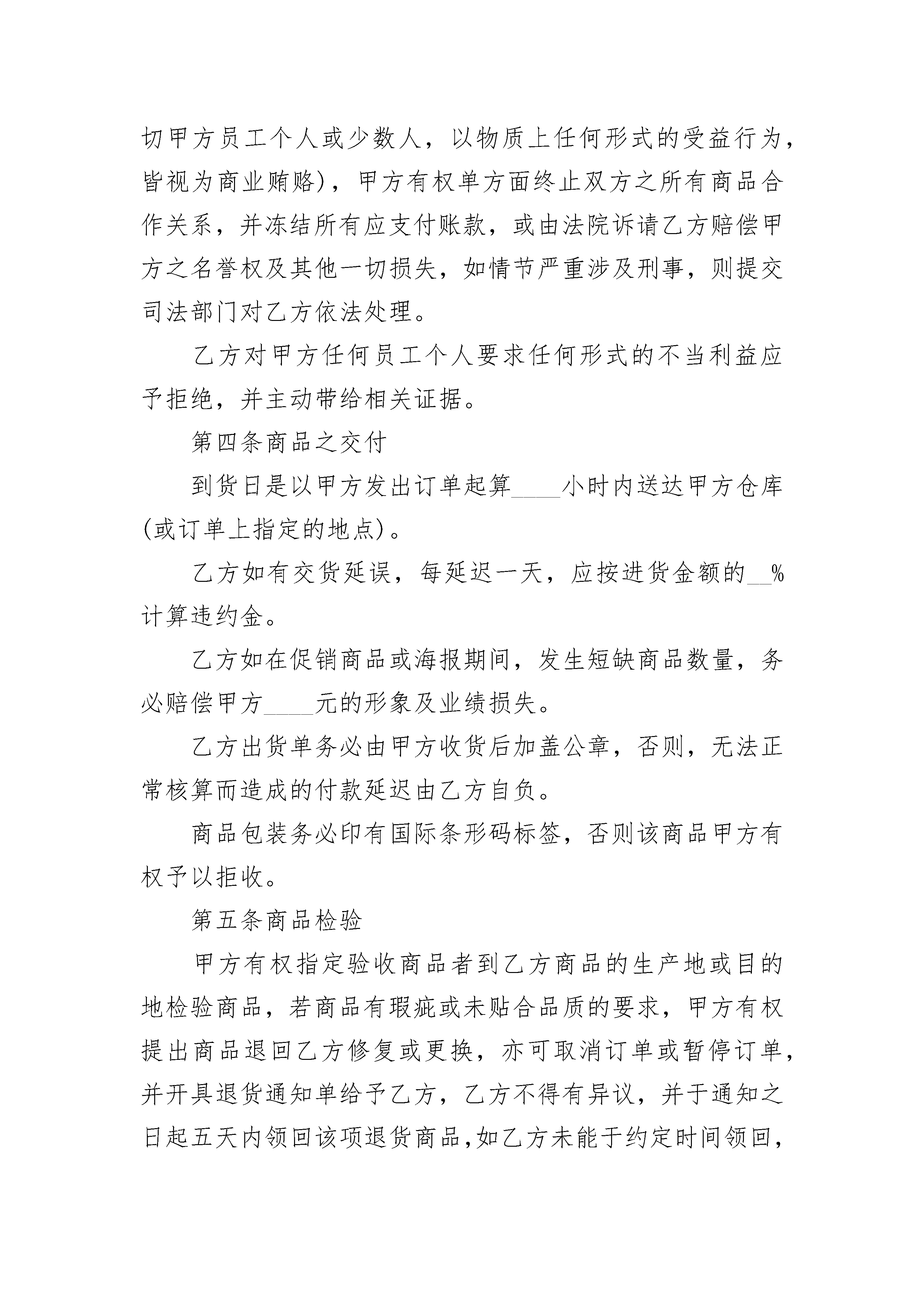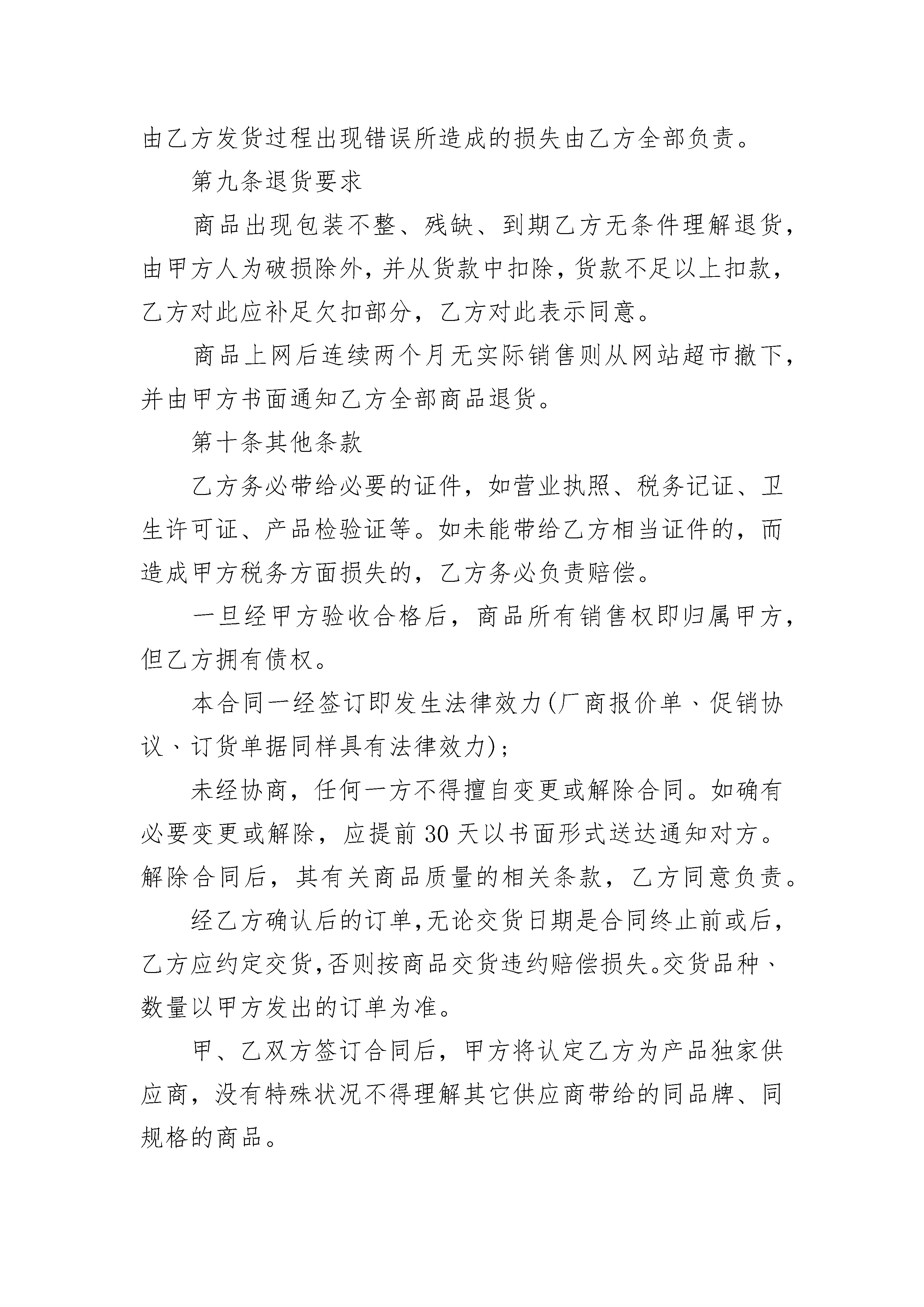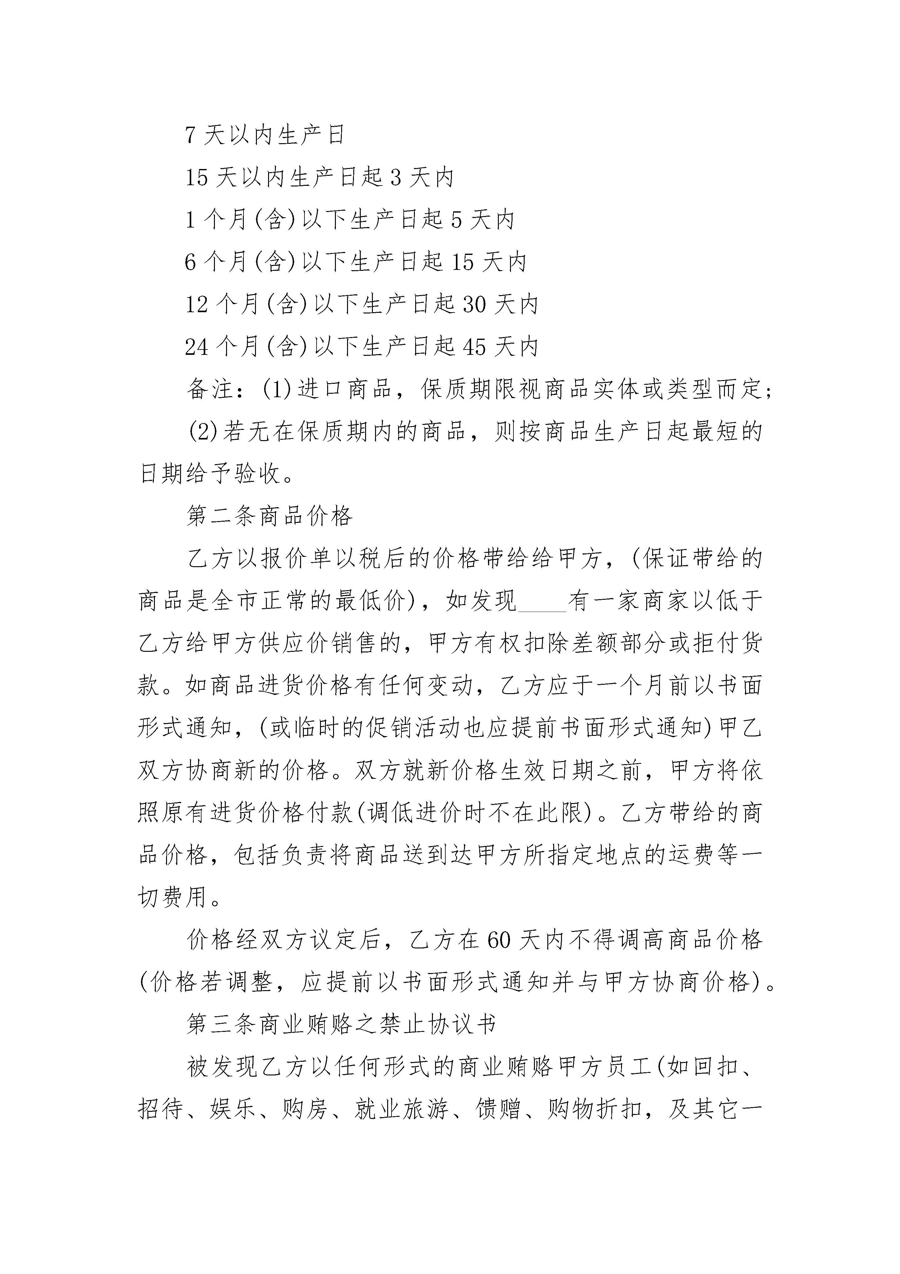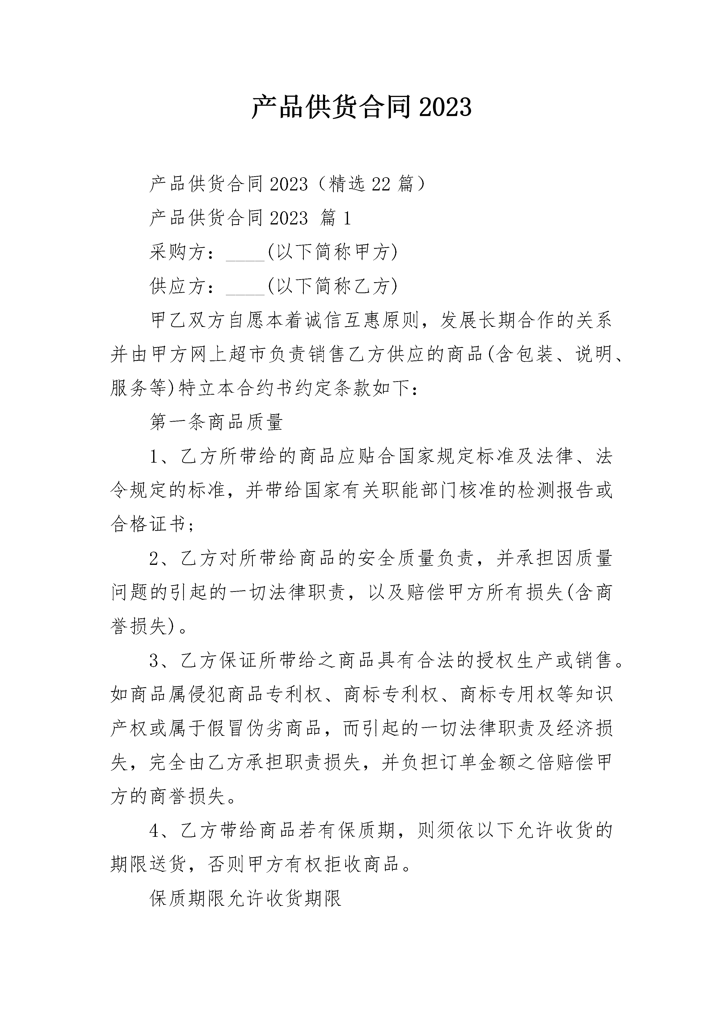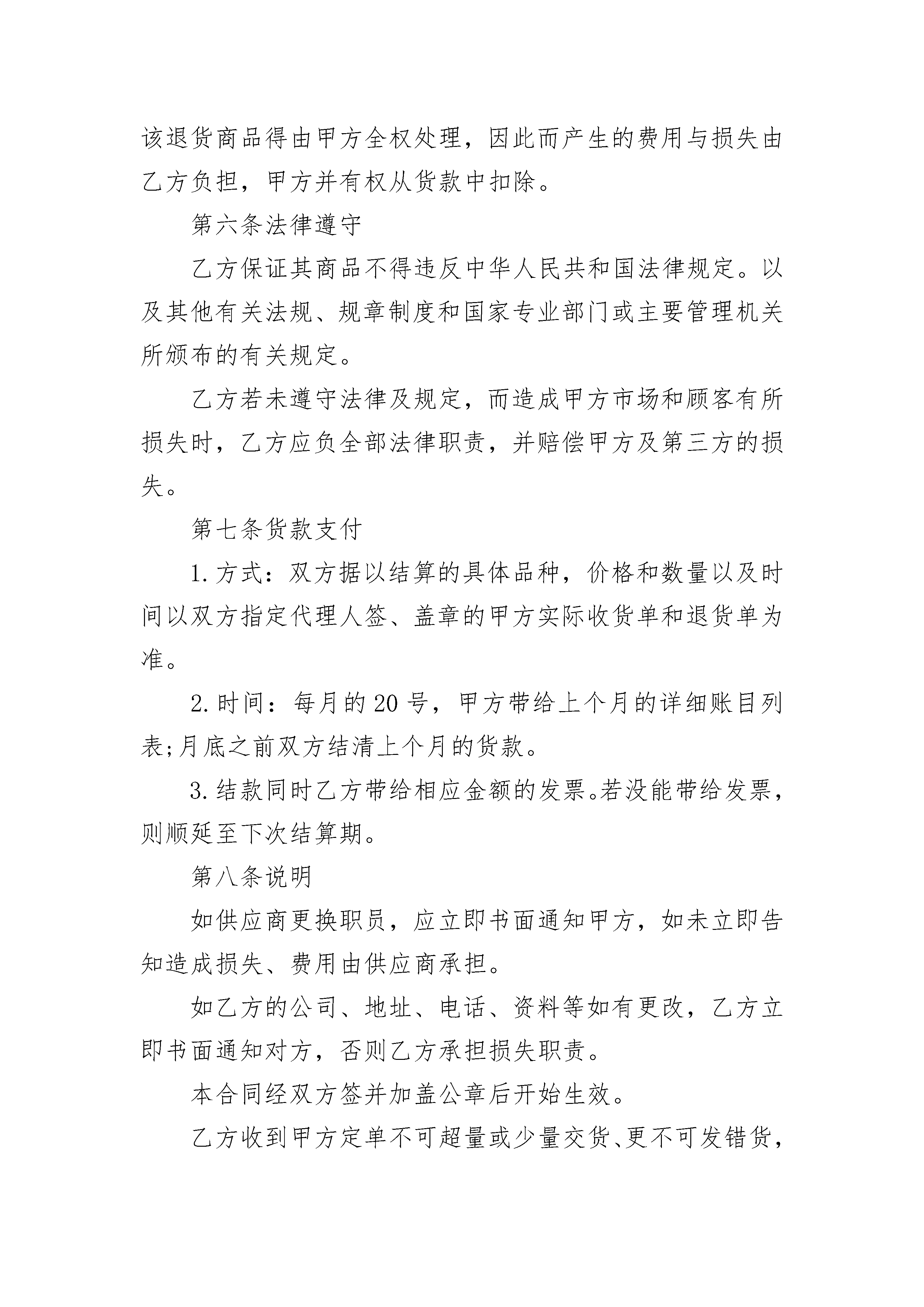 产品供货合同2023产品供货合同2023(精选22篇)产品供货合同2023篇1采购方:____(以下简称甲方)供应方:____(以下简称乙方)甲乙双方自愿本着诚信互惠原则,发展长期合作的关系并由甲方网上超市负责销售乙方供应的商品(含包装、说明、服务等)特立本合约书约定条款如下:第一条商品质量1、乙方所带给的商品应贴合国家规定标准及法律、法令规定的标准,并带给国家有关职能部门核准的检测报告或合格证书;2、乙方对所带给商品的安全质量负责,并承担因质量问题的引起的一切法律职责,以及赔偿甲方所有损失(含商誉损失)。3、乙方保证所带给之商品具有合法的授权生产或销售。如商品属侵犯商品专利权、商标专利权、商标专用权等知识产权或属于假冒伪劣商品,而引起的一切法律职责及经济损失,完全由乙方承担职责损失,并负担订单金额之倍赔偿甲方的商誉损失。4、乙方带给商品若有保质期,则须依以下允许收货的期限送货,否则甲方有权拒收商品。保质期限允许收货期限7天以内生产日15天以内生产日起3天内1个月(含)以下生产日起5天内6个月(含)以下生产日起15天内12个月(含)以下生产日起30天内24个月(含)以下生产日起45天内备注:(1)进口商品,保质期限视商品实体或类型而定;(2)若无在保质期内的商品,则按商品生产日起最短的日期给予验收。第二条商品价格乙方以报价单以税后的价格带给给甲方,(保证带给的商品是全市正常的最低价),如发现____有一家商家以低于乙方给甲方供应价销售的,甲方有权扣除差额部分或拒付货款。如商品进货价格有任何变动,乙方应于一个月前以书面形式通知,(或临时的促销活动也应提前书面形式通知)甲乙双方协商新的价格。双方就新价格生效日期之前,甲方将依照原有进货价格付款(调低进价时不在此限)。乙方带给的商品价格,包括负责将商品送到达甲方所指定地点的运费等一切费用。价格经双方议定后,乙方在60天内不得调高商品价格(价格若调整,应提前以书面形式通知并与甲方协商价格)。第三条商业贿赂之禁止协议书被发现乙方以任何形式的商业贿赂甲方员工(如回扣、招待、娱乐、购房、就业旅游、馈赠、购物折扣,及其它一切甲方员工个人或少数人,以物质上任何形式的受益行为,皆视为商业贿赂),甲方有权单方面终止双方之所有商品合作关系,并冻结所有应支付账款,或由法院诉请乙方赔偿甲方之名誉权及其他一切损失,如情节严重涉及刑事,则提交司法部门对乙方依法处理。乙方对甲方任何员工个人要求任何形式的不当利益应予拒绝,并主动带给相关证据。第四条商品之交付到货日是以甲方发出订单起算____小时内送达甲方仓库(或订单上指定的地点)。乙方如有交货延误,每延迟一天,应按进货金额的__%计算违约金。乙方如在促销商品或海报期间,发生短缺商品数量,务必赔偿甲方____元的形象及业绩损失。乙方出货单务必由甲方收货后加盖公章,否则,无法正常核算而造成的付款延迟由乙方自负。商品包装务必印有国际条形码标签,否则该商品甲方有权予以拒收。第五条商品检验甲方有权指定验收商品者到乙方商品的生产地或目的地检验商品,若商品有瑕疵或未贴合品质的要求,甲方有权提出商品退回乙方修复或更换,亦可取消订单或暂停订单,并开具退货通知单给予乙方,乙方不得有异议,并于通知之日起五天内领回该项退货商品,如乙方未能于约定时间领回,该退货商品得由甲方全权处理,因此而产生的费用与损失由乙方负担,甲方并有权从货款中扣除。第六条法律遵守乙方保证其商品不得违反中华人民共和国法律规定。以及其他有关法规、规章制度和国家专业部门或主要管理机关所颁布的有关规定。乙方若未遵守法律及规定,而造成甲方市场和顾客有所损失时,乙方应负全部法律职责,并赔偿甲方及第三方的损失。第七条货款支付1.方式:双方据以结算的具体品种,价格和数量以及时间以双方指定代理人签、盖章的甲方实际收货单和退货单为准。2.时间:每月的20号,甲方带给上个月的详细账目列表;月底之前双方结清上个月的货款。3.结款同时乙方带给相应金额的发票。若没能带给发票,则顺延至下次结算期。第八条说明如供应商更换职员,应立即书面通知甲方,如未立即告知造成损失、费用由供应商承担。如乙方的公司、地址、电话、资料等如有更改,乙方立即书面通知对方,否则乙方承担损失职责。本合同经双方签并加盖公章后开始生效。乙方收到甲方定单不可超量或少量交货、更不可发错货,由乙方发货过程出现错误所造成的损失由乙方全部负责。第九条退货要求商品出现包装不整、残缺、到期乙方无条件理解退货,由甲方人为破损除外,并从货款中扣除,货款不足以上扣款,乙方对此应补足欠扣部分,乙方对此表示同意。商品上网后连续两个月无实际销售则从网站超市撤下,并由甲方书面通知乙方全部商品退货。第十条其他条款乙方务必带给必要的证件,如营业执照、税务记证、卫生许可证、产品检验证等。如未能带给乙方相当