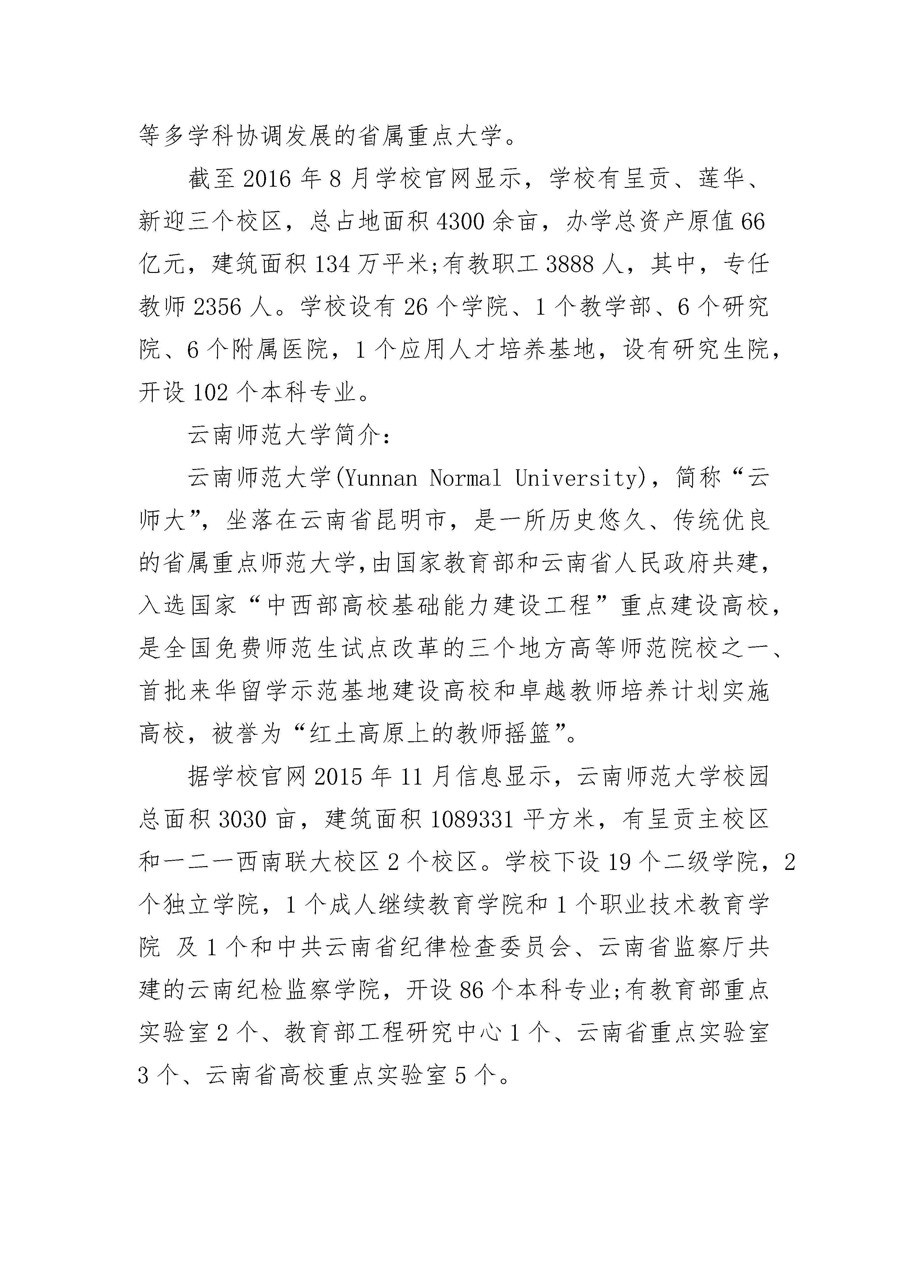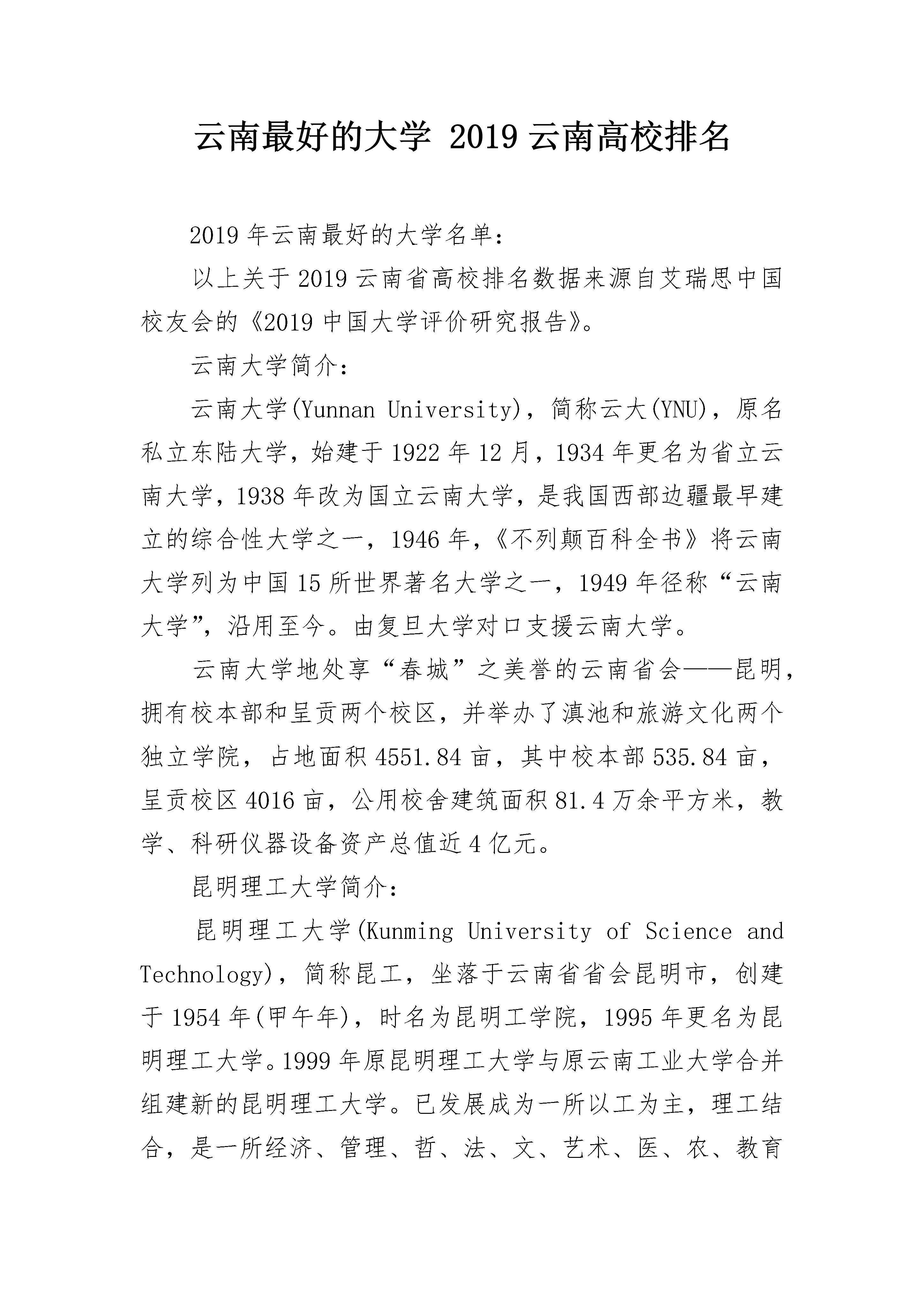 云南最好的大学2019云南高校排名2019年云南最好的大学名单:以上关于2019云南省高校排名数据来源自艾瑞思中国校友会的《2019中国大学评价研究报告》。云南大学简介:云南大学(YunnanUniversity),简称云大(YNU),原名私立东陆大学,始建于1922年12月,1934年更名为省立云南大学,1938年改为国立云南大学,是我国西部边疆最早建立的综合性大学之一,1946年,《不列颠百科全书》将云南大学列为中国15所世界著名大学之一,1949年径称“云南大学”,沿用至今。由复旦大学对口支援云南大学。云南大学地处享“春城”之美誉的云南省会——昆明,拥有校本部和呈贡两个校区,并举办了滇池和旅游文化两个独立学院,占地面积4551.84亩,其中校本部535.84亩,呈贡校区4016亩,公用校舍建筑面积81.4万余平方米,教学、科研仪器设备资产总值近4亿元。昆明理工大学简介:昆明理工大学(KunmingUniversityofScienceandTechnology),简称昆工,坐落于云南省省会昆明市,创建于1954年(甲午年),时名为昆明工学院,1995年更名为昆明理工大学。1999年原昆明理工大学与原云南工业大学合并组建新的昆明理工大学。已发展成为一所以工为主,理工结合,是一所经济、管理、哲、法、文、艺术、医、农、教育等多学科协调发展的省属重点大学。截至2016年8月学校官网显示,学校有呈贡、莲华、新迎三个校区,总占地面积4300余亩,办学总资产原值66亿元,建筑面积134万平米;有教职工3888人,其中,专任教师2356人。学校设有26个学院、1个教学部、6个研究院、6个附属医院,1个应用人才培养基地,设有研究生院,开设102个本科专业。云南师范大学简介:云南师范大学(YunnanNormalUniversity),简称“云师大”,坐落在云南省昆明市,是一所历史悠久、传统优良的省属重点师范大学,由国家教育部和云南省人民政府共建,入选国家“中西部高校基础能力建设工程”重点建设高校,是全国免费师范生试点改革的三个地方高等师范院校之一、首批来华留学示范基地建设高校和卓越教师培养计划实施高校,被誉为“红土高原上的教师摇篮”。据学校官网2015年11月信息显示,云南师范大学校园总面积3030亩,建筑面积1089331平方米,有呈贡主校区和一二一西南联大校区2个校区。学校下设19个二级学院,2个独立学院,1个成人继续教育学院和1个职业技术教育学院及1个和中共云南省纪律检查委员会、云南省监察厅共建的云南纪检监察学院,开设86个本科专业;有教育部重点实验室2个、教育部工程研究中心1个、云南省重点实验室3个、云南省高校重点实验室5个。