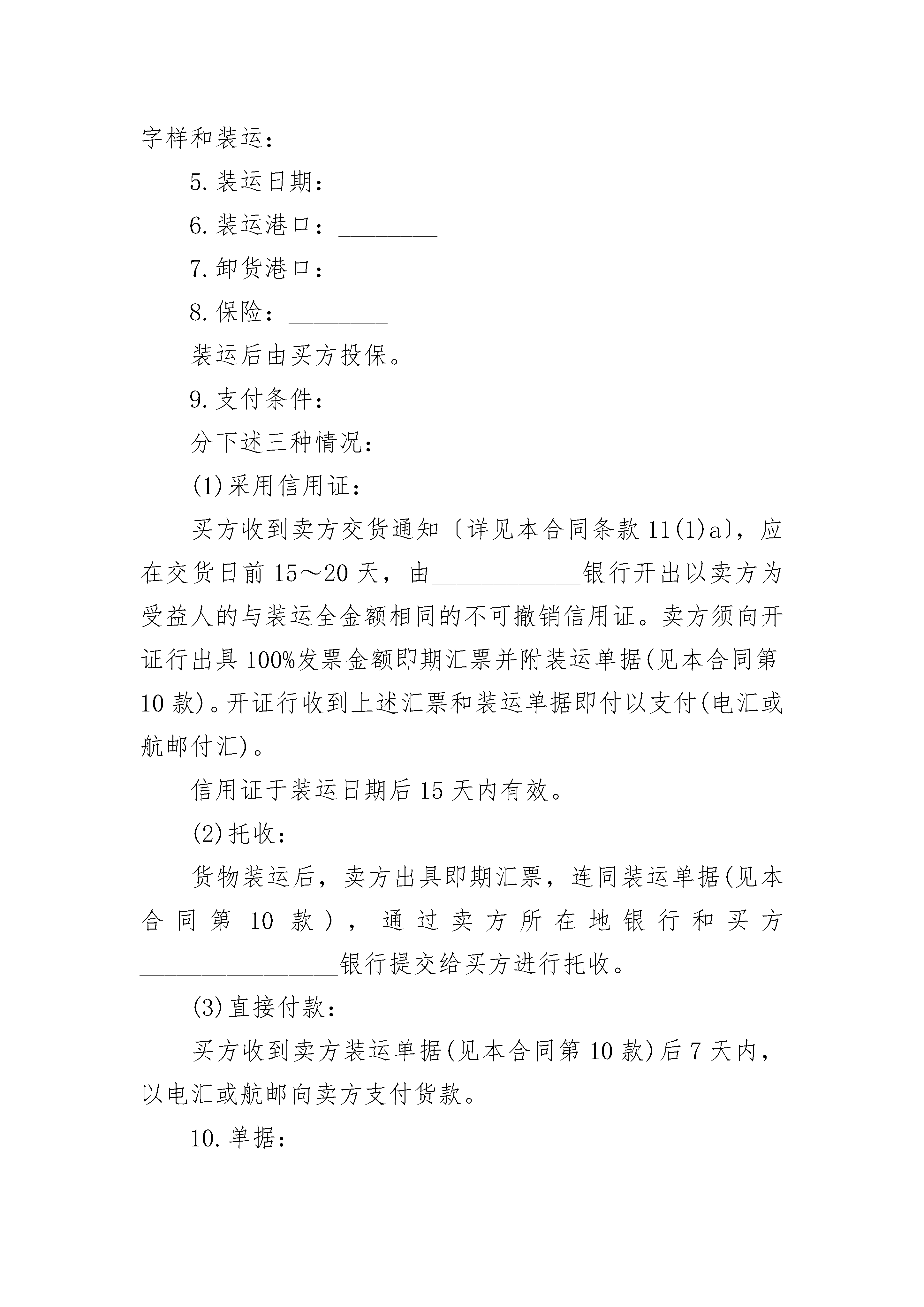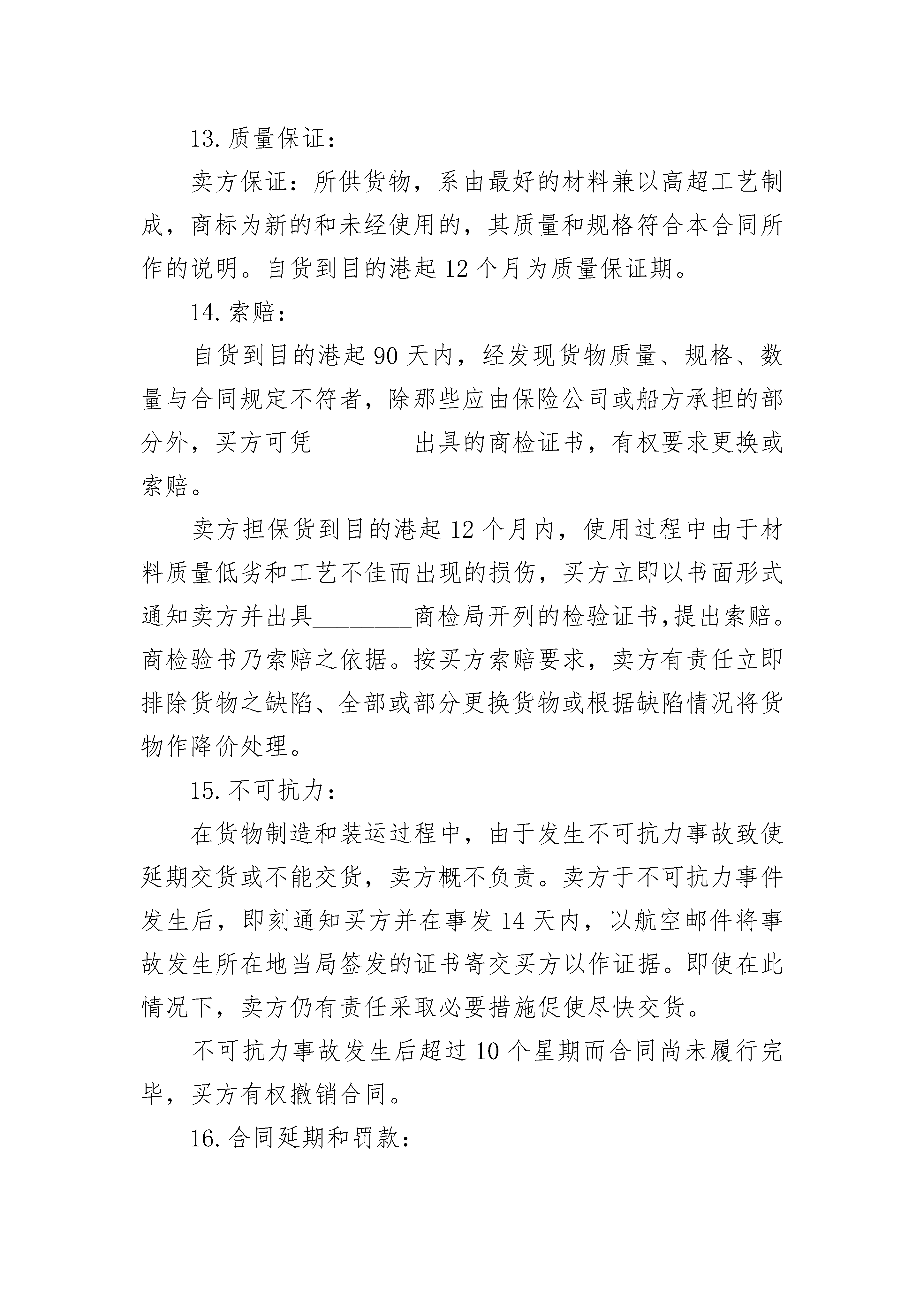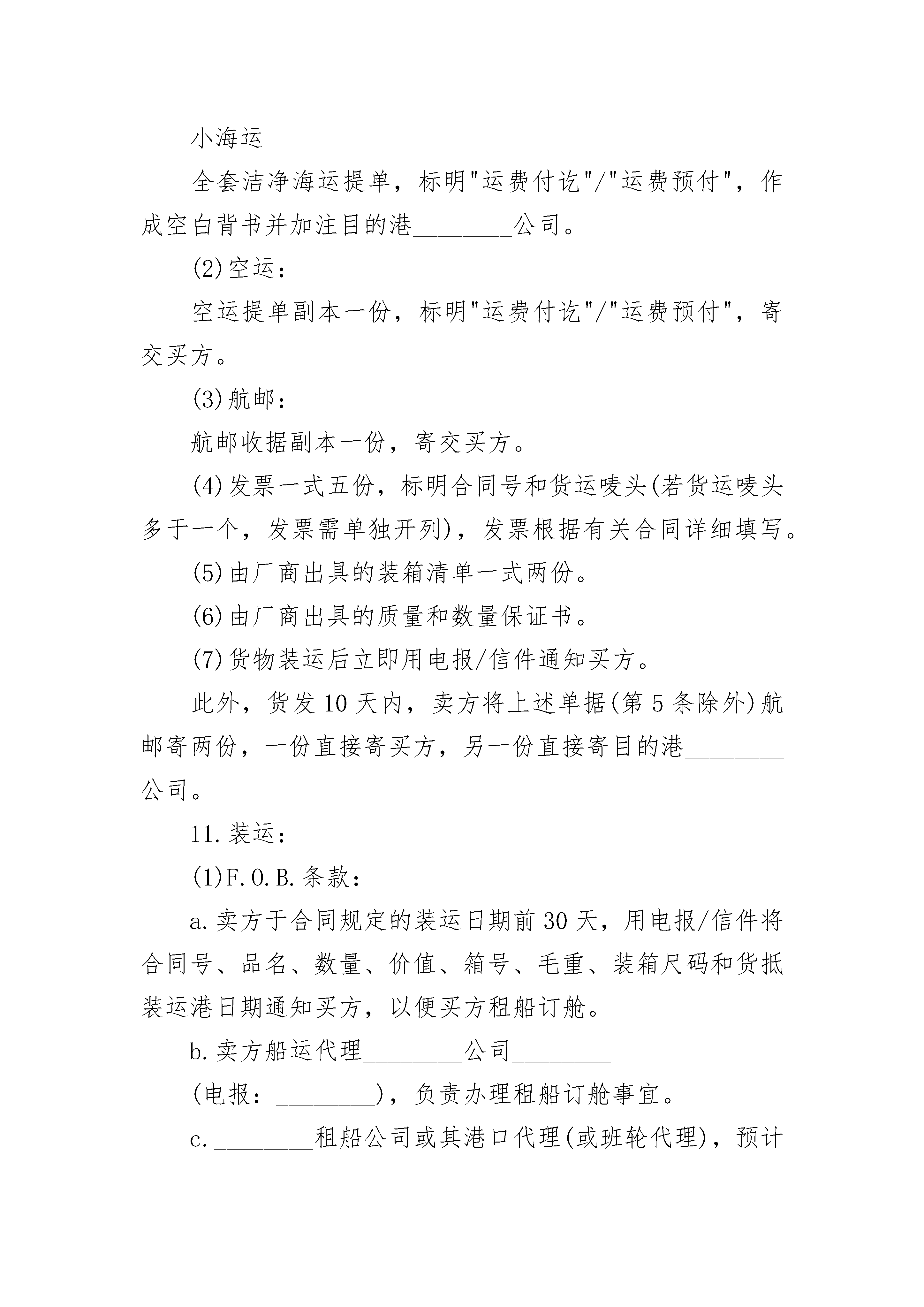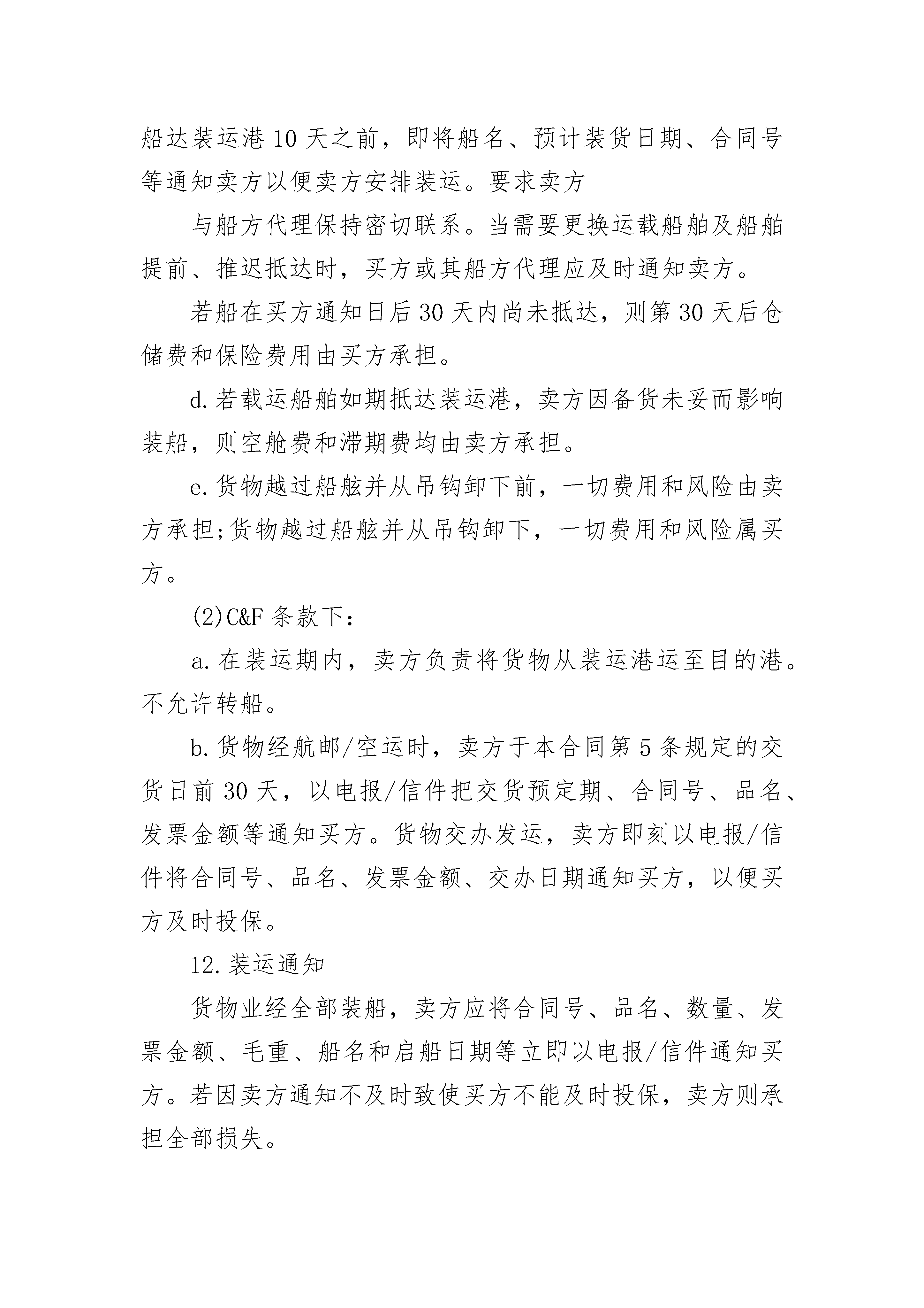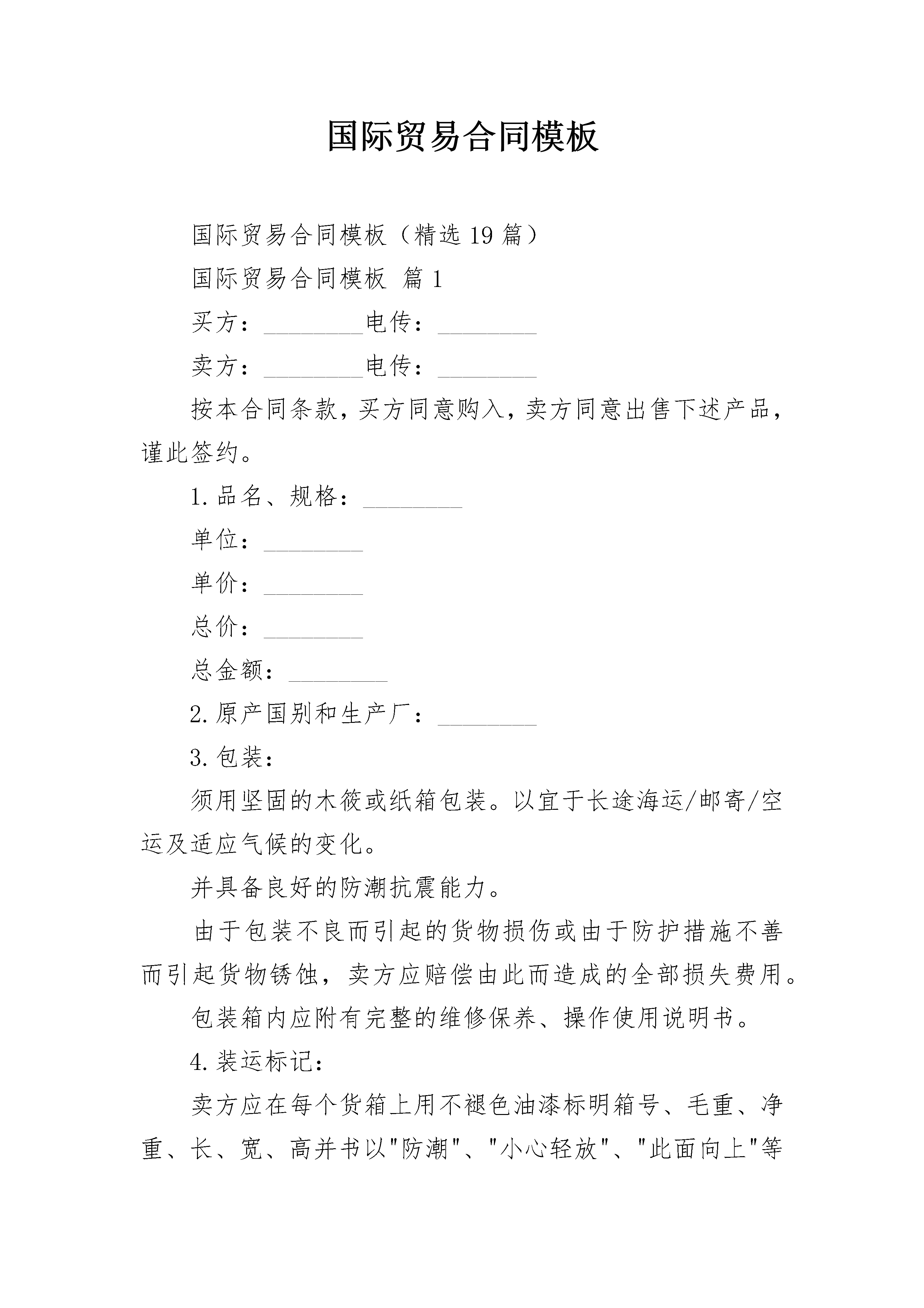 国际贸易合同模板国际贸易合同模板(精选19篇)国际贸易合同模板篇1买方:________电传:________卖方:________电传:________按本合同条款,买方同意购入,卖方同意出售下述产品,谨此签约。1.品名、规格:________单位:________单价:________总价:________总金额:________2.原产国别和生产厂:________3.包装:须用坚固的木筱或纸箱包装。以宜于长途海运/邮寄/空运及适应气候的变化。并具备良好的防潮抗震能力。由于包装不良而引起的货物损伤或由于防护措施不善而引起货物锈蚀,卖方应赔偿由此而造成的全部损失费用。包装箱内应附有完整的维修保养、操作使用说明书。4.装运标记:卖方应在每个货箱上用不褪色油漆标明箱号、毛重、净重、长、宽、高并书以"防潮"、"小心轻放"、"此面向上"等字样和装运:5.装运日期:________6.装运港口:________7.卸货港口:________8.保险:________装运后由买方投保。9.支付条件:分下述三种情况:(1)采用信用证:买方收到卖方交货通知〔详见本合同条款11(1)a〕,应在交货日前15~20天,由____________银行开出以卖方为受益人的与装运全金额相同的不可撤销信用证。卖方须向开证行出具100%发票金额即期汇票并附装运单据(见本合同第10款)。开证行收到上述汇票和装运单据即付以支付(电汇或航邮付汇)。信用证于装运日期后15天内有效。(2)托收:货物装运后,卖方出具即期汇票,连同装运单据(见本合同第10款),通过卖方所在地银行和买方________________银行提交给买方进行托收。(3)直接付款:买方收到卖方装运单据(见本合同第10款)后7天内,以电汇或航邮向卖方支付货款。10.单据:小海运全套洁净海运提单,标明"运费付讫"/"运费预付",作成空白背书并加注目的港________公司。(2)空运:空运提单副本一份,标明"运费付讫"/"运费预付",寄交买方。(3)航邮:航邮收据副本一份,寄交买方。(4)发票一式五份,标明合同号和货运唛头(若货运唛头多于一个,发票需单独开列),发票根据有关合同详细填写。(5)由厂商出具的装箱清单一式两份。(6)由厂商出具的质量和数量保证书。(7)货物装运后立即用电报/信件通知买方。此外,货发10天内,卖方将上述单据(第5条除外)航邮寄两份,一份直接寄买方,另一份直接寄目的港________公司。11.装运:(1)F.O.B.条款:a.卖方于合同规定的装运日期前30天,用电报/信件将合同号、品名、数量、价值、箱号、毛重、装箱尺码和货抵装运港日期通知买方,以便买方租船订舱。b.卖方船运代理________公司________(电报:________),负责办理租船订舱事宜。c.________租船公司或其港口代理(或班轮代理),预计船达装运港10天之前,即将船名、预计装货日期、合同号等通知卖方以便卖方安排装运。要求卖方与船方代理保持密切联系。当需要更换运载船舶及船舶提前、推迟抵达时,买方或其船方代理应及时通知卖方。若船在买方通知日后30天内尚未抵达,则第30天后仓储费和保险费用由买方承担。d.若载运船舶如期抵达装运港,卖方因备货未妥而影响装船,则空舱费和滞期费均由卖方承担。e.货物越过船舷并从吊钩卸下前,一切费用和风险由卖方承担;货物越过船舷并从吊钩卸下,一切费用和风险属买方。(2)C&F条款下:a.在装运期内,卖方负责将货物从装运港运至目的港。不允许转船。b.货物经航邮/空运时,卖方于本合同第5条规定的交货日前30天,以电报/信件把交货预定期、合同号、品名、发票金额等通知买方。货物交办发运,卖方即刻以电报/信件将合同号、品名、发票金额、交办日期通知买方,以便买方及时投保。12.装运通知货物业经全部装船,卖方应将合同号、品名、数量、发票金额、毛重、船名和启船日期等立即以电报/信件通知买方。若因卖方通知不及时致使买方不能及时投保,卖方则承担全部损失。13.质量保证:卖方保证:所供货物,系由最好的材料兼以高超工艺制成,商标为新的和未经使用的,其质量和规格符合本合同所作的说明。自货到目的港起12个月为质量保证期。14.索赔:自货到目的港起90天内,经发现货物质量、规格、数量与合同规定不符者,除那些应由保险公司或船方承担的部分外,买方可凭________出具的商检证书,有权要求更换或索赔。卖方担保货到目的港起12个月内,使用过程中由于材料质量低劣和工艺不佳而出现的损伤,买方立即以书面形式通知卖方并出具________商检局开列的检验证书,提出索赔。商检验书乃索赔之依据。按买方索赔要求,卖方有责任立即排除货物之缺陷、全部或部分更换货物或根据缺陷情况将货物作降价处理。15.不可抗力:在货物制