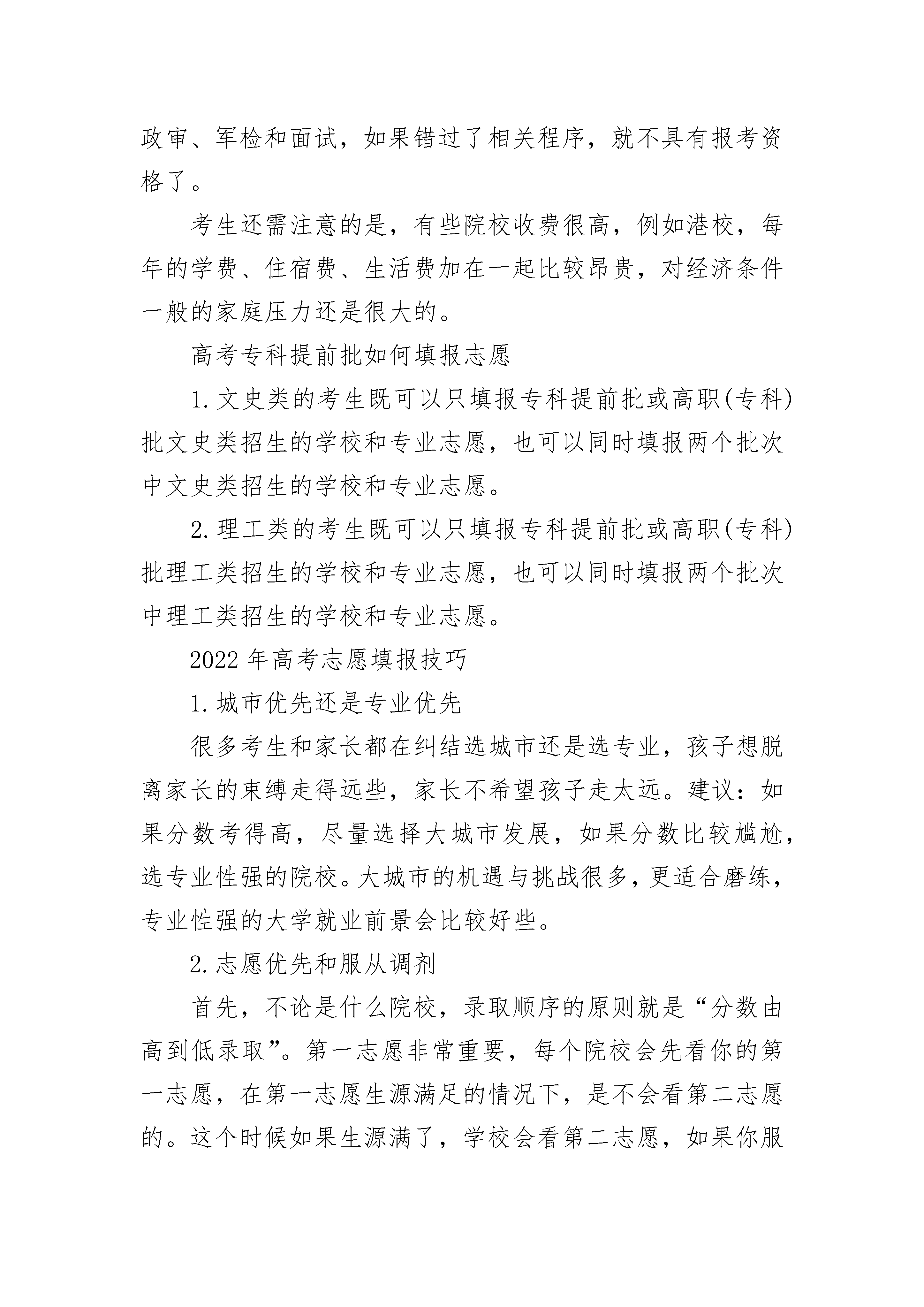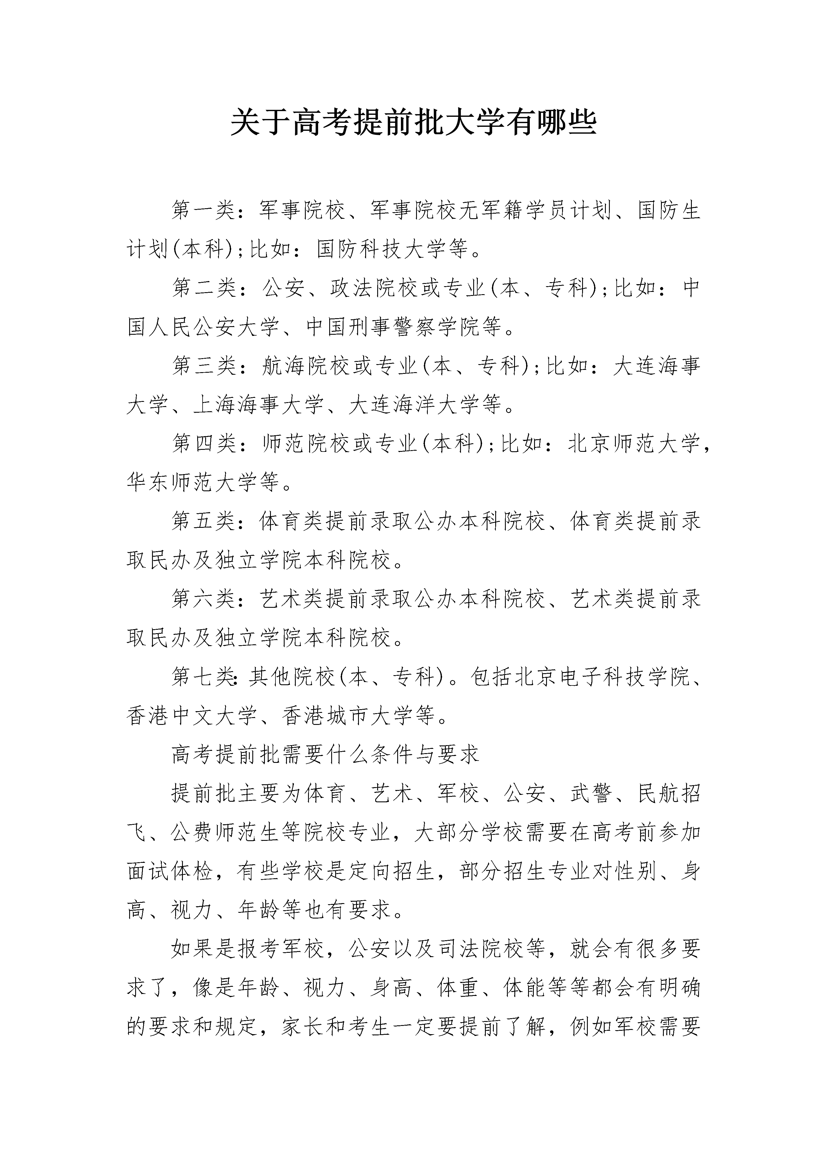 关于高考提前批大学有哪些第一类:军事院校、军事院校无军籍学员计划、国防生计划(本科);比如:国防科技大学等。第二类:公安、政法院校或专业(本、专科);比如:中国人民公安大学、中国刑事警察学院等。第三类:航海院校或专业(本、专科);比如:大连海事大学、上海海事大学、大连海洋大学等。第四类:师范院校或专业(本科);比如:北京师范大学,华东师范大学等。第五类:体育类提前录取公办本科院校、体育类提前录取民办及独立学院本科院校。第六类:艺术类提前录取公办本科院校、艺术类提前录取民办及独立学院本科院校。第七类:其他院校(本、专科)。包括北京电子科技学院、香港中文大学、香港城市大学等。高考提前批需要什么条件与要求提前批主要为体育、艺术、军校、公安、武警、民航招飞、公费师范生等院校专业,大部分学校需要在高考前参加面试体检,有些学校是定向招生,部分招生专业对性别、身高、视力、年龄等也有要求。如果是报考军校,公安以及司法院校等,就会有很多要求了,像是年龄、视力、身高、体重、体能等等都会有明确的要求和规定,家长和考生一定要提前了解,例如军校需要政审、军检和面试,如果错过了相关程序,就不具有报考资格了。考生还需注意的是,有些院校收费很高,例如港校,每年的学费、住宿费、生活费加在一起比较昂贵,对经济条件一般的家庭压力还是很大的。高考专科提前批如何填报志愿1.文史类的考生既可以只填报专科提前批或高职(专科)批文史类招生的学校和专业志愿,也可以同时填报两个批次中文史类招生的学校和专业志愿。2.理工类的考生既可以只填报专科提前批或高职(专科)批理工类招生的学校和专业志愿,也可以同时填报两个批次中理工类招生的学校和专业志愿。2022年高考志愿填报技巧1.城市优先还是专业优先很多考生和家长都在纠结选城市还是选专业,孩子想脱离家长的束缚走得远些,家长不希望孩子走太远。建议:如果分数考得高,尽量选择大城市发展,如果分数比较尴尬,选专业性强的院校。大城市的机遇与挑战很多,更适合磨练,专业性强的大学就业前景会比较好些。2.志愿优先和服从调剂首先,不论是什么院校,录取顺序的原则就是“分数由高到低录取”。第一志愿非常重要,每个院校会先看你的第一志愿,在第一志愿生源满足的情况下,是不会看第二志愿的。这个时候如果生源满了,学校会看第二志愿,如果你服从调剂,那就可以录取,否则进行退档处理。3.分数优先与志愿作废“分数优先”是不变的原则,分数与你的排名位次一样,现在新高考当中位次很重要。多方面考虑,分数不是参考标准,要看你的分数所排的位次。如果第一志愿被录取,那之后的志愿就会作废,所以第一志愿很重要。而在志愿填报的时候,如果分数高,第一志愿选择热门专业,如果对分数没把握,就在第三或是第四志愿填比较保守的专业。4.报考不成功,抓住征集志愿一般在一些院校或者专业招生计划没有完成时,会进行志愿征集。有些之前高分没有包好的学生,此时会心灰意冷随便填写一个志愿上大学,对于分数略低,符合条件的同学可以选择以下,只是有的学校地区比较偏远,大家提前考虑以下。