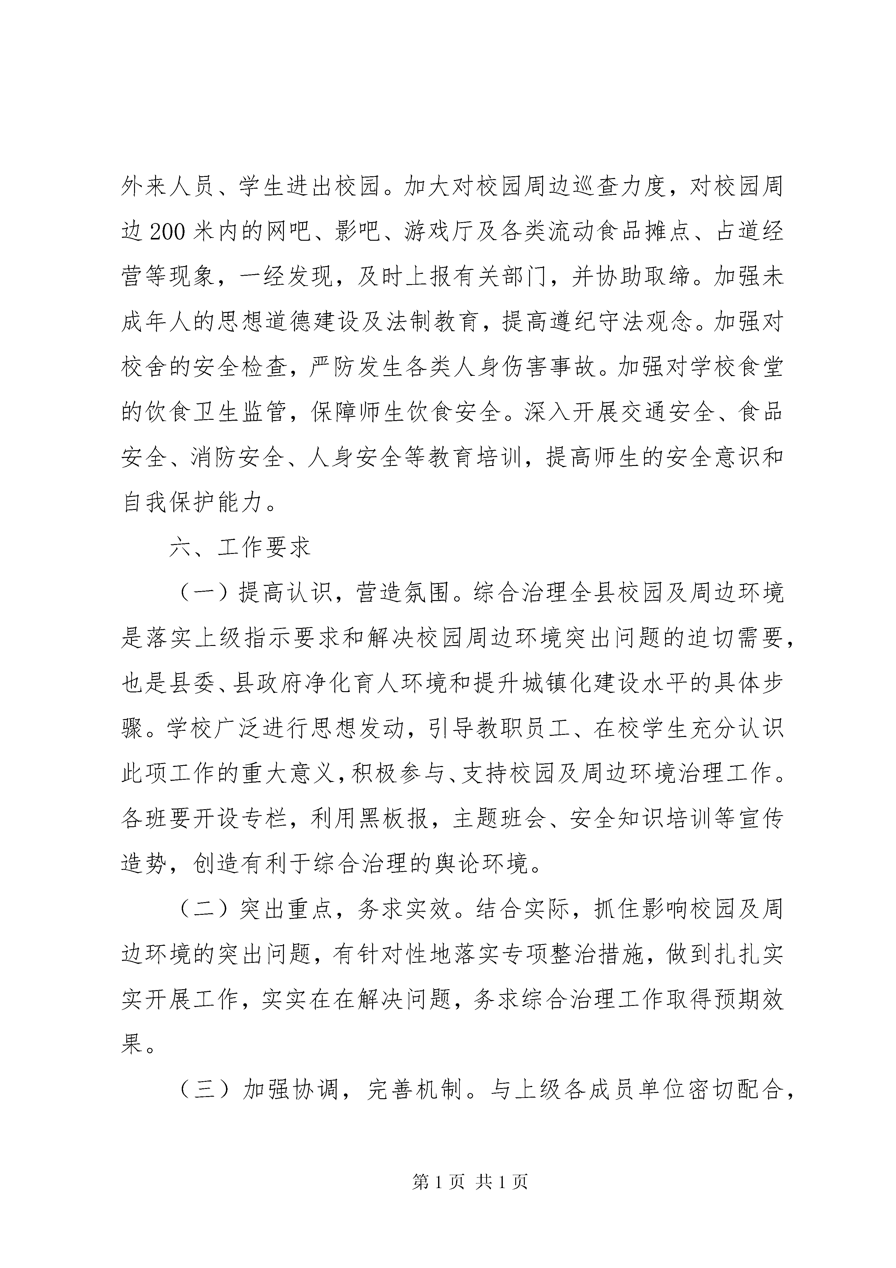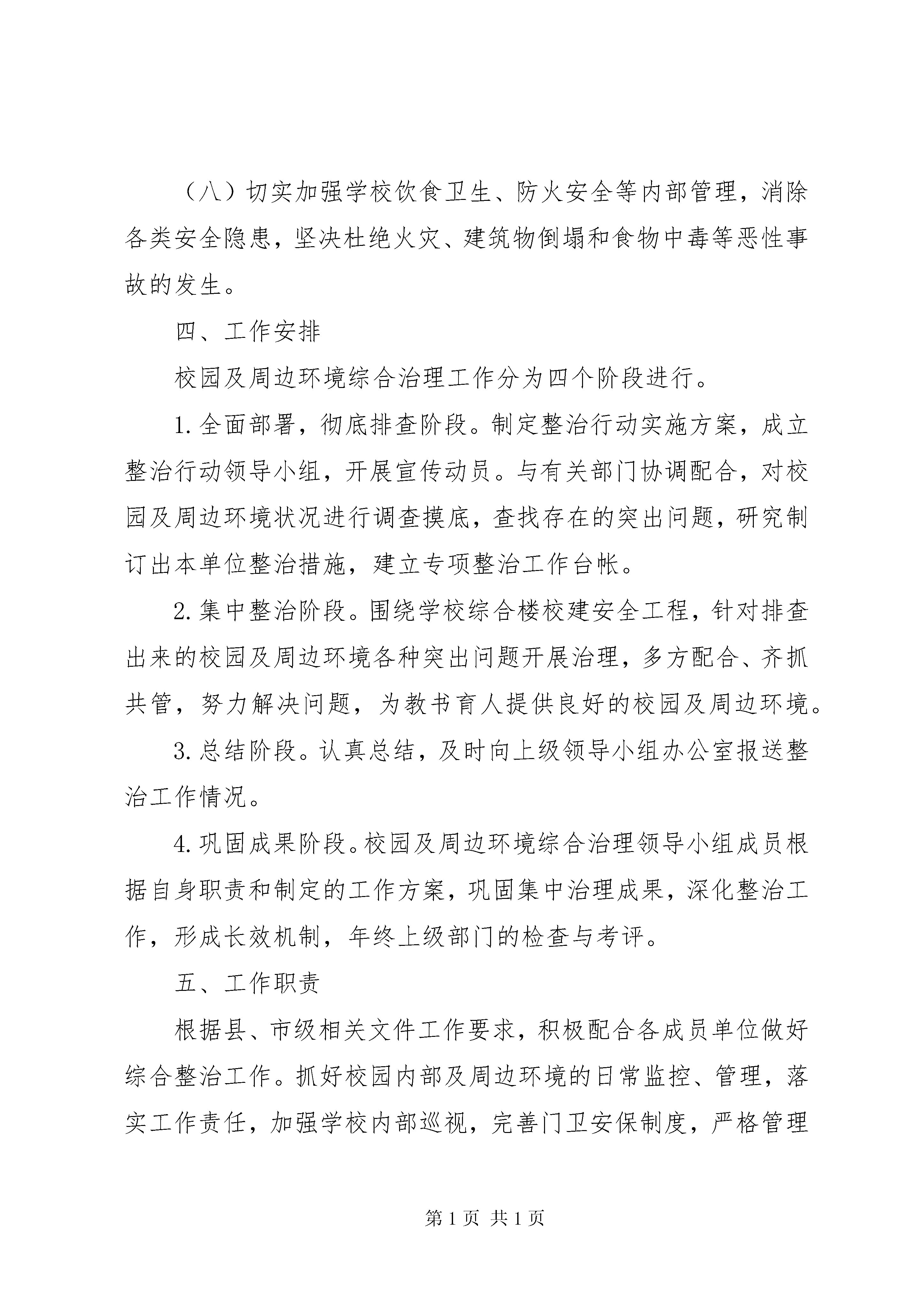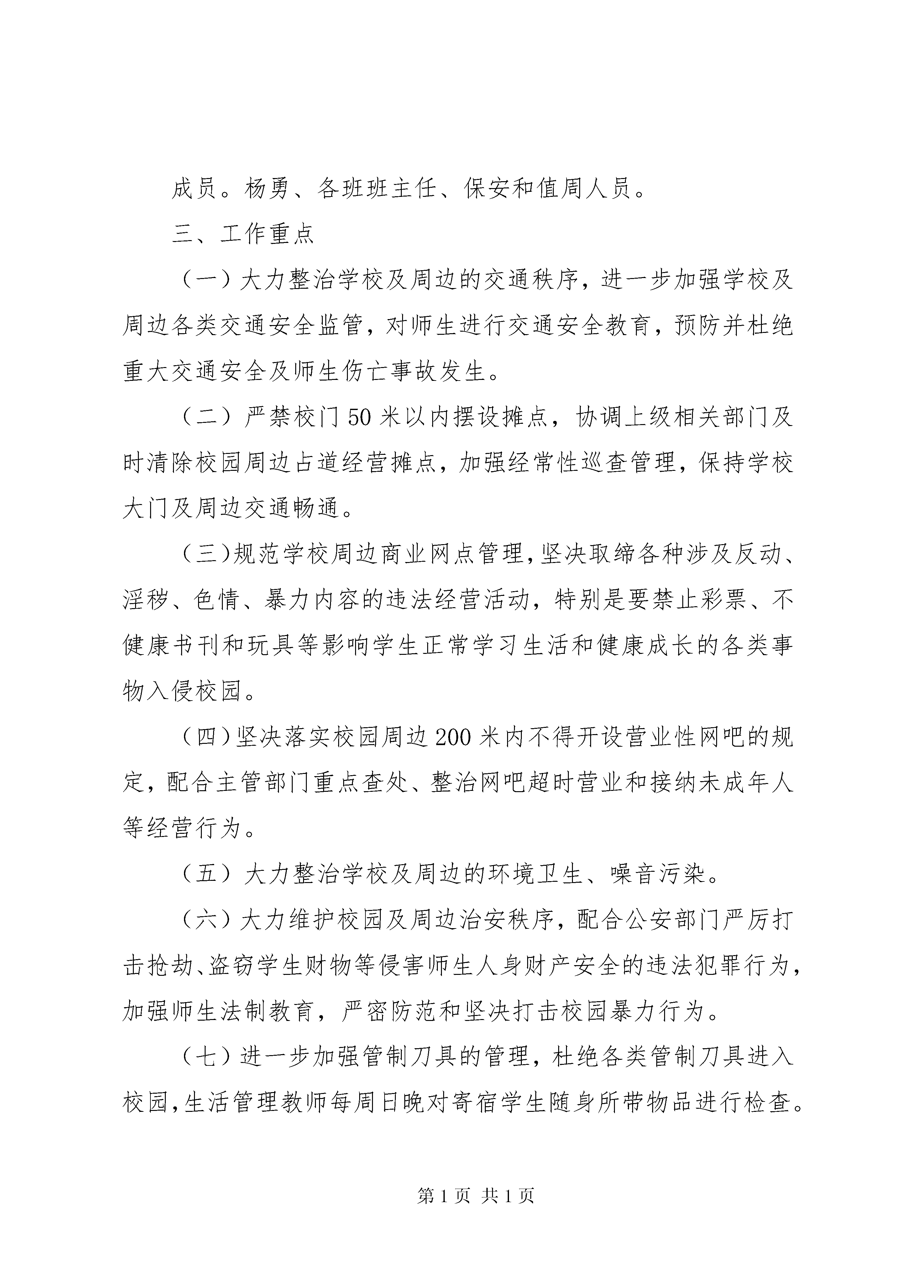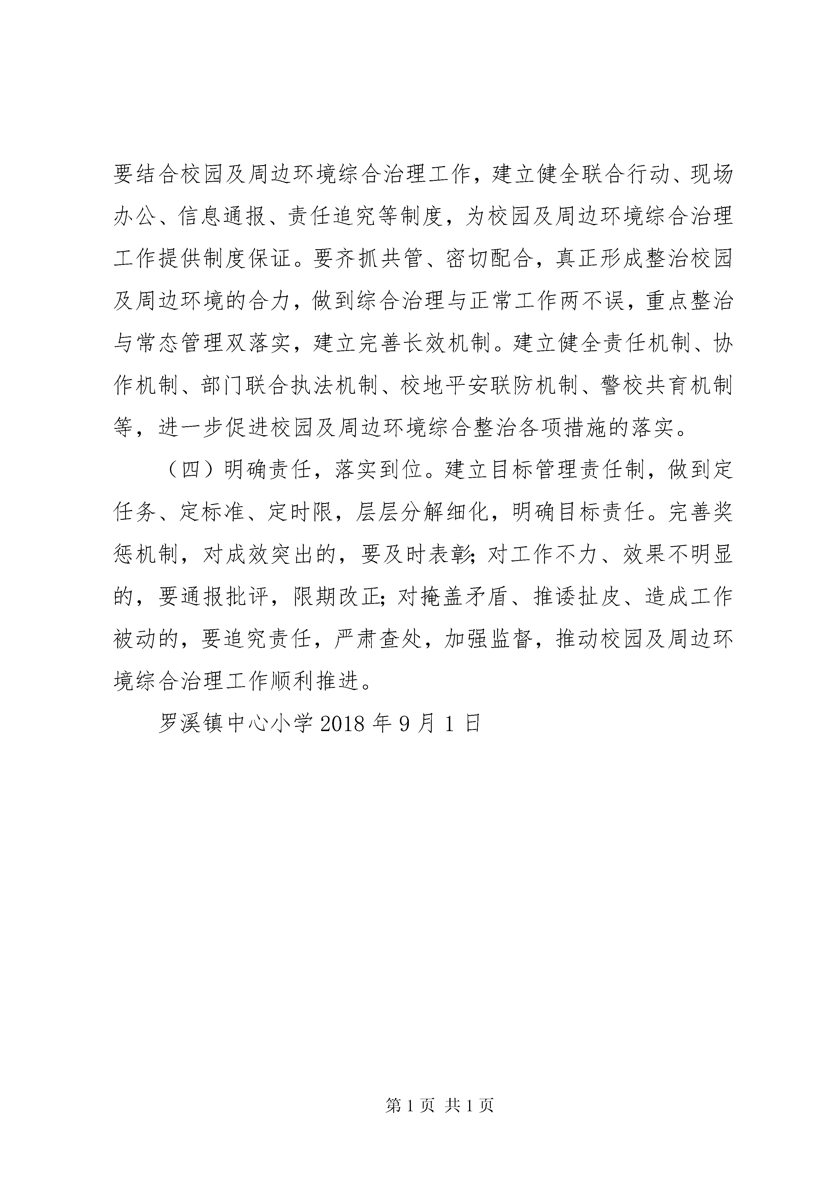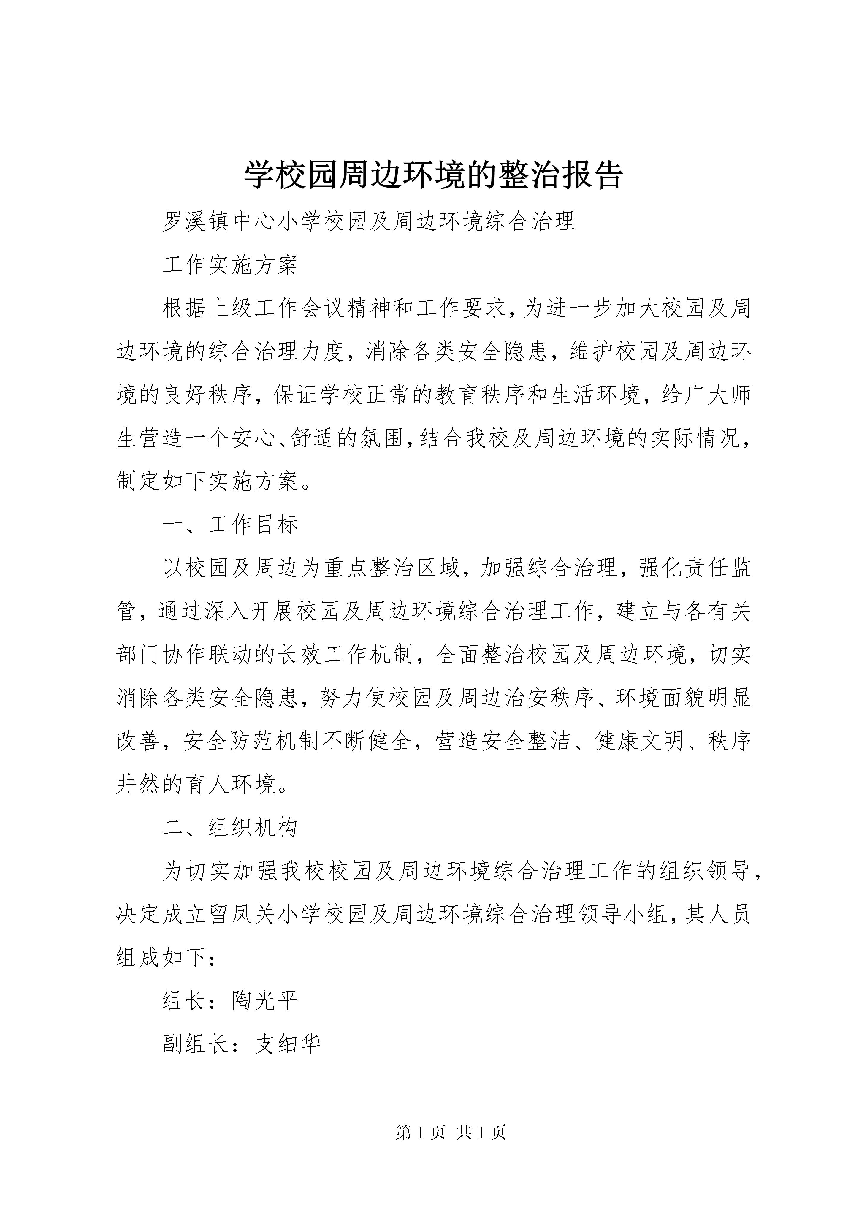 学校园周边环境的整治报告罗溪镇中心小学校园及周边环境综合治理工作实施方案根据上级工作会议精神和工作要求,为进一步加大校园及周边环境的综合治理力度,消除各类安全隐患,维护校园及周边环境的良好秩序,保证学校正常的教育秩序和生活环境,给广大师生营造一个安心、舒适的氛围,结合我校及周边环境的实际情况,制定如下实施方案。一、工作目标以校园及周边为重点整治区域,加强综合治理,强化责任监管,通过深入开展校园及周边环境综合治理工作,建立与各有关部门协作联动的长效工作机制,全面整治校园及周边环境,切实消除各类安全隐患,努力使校园及周边治安秩序、环境面貌明显改善,安全防范机制不断健全,营造安全整洁、健康文明、秩序井然的育人环境。二、组织机构为切实加强我校校园及周边环境综合治理工作的组织领导,决定成立留凤关小学校园及周边环境综合治理领导小组,其人员组成如下:组长:陶光平副组长:支细华成员。杨勇、各班班主任、保安和值周人员。三、工作重点(一)大力整治学校及周边的交通秩序,进一步加强学校及周边各类交通安全监管,对师生进行交通安全教育,预防并杜绝重大交通安全及师生伤亡事故发生。(二)严禁校门50米以内摆设摊点,协调上级相关部门及时清除校园周边占道经营摊点,加强经常性巡查管理,保持学校大门及周边交通畅通。(三)规范学校周边商业网点管理,坚决取缔各种涉及反动、淫秽、色情、暴力内容的违法经营活动,特别是要禁止彩票、不健康书刊和玩具等影响学生正常学习生活和健康成长的各类事物入侵校园。(四)坚决落实校园周边200米内不得开设营业性网吧的规定,配合主管部门重点查处、整治网吧超时营业和接纳未成年人等经营行为。(五)大力整治学校及周边的环境卫生、噪音污染。(六)大力维护校园及周边治安秩序,配合公安部门严厉打击抢劫、盗窃学生财物等侵害师生人身财产安全的违法犯罪行为,加强师生法制教育,严密防范和坚决打击校园暴力行为。(七)进一步加强管制刀具的管理,杜绝各类管制刀具进入校园,生活管理教师每周日晚对寄宿学生随身所带物品进行检查。(八)切实加强学校饮食卫生、防火安全等内部管理,消除各类安全隐患,坚决杜绝火灾、建筑物倒塌和食物中毒等恶性事故的发生。四、工作安排校园及周边环境综合治理工作分为四个阶段进行。1.全面部署,彻底排查阶段。制定整治行动实施方案,成立整治行动领导小组,开展宣传动员。与有关部门协调配合,对校园及周边环境状况进行调查摸底,查找存在的突出问题,研究制订出本单位整治措施,建立专项整治工作台帐。2.集中整治阶段。围绕学校综合楼校建安全工程,针对排查出来的校园及周边环境各种突出问题开展治理,多方配合、齐抓共管,努力解决问题,为教书育人提供良好的校园及周边环境。3.总结阶段。认真总结,及时向上级领导小组办公室报送整治工作情况。4.巩固成果阶段。校园及周边环境综合治理领导小组成员根据自身职责和制定的工作方案,巩固集中治理成果,深化整治工作,形成长效机制,年终上级部门的检查与考评。五、工作职责根据县、市级相关文件工作要求,积极配合各成员单位做好综合整治工作。抓好校园内部及周边环境的日常监控、管理,落实工作责任,加强学校内部巡视,完善门卫安保制度,严格管理外来人员、学生进出校园。加大对校园周边巡查力度,对校园周边200米内的网吧、影吧、游戏厅及各类流动食品摊点、占道经营等现象,一经发现,及时上报有关部门,并协助取缔。加强未成年人的思想道德建设及法制教育,提高遵纪守法观念。加强对校舍的安全检查,严防发生各类人身伤害事故。加强对学校食堂的饮食卫生监管,保障师生饮食安全。深入开展交通安全、食品安全、消防安全、人身安全等教育培训,提高师生的安全意识和自我保护能力。六、工作要求(一)提高认识,营造氛围。综合治理全县校园及周边环境是落实上级指示要求和解决校园周边环境突出问题的迫切需要,也是县委、县政府净化育人环境和提升城镇化建设水平的具体步骤。学校广泛进行思想发动,引导教职员工、在校学生充分认识此项工作的重大意义,积极参与、支持校园及周边环境治理工作。各班要开设专栏,利用黑板报,主题班会、安全知识培训等宣传造势,创造有利于综合治理的舆论环境。(二)突出重点,务求实效。结合实际,抓住影响校园及周边环境的突出问题,有针对性地落实专项整治措施,做到扎扎实实开展工作,实实在在解决问题,务求综合治理工作取得预期效果。(三)加强协调,完善机制。与上级各成员单位密切配合,要结合校园及周边环境综合治理工作,建立健全联合行动、现场办公、信息通报、责任追究等制度,为校园及周边环境综合治理工作提供制度保证。要齐抓共管、密切配合,真正形成整治校园及周边环境的合力,做到综合治理与正常工作两不误,重点整治与常态管理双落实,建立完善长效机制。建立健全责任机制、协作机制、部门联合执法机制、校地平安
