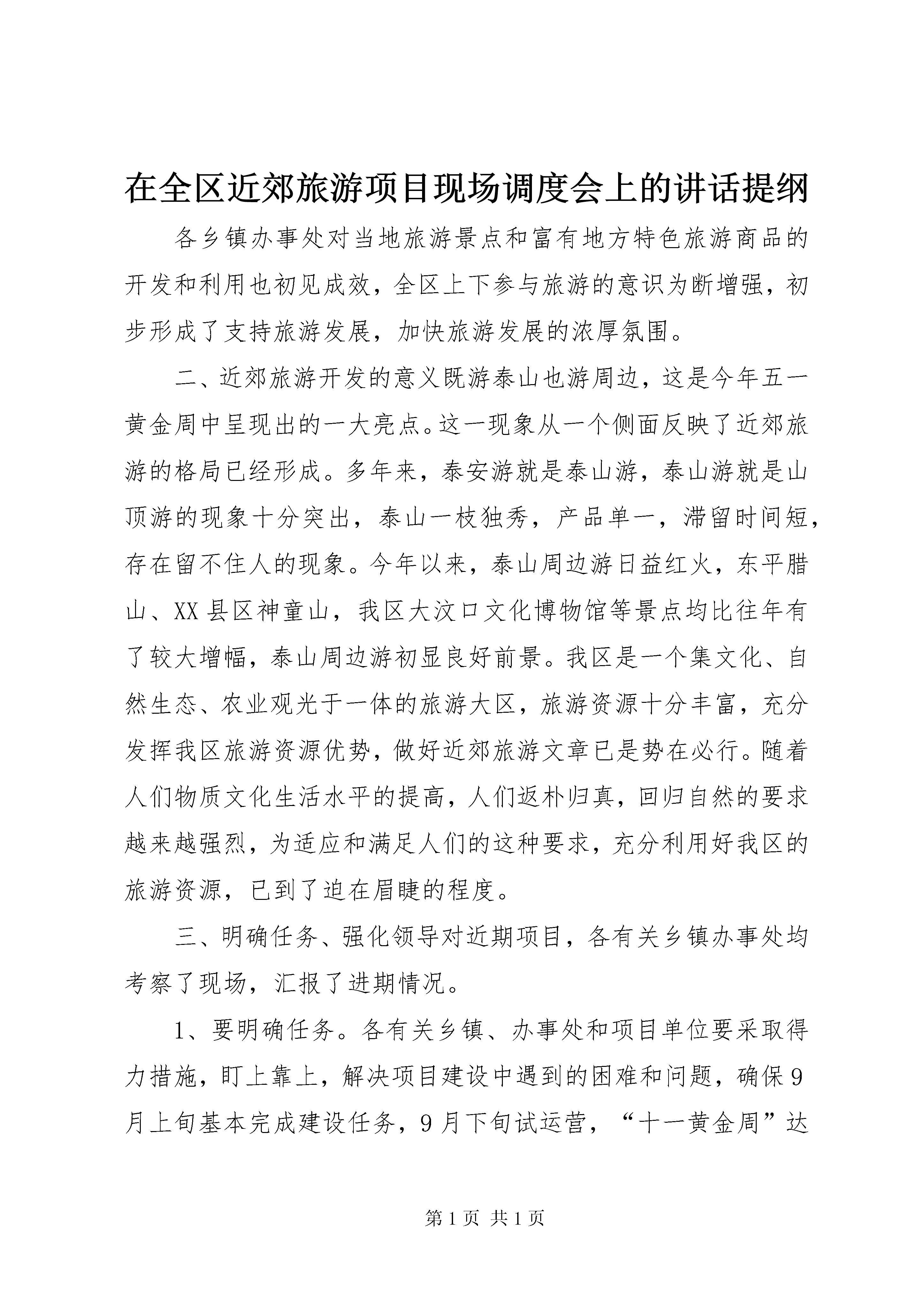 在全区近郊旅游项目现场调度会上的讲话提纲各乡镇办事处对当地旅游景点和富有地方特色旅游商品的开发和利用也初见成效,全区上下参与旅游的意识为断增强,初步形成了支持旅游发展,加快旅游发展的浓厚氛围。二、近郊旅游开发的意义既游泰山也游周边,这是今年五一黄金周中呈现出的一大亮点。这一现象从一个侧面反映了近郊旅游的格局已经形成。多年来,泰安游就是泰山游,泰山游就是山顶游的现象十分突出,泰山一枝独秀,产品单一,滞留时间短,存在留不住人的现象。今年以来,泰山周边游日益红火,东平腊山、XX县区神童山,我区大汶口文化博物馆等景点均比往年有了较大增幅,泰山周边游初显良好前景。我区是一个集文化、自然生态、农业观光于一体的旅游大区,旅游资源十分丰富,充分发挥我区旅游资源优势,做好近郊旅游文章已是势在必行。随着人们物质文化生活水平的提高,人们返朴归真,回归自然的要求越来越强烈,为适应和满足人们的这种要求,充分利用好我区的旅游资源,已到了迫在眉睫的程度。三、明确任务、强化领导对近期项目,各有关乡镇办事处均考察了现场,汇报了进期情况。1、要明确任务。各有关乡镇、办事处和项目单位要采取得力措施,盯上靠上,解决项目建设中遇到的困难和问题,确保9月上旬基本完成建设任务,9月下旬试运营,“十一黄金周”达到正常营业要求。2、要加快建设进度。区直有关部门要加强调度督导,搞好全方位服务,千方百计加快项目建设进度。各景点、景区要切实创新经营理念,完善旅游吸引物、旅游设施、旅游服务、可进入性(道路)以及吃、住、行、游、购、娱等旅游要素,扩大对外宣传,增强对外吸引力,力争在“十一黄金周”期间展示形象、凝聚人气,开创全区旅游业发展的新局面。3、要加大宣传促销力度,营造良好的旅游氛围,促进全区旅游业的快速发展。