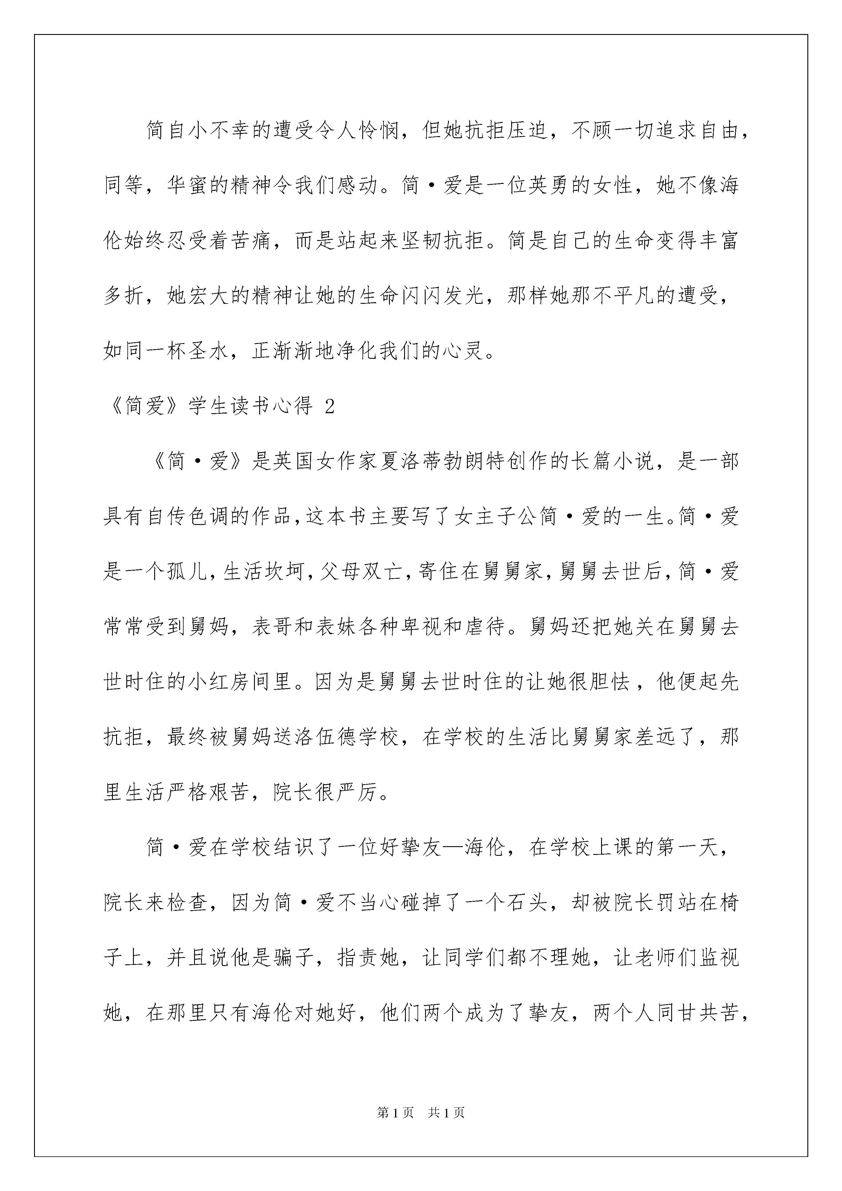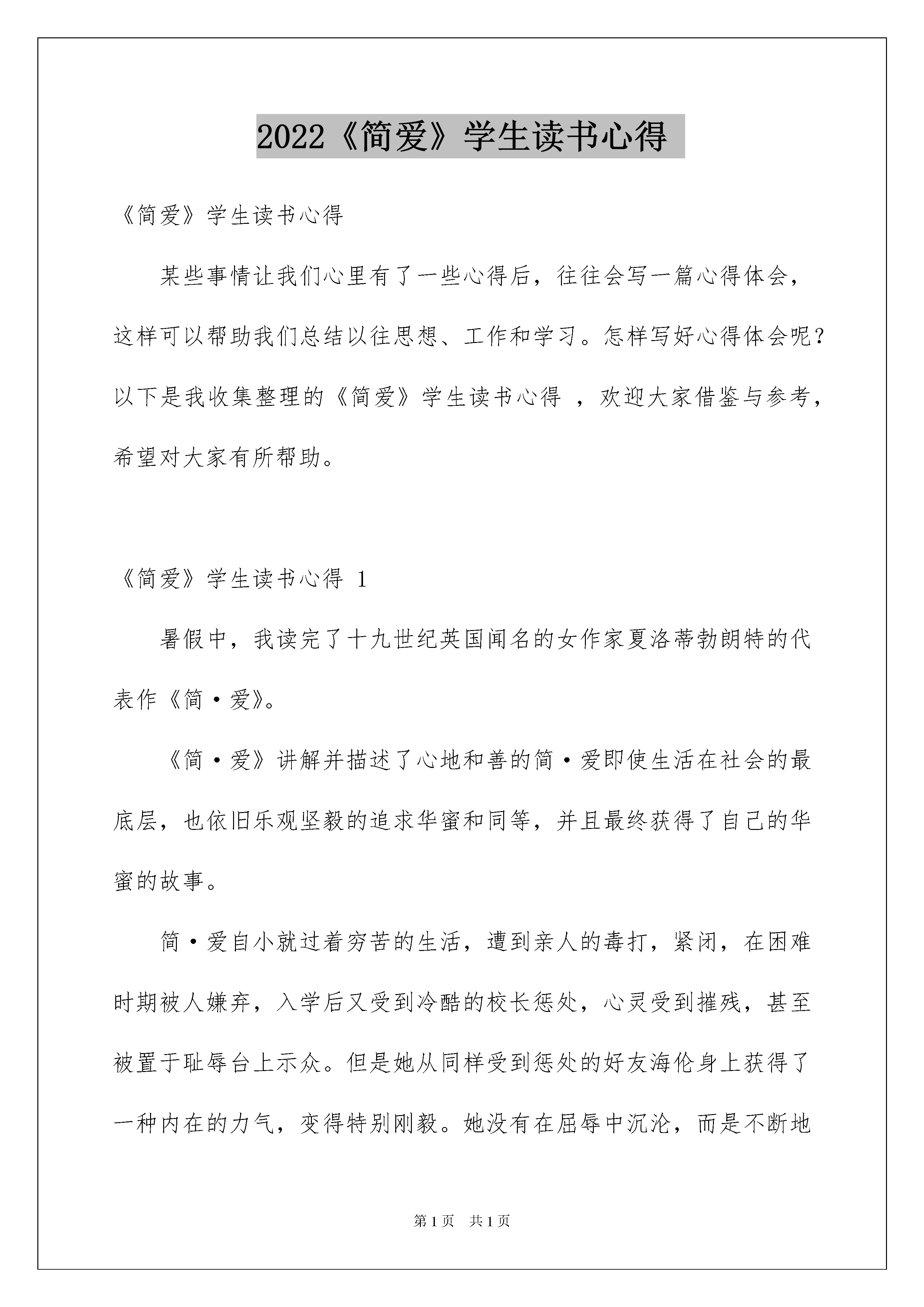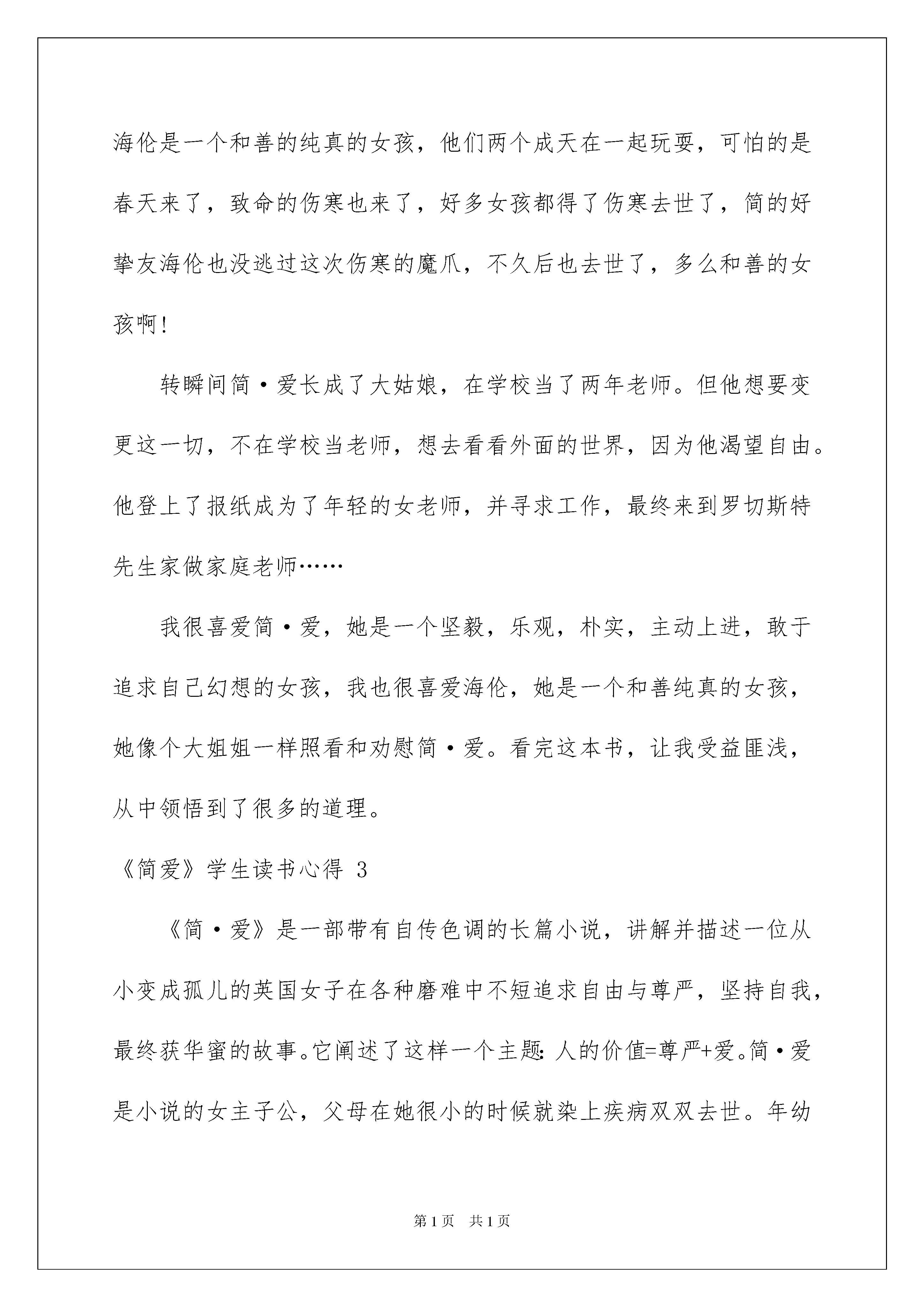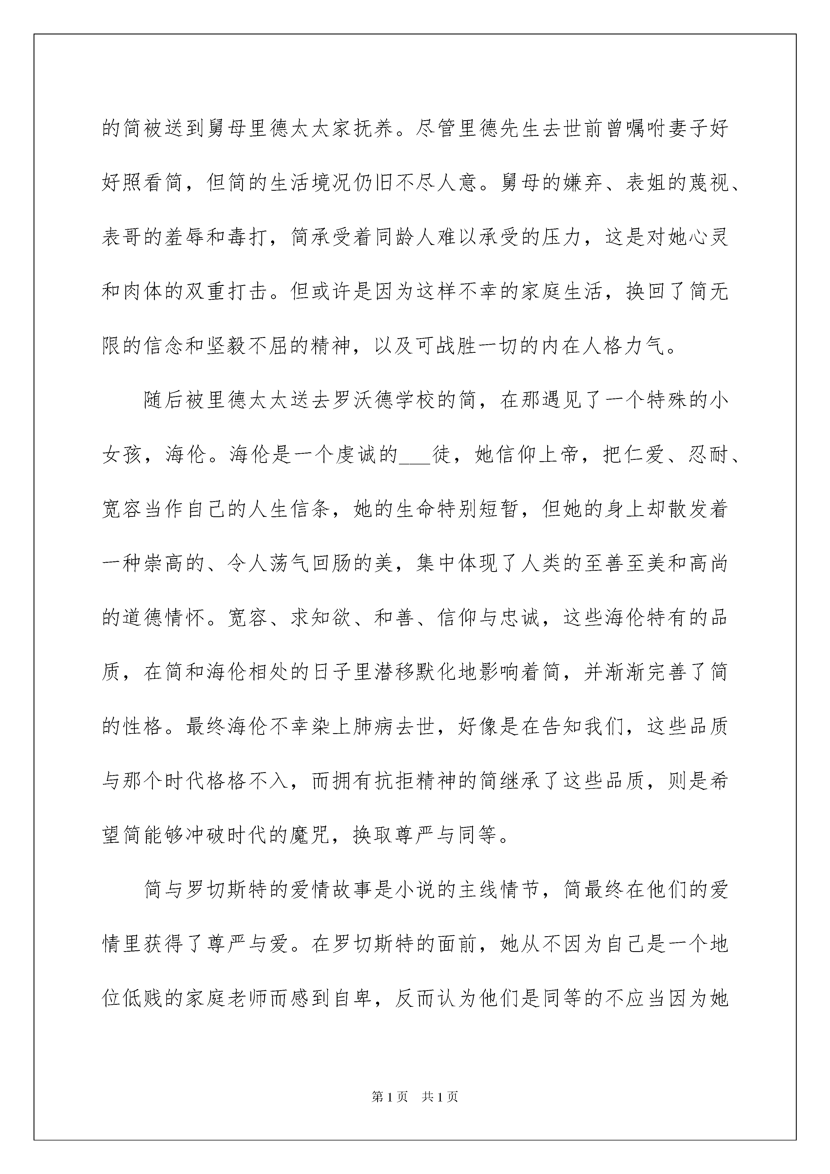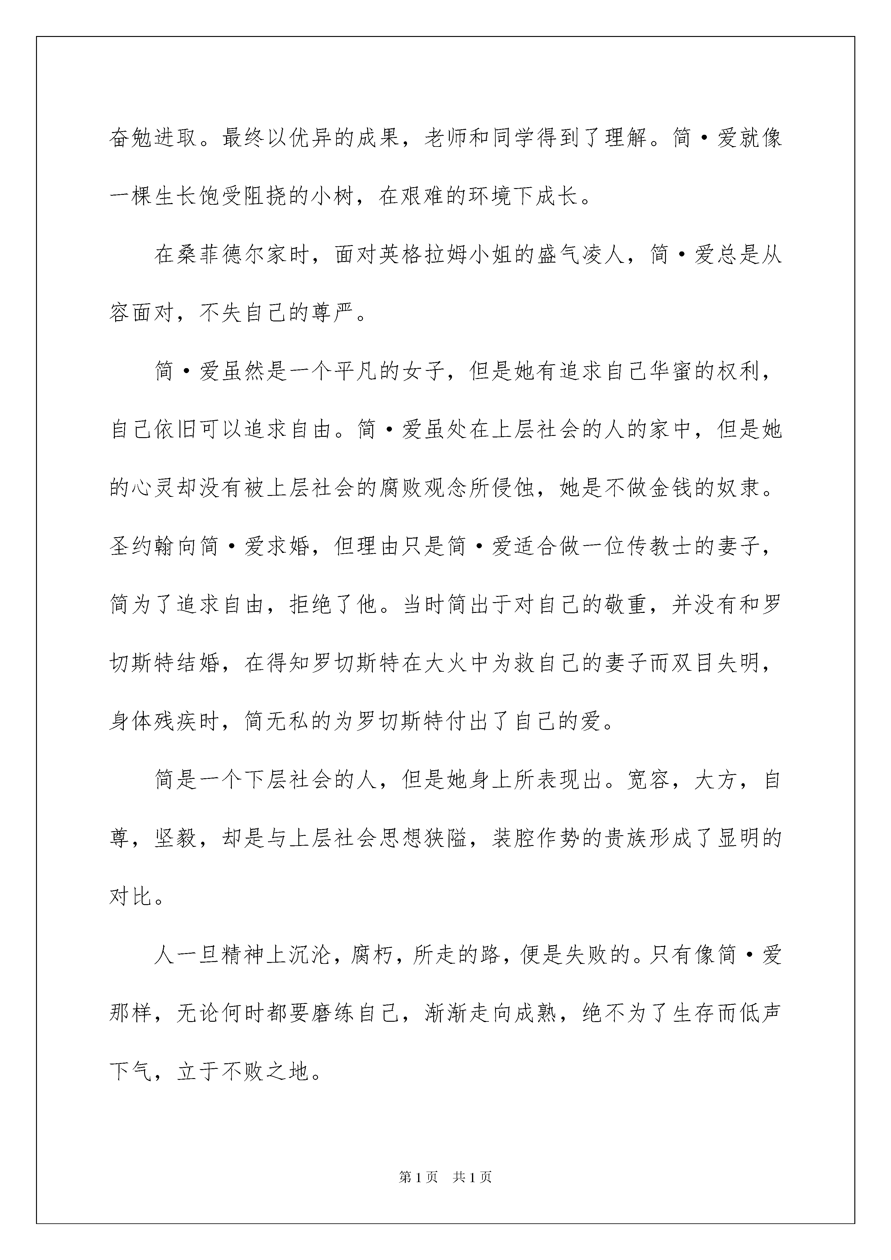 2022《简爱》学生读书心得《简爱》学生读书心得某些事情让我们心里有了一些心得后,往往会写一篇心得体会,这样可以帮助我们总结以往思想、工作和学习。怎样写好心得体会呢?以下是我收集整理的《简爱》学生读书心得,欢迎大家借鉴与参考,希望对大家有所帮助。《简爱》学生读书心得1暑假中,我读完了十九世纪英国闻名的女作家夏洛蒂勃朗特的代表作《简·爱》。《简·爱》讲解并描述了心地和善的简·爱即使生活在社会的最底层,也依旧乐观坚毅的追求华蜜和同等,并且最终获得了自己的华蜜的故事。简·爱自小就过着穷苦的生活,遭到亲人的毒打,紧闭,在困难时期被人嫌弃,入学后又受到冷酷的校长惩处,心灵受到摧残,甚至被置于耻辱台上示众。但是她从同样受到惩处的好友海伦身上获得了一种内在的力气,变得特别刚毅。她没有在屈辱中沉沦,而是不断地奋勉进取。最终以优异的成果,老师和同学得到了理解。简·爱就像一棵生长饱受阻挠的小树,在艰难的环境下成长。在桑菲德尔家时,面对英格拉姆小姐的盛气凌人,简·爱总是从容面对,不失自己的尊严。简·爱虽然是一个平凡的女子,但是她有追求自己华蜜的权利,自己依旧可以追求自由。简·爱虽处在上层社会的人的家中,但是她的心灵却没有被上层社会的腐败观念所侵蚀,她是不做金钱的奴隶。圣约翰向简·爱求婚,但理由只是简·爱适合做一位传教士的妻子,简为了追求自由,拒绝了他。当时简出于对自己的敬重,并没有和罗切斯特结婚,在得知罗切斯特在大火中为救自己的妻子而双目失明,身体残疾时,简无私的为罗切斯特付出了自己的爱。简是一个下层社会的人,但是她身上所表现出。宽容,大方,自尊,坚毅,却是与上层社会思想狭隘,装腔作势的贵族形成了显明的对比。人一旦精神上沉沦,腐朽,所走的路,便是失败的。只有像简·爱那样,无论何时都要磨练自己,渐渐走向成熟,绝不为了生存而低声下气,立于不败之地。简自小不幸的遭受令人怜悯,但她抗拒压迫,不顾一切追求自由,同等,华蜜的精神令我们感动。简·爱是一位英勇的女性,她不像海伦始终忍受着苦痛,而是站起来坚韧抗拒。简是自己的生命变得丰富多折,她宏大的精神让她的生命闪闪发光,那样她那不平凡的遭受,如同一杯圣水,正渐渐地净化我们的心灵。《简爱》学生读书心得2《简·爱》是英国女作家夏洛蒂勃朗特创作的长篇小说,是一部具有自传色调的作品,这本书主要写了女主子公简·爱的一生。简·爱是一个孤儿,生活坎坷,父母双亡,寄住在舅舅家,舅舅去世后,简·爱常常受到舅妈,表哥和表妹各种卑视和虐待。舅妈还把她关在舅舅去世时住的小红房间里。因为是舅舅去世时住的让她很胆怯,他便起先抗拒,最终被舅妈送洛伍德学校,在学校的生活比舅舅家差远了,那里生活严格艰苦,院长很严厉。简·爱在学校结识了一位好挚友—海伦,在学校上课的第一天,院长来检查,因为简·爱不当心碰掉了一个石头,却被院长罚站在椅子上,并且说他是骗子,指责她,让同学们都不理她,让老师们监视她,在那里只有海伦对她好,他们两个成为了挚友,两个人同甘共苦,海伦是一个和善的纯真的女孩,他们两个成天在一起玩耍,可怕的是春天来了,致命的伤寒也来了,好多女孩都得了伤寒去世了,简的好挚友海伦也没逃过这次伤寒的魔爪,不久后也去世了,多么和善的女孩啊!转瞬间简·爱长成了大姑娘,在学校当了两年老师。但他想要变更这一切,不在学校当老师,想去看看外面的世界,因为他渴望自由。他登上了报纸成为了年轻的女老师,并寻求工作,最终来到罗切斯特先生家做家庭老师……我很喜爱简·爱,她是一个坚毅,乐观,朴实,主动上进,敢于追求自己幻想的女孩,我也很喜爱海伦,她是一个和善纯真的女孩,她像个大姐姐一样照看和劝慰简·爱。看完这本书,让我受益匪浅,从中领悟到了很多的道理。《简爱》学生读书心得3《简·爱》是一部带有自传色调的长篇小说,讲解并描述一位从小变成孤儿的英国女子在各种磨难中不短追求自由与尊严,坚持自我,最终获华蜜的故事。它阐述了这样一个主题:人的价值=尊严+爱。简·爱是小说的女主子公,父母在她很小的时候就染上疾病双双去世。年幼的简被送到舅母里德太太家抚养。尽管里德先生去世前曾嘱咐妻子好好照看简,但简的生活境况仍旧不尽人意。舅母的嫌弃、表姐的蔑视、表哥的羞辱和毒打,简承受着同龄人难以承受的压力,这是对她心灵和肉体的双重打击。但或许是因为这样不幸的家庭生活,换回了简无限的信念和坚毅不屈的精神,以及可战胜一切的内在人格力气。随后被里德太太送去罗沃德学校的简,在那遇见了一个特殊的小女孩,海伦。海伦是一个虔诚的___徒,她信仰上帝,把仁爱、忍耐、宽容当作自己的人生信条,她的生命特别短暂,但她的身上却散发着一种崇高的、令人荡气回肠的美,集中体现了
