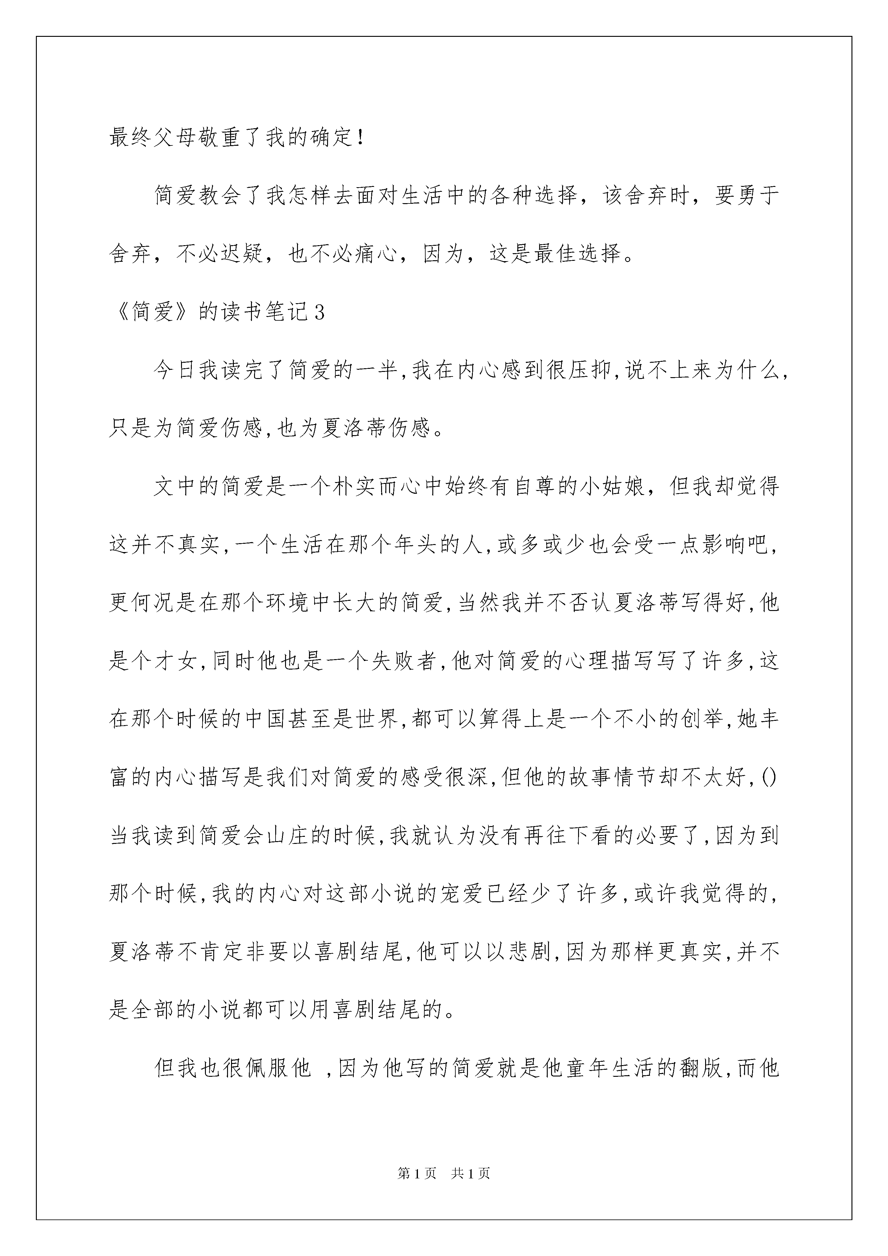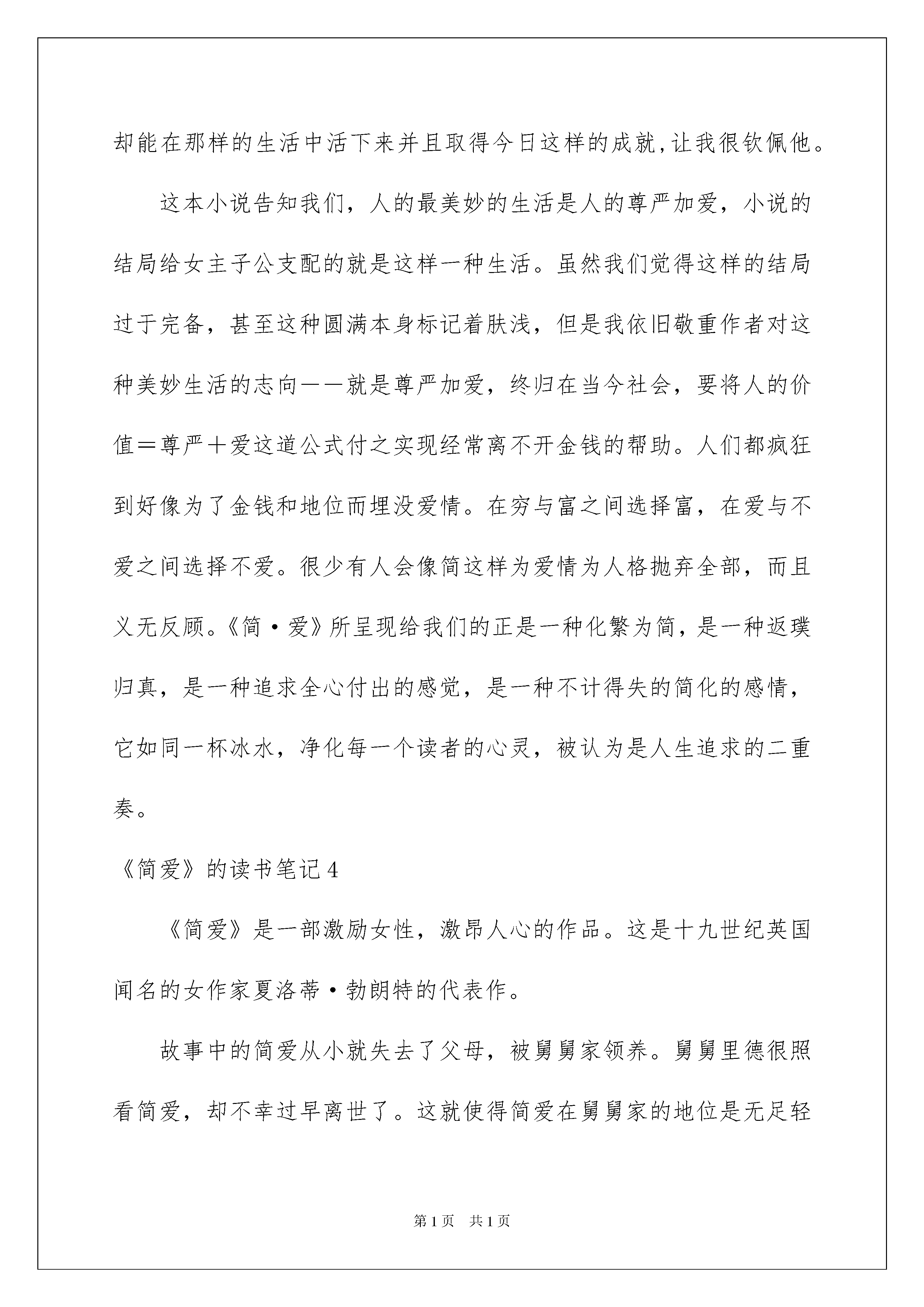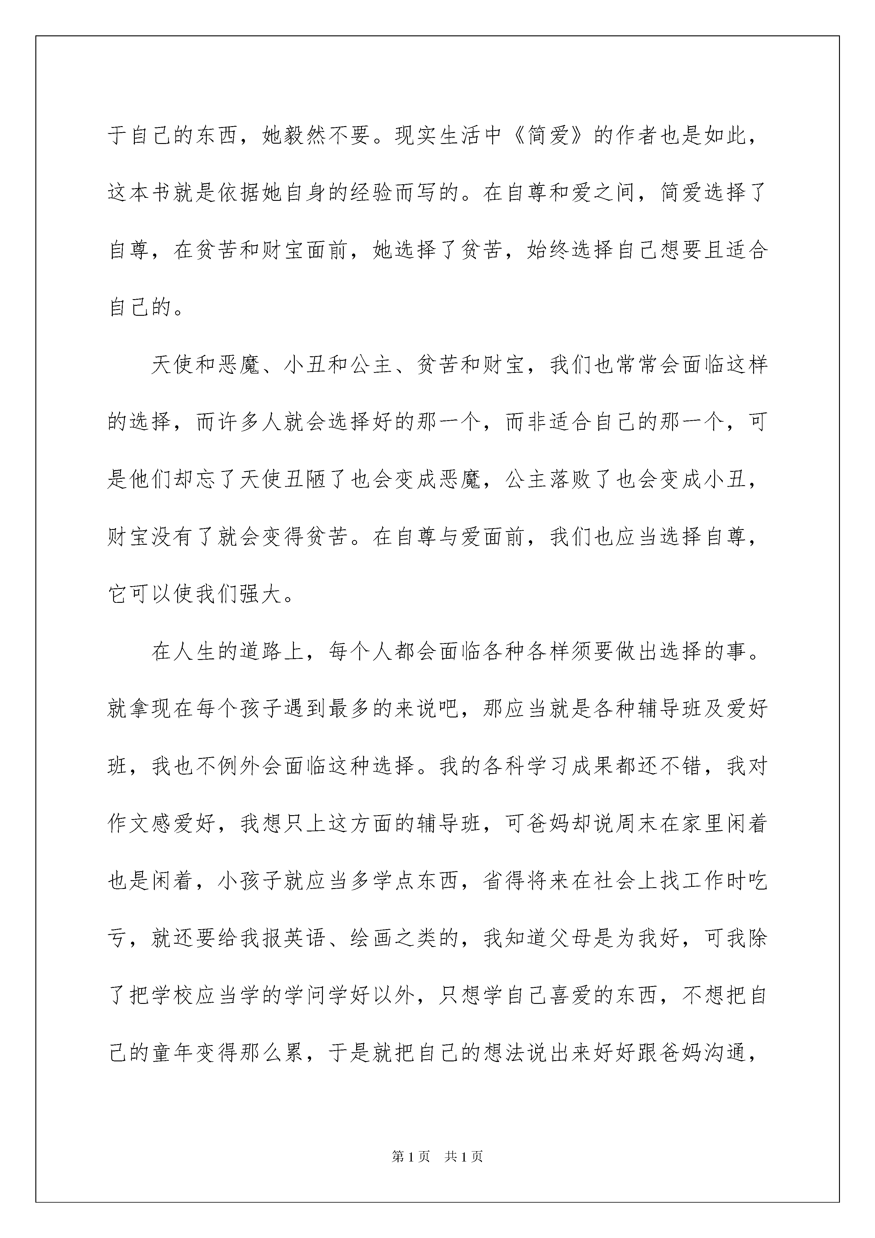 2022《简爱》的读书笔记《简爱》的读书笔记当品读完一部作品后,你有什么领悟呢?此时须要仔细思索读书笔记如何写了哦。那么如何写读书笔记才能更有感染力呢?以下是我细心整理的《简爱》的读书笔记,仅供参考,大家一起来看看吧。《简爱》的读书笔记1简·爱刚到孤儿院,她被许多人排斥,但是有一个女孩,叫:彭斯,他们相互关切,相互照看。简爱在孤儿院中受的是“魔鬼的训练”用冰洗脸,没有一次吃饭可以吃饱……但是,见爱是一个坚韧,不会被屈服的人,在小简·爱小小的心灵中,有着小小的倔犟,无论彭斯受什么样的惩处,简爱都会陪着她。这应当就是所说的知己吧。简·爱在孤儿院里表现得特别英勇,不卑不亢,在这样恶劣的环境下也没有埋没她那颗和善的心,她是那样的珍惜友情,爱惜伙伴,不顾自己的危急爱护她,劝慰她,她的友情在那种环境下,可以说是挚友的精神支柱。简·爱的命运是靠自己的努力变更的,她没有被困难压倒,努力的学习,努力的做人,假如她没有勤奋刻苦的学习学问,就不能做老师,就更不行能走出那个地狱般的孤儿院,也就没有她今后的美妙生活。《简爱》的读书笔记2在一个暖和的下午,窗户外的阳光透过窗子射进来,洒在白色的地板上,我坐在床上,兴致勃勃地读着英国批判现实主义文学作家夏洛蒂勃朗特的代表作。《简爱》。第一次见《简爱》,就被它的书名所吸引,拿出书本,看到上面写着“这是一本擅长爱与自尊的书”的文字时,怦然心动,就坚决果断地买下了这本书。《简爱》主要讲了简爱寄养在舅妈家,舅妈常常打骂她,她在那里受够了肉体上的熬煎和精神上的屈辱,毅然确定离开。她经验过很多困难,但最终像挣扎在废墟里的公主重新戴上皇冠一样,找到了自己的希望——罗切斯特。她是那么爱他,当得知罗切斯特已经有妻子时,她同样毅然地离开。后来罗切斯特因为房子着火而残废了,妻亡子散,当简爱得知消息后,回来细心地照看着他……我非常观赏简爱那独特的性格,在无法忍受舅妈的打骂时,她确定离开,在得知罗切斯特有妻子后,他选择离开,不适合自己,不属于自己的东西,她毅然不要。现实生活中《简爱》的作者也是如此,这本书就是依据她自身的经验而写的。在自尊和爱之间,简爱选择了自尊,在贫苦和财宝面前,她选择了贫苦,始终选择自己想要且适合自己的。天使和恶魔、小丑和公主、贫苦和财宝,我们也常常会面临这样的选择,而许多人就会选择好的那一个,而非适合自己的那一个,可是他们却忘了天使丑陋了也会变成恶魔,公主落败了也会变成小丑,财宝没有了就会变得贫苦。在自尊与爱面前,我们也应当选择自尊,它可以使我们强大。在人生的道路上,每个人都会面临各种各样须要做出选择的事。就拿现在每个孩子遇到最多的来说吧,那应当就是各种辅导班及爱好班,我也不例外会面临这种选择。我的各科学习成果都还不错,我对作文感爱好,我想只上这方面的辅导班,可爸妈却说周末在家里闲着也是闲着,小孩子就应当多学点东西,省得将来在社会上找工作时吃亏,就还要给我报英语、绘画之类的,我知道父母是为我好,可我除了把学校应当学的学问学好以外,只想学自己喜爱的东西,不想把自己的童年变得那么累,于是就把自己的想法说出来好好跟爸妈沟通,最终父母敬重了我的确定!简爱教会了我怎样去面对生活中的各种选择,该舍弃时,要勇于舍弃,不必迟疑,也不必痛心,因为,这是最佳选择。《简爱》的读书笔记3今日我读完了简爱的一半,我在内心感到很压抑,说不上来为什么,只是为简爱伤感,也为夏洛蒂伤感。文中的简爱是一个朴实而心中始终有自尊的小姑娘,但我却觉得这并不真实,一个生活在那个年头的人,或多或少也会受一点影响吧,更何况是在那个环境中长大的简爱,当然我并不否认夏洛蒂写得好,他是个才女,同时他也是一个失败者,他对简爱的心理描写写了许多,这在那个时候的中国甚至是世界,都可以算得上是一个不小的创举,她丰富的内心描写是我们对简爱的感受很深,但他的故事情节却不太好,()当我读到简爱会山庄的时候,我就认为没有再往下看的必要了,因为到那个时候,我的内心对这部小说的宠爱已经少了许多,或许我觉得的,夏洛蒂不肯定非要以喜剧结尾,他可以以悲剧,因为那样更真实,并不是全部的小说都可以用喜剧结尾的。但我也很佩服他,因为他写的简爱就是他童年生活的翻版,而他却能在那样的生活中活下来并且取得今日这样的成就,让我很钦佩他。这本小说告知我们,人的最美妙的生活是人的尊严加爱,小说的结局给女主子公支配的就是这样一种生活。虽然我们觉得这样的结局过于完备,甚至这种圆满本身标记着肤浅,但是我依旧敬重作者对这种美妙生活的志向--就是尊严加爱,终归在当今社会,要将人的价值=尊严+爱这道公式付之实现经常离不开金钱的帮助。人们都疯狂到好像为了金钱和地位而