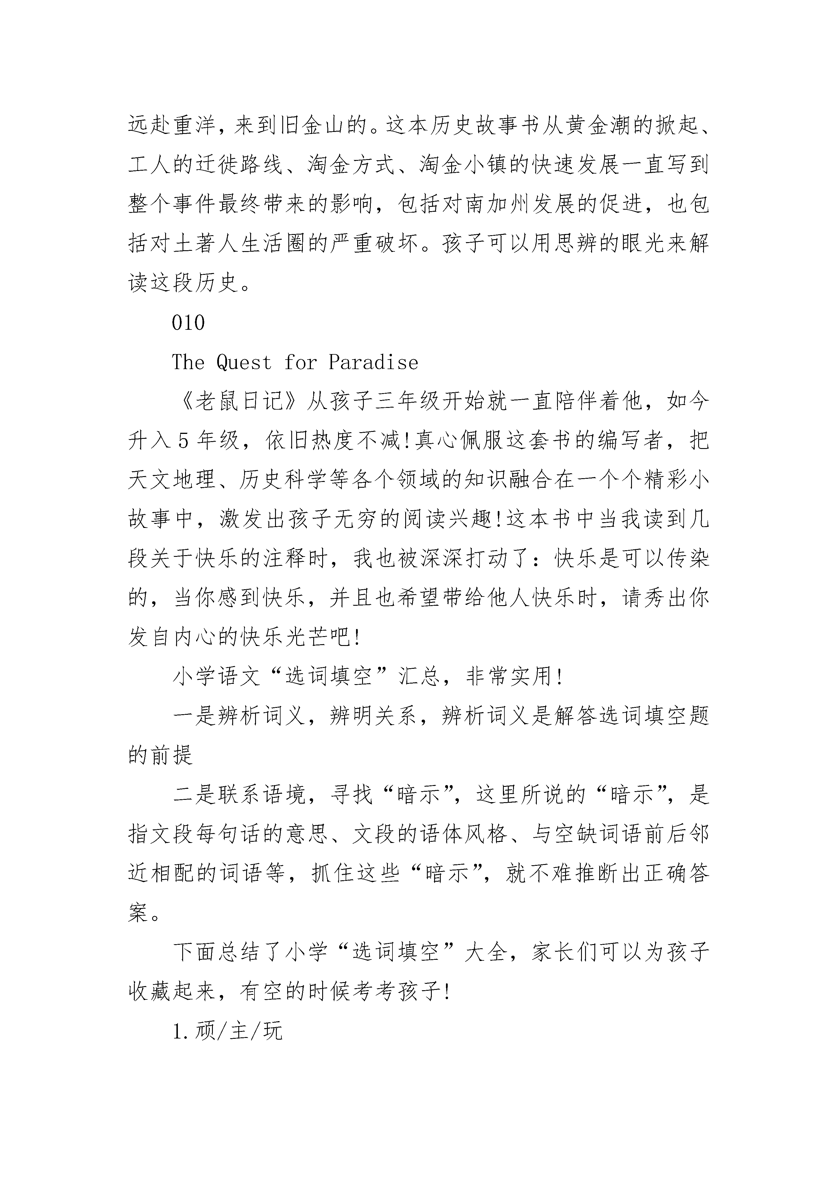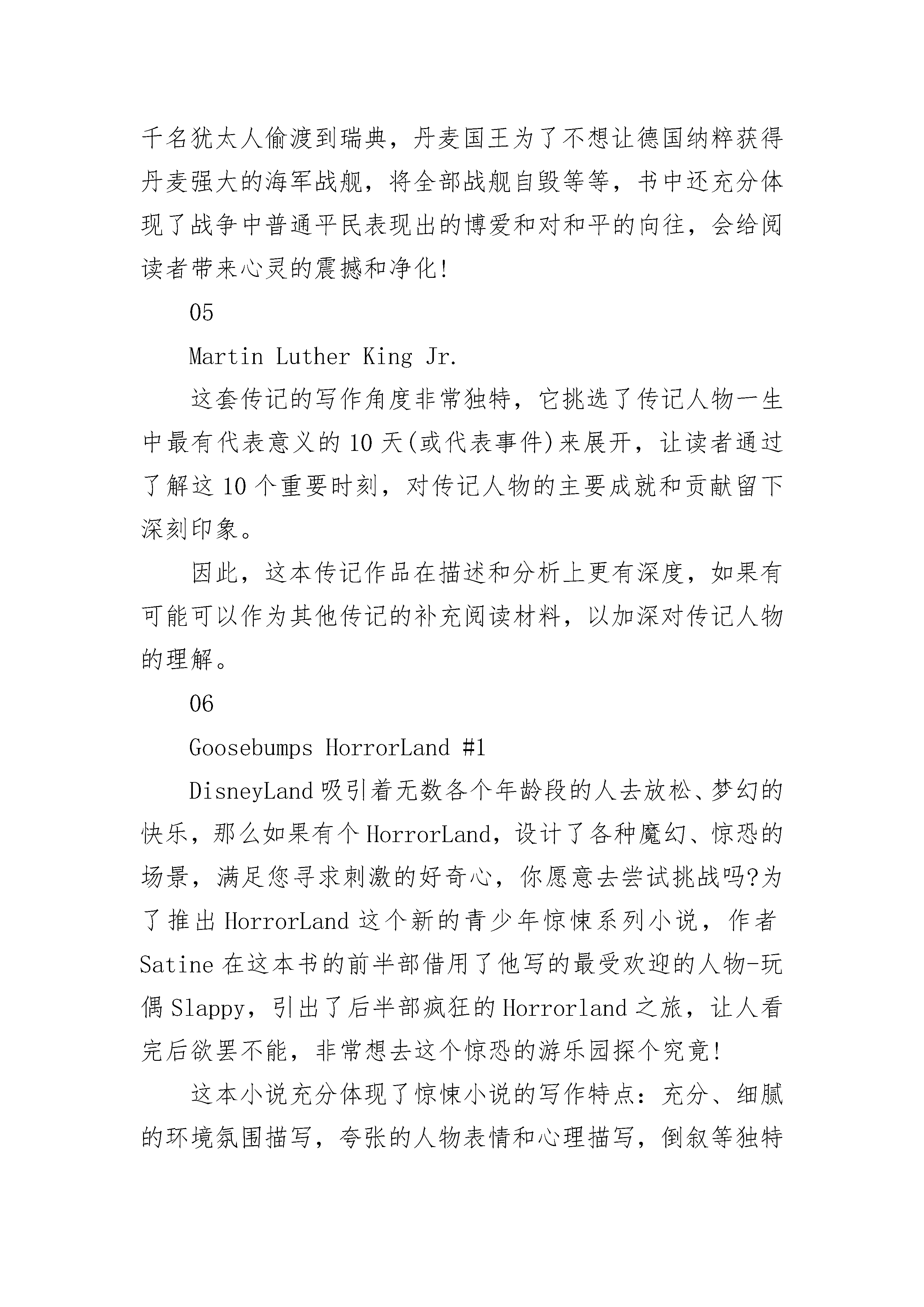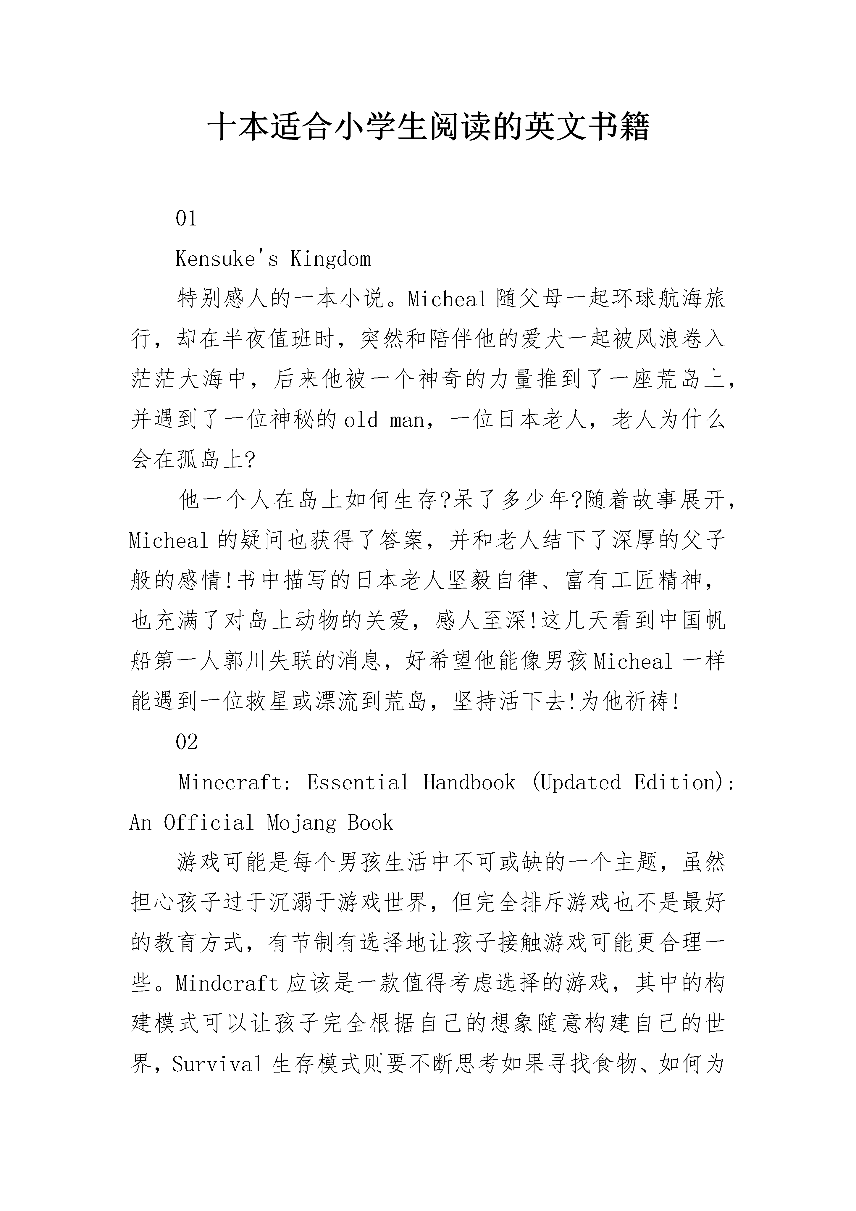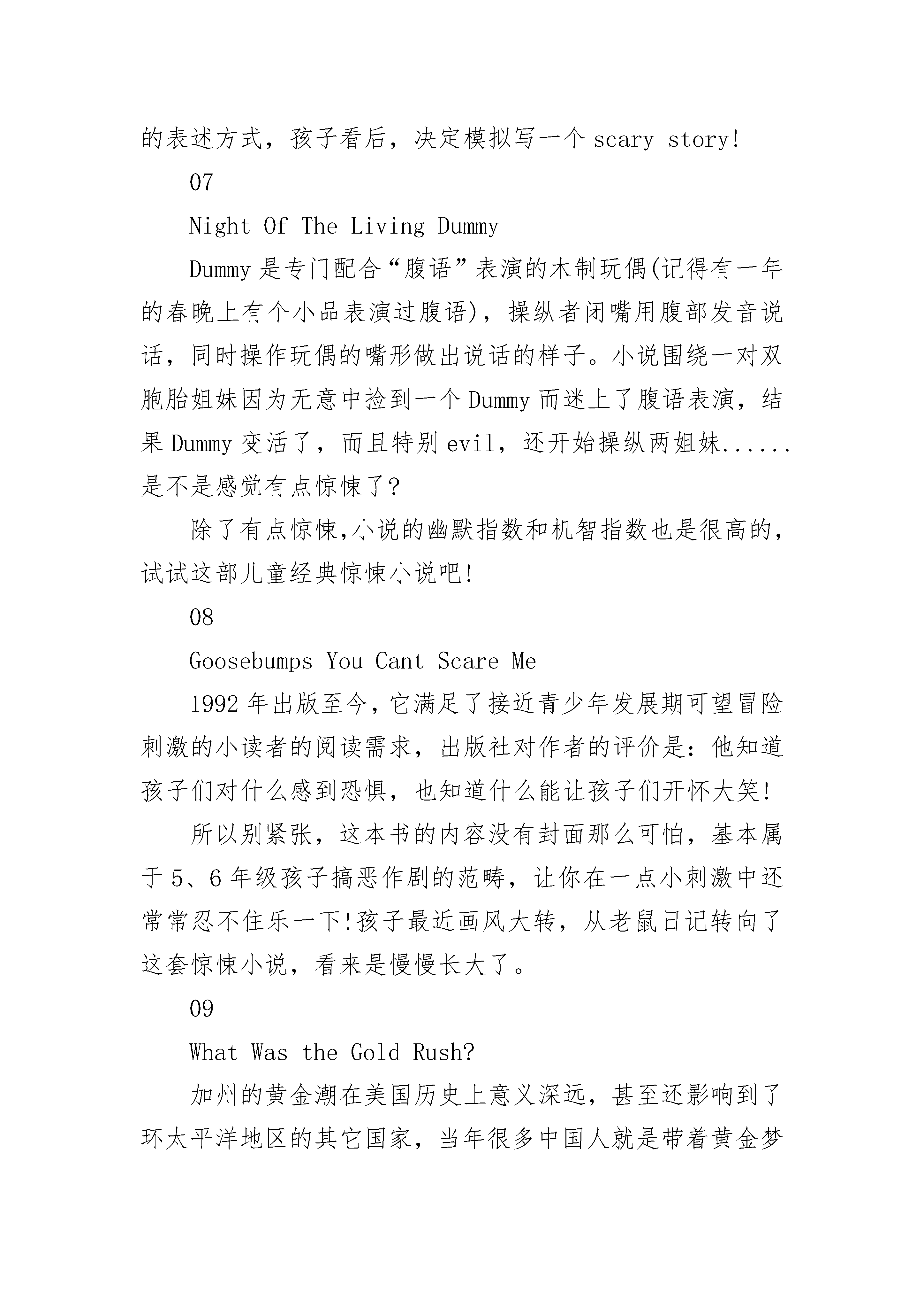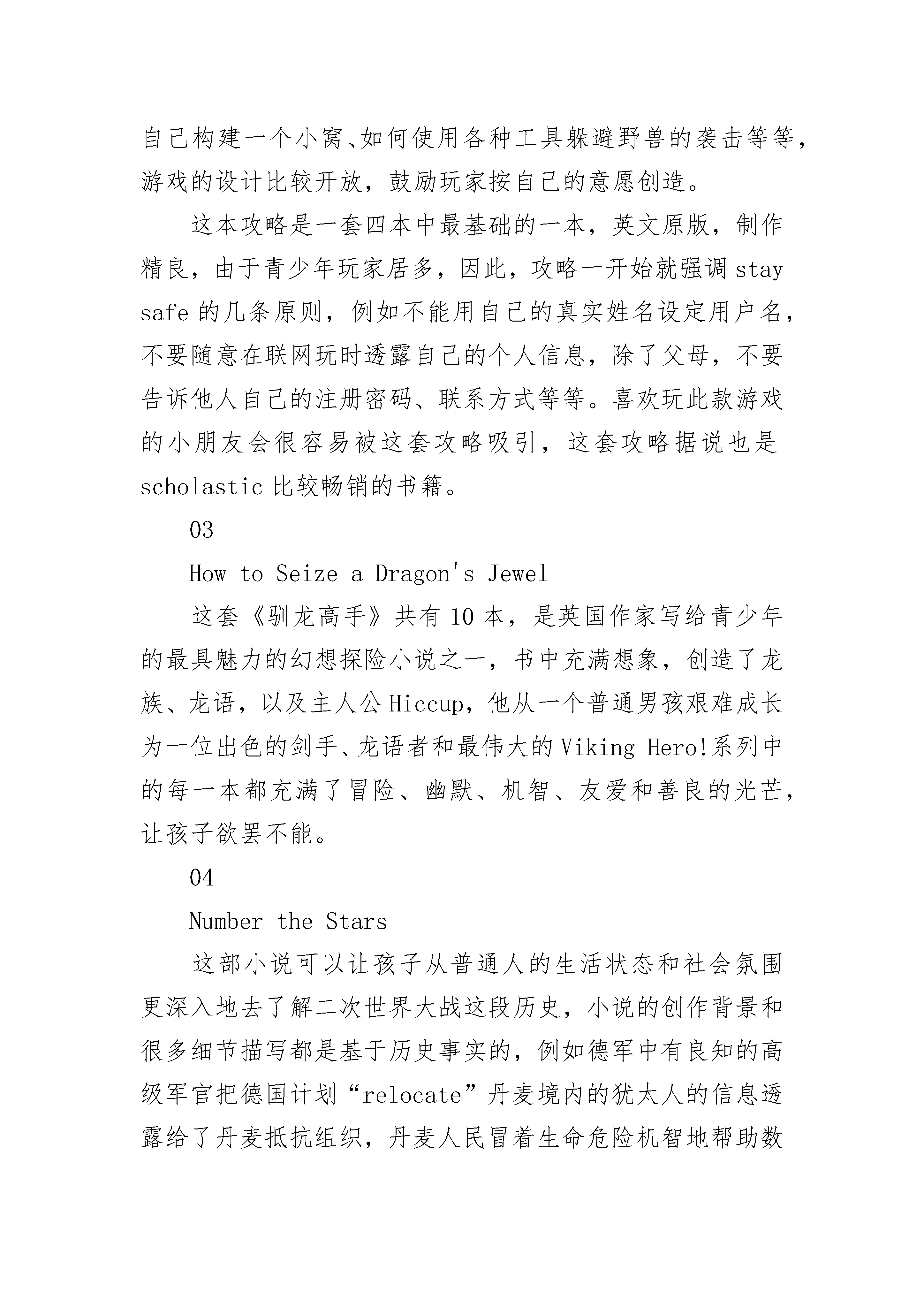 十本适合小学生阅读的英文书籍01Kensuke'sKingdom特别感人的一本小说。Micheal随父母一起环球航海旅行,却在半夜值班时,突然和陪伴他的爱犬一起被风浪卷入茫茫大海中,后来他被一个神奇的力量推到了一座荒岛上,并遇到了一位神秘的oldman,一位日本老人,老人为什么会在孤岛上?他一个人在岛上如何生存?呆了多少年?随着故事展开,Micheal的疑问也获得了答案,并和老人结下了深厚的父子般的感情!书中描写的日本老人坚毅自律、富有工匠精神,也充满了对岛上动物的关爱,感人至深!这几天看到中国帆船第一人郭川失联的消息,好希望他能像男孩Micheal一样能遇到一位救星或漂流到荒岛,坚持活下去!为他祈祷!02Minecraft:EssentialHandbook(UpdatedEdition):AnOfficialMojangBook游戏可能是每个男孩生活中不可或缺的一个主题,虽然担心孩子过于沉溺于游戏世界,但完全排斥游戏也不是最好的教育方式,有节制有选择地让孩子接触游戏可能更合理一些。Mindcraft应该是一款值得考虑选择的游戏,其中的构建模式可以让孩子完全根据自己的想象随意构建自己的世界,Survival生存模式则要不断思考如果寻找食物、如何为自己构建一个小窝、如何使用各种工具躲避野兽的袭击等等,游戏的设计比较开放,鼓励玩家按自己的意愿创造。这本攻略是一套四本中最基础的一本,英文原版,制作精良,由于青少年玩家居多,因此,攻略一开始就强调staysafe的几条原则,例如不能用自己的真实姓名设定用户名,不要随意在联网玩时透露自己的个人信息,除了父母,不要告诉他人自己的注册密码、联系方式等等。喜欢玩此款游戏的小朋友会很容易被这套攻略吸引,这套攻略据说也是scholastic比较畅销的书籍。03HowtoSeizeaDragon'sJewel这套《驯龙高手》共有10本,是英国作家写给青少年的最具魅力的幻想探险小说之一,书中充满想象,创造了龙族、龙语,以及主人公Hiccup,他从一个普通男孩艰难成长为一位出色的剑手、龙语者和最伟大的VikingHero!系列中的每一本都充满了冒险、幽默、机智、友爱和善良的光芒,让孩子欲罢不能。04NumbertheStars这部小说可以让孩子从普通人的生活状态和社会氛围更深入地去了解二次世界大战这段历史,小说的创作背景和很多细节描写都是基于历史事实的,例如德军中有良知的高级军官把德国计划“relocate”丹麦境内的犹太人的信息透露给了丹麦抵抗组织,丹麦人民冒着生命危险机智地帮助数千名犹太人偷渡到瑞典,丹麦国王为了不想让德国纳粹获得丹麦强大的海军战舰,将全部战舰自毁等等,书中还充分体现了战争中普通平民表现出的博爱和对和平的向往,会给阅读者带来心灵的震撼和净化!05MartinLutherKingJr.这套传记的写作角度非常独特,它挑选了传记人物一生中最有代表意义的10天(或代表事件)来展开,让读者通过了解这10个重要时刻,对传记人物的主要成就和贡献留下深刻印象。因此,这本传记作品在描述和分析上更有深度,如果有可能可以作为其他传记的补充阅读材料,以加深对传记人物的理解。06GoosebumpsHorrorLand#1DisneyLand吸引着无数各个年龄段的人去放松、梦幻的快乐,那么如果有个HorrorLand,设计了各种魔幻、惊恐的场景,满足您寻求刺激的好奇心,你愿意去尝试挑战吗?为了推出HorrorLand这个新的青少年惊悚系列小说,作者Satine在这本书的前半部借用了他写的最受欢迎的人物-玩偶Slappy,引出了后半部疯狂的Horrorland之旅,让人看完后欲罢不能,非常想去这个惊恐的游乐园探个究竟!这本小说充分体现了惊悚小说的写作特点:充分、细腻的环境氛围描写,夸张的人物表情和心理描写,倒叙等独特的表述方式,孩子看后,决定模拟写一个scarystory!07NightOfTheLivingDummyDummy是专门配合“腹语”表演的木制玩偶(记得有一年的春晚上有个小品表演过腹语),操纵者闭嘴用腹部发音说话,同时操作玩偶的嘴形做出说话的样子。小说围绕一对双胞胎姐妹因为无意中捡到一个Dummy而迷上了腹语表演,结果Dummy变活了,而且特别evil,还开始操纵两姐妹......是不是感觉有点惊悚了?除了有点惊悚,小说的幽默指数和机智指数也是很高的,试试这部儿童经典惊悚小说吧!08GoosebumpsYouCantScareMe1992年出版至今,它满足了接近青少年发展期可望冒险刺激的小读者的阅读需求,出版社对作者的评价是:他知道孩子们对什么感到恐惧,也知道什么能让孩子们开怀大笑!所以别紧张,这本书的内容没有封面那么可怕,基本属于5、6年级孩子搞恶作剧的范畴,让你在一点小刺激中还常常忍不住乐