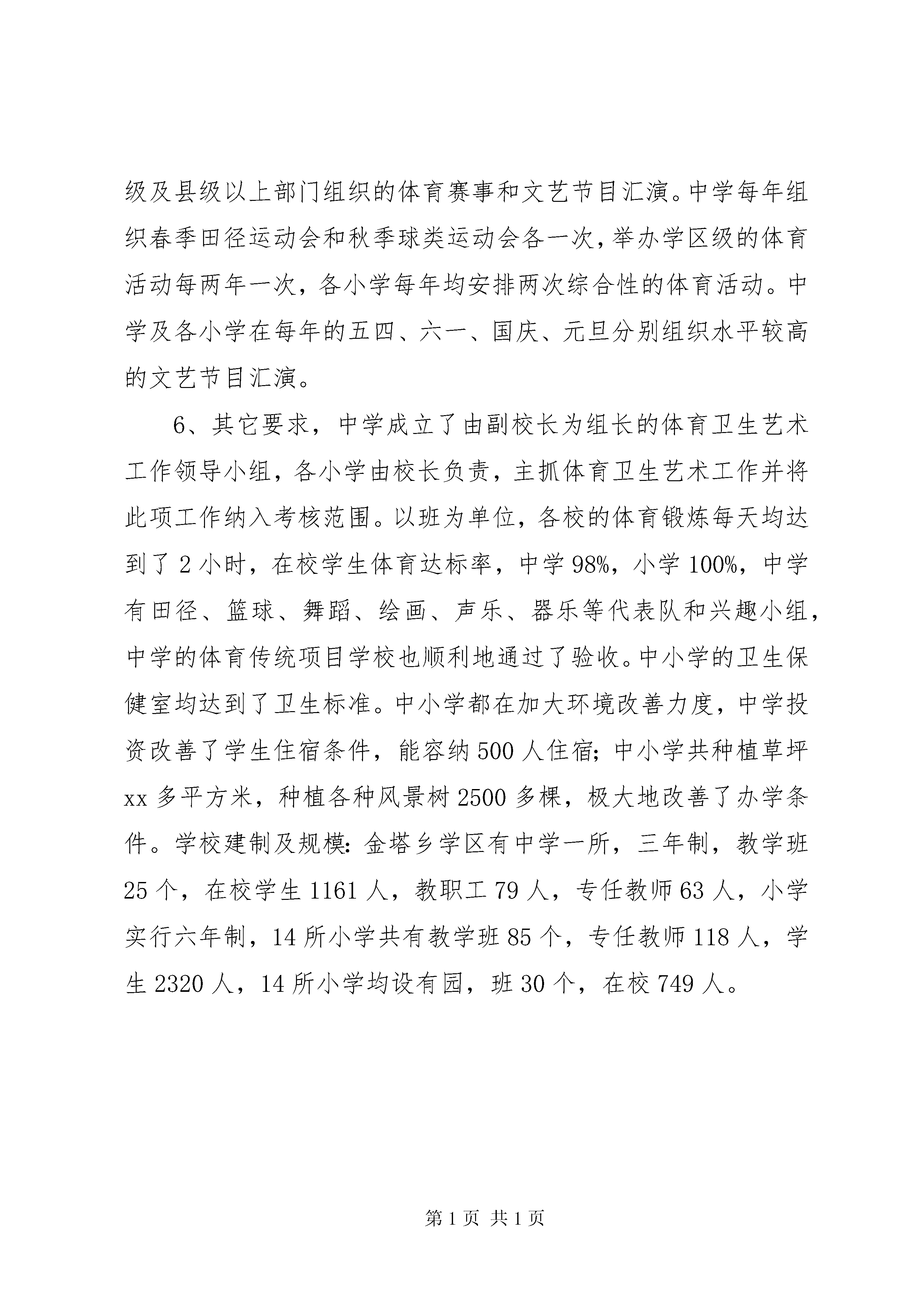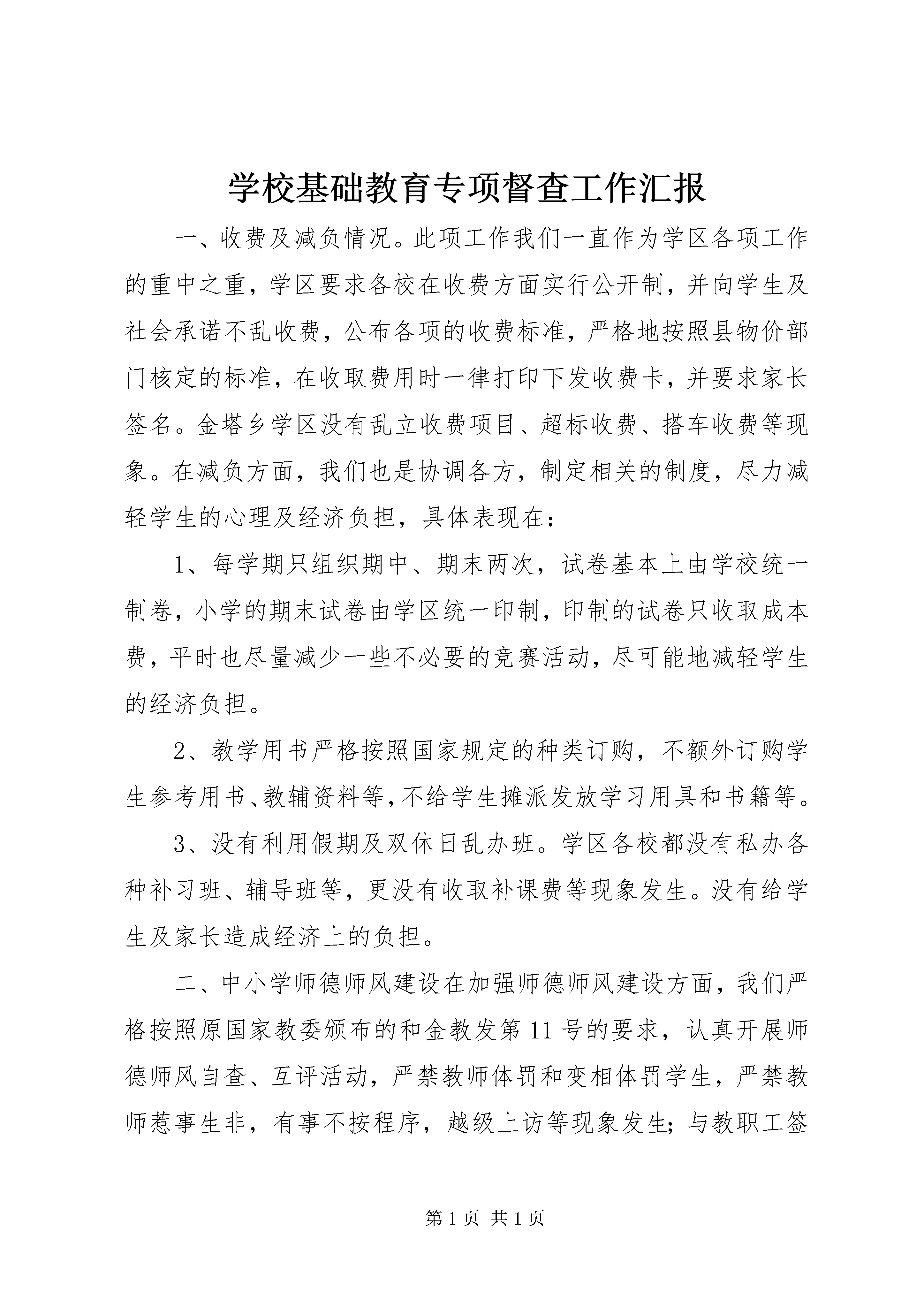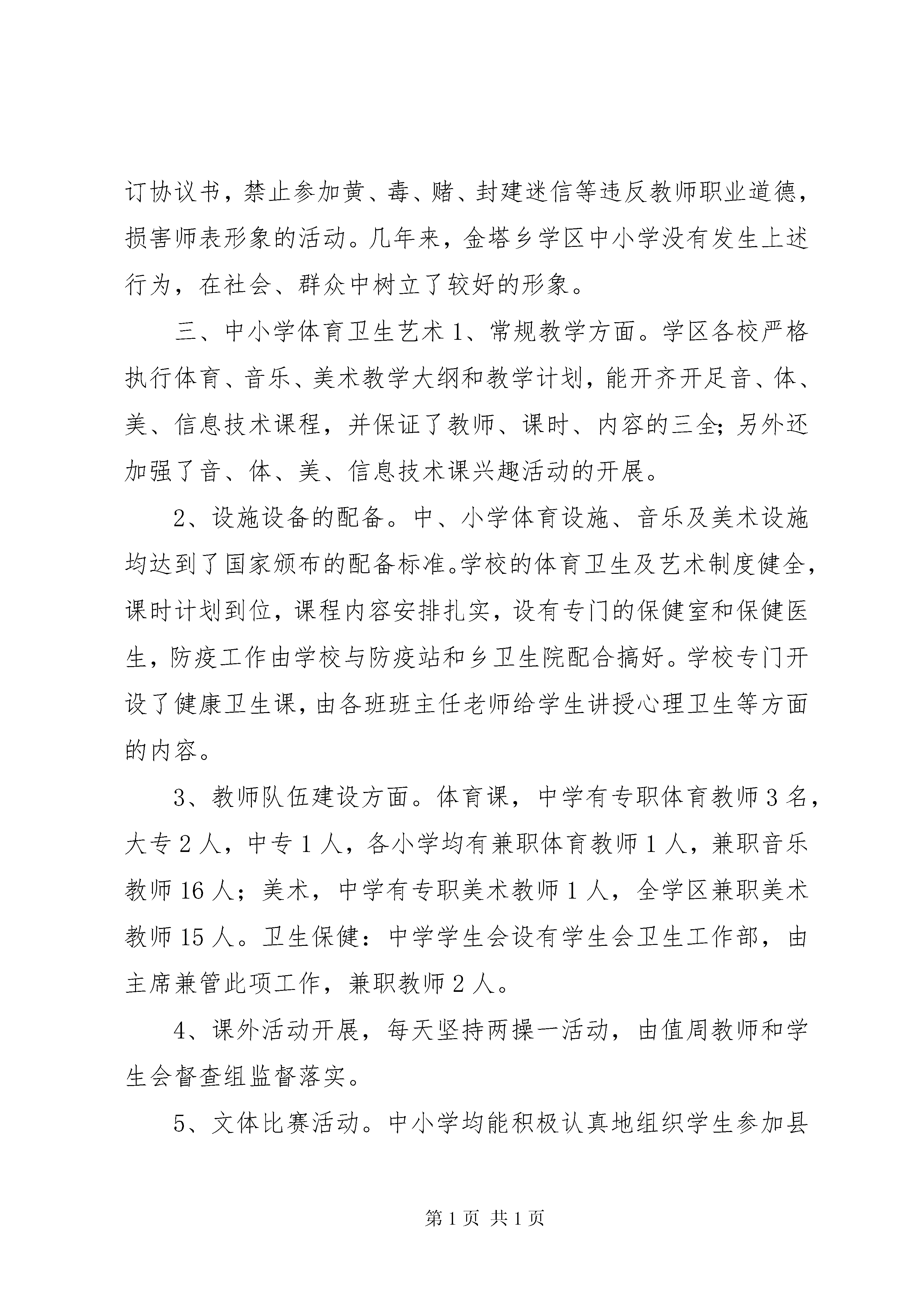 学校基础教育专项督查工作汇报一、收费及减负情况。此项工作我们一直作为学区各项工作的重中之重,学区要求各校在收费方面实行公开制,并向学生及社会承诺不乱收费,公布各项的收费标准,严格地按照县物价部门核定的标准,在收取费用时一律打印下发收费卡,并要求家长签名。金塔乡学区没有乱立收费项目、超标收费、搭车收费等现象。在减负方面,我们也是协调各方,制定相关的制度,尽力减轻学生的心理及经济负担,具体表现在:1、每学期只组织期中、期末两次,试卷基本上由学校统一制卷,小学的期末试卷由学区统一印制,印制的试卷只收取成本费,平时也尽量减少一些不必要的竞赛活动,尽可能地减轻学生的经济负担。2、教学用书严格按照国家规定的种类订购,不额外订购学生参考用书、教辅资料等,不给学生摊派发放学习用具和书籍等。3、没有利用假期及双休日乱办班。学区各校都没有私办各种补习班、辅导班等,更没有收取补课费等现象发生。没有给学生及家长造成经济上的负担。二、中小学师德师风建设在加强师德师风建设方面,我们严格按照原国家教委颁布的和金教发第11号的要求,认真开展师德师风自查、互评活动,严禁教师体罚和变相体罚学生,严禁教师惹事生非,有事不按程序,越级上访等现象发生;与教职工签订协议书,禁止参加黄、毒、赌、封建迷信等违反教师职业道德,损害师表形象的活动。几年来,金塔乡学区中小学没有发生上述行为,在社会、群众中树立了较好的形象。三、中小学体育卫生艺术1、常规教学方面。学区各校严格执行体育、音乐、美术教学大纲和教学计划,能开齐开足音、体、美、信息技术课程,并保证了教师、课时、内容的三全;另外还加强了音、体、美、信息技术课兴趣活动的开展。2、设施设备的配备。中、小学体育设施、音乐及美术设施均达到了国家颁布的配备标准。学校的体育卫生及艺术制度健全,课时计划到位,课程内容安排扎实,设有专门的保健室和保健医生,防疫工作由学校与防疫站和乡卫生院配合搞好。学校专门开设了健康卫生课,由各班班主任老师给学生讲授心理卫生等方面的内容。3、教师队伍建设方面。体育课,中学有专职体育教师3名,大专2人,中专1人,各小学均有兼职体育教师1人,兼职音乐教师16人;美术,中学有专职美术教师1人,全学区兼职美术教师15人。卫生保健:中学学生会设有学生会卫生工作部,由主席兼管此项工作,兼职教师2人。4、课外活动开展,每天坚持两操一活动,由值周教师和学生会督查组监督落实。5、文体比赛活动。中小学均能积极认真地组织学生参加县级及县级以上部门组织的体育赛事和文艺节目汇演。中学每年组织春季田径运动会和秋季球类运动会各一次,举办学区级的体育活动每两年一次,各小学每年均安排两次综合性的体育活动。中学及各小学在每年的五四、六一、国庆、元旦分别组织水平较高的文艺节目汇演。6、其它要求,中学成立了由副校长为组长的体育卫生艺术工作领导小组,各小学由校长负责,主抓体育卫生艺术工作并将此项工作纳入考核范围。以班为单位,各校的体育锻炼每天均达到了2小时,在校学生体育达标率,中学98%,小学100%,中学有田径、篮球、舞蹈、绘画、声乐、器乐等代表队和兴趣小组,中学的体育传统项目学校也顺利地通过了验收。中小学的卫生保健室均达到了卫生标准。中小学都在加大环境改善力度,中学投资改善了学生住宿条件,能容纳500人住宿;中小学共种植草坪xx多平方米,种植各种风景树2500多棵,极大地改善了办学条件。学校建制及规模:金塔乡学区有中学一所,三年制,教学班25个,在校学生1161人,教职工79人,专任教师63人,小学实行六年制,14所小学共有教学班85个,专任教师118人,学生2320人,14所小学均设有园,班30个,在校749人。