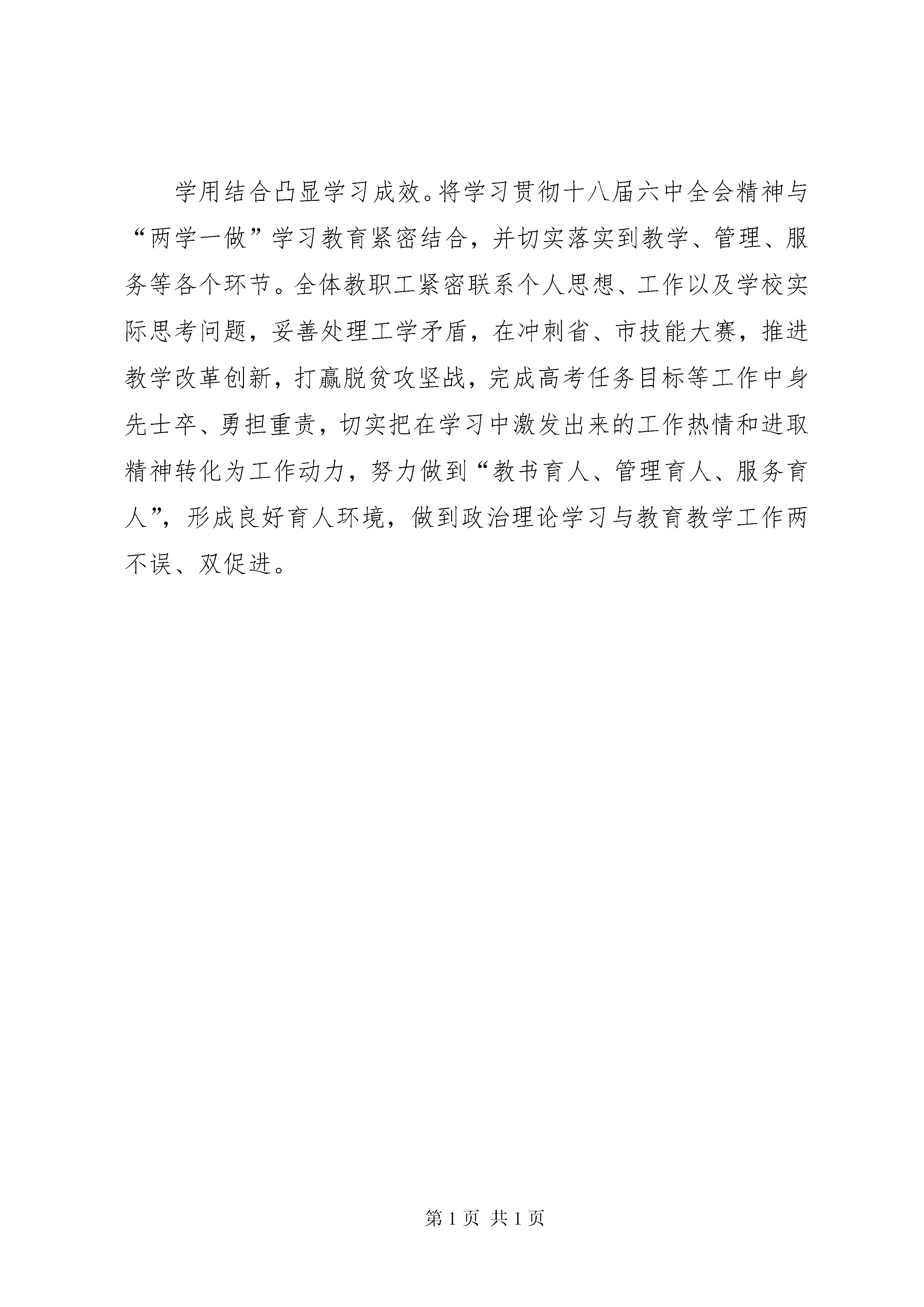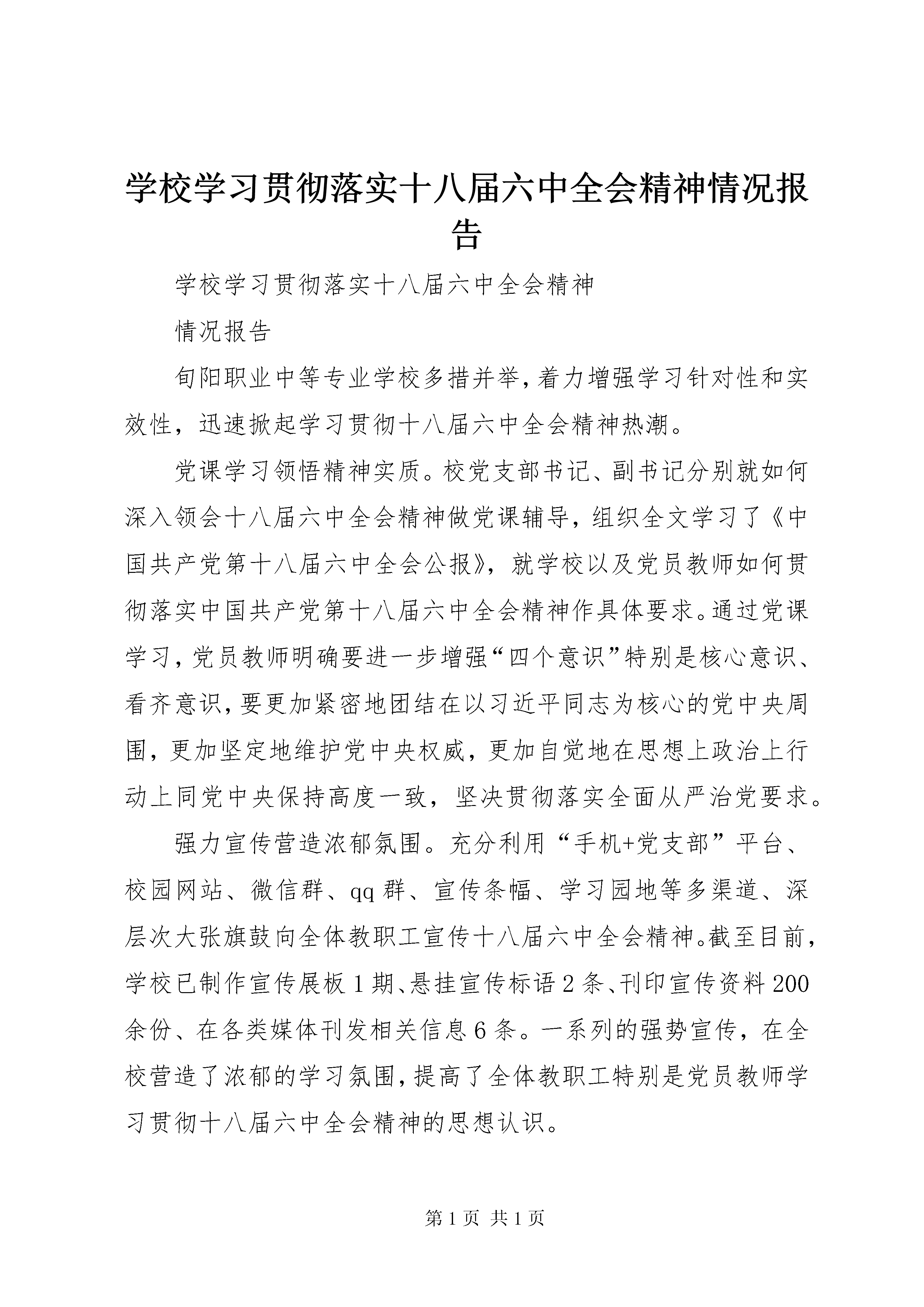 学校学习贯彻落实十八届六中全会精神情况报告学校学习贯彻落实十八届六中全会精神情况报告旬阳职业中等专业学校多措并举,着力增强学习针对性和实效性,迅速掀起学习贯彻十八届六中全会精神热潮。党课学习领悟精神实质。校党支部书记、副书记分别就如何深入领会十八届六中全会精神做党课辅导,组织全文学习了《中国共产党第十八届六中全会公报》,就学校以及党员教师如何贯彻落实中国共产党第十八届六中全会精神作具体要求。通过党课学习,党员教师明确要进一步增强“四个意识”特别是核心意识、看齐意识,要更加紧密地团结在以习近平同志为核心的党中央周围,更加坚定地维护党中央权威,更加自觉地在思想上政治上行动上同党中央保持高度一致,坚决贯彻落实全面从严治党要求。强力宣传营造浓郁氛围。充分利用“手机+党支部”平台、校园网站、微信群、qq群、宣传条幅、学习园地等多渠道、深层次大张旗鼓向全体教职工宣传十八届六中全会精神。截至目前,学校已制作宣传展板1期、悬挂宣传标语2条、刊印宣传资料200余份、在各类媒体刊发相关信息6条。一系列的强势宣传,在全校营造了浓郁的学习氛围,提高了全体教职工特别是党员教师学习贯彻十八届六中全会精神的思想认识。学用结合凸显学习成效。将学习贯彻十八届六中全会精神与“两学一做”学习教育紧密结合,并切实落实到教学、管理、服务等各个环节。全体教职工紧密联系个人思想、工作以及学校实际思考问题,妥善处理工学矛盾,在冲刺省、市技能大赛,推进教学改革创新,打赢脱贫攻坚战,完成高考任务目标等工作中身先士卒、勇担重责,切实把在学习中激发出来的工作热情和进取精神转化为工作动力,努力做到“教书育人、管理育人、服务育人”,形成良好育人环境,做到政治理论学习与教育教学工作两不误、双促进。