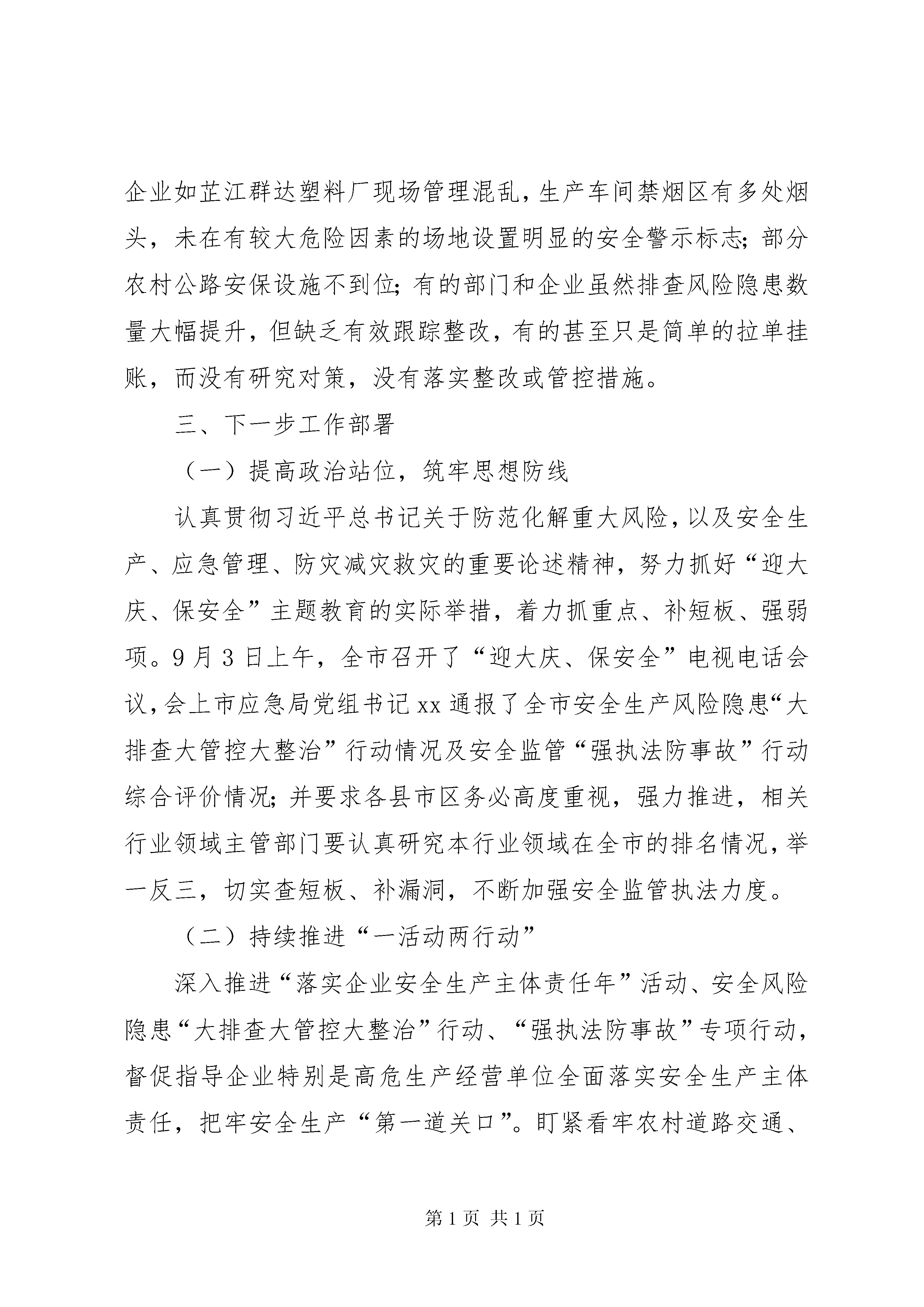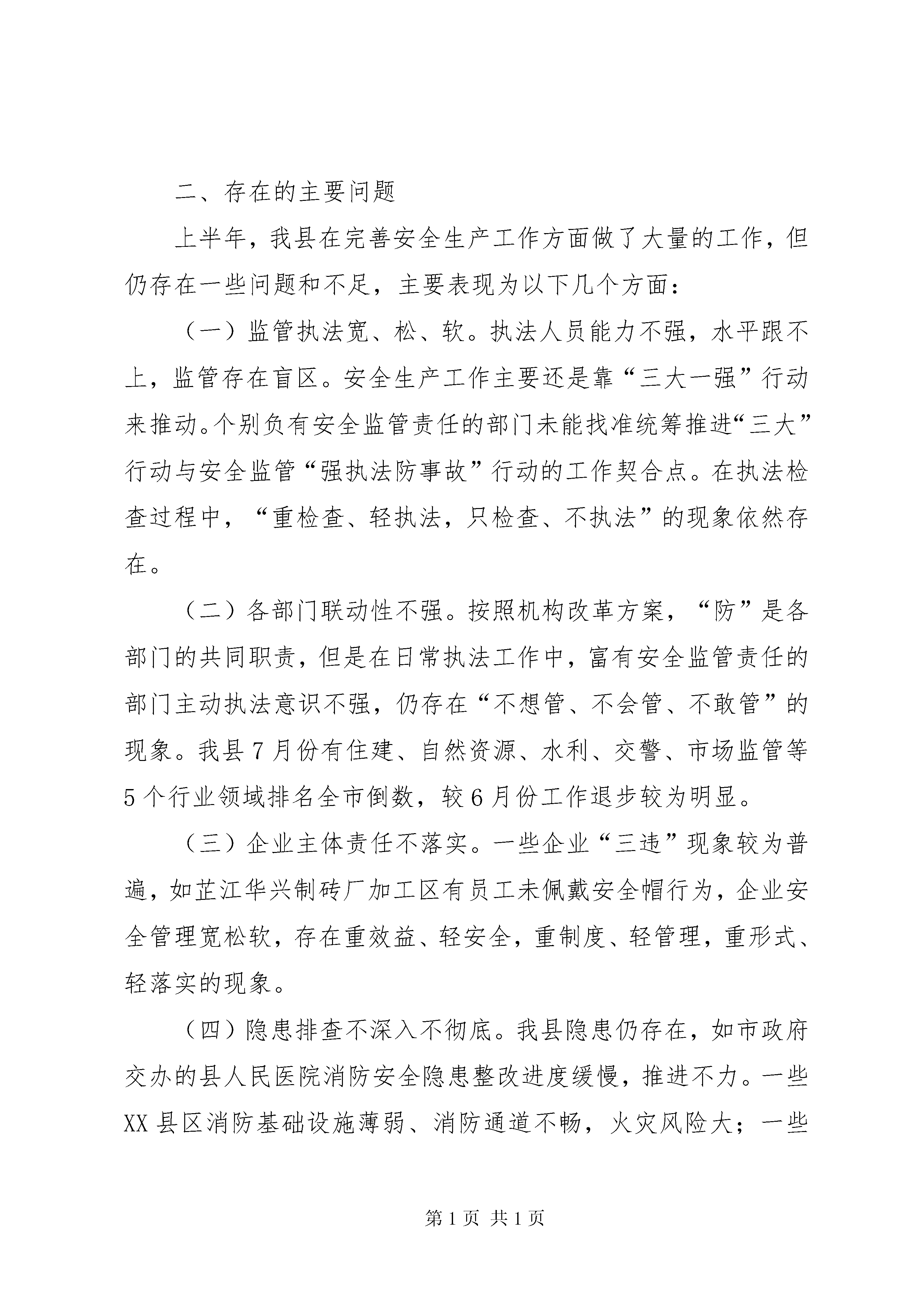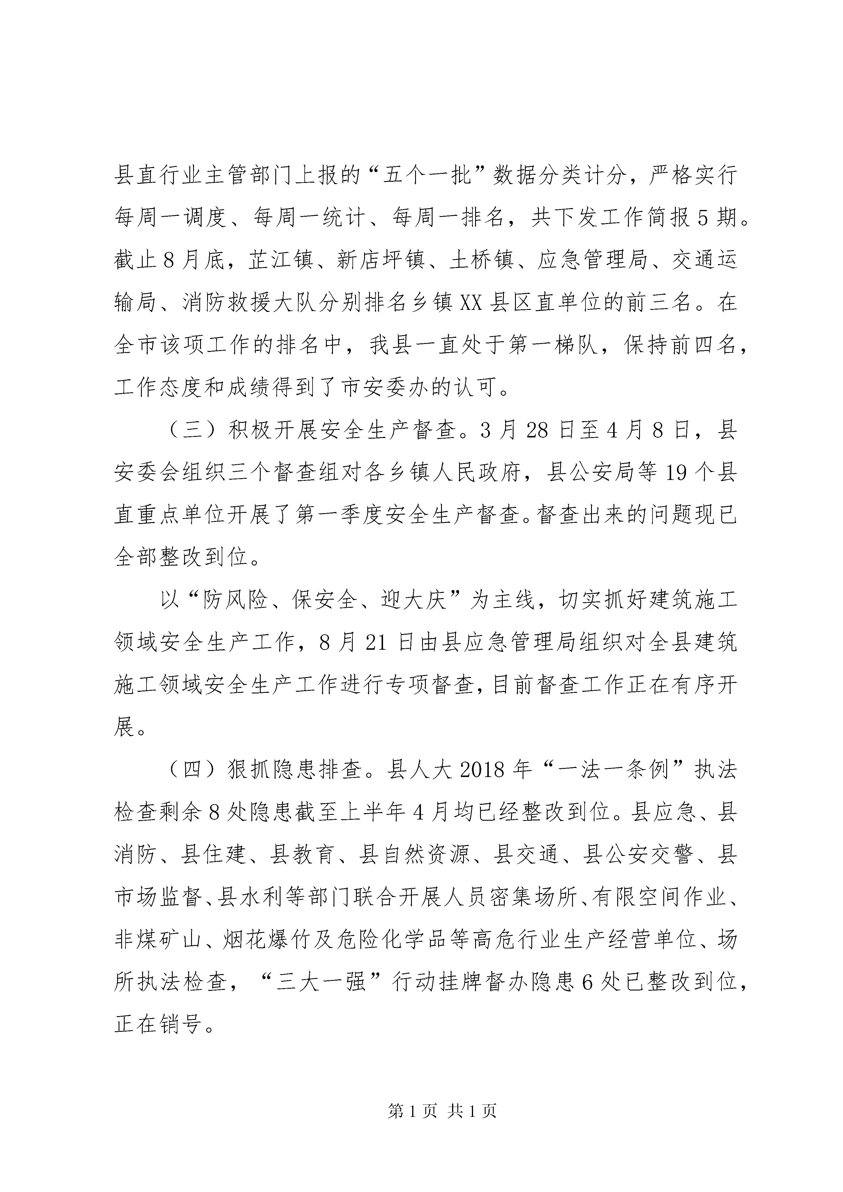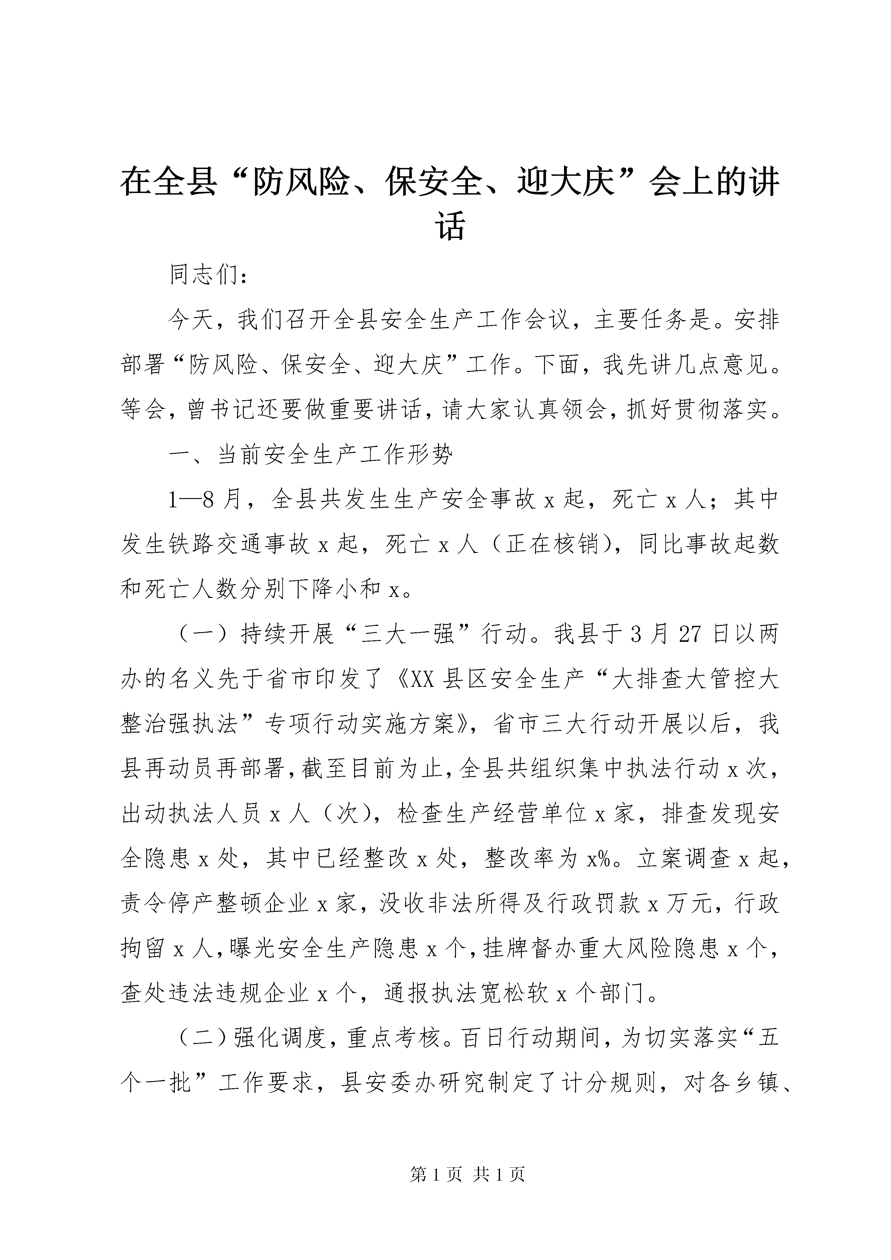 在全县“防风险、保安全、迎大庆”会上的讲话同志们:今天,我们召开全县安全生产工作会议,主要任务是。安排部署“防风险、保安全、迎大庆”工作。下面,我先讲几点意见。等会,曾书记还要做重要讲话,请大家认真领会,抓好贯彻落实。一、当前安全生产工作形势1—8月,全县共发生生产安全事故x起,死亡x人;其中发生铁路交通事故x起,死亡x人(正在核销),同比事故起数和死亡人数分别下降小和x。(一)持续开展“三大一强”行动。我县于3月27日以两办的名义先于省市印发了《XX县区安全生产“大排查大管控大整治强执法”专项行动实施方案》,省市三大行动开展以后,我县再动员再部署,截至目前为止,全县共组织集中执法行动x次,出动执法人员x人(次),检查生产经营单位x家,排查发现安全隐患x处,其中已经整改x处,整改率为x%。立案调查x起,责令停产整顿企业x家,没收非法所得及行政罚款x万元,行政拘留x人,曝光安全生产隐患x个,挂牌督办重大风险隐患x个,查处违法违规企业x个,通报执法宽松软x个部门。(二)强化调度,重点考核。百日行动期间,为切实落实“五个一批”工作要求,县安委办研究制定了计分规则,对各乡镇、县直行业主管部门上报的“五个一批”数据分类计分,严格实行每周一调度、每周一统计、每周一排名,共下发工作简报5期。截止8月底,芷江镇、新店坪镇、土桥镇、应急管理局、交通运输局、消防救援大队分别排名乡镇XX县区直单位的前三名。在全市该项工作的排名中,我县一直处于第一梯队,保持前四名,工作态度和成绩得到了市安委办的认可。(三)积极开展安全生产督查。3月28日至4月8日,县安委会组织三个督查组对各乡镇人民政府,县公安局等19个县直重点单位开展了第一季度安全生产督查。督查出来的问题现已全部整改到位。以“防风险、保安全、迎大庆”为主线,切实抓好建筑施工领域安全生产工作,8月21日由县应急管理局组织对全县建筑施工领域安全生产工作进行专项督查,目前督查工作正在有序开展。(四)狠抓隐患排查。县人大2018年“一法一条例”执法检查剩余8处隐患截至上半年4月均已经整改到位。县应急、县消防、县住建、县教育、县自然资源、县交通、县公安交警、县市场监督、县水利等部门联合开展人员密集场所、有限空间作业、非煤矿山、烟花爆竹及危险化学品等高危行业生产经营单位、场所执法检查,“三大一强”行动挂牌督办隐患6处已整改到位,正在销号。二、存在的主要问题上半年,我县在完善安全生产工作方面做了大量的工作,但仍存在一些问题和不足,主要表现为以下几个方面:(一)监管执法宽、松、软。执法人员能力不强,水平跟不上,监管存在盲区。安全生产工作主要还是靠“三大一强”行动来推动。个别负有安全监管责任的部门未能找准统筹推进“三大”行动与安全监管“强执法防事故”行动的工作契合点。在执法检查过程中,“重检查、轻执法,只检查、不执法”的现象依然存在。(二)各部门联动性不强。按照机构改革方案,“防”是各部门的共同职责,但是在日常执法工作中,富有安全监管责任的部门主动执法意识不强,仍存在“不想管、不会管、不敢管”的现象。我县7月份有住建、自然资源、水利、交警、市场监管等5个行业领域排名全市倒数,较6月份工作退步较为明显。(三)企业主体责任不落实。一些企业“三违”现象较为普遍,如芷江华兴制砖厂加工区有员工未佩戴安全帽行为,企业安全管理宽松软,存在重效益、轻安全,重制度、轻管理,重形式、轻落实的现象。(四)隐患排查不深入不彻底。我县隐患仍存在,如市政府交办的县人民医院消防安全隐患整改进度缓慢,推进不力。一些XX县区消防基础设施薄弱、消防通道不畅,火灾风险大;一些企业如芷江群达塑料厂现场管理混乱,生产车间禁烟区有多处烟头,未在有较大危险因素的场地设置明显的安全警示标志;部分农村公路安保设施不到位;有的部门和企业虽然排查风险隐患数量大幅提升,但缺乏有效跟踪整改,有的甚至只是简单的拉单挂账,而没有研究对策,没有落实整改或管控措施。三、下一步工作部署(一)提高政治站位,筑牢思想防线认真贯彻习近平总书记关于防范化解重大风险,以及安全生产、应急管理、防灾减灾救灾的重要论述精神,努力抓好“迎大庆、保安全”主题教育的实际举措,着力抓重点、补短板、强弱项。9月3日上午,全市召开了“迎大庆、保安全”电视电话会议,会上市应急局党组书记xx通报了全市安全生产风险隐患“大排查大管控大整治”行动情况及安全监管“强执法防事故”行动综合评价情况;并要求各县市区务必高度重视,强力推进,相关行业领域主管部门要认真研究本行业领域在全市的排名情况,举一反三,切实查短板、补漏洞,不断加强安全监管执法力度。(二)持续推进“一活动两行动”深入推进“落实企业安全生产主体责任年”活动、安全风险隐患“大排查大管控大整治”行动、“强执法防事故”专项行动,督促指导企业