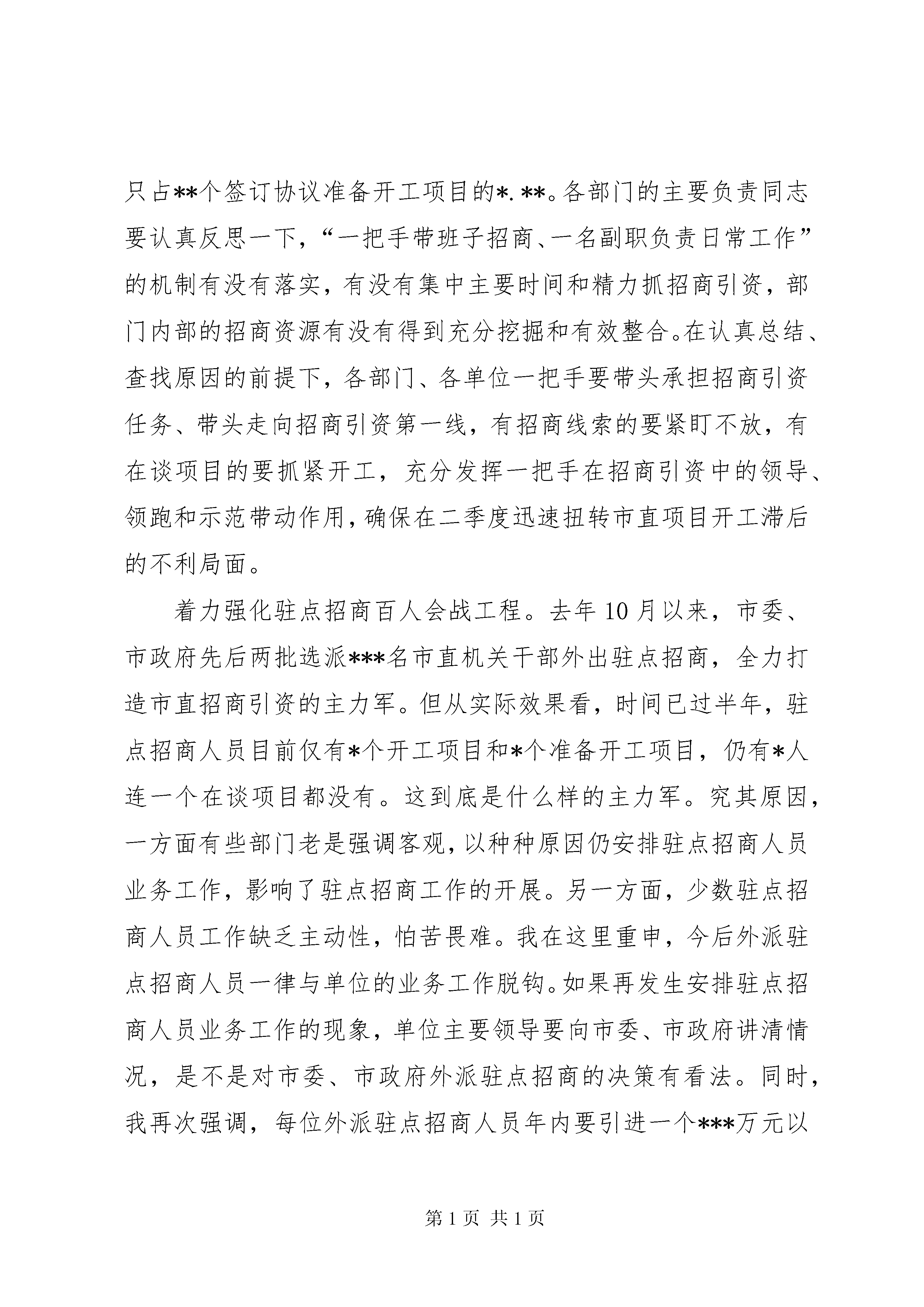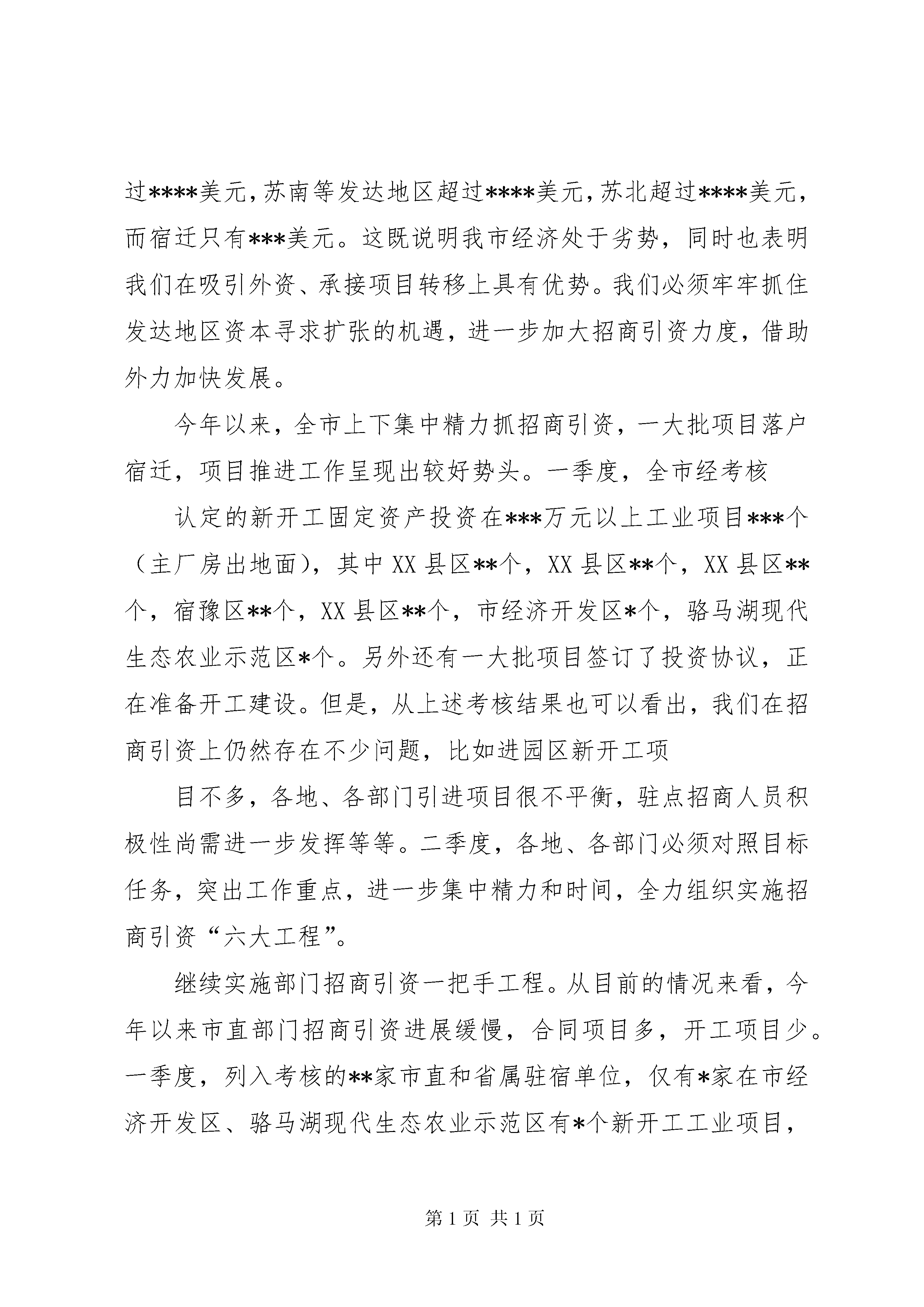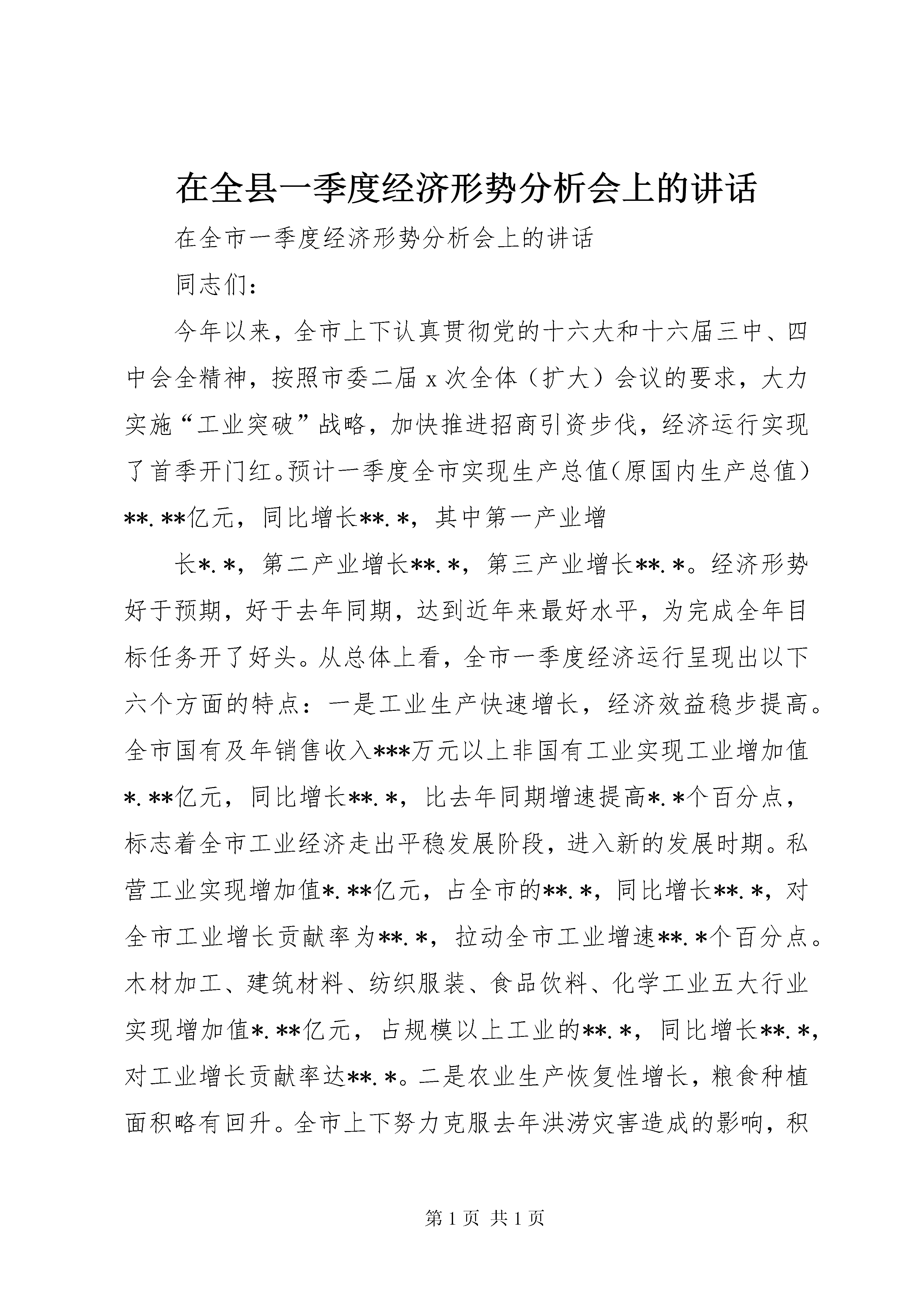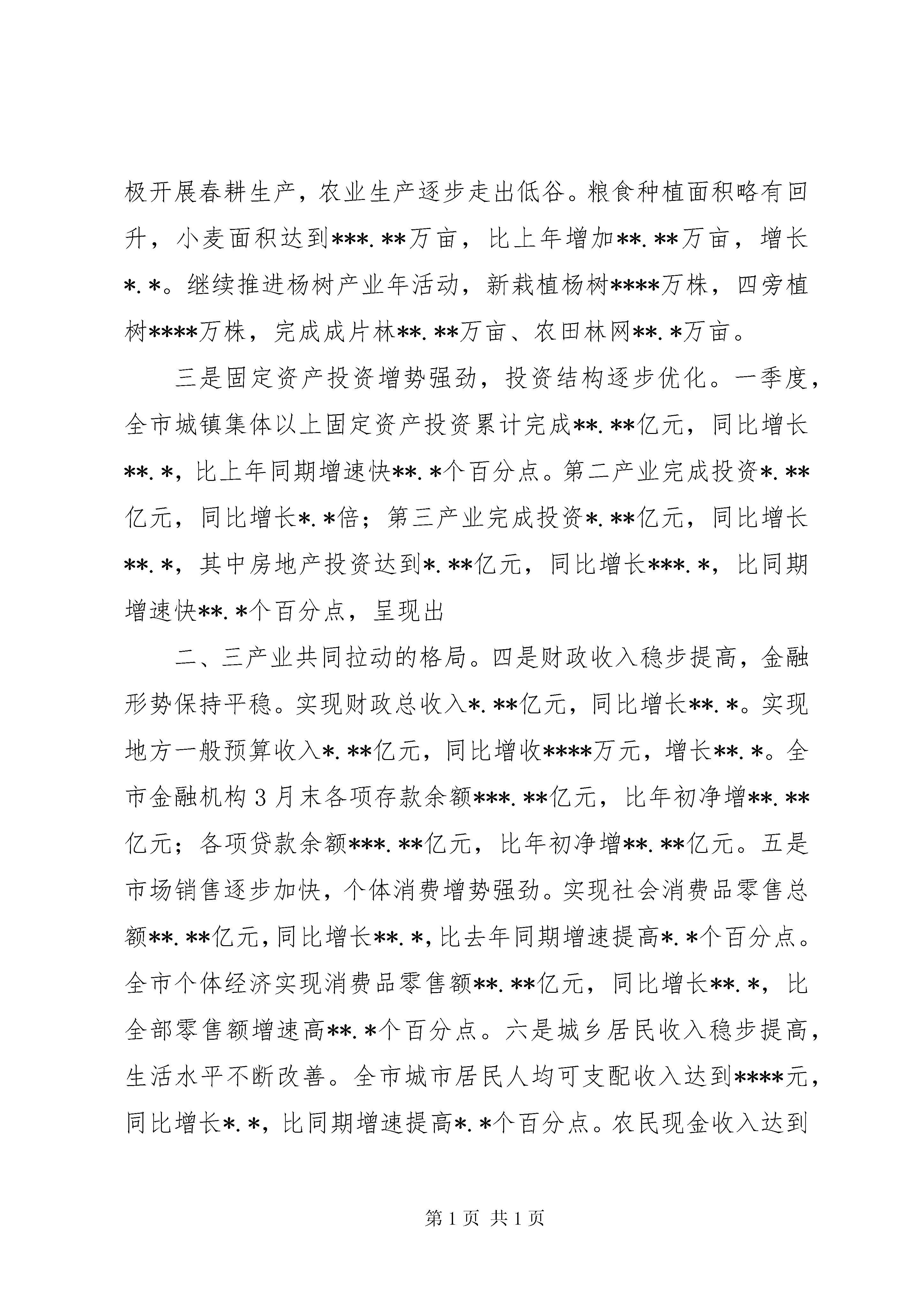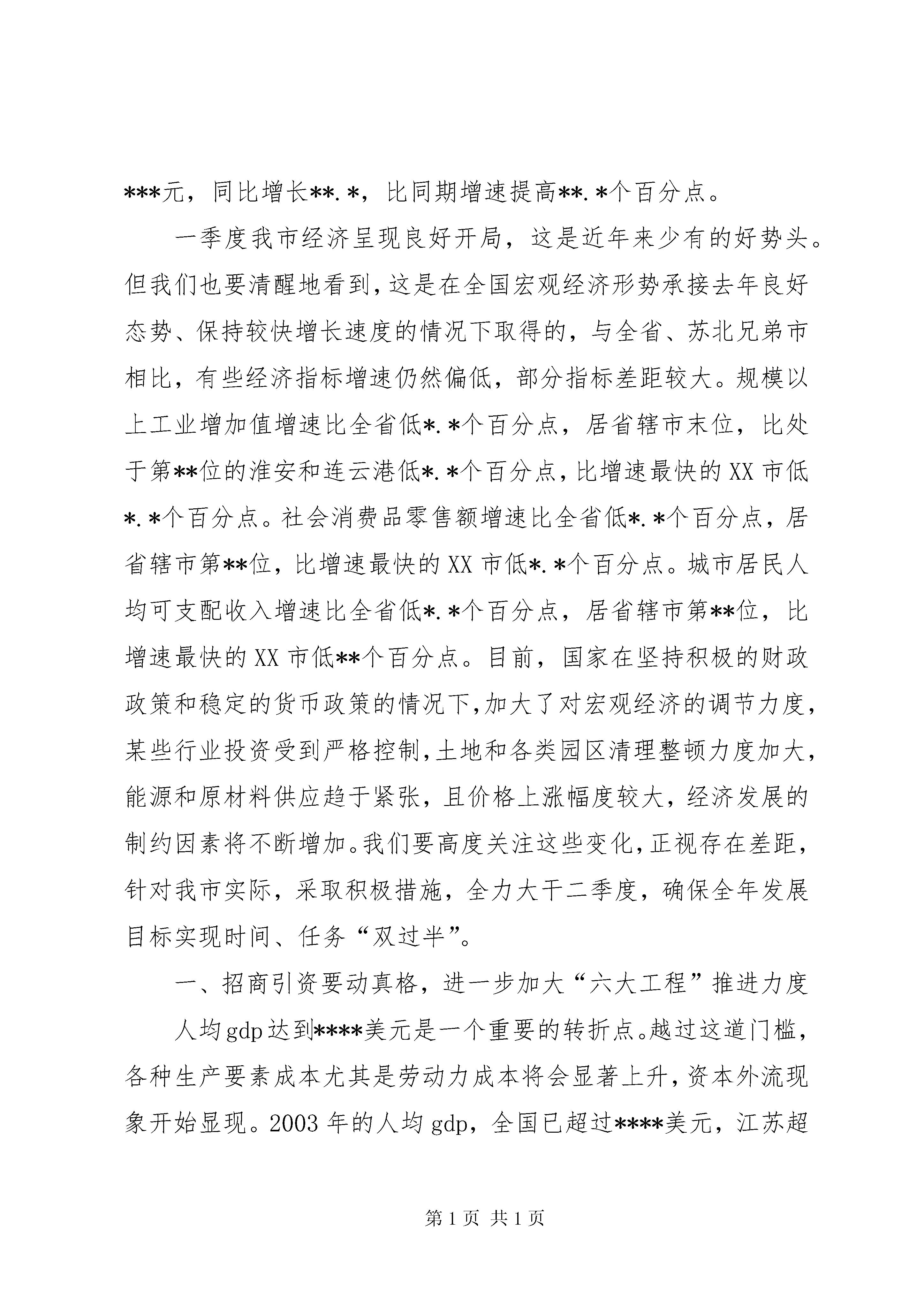 在全县一季度经济形势分析会上的讲话在全市一季度经济形势分析会上的讲话同志们:今年以来,全市上下认真贯彻党的十六大和十六届三中、四中会全精神,按照市委二届x次全体(扩大)会议的要求,大力实施“工业突破”战略,加快推进招商引资步伐,经济运行实现了首季开门红。预计一季度全市实现生产总值(原国内生产总值)**.**亿元,同比增长**.*,其中第一产业增长*.*,第二产业增长**.*,第三产业增长**.*。经济形势好于预期,好于去年同期,达到近年来最好水平,为完成全年目标任务开了好头。从总体上看,全市一季度经济运行呈现出以下六个方面的特点:一是工业生产快速增长,经济效益稳步提高。全市国有及年销售收入***万元以上非国有工业实现工业增加值*.**亿元,同比增长**.*,比去年同期增速提高*.*个百分点,标志着全市工业经济走出平稳发展阶段,进入新的发展时期。私营工业实现增加值*.**亿元,占全市的**.*,同比增长**.*,对全市工业增长贡献率为**.*,拉动全市工业增速**.*个百分点。木材加工、建筑材料、纺织服装、食品饮料、化学工业五大行业实现增加值*.**亿元,占规模以上工业的**.*,同比增长**.*,对工业增长贡献率达**.*。二是农业生产恢复性增长,粮食种植面积略有回升。全市上下努力克服去年洪涝灾害造成的影响,积极开展春耕生产,农业生产逐步走出低谷。粮食种植面积略有回升,小麦面积达到***.**万亩,比上年增加**.**万亩,增长*.*。继续推进杨树产业年活动,新栽植杨树****万株,四旁植树****万株,完成成片林**.**万亩、农田林网**.*万亩。三是固定资产投资增势强劲,投资结构逐步优化。一季度,全市城镇集体以上固定资产投资累计完成**.**亿元,同比增长**.*,比上年同期增速快**.*个百分点。第二产业完成投资*.**亿元,同比增长*.*倍;第三产业完成投资*.**亿元,同比增长**.*,其中房地产投资达到*.**亿元,同比增长***.*,比同期增速快**.*个百分点,呈现出二、三产业共同拉动的格局。四是财政收入稳步提高,金融形势保持平稳。实现财政总收入*.**亿元,同比增长**.*。实现地方一般预算收入*.**亿元,同比增收****万元,增长**.*。全市金融机构3月末各项存款余额***.**亿元,比年初净增**.**亿元;各项贷款余额***.**亿元,比年初净增**.**亿元。五是市场销售逐步加快,个体消费增势强劲。实现社会消费品零售总额**.**亿元,同比增长**.*,比去年同期增速提高*.*个百分点。全市个体经济实现消费品零售额**.**亿元,同比增长**.*,比全部零售额增速高**.*个百分点。六是城乡居民收入稳步提高,生活水平不断改善。全市城市居民人均可支配收入达到****元,同比增长*.*,比同期增速提高*.*个百分点。农民现金收入达到***元,同比增长**.*,比同期增速提高**.*个百分点。一季度我市经济呈现良好开局,这是近年来少有的好势头。但我们也要清醒地看到,这是在全国宏观经济形势承接去年良好态势、保持较快增长速度的情况下取得的,与全省、苏北兄弟市相比,有些经济指标增速仍然偏低,部分指标差距较大。规模以上工业增加值增速比全省低*.*个百分点,居省辖市末位,比处于第**位的淮安和连云港低*.*个百分点,比增速最快的XX市低*.*个百分点。社会消费品零售额增速比全省低*.*个百分点,居省辖市第**位,比增速最快的XX市低*.*个百分点。城市居民人均可支配收入增速比全省低*.*个百分点,居省辖市第**位,比增速最快的XX市低**个百分点。目前,国家在坚持积极的财政政策和稳定的货币政策的情况下,加大了对宏观经济的调节力度,某些行业投资受到严格控制,土地和各类园区清理整顿力度加大,能源和原材料供应趋于紧张,且价格上涨幅度较大,经济发展的制约因素将不断增加。我们要高度关注这些变化,正视存在差距,针对我市实际,采取积极措施,全力大干二季度,确保全年发展目标实现时间、任务“双过半”。一、招商引资要动真格,进一步加大“六大工程”推进力度人均gdp达到****美元是一个重要的转折点。越过这道门槛,各种生产要素成本尤其是劳动力成本将会显著上升,资本外流现象开始显现。2003年的人均gdp,全国已超过****美元,江苏超过****美元,苏南等发达地区超过****美元,苏北超过****美元,而宿迁只有***美元。这既说明我市经济处于劣势,同时也表明我们在吸引外资、承接项目转移上具有优势。我们必须牢牢抓住发达地区资本寻求扩张的机遇,进一步加大招商引资力度,借助外力加快发展。今年以来,全市上下集中精力抓招商引资,一大批项目落户宿迁,项目推进工作呈现出较好势头。一季度,全市经考核认定的新开工固定资产投