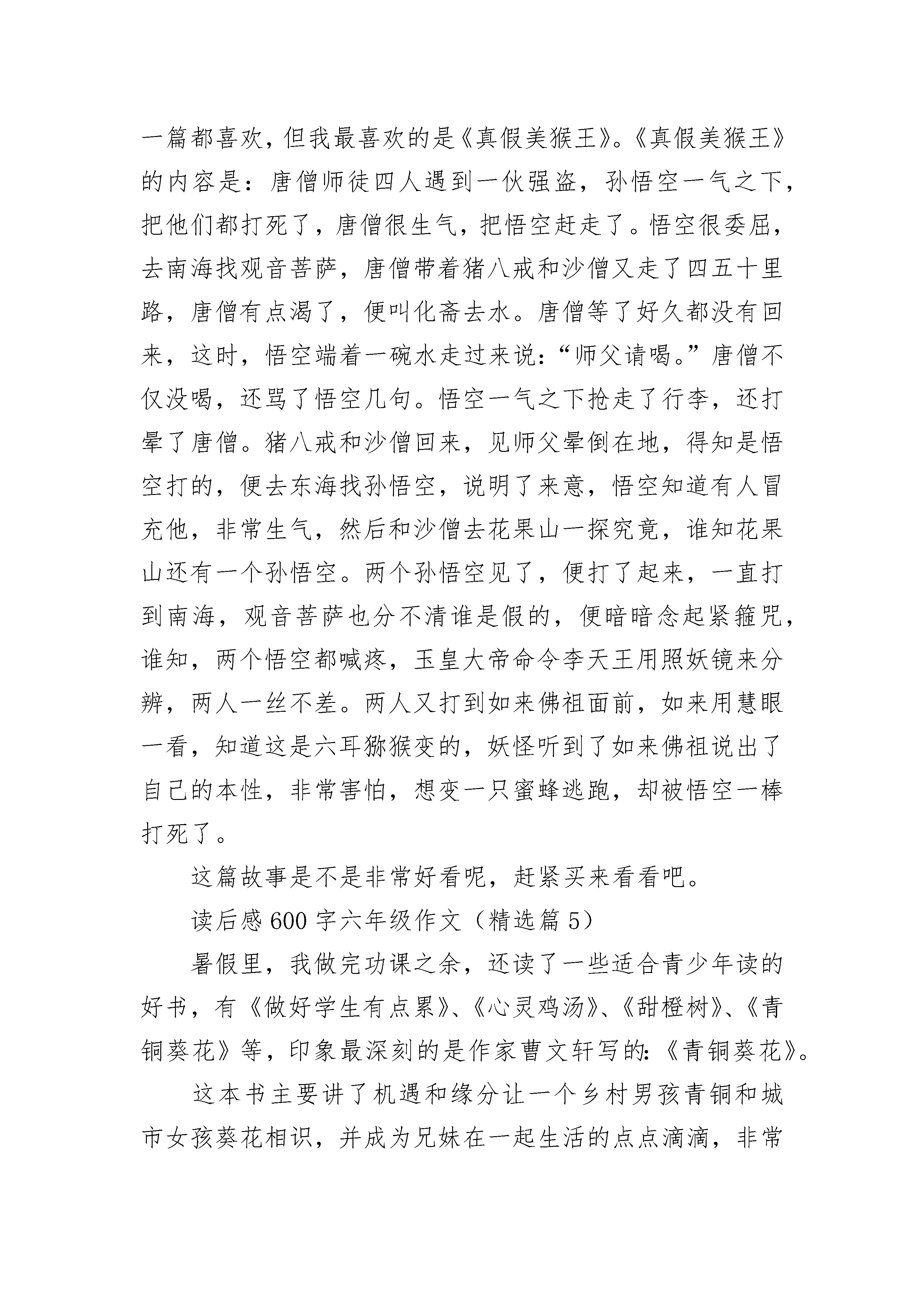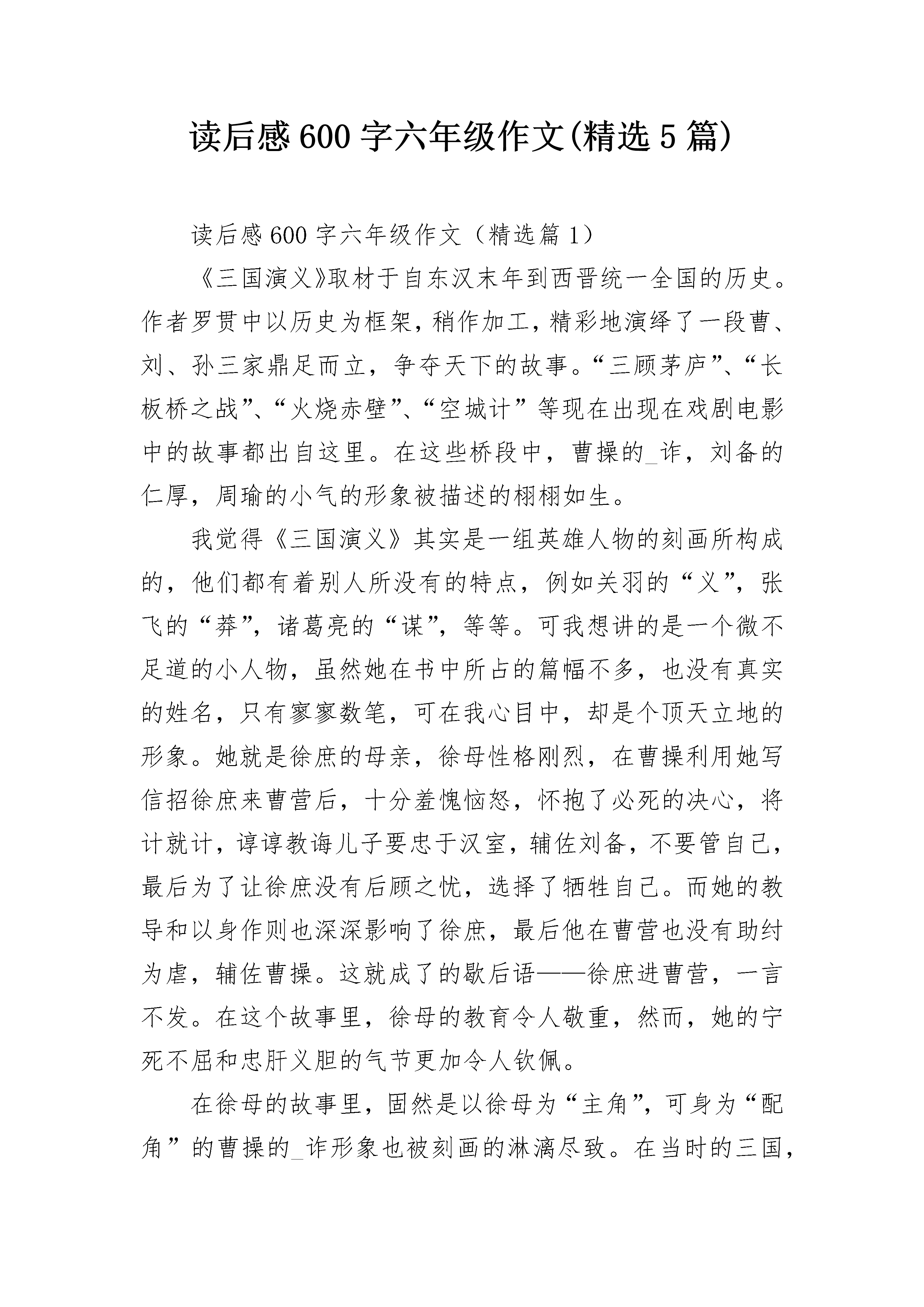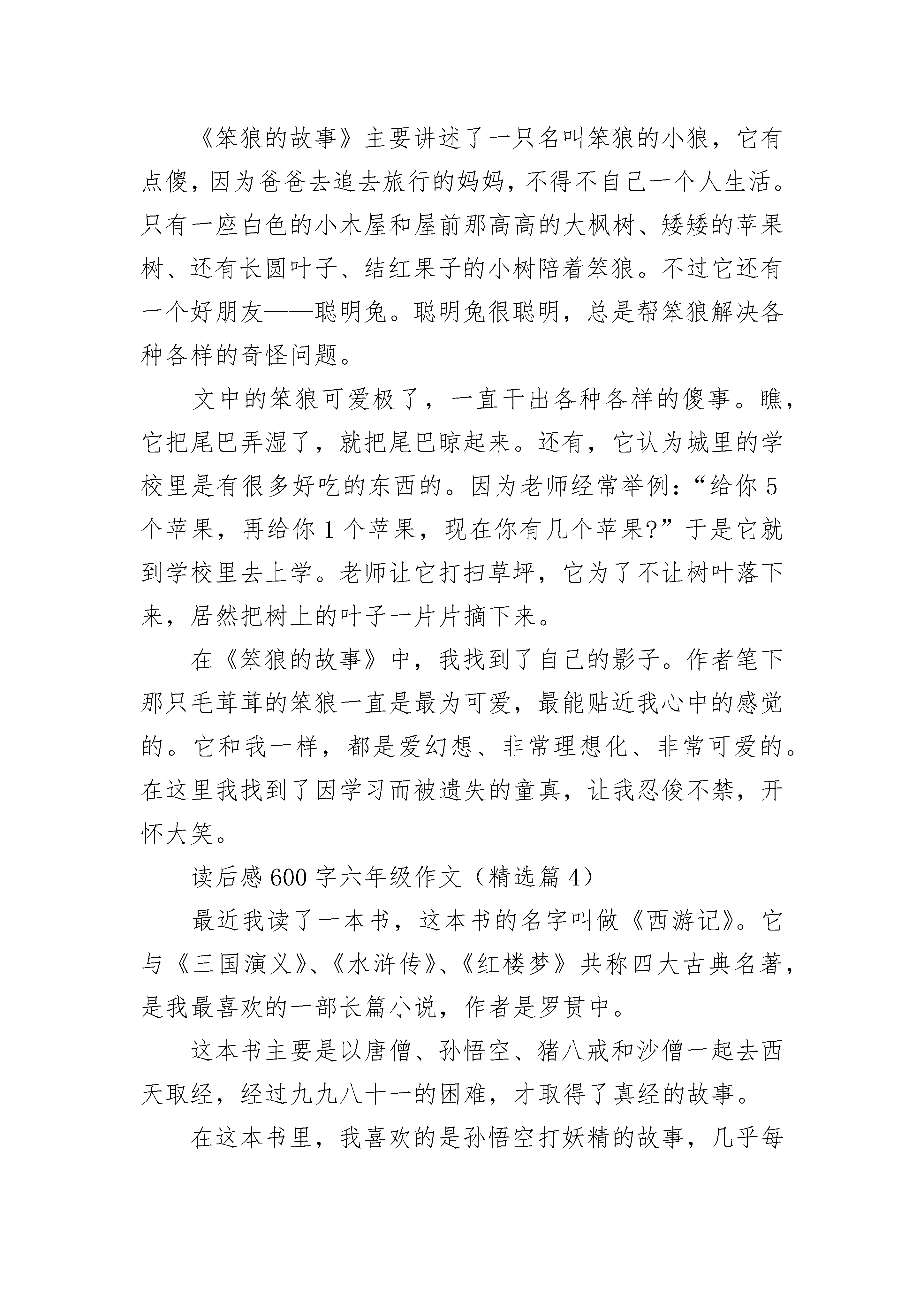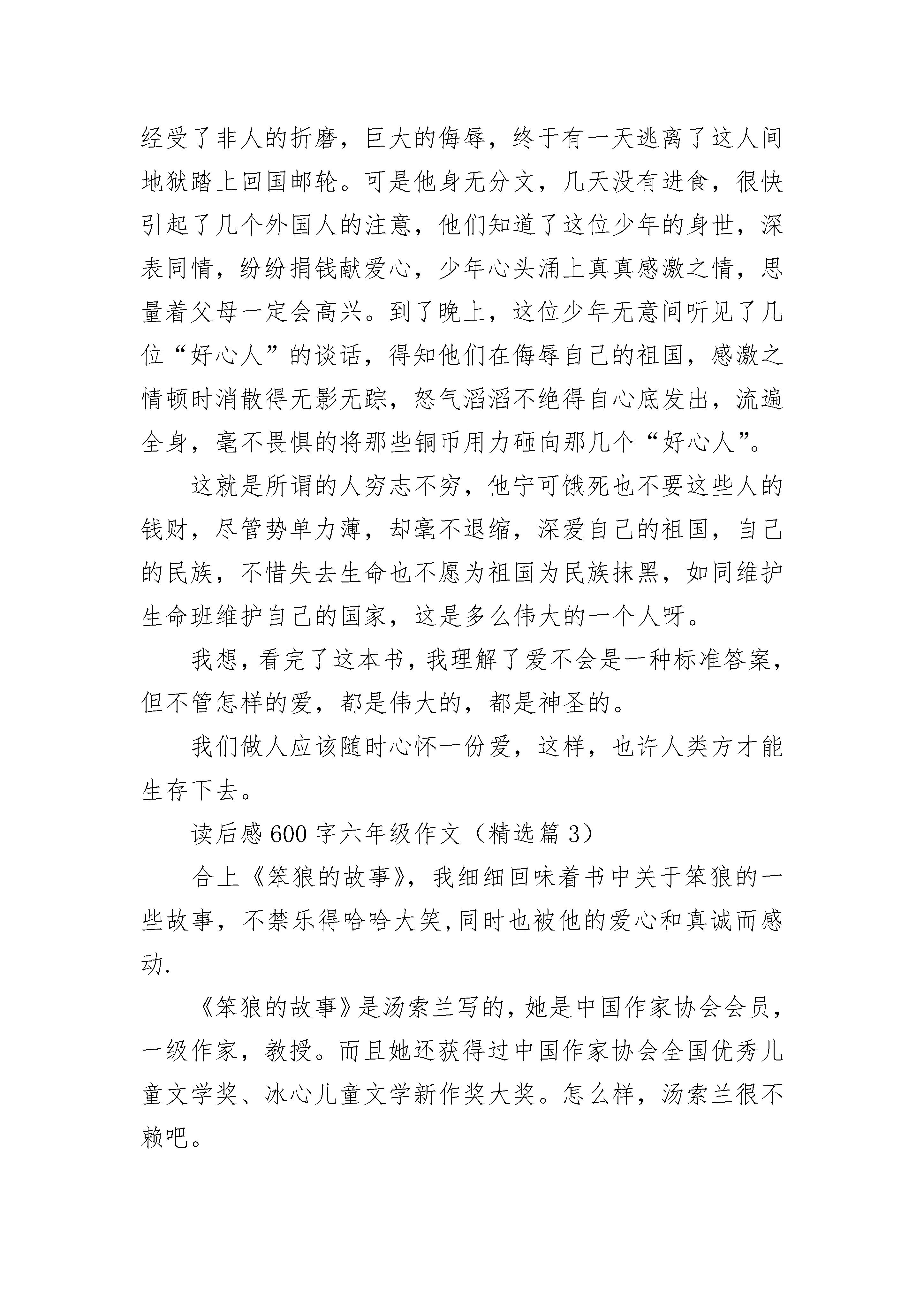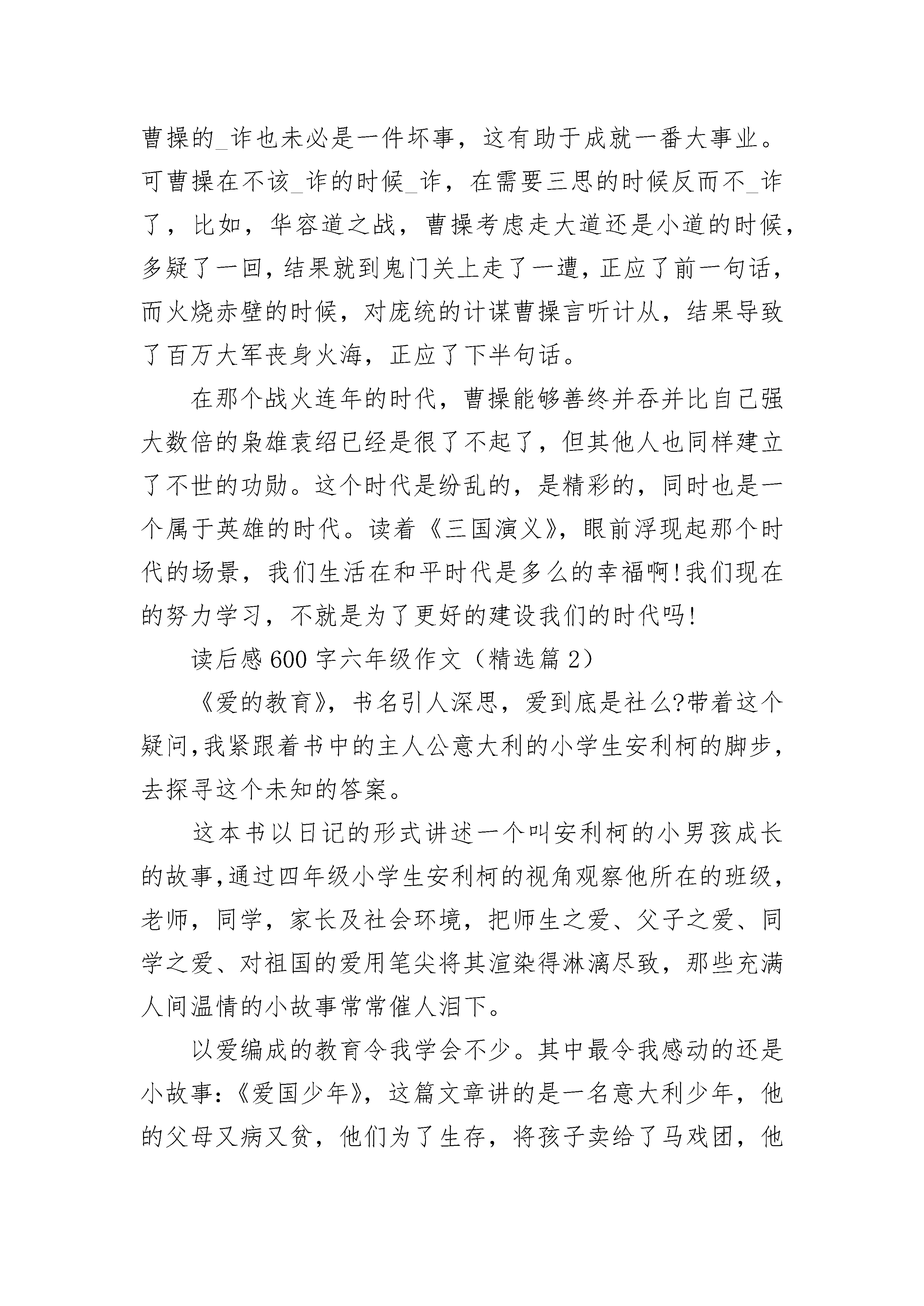 读后感600字六年级作文(精选5篇)读后感600字六年级作文(精选篇1)《三国演义》取材于自东汉末年到西晋统一全国的历史。作者罗贯中以历史为框架,稍作加工,精彩地演绎了一段曹、刘、孙三家鼎足而立,争夺天下的故事。“三顾茅庐”、“长板桥之战”、“火烧赤壁”、“空城计”等现在出现在戏剧电影中的故事都出自这里。在这些桥段中,曹操的_诈,刘备的仁厚,周瑜的小气的形象被描述的栩栩如生。我觉得《三国演义》其实是一组英雄人物的刻画所构成的,他们都有着别人所没有的特点,例如关羽的“义”,张飞的“莽”,诸葛亮的“谋”,等等。可我想讲的是一个微不足道的小人物,虽然她在书中所占的篇幅不多,也没有真实的姓名,只有寥寥数笔,可在我心目中,却是个顶天立地的形象。她就是徐庶的母亲,徐母性格刚烈,在曹操利用她写信招徐庶来曹营后,十分羞愧恼怒,怀抱了必死的决心,将计就计,谆谆教诲儿子要忠于汉室,辅佐刘备,不要管自己,最后为了让徐庶没有后顾之忧,选择了牺牲自己。而她的教导和以身作则也深深影响了徐庶,最后他在曹营也没有助纣为虐,辅佐曹操。这就成了的歇后语——徐庶进曹营,一言不发。在这个故事里,徐母的教育令人敬重,然而,她的宁死不屈和忠肝义胆的气节更加令人钦佩。在徐母的故事里,固然是以徐母为“主角”,可身为“配角”的曹操的_诈形象也被刻画的淋漓尽致。在当时的三国,曹操的_诈也未必是一件坏事,这有助于成就一番大事业。可曹操在不该_诈的时候_诈,在需要三思的时候反而不_诈了,比如,华容道之战,曹操考虑走大道还是小道的时候,多疑了一回,结果就到鬼门关上走了一遭,正应了前一句话,而火烧赤壁的时候,对庞统的计谋曹操言听计从,结果导致了百万大军丧身火海,正应了下半句话。在那个战火连年的时代,曹操能够善终并吞并比自己强大数倍的枭雄袁绍已经是很了不起了,但其他人也同样建立了不世的功勋。这个时代是纷乱的,是精彩的,同时也是一个属于英雄的时代。读着《三国演义》,眼前浮现起那个时代的场景,我们生活在和平时代是多么的幸福啊!我们现在的努力学习,不就是为了更好的建设我们的时代吗!读后感600字六年级作文(精选篇2)《爱的教育》,书名引人深思,爱到底是社么?带着这个疑问,我紧跟着书中的主人公意大利的小学生安利柯的脚步,去探寻这个未知的答案。这本书以日记的形式讲述一个叫安利柯的小男孩成长的故事,通过四年级小学生安利柯的视角观察他所在的班级,老师,同学,家长及社会环境,把师生之爱、父子之爱、同学之爱、对祖国的爱用笔尖将其渲染得淋漓尽致,那些充满人间温情的小故事常常催人泪下。以爱编成的教育令我学会不少。其中最令我感动的还是小故事:《爱国少年》,这篇文章讲的是一名意大利少年,他的父母又病又贫,他们为了生存,将孩子卖给了马戏团,他经受了非人的折磨,巨大的侮辱,终于有一天逃离了这人间地狱踏上回国邮轮。可是他身无分文,几天没有进食,很快引起了几个外国人的注意,他们知道了这位少年的身世,深表同情,纷纷捐钱献爱心,少年心头涌上真真感激之情,思量着父母一定会高兴。到了晚上,这位少年无意间听见了几位“好心人”的谈话,得知他们在侮辱自己的祖国,感激之情顿时消散得无影无踪,怒气滔滔不绝得自心底发出,流遍全身,毫不畏惧的将那些铜币用力砸向那几个“好心人”。这就是所谓的人穷志不穷,他宁可饿死也不要这些人的钱财,尽管势单力薄,却毫不退缩,深爱自己的祖国,自己的民族,不惜失去生命也不愿为祖国为民族抹黑,如同维护生命班维护自己的国家,这是多么伟大的一个人呀。我想,看完了这本书,我理解了爱不会是一种标准答案,但不管怎样的爱,都是伟大的,都是神圣的。我们做人应该随时心怀一份爱,这样,也许人类方才能生存下去。读后感600字六年级作文(精选篇3)合上《笨狼的故事》,我细细回味着书中关于笨狼的一些故事,不禁乐得哈哈大笑,同时也被他的爱心和真诚而感动.《笨狼的故事》是汤索兰写的,她是中国作家协会会员,一级作家,教授。而且她还获得过中国作家协会全国优秀儿童文学奖、冰心儿童文学新作奖大奖。怎么样,汤索兰很不赖吧。《笨狼的故事》主要讲述了一只名叫笨狼的小狼,它有点傻,因为爸爸去追去旅行的妈妈,不得不自己一个人生活。只有一座白色的小木屋和屋前那高高的大枫树、矮矮的苹果树、还有长圆叶子、结红果子的小树陪着笨狼。不过它还有一个好朋友——聪明兔。聪明兔很聪明,总是帮笨狼解决各种各样的奇怪问题。文中的笨狼可爱极了,一直干出各种各样的傻事。瞧,它把尾巴弄湿了,就把尾巴晾起来。还有,它认为城里的学校里是有很多好吃的东西的。因为老师经常举例:“给你5个苹果,再给你1个苹果,现在你有几个苹果?”于是它就到学校里去上学。老师让它打扫草坪,它为了不让树叶落下来,居然把树上的叶子一片片摘下来。在《笨狼的故事》中,我找到了自己的影子。作者笔下那只毛茸茸的笨狼一直是最为