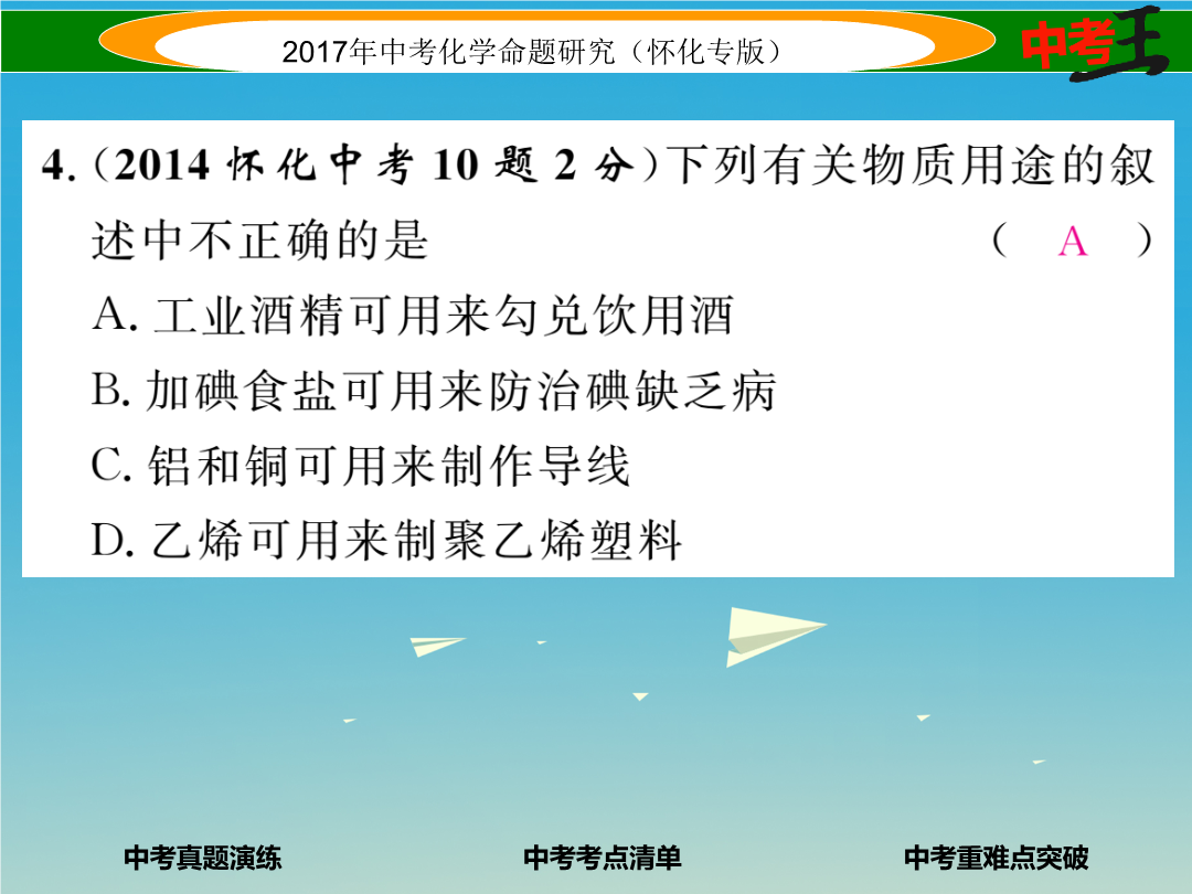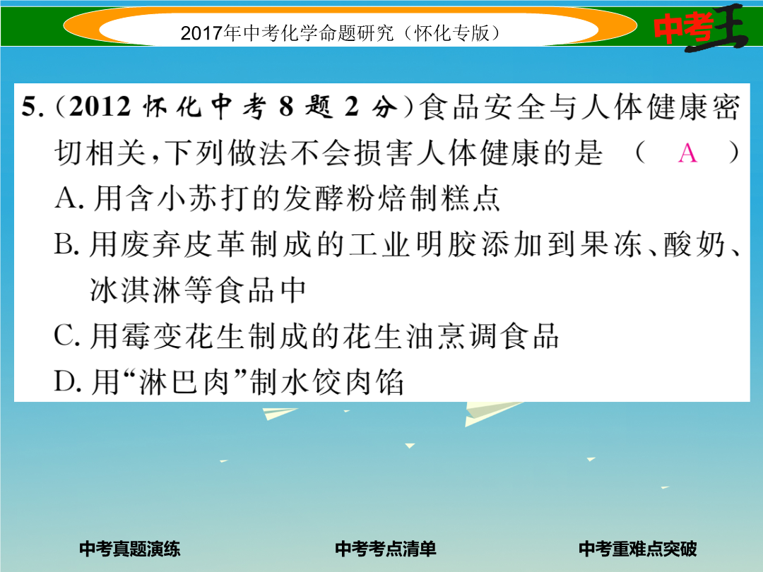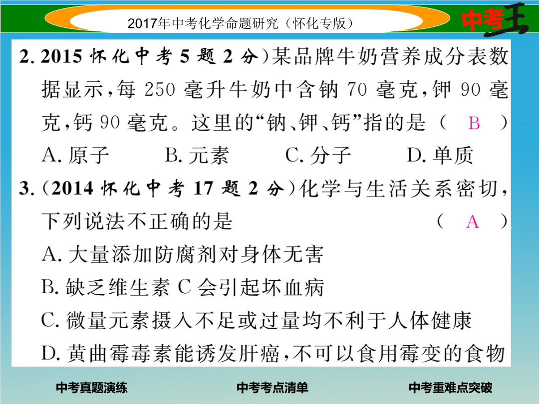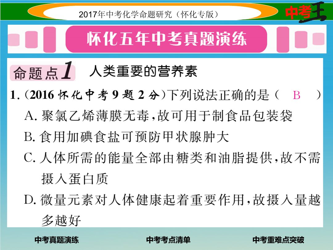 课件-全国-2017_(怀化专版)2017中考化学命题研究 第一编 教材知识梳理篇 第十二单元 化学与生活(精讲)课件.ppt