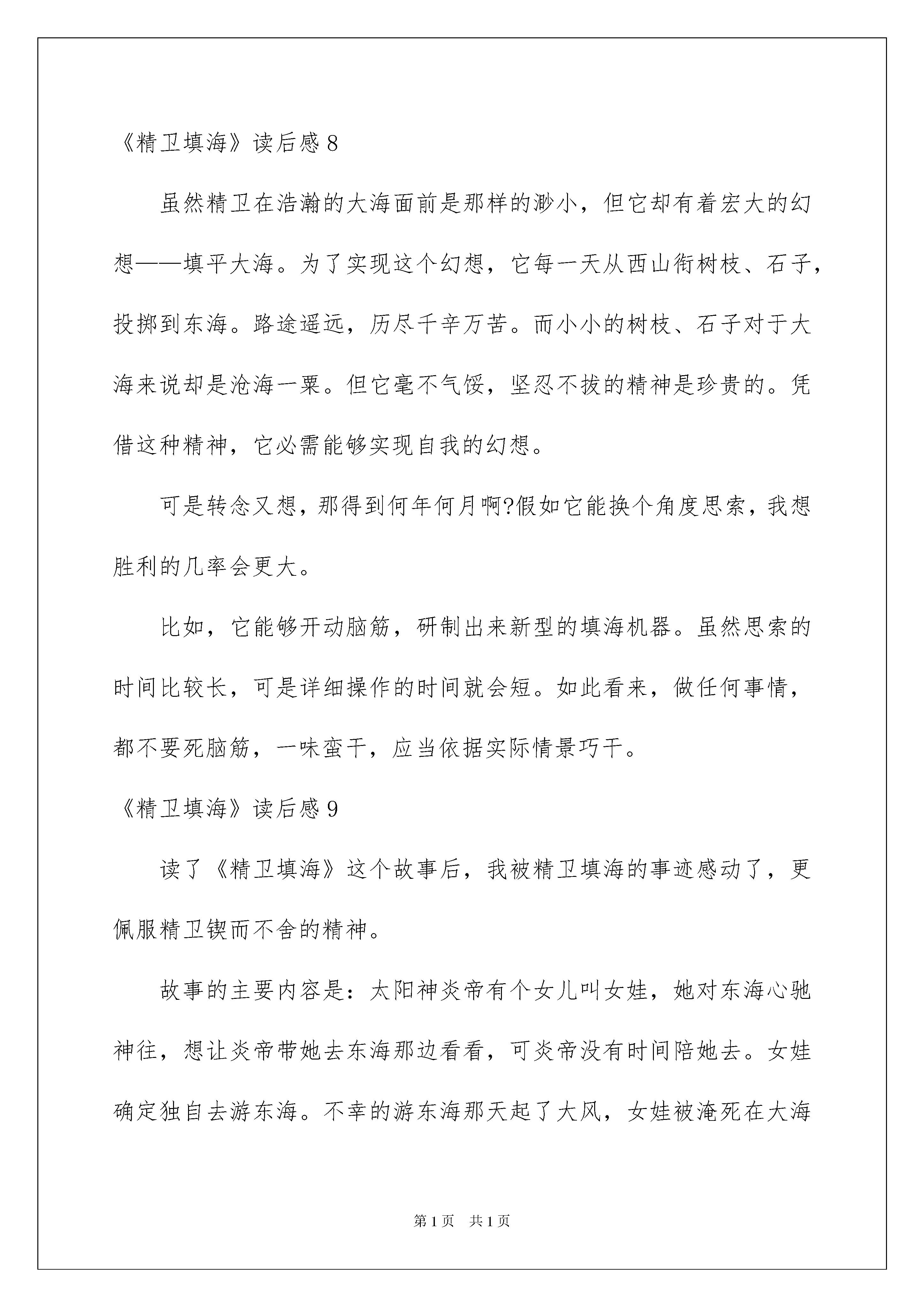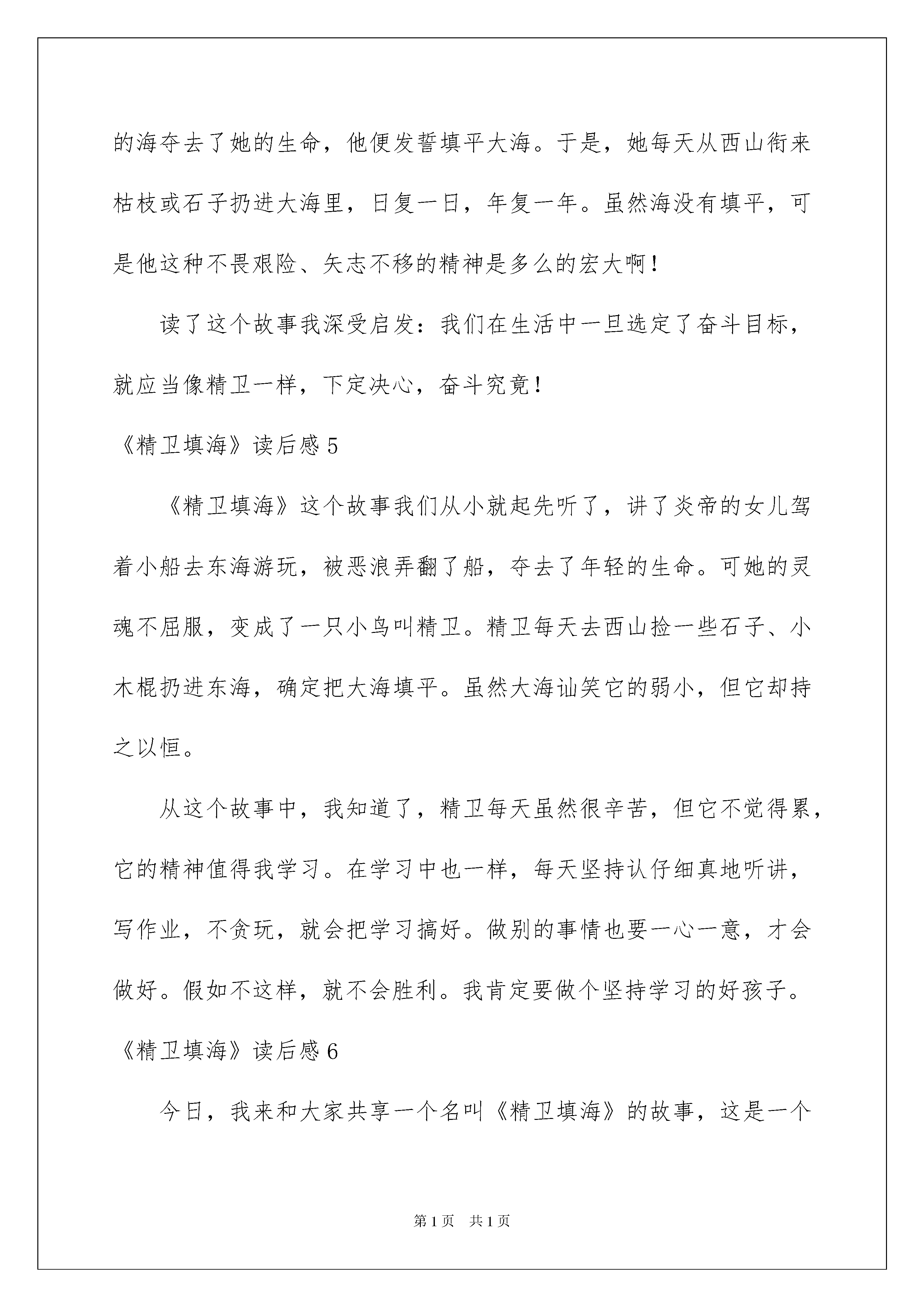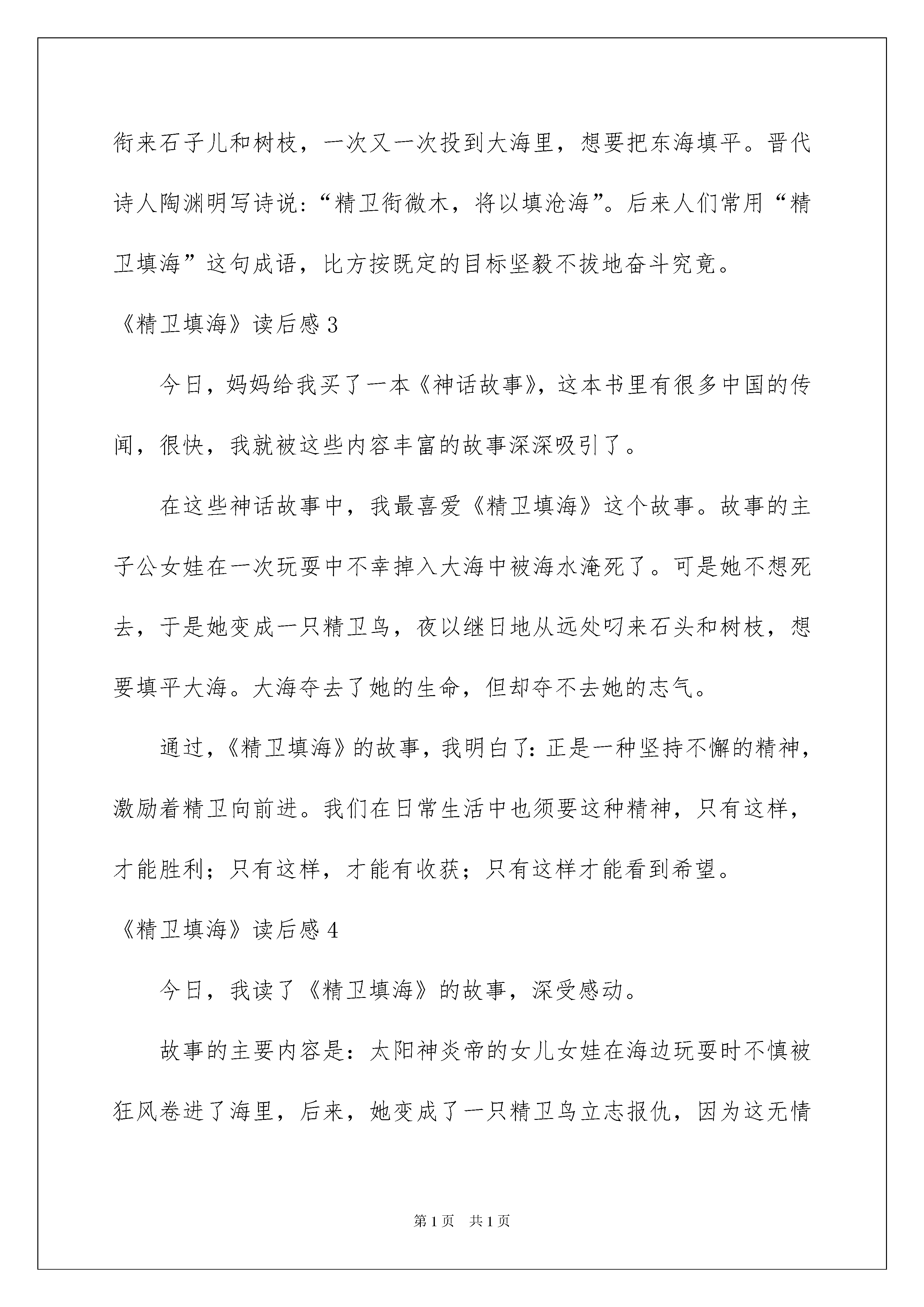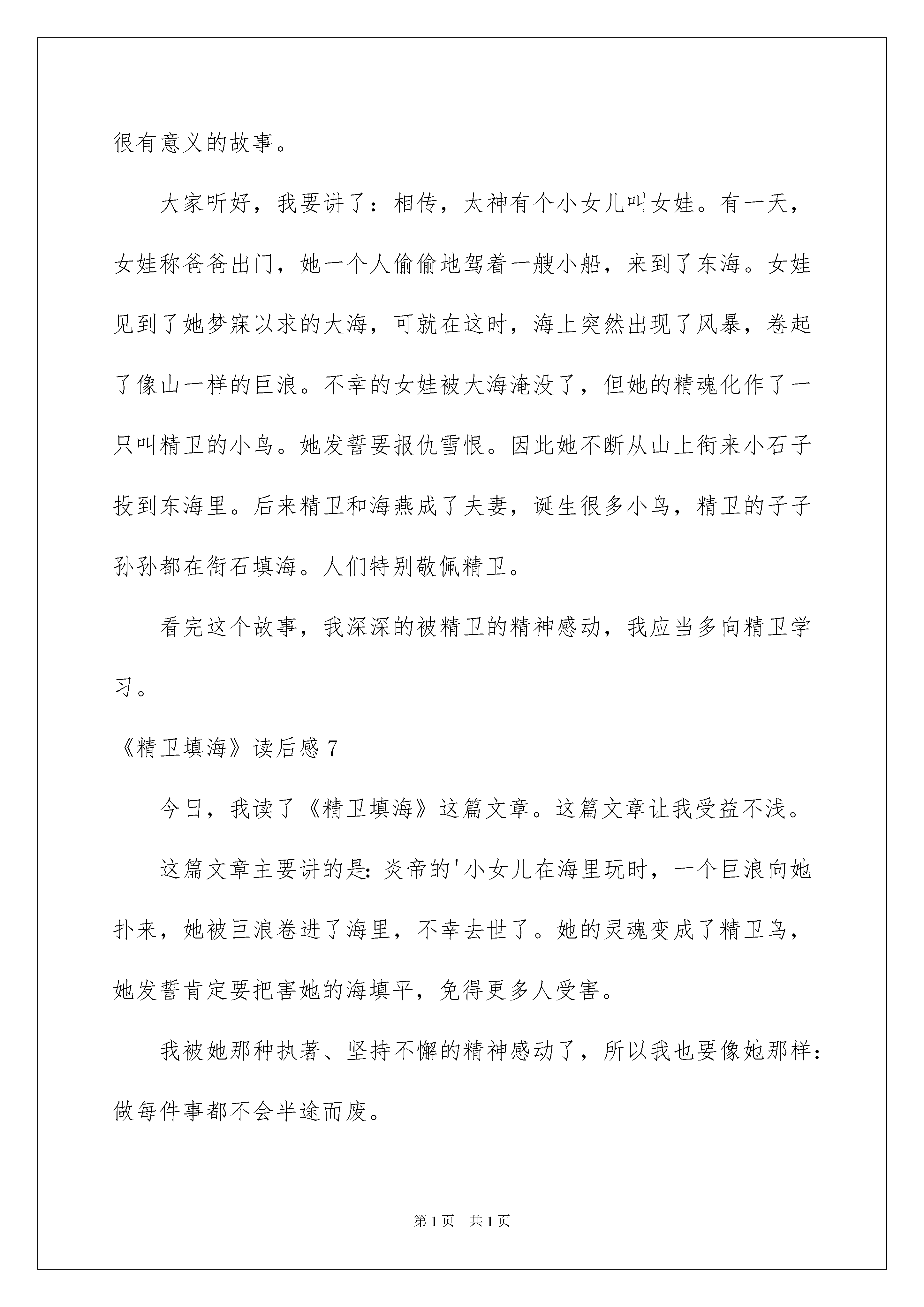 2022《精卫填海》读后感《精卫填海》读后感当品尝完一本著作后,信任你肯定有许多值得共享的收获,不妨坐下来好好写写读后感吧。那么我们该怎么去写读后感呢?下面是我为大家收集的《精卫填海》读后感,希望能够帮助到大家。《精卫填海》读后感1今日我读了《精卫填海》这个故事,原来女娃化身的名叫精卫的小鸟,它立志要以坚韧不拔的毅力把大海填平。人们忘不了这片土地是精卫填海而来的,就教化自己的子子孙孙、世世代代都要爱鸟护鸟。学习精卫精神,学习精卫只要认定一个目标,坚持不懈的去做,就会有成就。《精卫填海》读后感2精卫填海是《山海经》记叙的一则故事,说的是中国上古时期一种叫精卫的鸟努力填平大海。《山海经》记述有一种鸟。它的名字叫精卫。精卫原来是炎帝宠爱的女儿,有一天她去东海玩,可是突然风暴袭来,她死了。女娃变成了鸟,名字就叫作“精卫鸟”。精卫鸟去西山衔来石子儿和树枝,一次又一次投到大海里,想要把东海填平。晋代诗人陶渊明写诗说:“精卫衔微木,将以填沧海”。后来人们常用“精卫填海”这句成语,比方按既定的目标坚毅不拔地奋斗究竟。《精卫填海》读后感3今日,妈妈给我买了一本《神话故事》,这本书里有很多中国的传闻,很快,我就被这些内容丰富的故事深深吸引了。在这些神话故事中,我最喜爱《精卫填海》这个故事。故事的主子公女娃在一次玩耍中不幸掉入大海中被海水淹死了。可是她不想死去,于是她变成一只精卫鸟,夜以继日地从远处叼来石头和树枝,想要填平大海。大海夺去了她的生命,但却夺不去她的志气。通过,《精卫填海》的故事,我明白了:正是一种坚持不懈的精神,激励着精卫向前进。我们在日常生活中也须要这种精神,只有这样,才能胜利;只有这样,才能有收获;只有这样才能看到希望。《精卫填海》读后感4今日,我读了《精卫填海》的故事,深受感动。故事的主要内容是:太阳神炎帝的女儿女娃在海边玩耍时不慎被狂风卷进了海里,后来,她变成了一只精卫鸟立志报仇,因为这无情的海夺去了她的生命,他便发誓填平大海。于是,她每天从西山衔来枯枝或石子扔进大海里,日复一日,年复一年。虽然海没有填平,可是他这种不畏艰险、矢志不移的精神是多么的宏大啊!读了这个故事我深受启发:我们在生活中一旦选定了奋斗目标,就应当像精卫一样,下定决心,奋斗究竟!《精卫填海》读后感5《精卫填海》这个故事我们从小就起先听了,讲了炎帝的女儿驾着小船去东海游玩,被恶浪弄翻了船,夺去了年轻的生命。可她的灵魂不屈服,变成了一只小鸟叫精卫。精卫每天去西山捡一些石子、小木棍扔进东海,确定把大海填平。虽然大海讪笑它的弱小,但它却持之以恒。从这个故事中,我知道了,精卫每天虽然很辛苦,但它不觉得累,它的精神值得我学习。在学习中也一样,每天坚持认仔细真地听讲,写作业,不贪玩,就会把学习搞好。做别的事情也要一心一意,才会做好。假如不这样,就不会胜利。我肯定要做个坚持学习的好孩子。《精卫填海》读后感6今日,我来和大家共享一个名叫《精卫填海》的故事,这是一个很有意义的故事。大家听好,我要讲了:相传,太神有个小女儿叫女娃。有一天,女娃称爸爸出门,她一个人偷偷地驾着一艘小船,来到了东海。女娃见到了她梦寐以求的大海,可就在这时,海上突然出现了风暴,卷起了像山一样的巨浪。不幸的女娃被大海淹没了,但她的精魂化作了一只叫精卫的小鸟。她发誓要报仇雪恨。因此她不断从山上衔来小石子投到东海里。后来精卫和海燕成了夫妻,诞生很多小鸟,精卫的子子孙孙都在衔石填海。人们特别敬佩精卫。看完这个故事,我深深的被精卫的精神感动,我应当多向精卫学习。《精卫填海》读后感7今日,我读了《精卫填海》这篇文章。这篇文章让我受益不浅。这篇文章主要讲的是:炎帝的'小女儿在海里玩时,一个巨浪向她扑来,她被巨浪卷进了海里,不幸去世了。她的灵魂变成了精卫鸟,她发誓肯定要把害她的海填平,免得更多人受害。我被她那种执著、坚持不懈的精神感动了,所以我也要像她那样:做每件事都不会半途而废。《精卫填海》读后感8虽然精卫在浩瀚的大海面前是那样的渺小,但它却有着宏大的幻想——填平大海。为了实现这个幻想,它每一天从西山衔树枝、石子,投掷到东海。路途遥远,历尽千辛万苦。而小小的树枝、石子对于大海来说却是沧海一粟。但它毫不气馁,坚忍不拔的精神是珍贵的。凭借这种精神,它必需能够实现自我的幻想。可是转念又想,那得到何年何月啊?假如它能换个角度思索,我想胜利的几率会更大。比如,它能够开动脑筋,研制出来新型的填海机器。虽然思索的时间比较长,可是详细操作的时间就会短。如此看来,做任何事情,都不要死脑筋,一味蛮干,应当依据实际情景巧干。《精卫填海》读后感9读了《精卫填海》这个故事后,我被精卫填海的