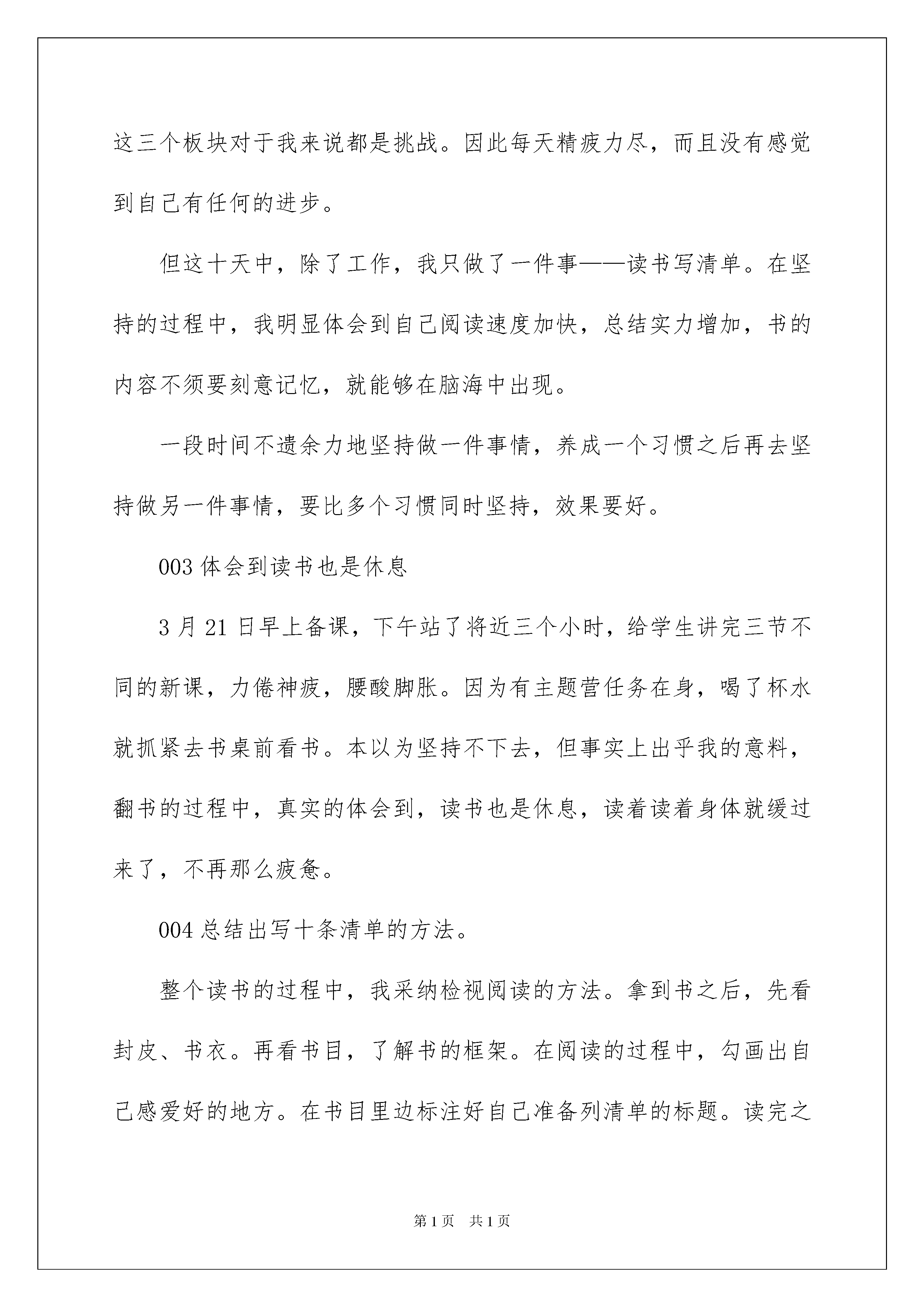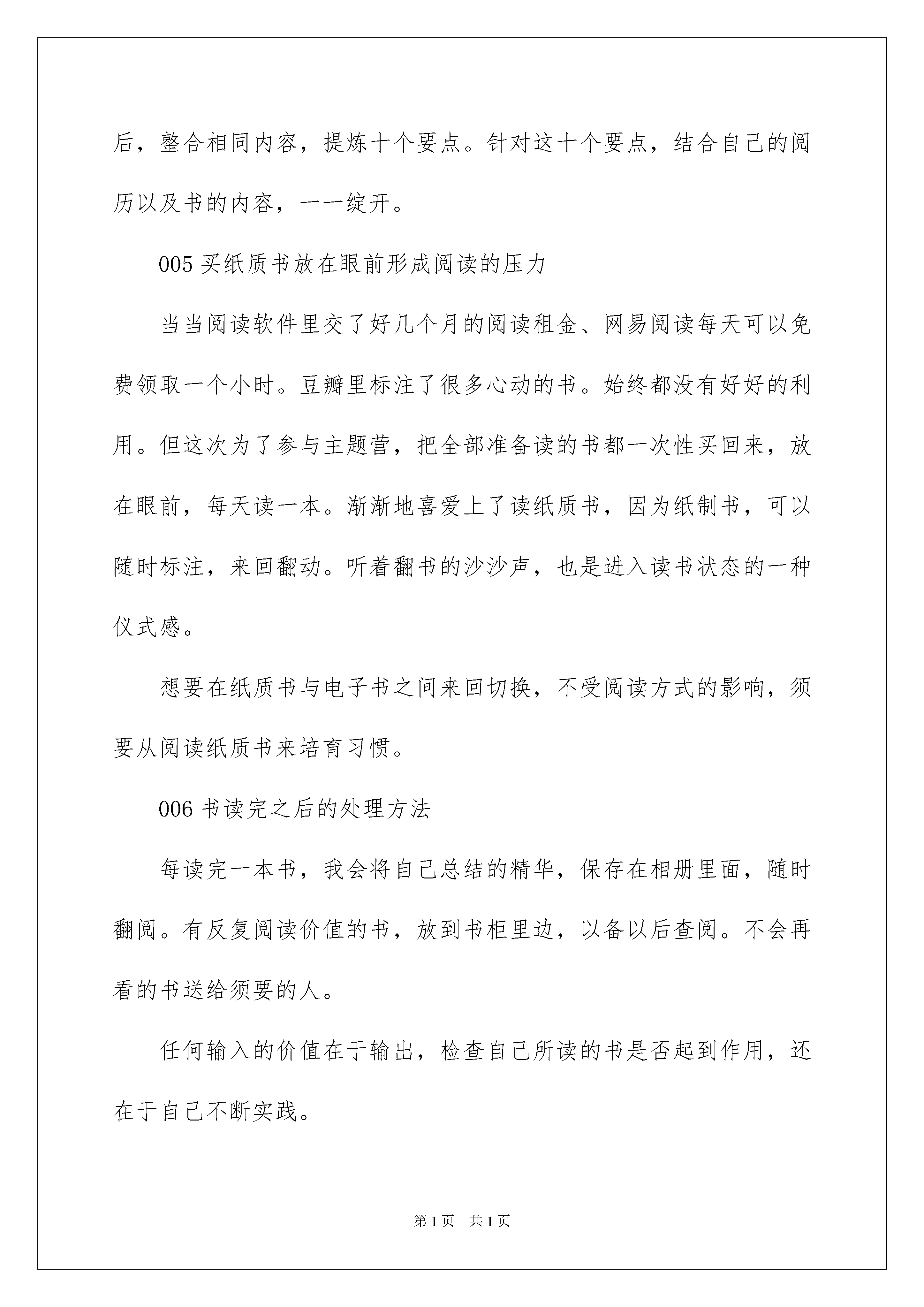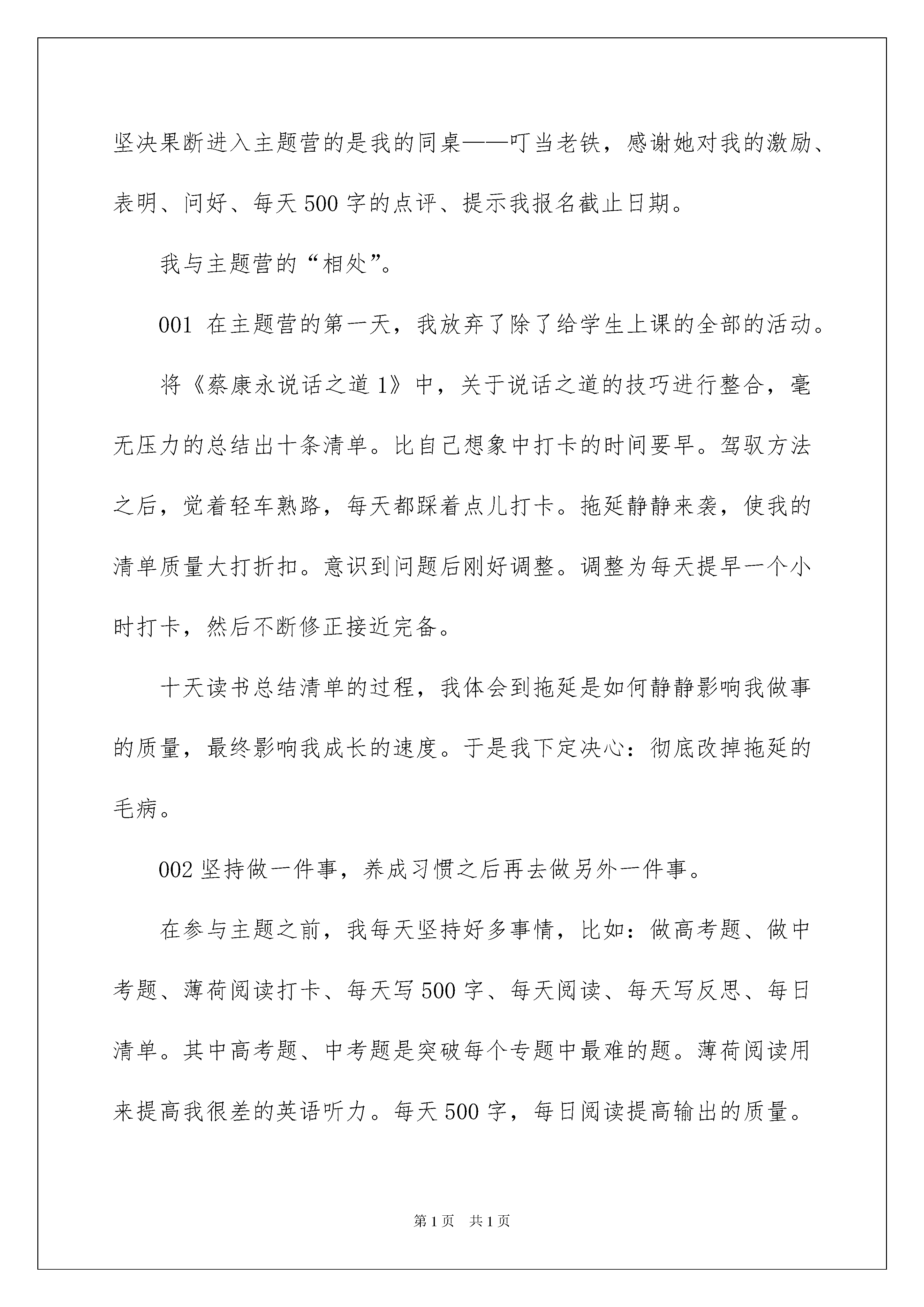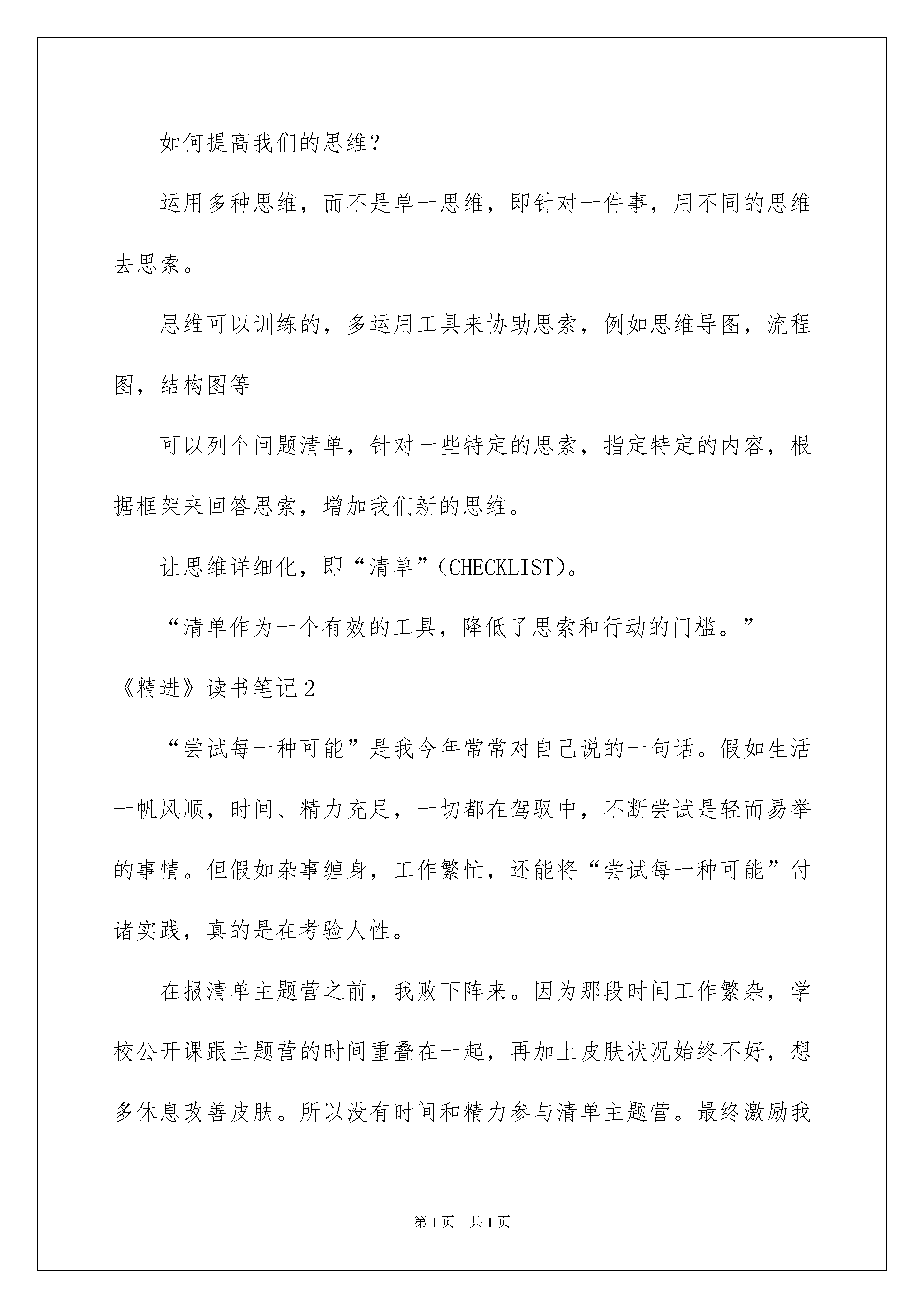 2022《精进》读书笔记《精进》读书笔记仔细品尝一部名著后,想必你有不少可以共享的东西,何不静下心来写写读书笔记呢?那么如何写读书笔记才能更有感染力呢?下面是我为大家整理的《精进》读书笔记,仅供参考,大家一起来看看吧。《精进》读书笔记1《精进》作者:采铜,作家。20xx年推出作品《精进:如何成为一个很厉害的人》。同年进入亚马逊中国年度新锐作家榜。采铜老师从7个人生的侧面来教我们如何提升自己,分别是:时间、选择、行动、学习、思维、才能和胜利。我将根据这个依次做我的读书笔记的共享。接下来我将共享笔记:思维:“简化,是清楚思索的前提”我们不行能同时运用两种思维,一次运用一种才不会造成冲突,例如运用发散性思维的时候就不应当参杂归纳思维。思维我认为是一种思索的习惯,一种路径。如何提高我们的思维?运用多种思维,而不是单一思维,即针对一件事,用不同的思维去思索。思维可以训练的,多运用工具来协助思索,例如思维导图,流程图,结构图等可以列个问题清单,针对一些特定的思索,指定特定的内容,根据框架来回答思索,增加我们新的思维。让思维详细化,即“清单”(CHECKLIST)。“清单作为一个有效的工具,降低了思索和行动的门槛。”《精进》读书笔记2“尝试每一种可能”是我今年常常对自己说的一句话。假如生活一帆风顺,时间、精力充足,一切都在驾驭中,不断尝试是轻而易举的事情。但假如杂事缠身,工作繁忙,还能将“尝试每一种可能”付诸实践,真的是在考验人性。在报清单主题营之前,我败下阵来。因为那段时间工作繁杂,学校公开课跟主题营的时间重叠在一起,再加上皮肤状况始终不好,想多休息改善皮肤。所以没有时间和精力参与清单主题营。最终激励我坚决果断进入主题营的是我的同桌——叮当老铁,感谢她对我的激励、表明、问好、每天500字的点评、提示我报名截止日期。我与主题营的“相处”。001在主题营的第一天,我放弃了除了给学生上课的全部的活动。将《蔡康永说话之道1》中,关于说话之道的技巧进行整合,毫无压力的总结出十条清单。比自己想象中打卡的时间要早。驾驭方法之后,觉着轻车熟路,每天都踩着点儿打卡。拖延静静来袭,使我的清单质量大打折扣。意识到问题后刚好调整。调整为每天提早一个小时打卡,然后不断修正接近完备。十天读书总结清单的过程,我体会到拖延是如何静静影响我做事的质量,最终影响我成长的速度。于是我下定决心:彻底改掉拖延的毛病。002坚持做一件事,养成习惯之后再去做另外一件事。在参与主题之前,我每天坚持好多事情,比如:做高考题、做中考题、薄荷阅读打卡、每天写500字、每天阅读、每天写反思、每日清单。其中高考题、中考题是突破每个专题中最难的题。薄荷阅读用来提高我很差的英语听力。每天500字,每日阅读提高输出的质量。这三个板块对于我来说都是挑战。因此每天精疲力尽,而且没有感觉到自己有任何的进步。但这十天中,除了工作,我只做了一件事——读书写清单。在坚持的过程中,我明显体会到自己阅读速度加快,总结实力增加,书的内容不须要刻意记忆,就能够在脑海中出现。一段时间不遗余力地坚持做一件事情,养成一个习惯之后再去坚持做另一件事情,要比多个习惯同时坚持,效果要好。003体会到读书也是休息3月21日早上备课,下午站了将近三个小时,给学生讲完三节不同的新课,力倦神疲,腰酸脚胀。因为有主题营任务在身,喝了杯水就抓紧去书桌前看书。本以为坚持不下去,但事实上出乎我的意料,翻书的过程中,真实的体会到,读书也是休息,读着读着身体就缓过来了,不再那么疲惫。004总结出写十条清单的方法。整个读书的过程中,我采纳检视阅读的方法。拿到书之后,先看封皮、书衣。再看书目,了解书的框架。在阅读的过程中,勾画出自己感爱好的地方。在书目里边标注好自己准备列清单的标题。读完之后,整合相同内容,提炼十个要点。针对这十个要点,结合自己的阅历以及书的内容,一一绽开。005买纸质书放在眼前形成阅读的压力当当阅读软件里交了好几个月的阅读租金、网易阅读每天可以免费领取一个小时。豆瓣里标注了很多心动的书。始终都没有好好的利用。但这次为了参与主题营,把全部准备读的书都一次性买回来,放在眼前,每天读一本。渐渐地喜爱上了读纸质书,因为纸制书,可以随时标注,来回翻动。听着翻书的沙沙声,也是进入读书状态的一种仪式感。想要在纸质书与电子书之间来回切换,不受阅读方式的影响,须要从阅读纸质书来培育习惯。006书读完之后的处理方法每读完一本书,我会将自己总结的精华,保存在相册里面,随时翻阅。有反复阅读价值的书,放到书柜里边,以备以后查阅。不会再看的书送给须要的人。任何输入的价值在于输出,检查自己所读的书是否起到作用,还