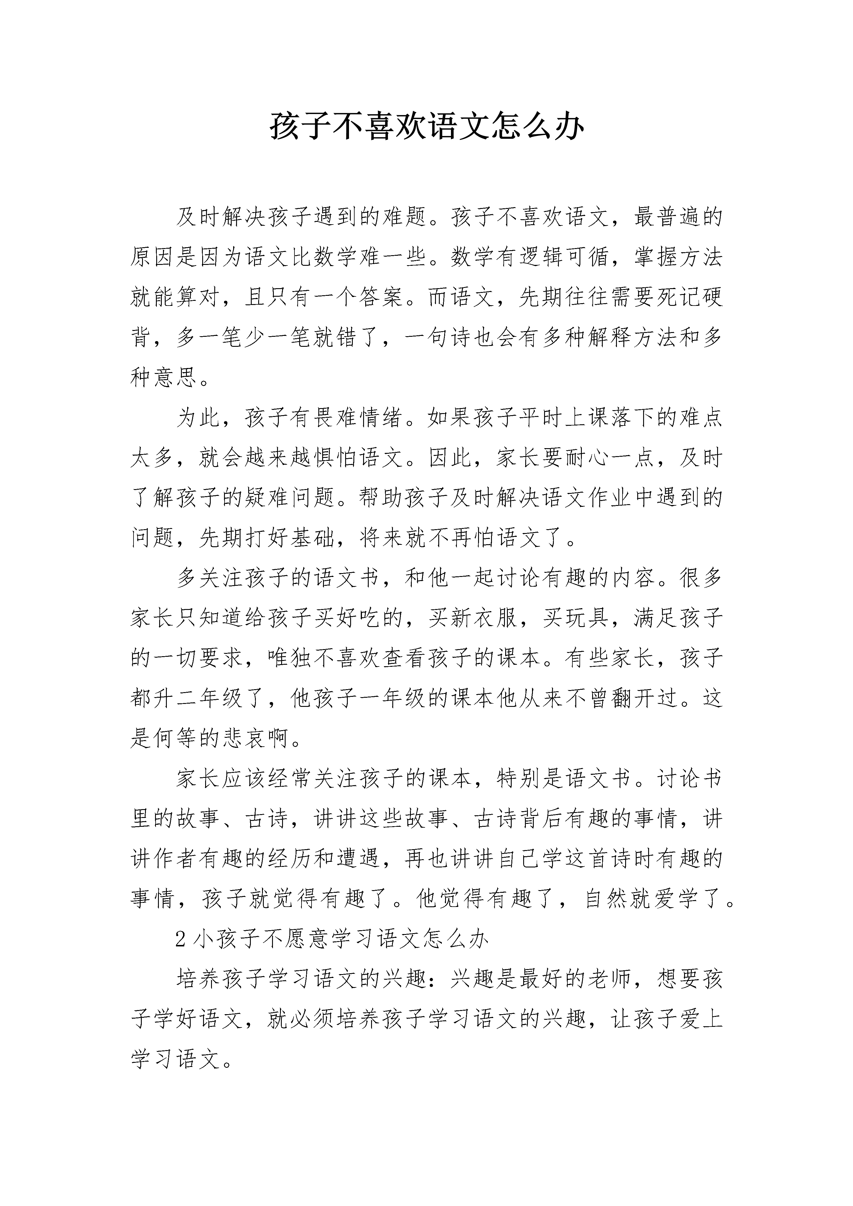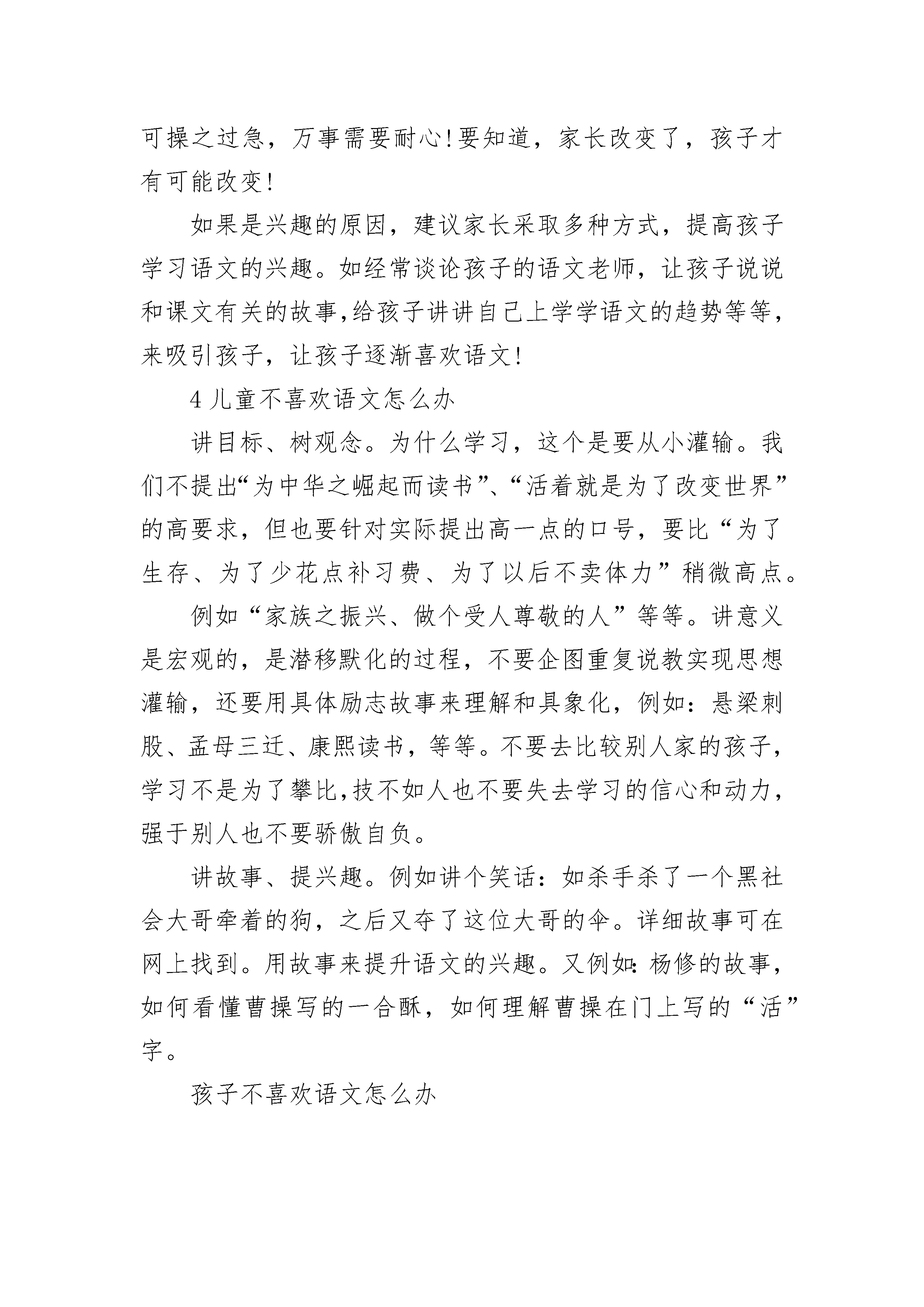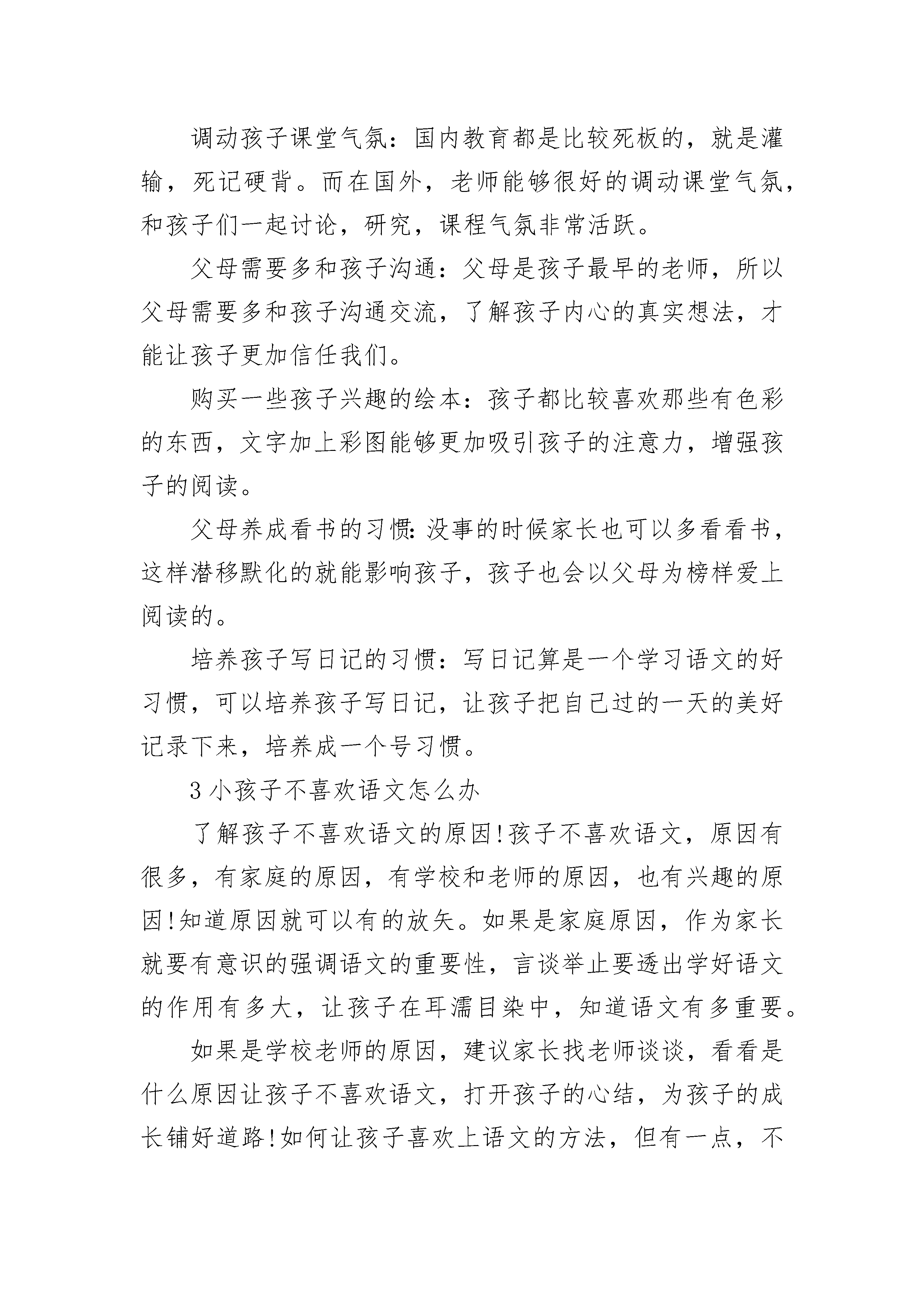 孩子不喜欢语文怎么办及时解决孩子遇到的难题。孩子不喜欢语文,最普遍的原因是因为语文比数学难一些。数学有逻辑可循,掌握方法就能算对,且只有一个答案。而语文,先期往往需要死记硬背,多一笔少一笔就错了,一句诗也会有多种解释方法和多种意思。为此,孩子有畏难情绪。如果孩子平时上课落下的难点太多,就会越来越惧怕语文。因此,家长要耐心一点,及时了解孩子的疑难问题。帮助孩子及时解决语文作业中遇到的问题,先期打好基础,将来就不再怕语文了。多关注孩子的语文书,和他一起讨论有趣的内容。很多家长只知道给孩子买好吃的,买新衣服,买玩具,满足孩子的一切要求,唯独不喜欢查看孩子的课本。有些家长,孩子都升二年级了,他孩子一年级的课本他从来不曾翻开过。这是何等的悲哀啊。家长应该经常关注孩子的课本,特别是语文书。讨论书里的故事、古诗,讲讲这些故事、古诗背后有趣的事情,讲讲作者有趣的经历和遭遇,再也讲讲自己学这首诗时有趣的事情,孩子就觉得有趣了。他觉得有趣了,自然就爱学了。2小孩子不愿意学习语文怎么办培养孩子学习语文的兴趣:兴趣是最好的老师,想要孩子学好语文,就必须培养孩子学习语文的兴趣,让孩子爱上学习语文。调动孩子课堂气氛:国内教育都是比较死板的,就是灌输,死记硬背。而在国外,老师能够很好的调动课堂气氛,和孩子们一起讨论,研究,课程气氛非常活跃。父母需要多和孩子沟通:父母是孩子最早的老师,所以父母需要多和孩子沟通交流,了解孩子内心的真实想法,才能让孩子更加信任我们。购买一些孩子兴趣的绘本:孩子都比较喜欢那些有色彩的东西,文字加上彩图能够更加吸引孩子的注意力,增强孩子的阅读。父母养成看书的习惯:没事的时候家长也可以多看看书,这样潜移默化的就能影响孩子,孩子也会以父母为榜样爱上阅读的。培养孩子写日记的习惯:写日记算是一个学习语文的好习惯,可以培养孩子写日记,让孩子把自己过的一天的美好记录下来,培养成一个号习惯。3小孩子不喜欢语文怎么办了解孩子不喜欢语文的原因!孩子不喜欢语文,原因有很多,有家庭的原因,有学校和老师的原因,也有兴趣的原因!知道原因就可以有的放矢。如果是家庭原因,作为家长就要有意识的强调语文的重要性,言谈举止要透出学好语文的作用有多大,让孩子在耳濡目染中,知道语文有多重要。如果是学校老师的原因,建议家长找老师谈谈,看看是什么原因让孩子不喜欢语文,打开孩子的心结,为孩子的成长铺好道路!如何让孩子喜欢上语文的方法,但有一点,不可操之过急,万事需要耐心!要知道,家长改变了,孩子才有可能改变!如果是兴趣的原因,建议家长采取多种方式,提高孩子学习语文的兴趣。如经常谈论孩子的语文老师,让孩子说说和课文有关的故事,给孩子讲讲自己上学学语文的趋势等等,来吸引孩子,让孩子逐渐喜欢语文!4儿童不喜欢语文怎么办讲目标、树观念。为什么学习,这个是要从小灌输。我们不提出“为中华之崛起而读书”、“活着就是为了改变世界”的高要求,但也要针对实际提出高一点的口号,要比“为了生存、为了少花点补习费、为了以后不卖体力”稍微高点。例如“家族之振兴、做个受人尊敬的人”等等。讲意义是宏观的,是潜移默化的过程,不要企图重复说教实现思想灌输,还要用具体励志故事来理解和具象化,例如:悬梁刺股、孟母三迁、康熙读书,等等。不要去比较别人家的孩子,学习不是为了攀比,技不如人也不要失去学习的信心和动力,强于别人也不要骄傲自负。讲故事、提兴趣。例如讲个笑话:如杀手杀了一个黑社会大哥牵着的狗,之后又夺了这位大哥的伞。详细故事可在网上找到。用故事来提升语文的兴趣。又例如:杨修的故事,如何看懂曹操写的一合酥,如何理解曹操在门上写的“活”字。孩子不喜欢语文怎么办