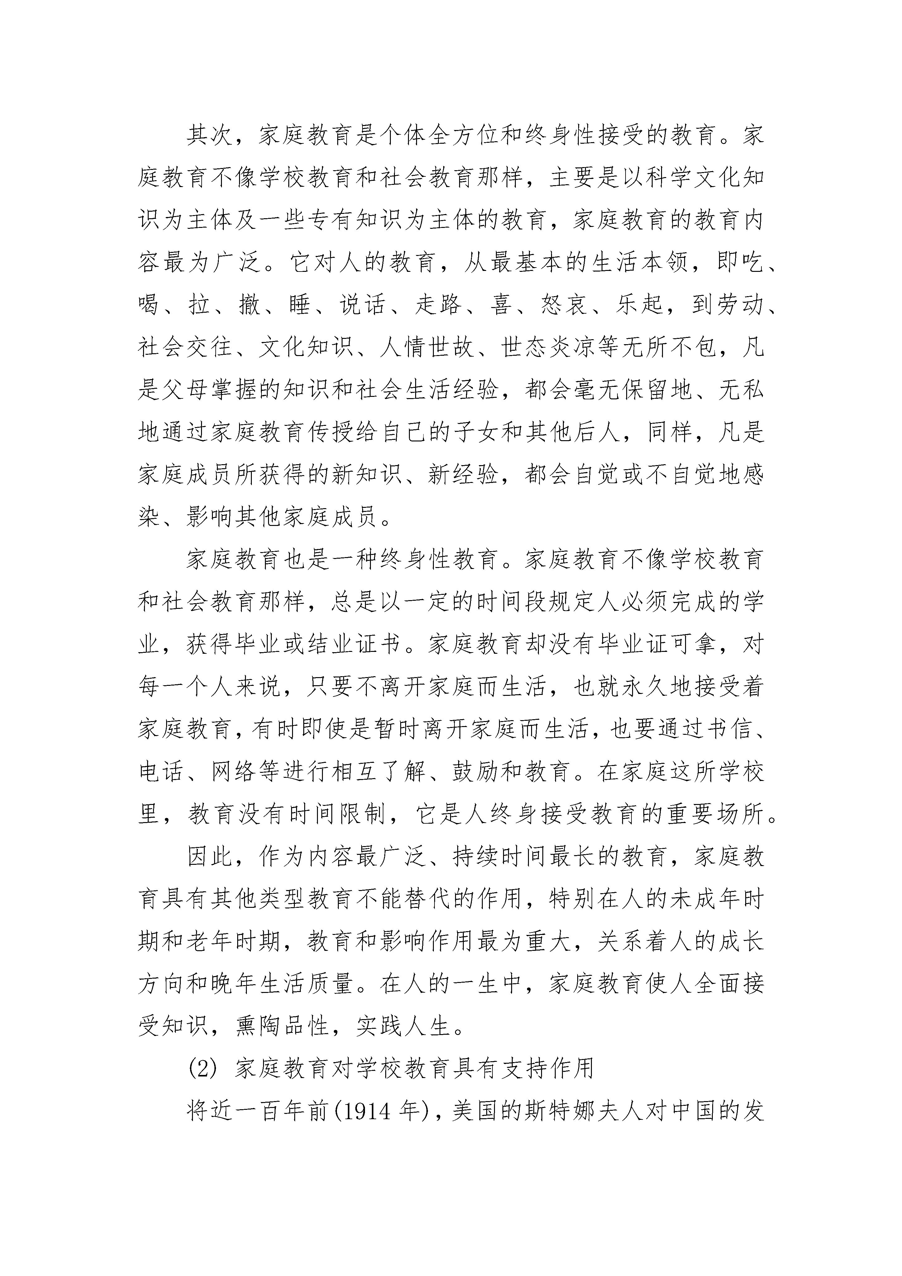 家庭教育的作用首先,家庭教育是个体成长的奠基性教育。家庭教育是人接受的最初教育,它开始于胎教。随着现代科学的发展,胎教的科学性逐步被证实,胎教在现代科学的基础上逐步得到了完善。新生婴儿降临到人世间,最早接受的也是家庭教育。在每个人的人生之初,他都是作为一个对外界一无所知、基本生存能力极低的生物个体离开母体来到世间的。刚刚出生的婴儿,仅仅是一个还缺乏社会性的头脑,像一张白纸一样无知的生命个体,之后逐步学会走路、说话,初识人间烟火,逐步懂得了一些最基本的生活知识和社会规范,并参与范围越来越广的社会活动和社会交往,不断认识社会。这些是人生发展中最基础的知识。可以说家庭是人们接受教育的摇篮,也是人们接受教育的第一个场所。在教育这个由浅人深的过程中,对于任何人来说,最浅显、最基础的教育都是通过家庭、特别是通过父母来完成的。如果没有家庭教育所传授的那些基本知识、本领作基础,人是很难顺利接受学校教育和社会教育的。家庭教会在教育体系中,就象是建高楼大厦的基石,基石打得好,才能建优质的高楼大厦,家庭教育搞好了,才能为培养优秀人才打好基础。这种伴之以深厚浓烈的亲情之爱和细致人微的体贴方式而进行的家庭基础性教育,是其他任何教育形式所不能取代的,它对任何人一生的成长都起着奠基作用。其次,家庭教育是个体全方位和终身性接受的教育。家庭教育不像学校教育和社会教育那样,主要是以科学文化知识为主体及一些专有知识为主体的教育,家庭教育的教育内容最为广泛。它对人的教育,从最基本的生活本领,即吃、喝、拉、撤、睡、说话、走路、喜、怒哀、乐起,到劳动、社会交往、文化知识、人情世故、世态炎凉等无所不包,凡是父母掌握的知识和社会生活经验,都会毫无保留地、无私地通过家庭教育传授给自己的子女和其他后人,同样,凡是家庭成员所获得的新知识、新经验,都会自觉或不自觉地感染、影响其他家庭成员。家庭教育也是一种终身性教育。家庭教育不像学校教育和社会教育那样,总是以一定的时间段规定人必须完成的学业,获得毕业或结业证书。家庭教育却没有毕业证可拿,对每一个人来说,只要不离开家庭而生活,也就永久地接受着家庭教育,有时即使是暂时离开家庭而生活,也要通过书信、电话、网络等进行相互了解、鼓励和教育。在家庭这所学校里,教育没有时间限制,它是人终身接受教育的重要场所。因此,作为内容最广泛、持续时间最长的教育,家庭教育具有其他类型教育不能替代的作用,特别在人的未成年时期和老年时期,教育和影响作用最为重大,关系着人的成长方向和晚年生活质量。在人的一生中,家庭教育使人全面接受知识,熏陶品性,实践人生。(2)家庭教育对学校教育具有支持作用将近一百年前(1914年),美国的斯特娜夫人对中国的发展有一个大胆的猜想:“中国是最早开设学校的国家,尽管如此,他们的文明落后了。这是由于他们没有认识到妇女教育的必要性。过去,中国人认为妇女不应受教育,因此,中国大多数妇女是文盲,也不进行家庭教育。受不到母亲教育的国民绝不能成为伟大的国民。”现在看来,这个美国人的猜想并不周全,因为中国妇女受教育的状况已经不断改善。不过,这个猜想有一点是符合事实的:中国家长普遍愿意把孩子成长的责任推卸给学校。如果孩子的成长出现了问题,家长愿意批评学校的教师,"一般不愿意承认那是家长自己的失误。前苏联教育家苏霍姆林斯基说过:“家庭要有高度的教育学素养,如果没有整个社会首先是家庭的教育学素养,那么不管教师付出多大的努力,都收不到满意的效果。”可见学校教育的成败,与家庭教育的支持密切相关。良好的家庭教育为一个人的发展奠定了良好的基础,意味着个体做好了接受外部环境影响的准备。倘若家庭教育未打下良好的基础,个体就会变成“不可教”、“不好教”的人。20世纪70年代,美国开展教育改革运动,实行教育补偿政策,就是为了改善劳工阶层家庭的不利处境,促进劳工阶层家庭子女在学校教育中能取得学业成功。(3)家庭教育对社会文明发展具有重要的促进作用19世纪德国学前教育家福禄培尔曾说:“国家的命运与其说操在掌权者手中,倒不如说是掌握在母亲的手中。”家庭教育对社会的现实利益有重要影响。家庭教育是整个教育大厦的基石,其一但失败意味着一个人可能一辈子无法从动物人向社会人转变,这可能会致使一个人变成无用之物甚至变成危害社会的角色。家庭教育的缺失将导致人格缺陷、性情偏颇,对自己的行为没有更改判断能力,对自己的情绪冲动没有自我控制能力,于是做出害人害己、害社会的犯罪行为。反之,家庭教育的成功,则可奠定一个人走向成功的人格基础,使之不但能够自立于世,而且能为社会做出自己的贡献。家庭是社会的细胞,是社会文化的载体之一,家庭教育对社会文明的传承和发展有着重要影响。从本质而言,人类文明的终极价值无不是引领人类精神世界日趋丰盈,促使人类灵魂获得安宁和永生。家庭教育关注的核心便是人的灵魂的奠基和塑