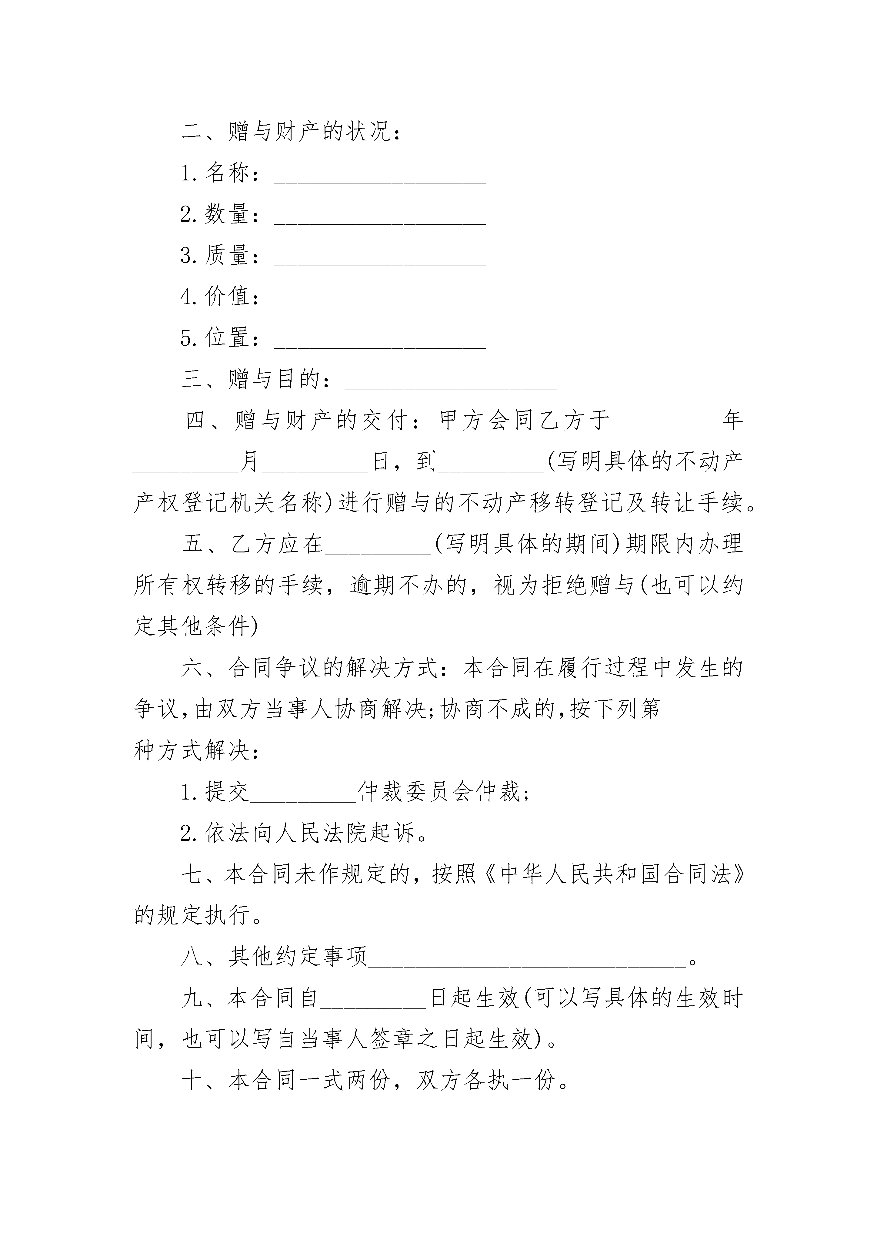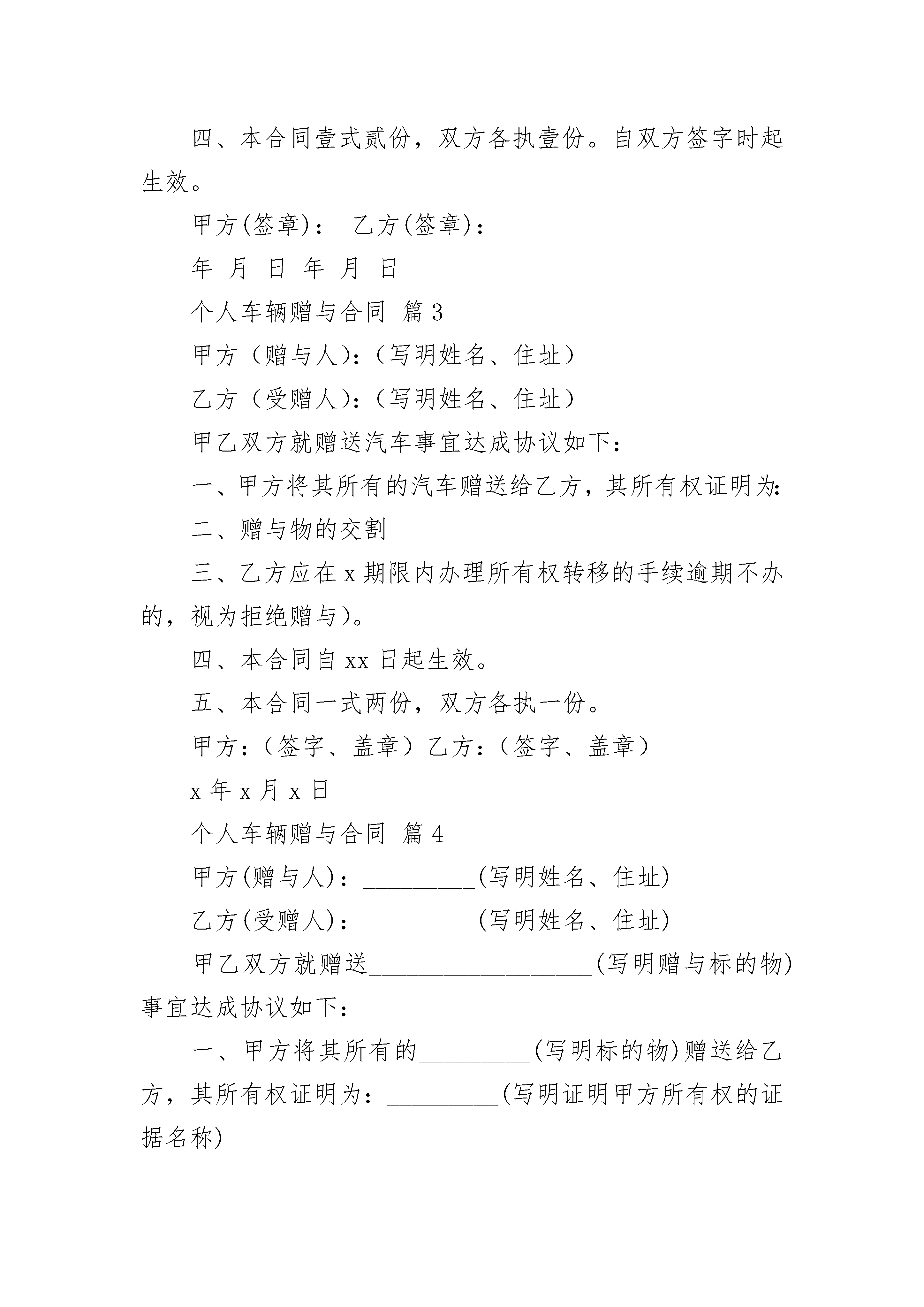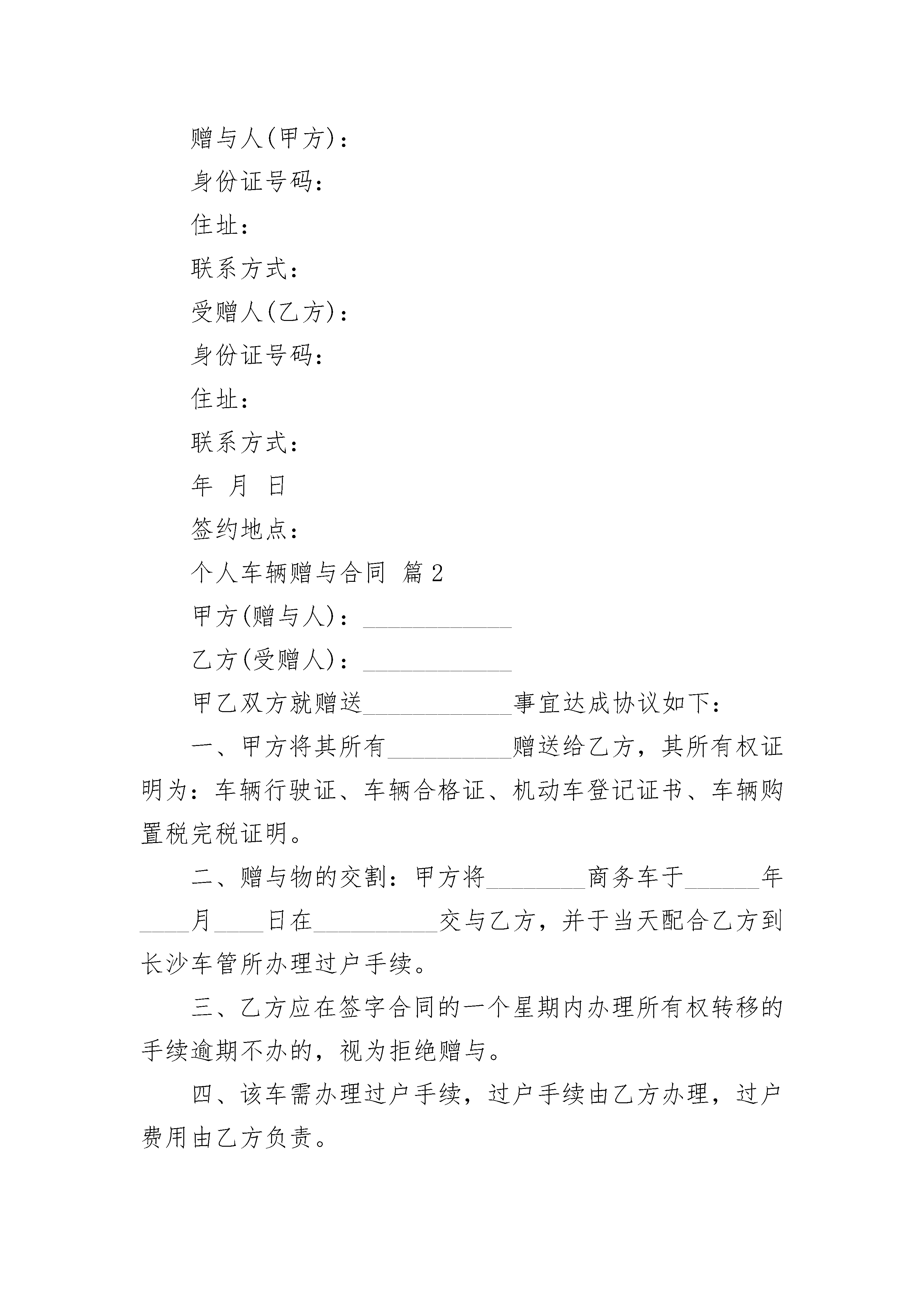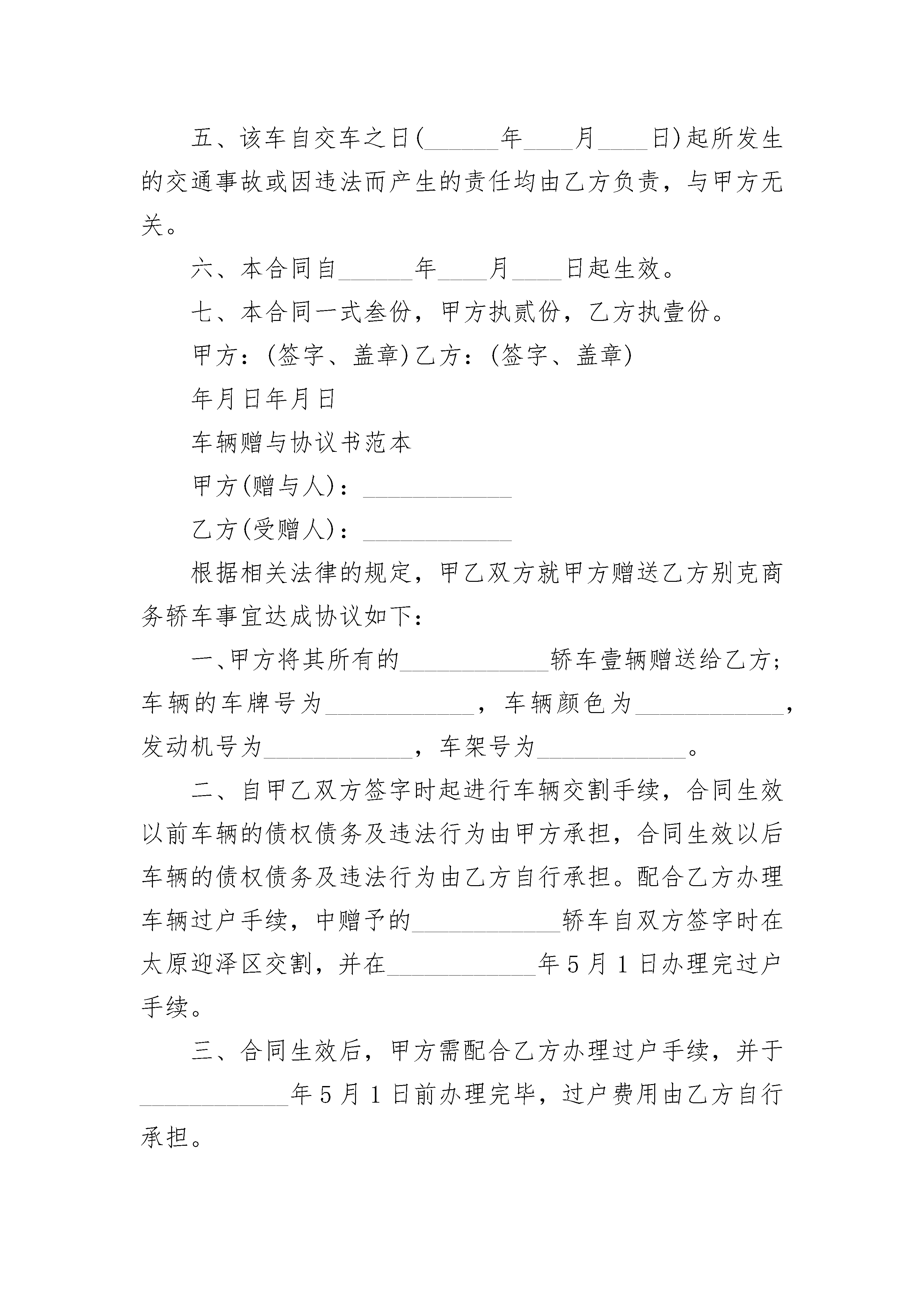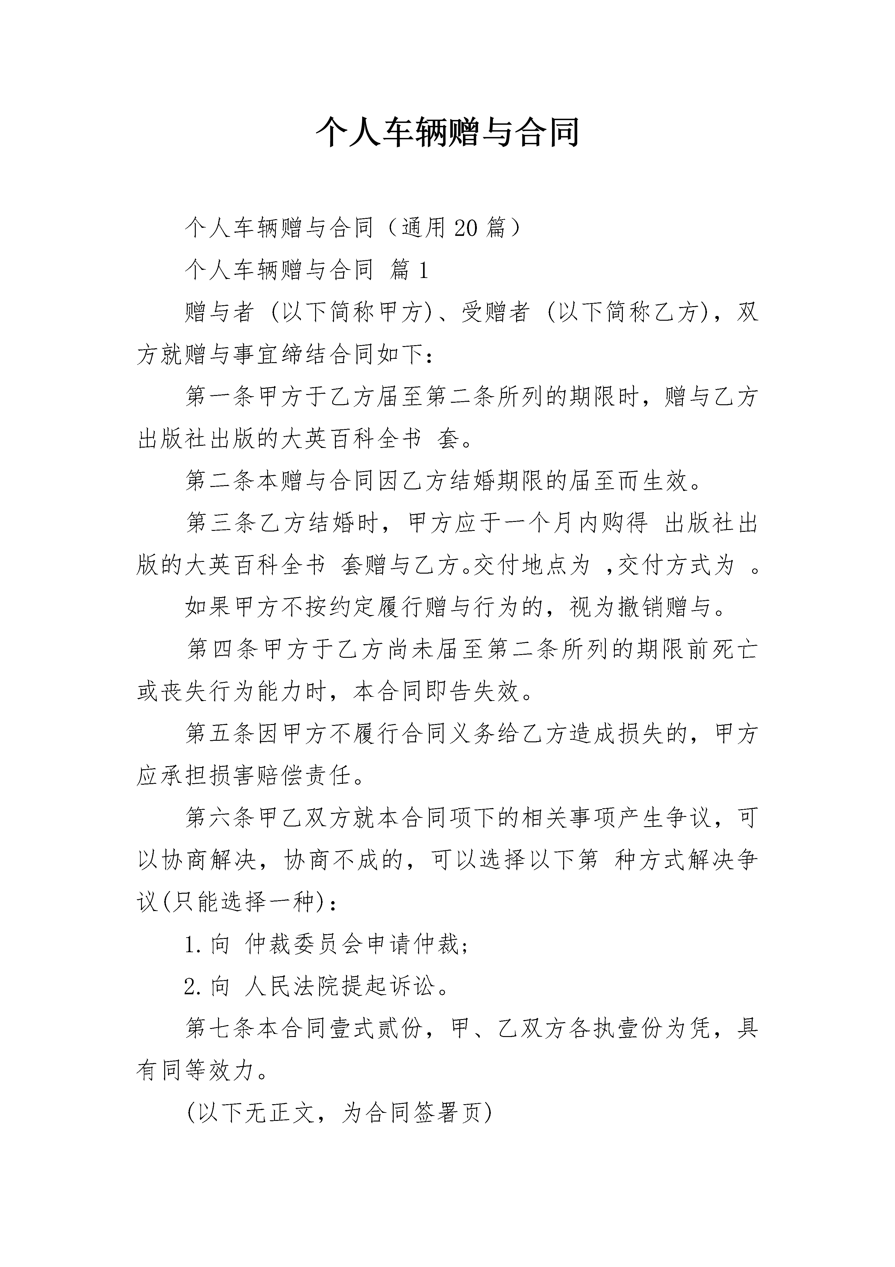个人车辆赠与合同个人车辆赠与合同(通用20篇)个人车辆赠与合同篇1赠与者(以下简称甲方)、受赠者(以下简称乙方),双方就赠与事宜缔结合同如下:第一条甲方于乙方届至第二条所列的期限时,赠与乙方出版社出版的大英百科全书套。第二条本赠与合同因乙方结婚期限的届至而生效。第三条乙方结婚时,甲方应于一个月内购得出版社出版的大英百科全书套赠与乙方。交付地点为,交付方式为。如果甲方不按约定履行赠与行为的,视为撤销赠与。第四条甲方于乙方尚未届至第二条所列的期限前死亡或丧失行为能力时,本合同即告失效。第五条因甲方不履行合同义务给乙方造成损失的,甲方应承担损害赔偿责任。第六条甲乙双方就本合同项下的相关事项产生争议,可以协商解决,协商不成的,可以选择以下第种方式解决争议(只能选择一种):1.向仲裁委员会申请仲裁;2.向人民法院提起诉讼。第七条本合同壹式贰份,甲、乙双方各执壹份为凭,具有同等效力。(以下无正文,为合同签署页)赠与人(甲方):身份证号码:住址:联系方式:受赠人(乙方):身份证号码:住址:联系方式:年月日签约地点:个人车辆赠与合同篇2甲方(赠与人):____________乙方(受赠人):____________甲乙双方就赠送____________事宜达成协议如下:一、甲方将其所有__________赠送给乙方,其所有权证明为:车辆行驶证、车辆合格证、机动车登记证书、车辆购置税完税证明。二、赠与物的交割:甲方将________商务车于______年____月____日在__________交与乙方,并于当天配合乙方到长沙车管所办理过户手续。三、乙方应在签字合同的一个星期内办理所有权转移的手续逾期不办的,视为拒绝赠与。四、该车需办理过户手续,过户手续由乙方办理,过户费用由乙方负责。五、该车自交车之日(______年____月____日)起所发生的交通事故或因违法而产生的责任均由乙方负责,与甲方无关。六、本合同自______年____月____日起生效。七、本合同一式叁份,甲方执贰份,乙方执壹份。甲方:(签字、盖章)乙方:(签字、盖章)年月日年月日车辆赠与协议书范本甲方(赠与人):____________乙方(受赠人):____________根据相关法律的规定,甲乙双方就甲方赠送乙方别克商务轿车事宜达成协议如下:一、甲方将其所有的____________轿车壹辆赠送给乙方;车辆的车牌号为____________,车辆颜色为____________,发动机号为____________,车架号为____________。二、自甲乙双方签字时起进行车辆交割手续,合同生效以前车辆的债权债务及违法行为由甲方承担,合同生效以后车辆的债权债务及违法行为由乙方自行承担。配合乙方办理车辆过户手续,中赠予的____________轿车自双方签字时在太原迎泽区交割,并在____________年5月1日办理完过户手续。三、合同生效后,甲方需配合乙方办理过户手续,并于____________年5月1日前办理完毕,过户费用由乙方自行承担。四、本合同壹式贰份,双方各执壹份。自双方签字时起生效。甲方(签章):乙方(签章):年月日年月日个人车辆赠与合同篇3甲方(赠与人):(写明姓名、住址)乙方(受赠人):(写明姓名、住址)甲乙双方就赠送汽车事宜达成协议如下:一、甲方将其所有的汽车赠送给乙方,其所有权证明为:二、赠与物的交割三、乙方应在x期限内办理所有权转移的手续逾期不办的,视为拒绝赠与)。四、本合同自xx日起生效。五、本合同一式两份,双方各执一份。甲方:(签字、盖章)乙方:(签字、盖章)x年x月x日个人车辆赠与合同篇4甲方(赠与人):_________(写明姓名、住址)乙方(受赠人):_________(写明姓名、住址)甲乙双方就赠送__________________(写明赠与标的物)事宜达成协议如下:一、甲方将其所有的_________(写明标的物)赠送给乙方,其所有权证明为:_________(写明证明甲方所有权的证据名称)二、赠与财产的状况:1.名称:__________________2.数量:__________________3.质量:__________________4.价值:__________________5.位置:__________________三、赠与目的:__________________四、赠与财产的交付:甲方会同乙方于_________年_________月_________日,到_________(写明具体的不动产产权登记机关名称)进行赠与的不动产移转登记及转让手续。五、乙方应在_________(写明具体的期间)期限内办理所有权转移的手续,逾期不办的,视为拒绝赠与(也可以约定其他条件)六、合同争议的解决方式:本合同在履行过程