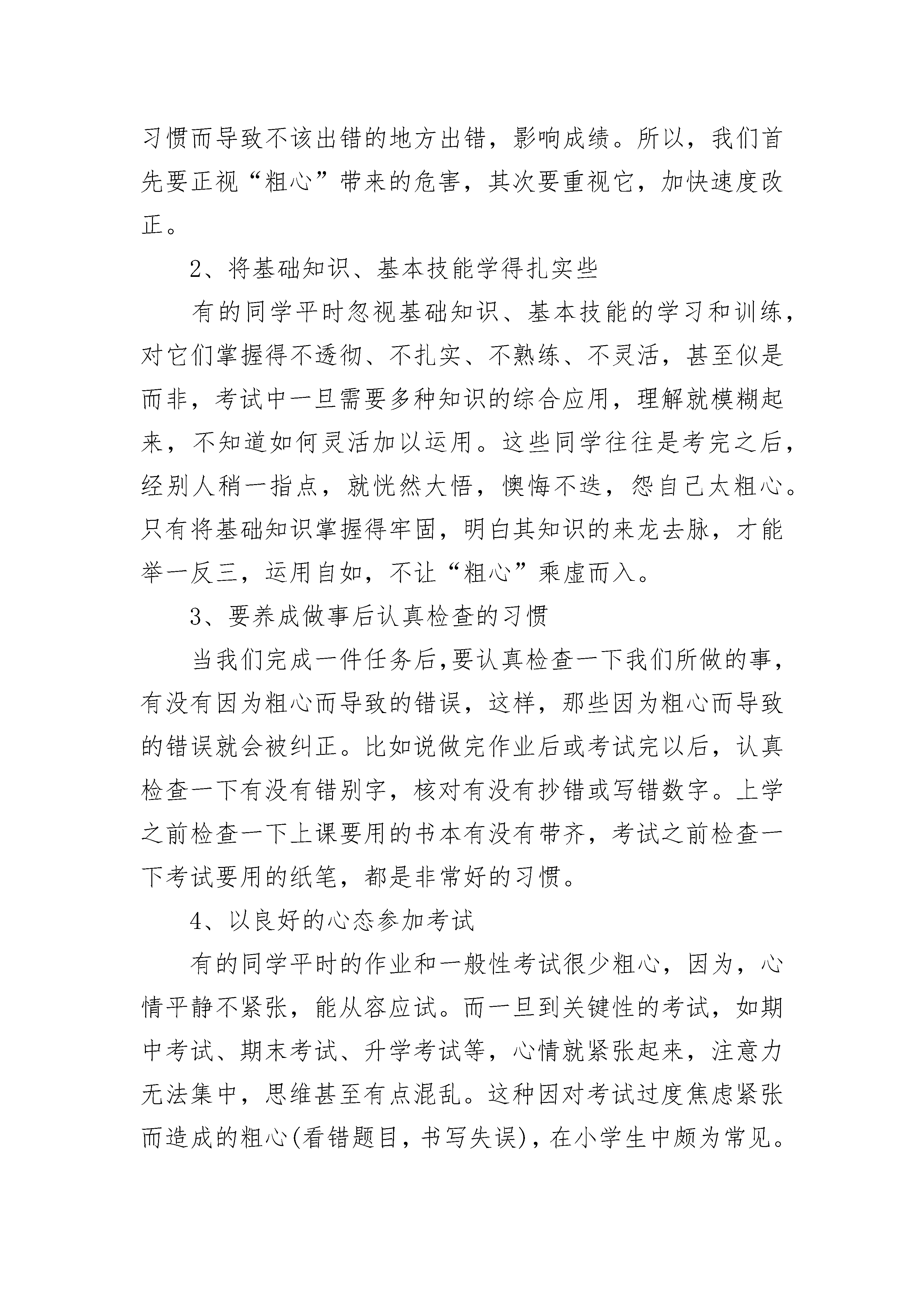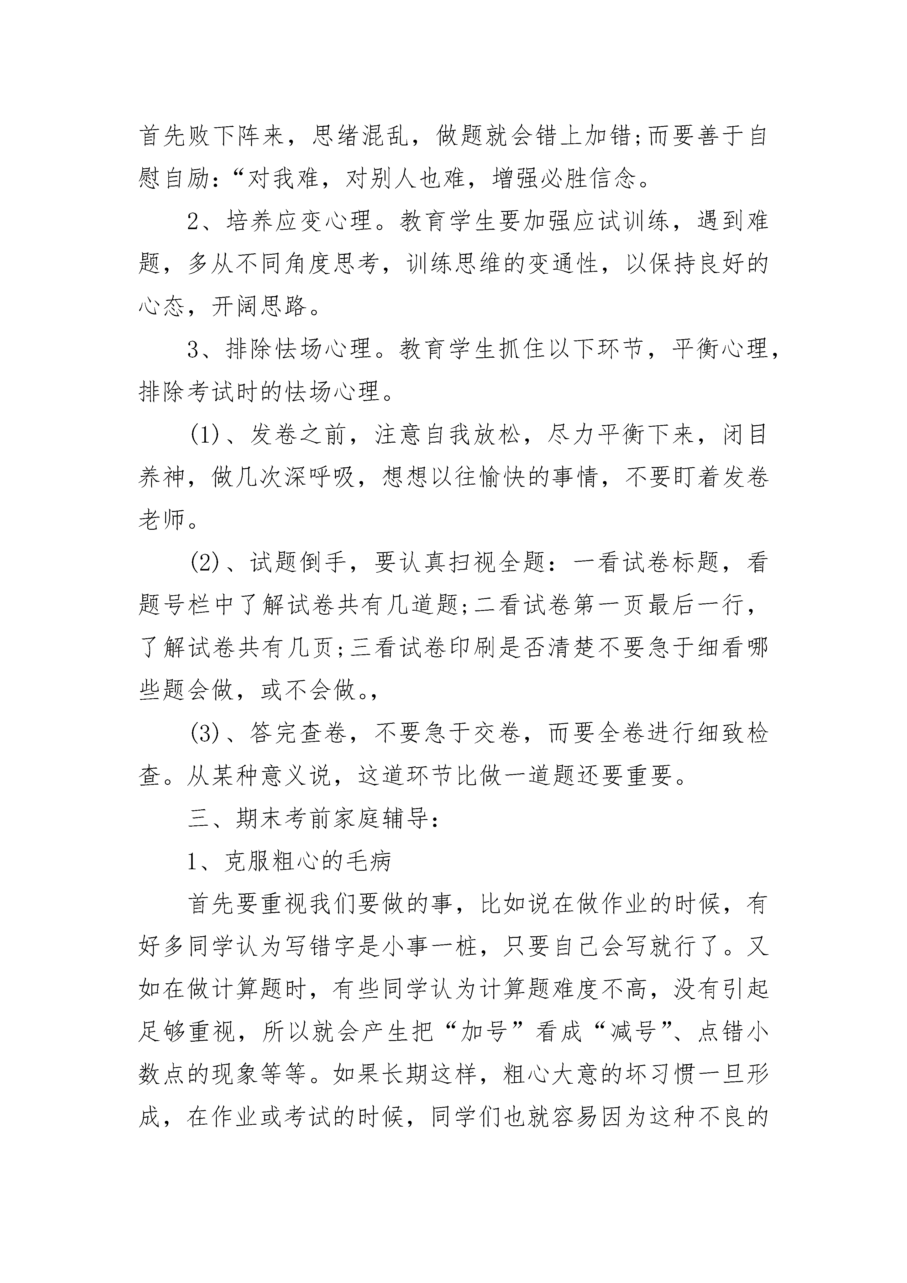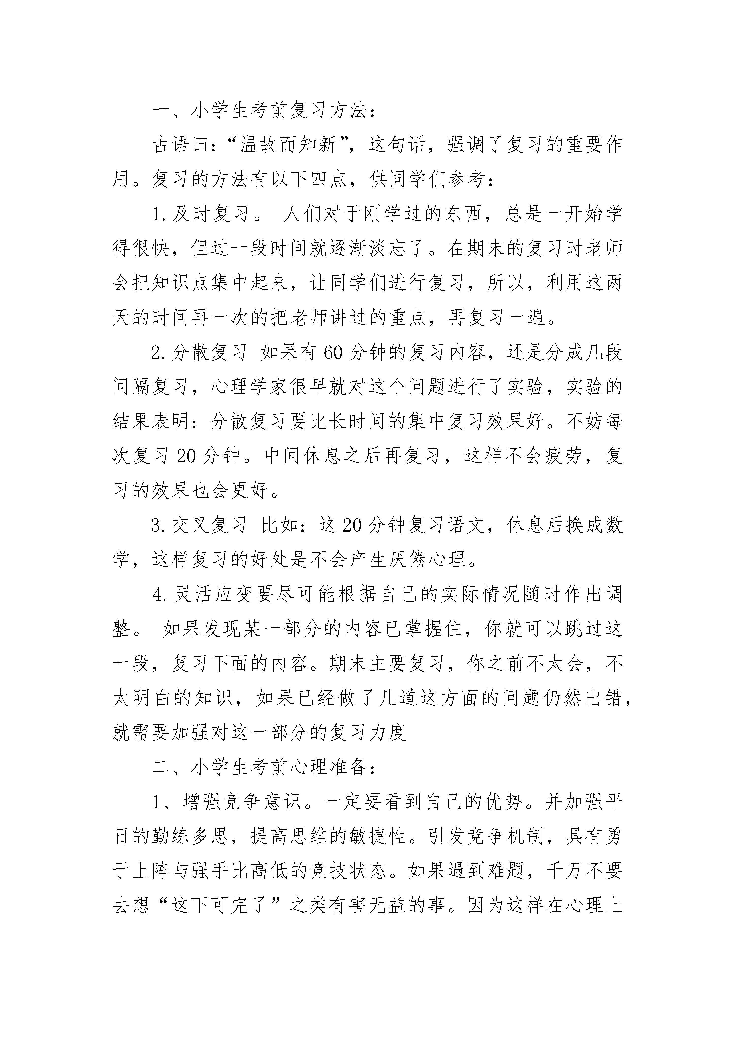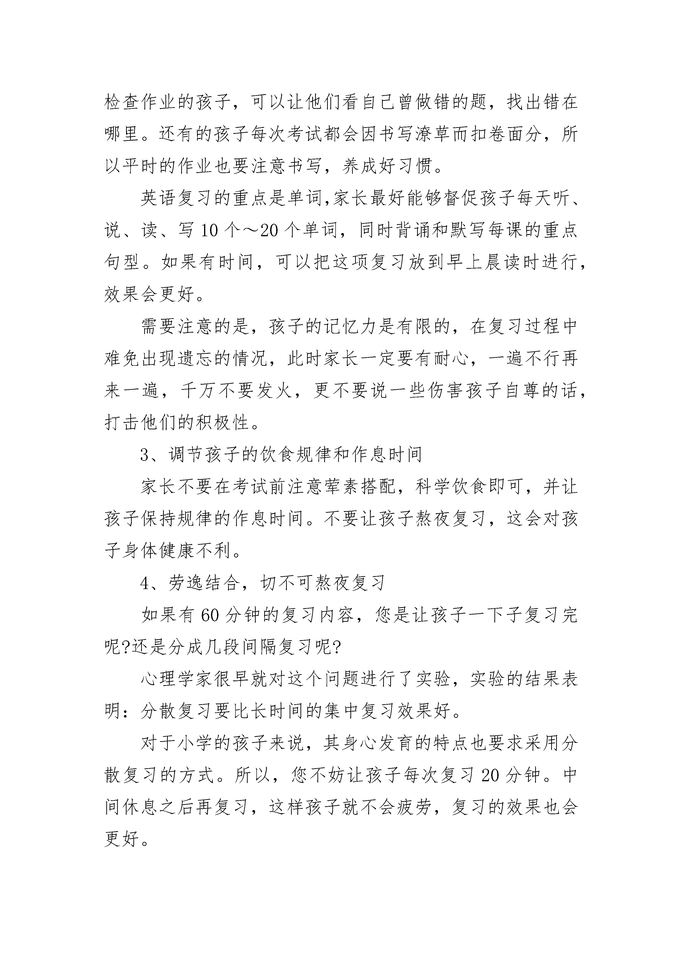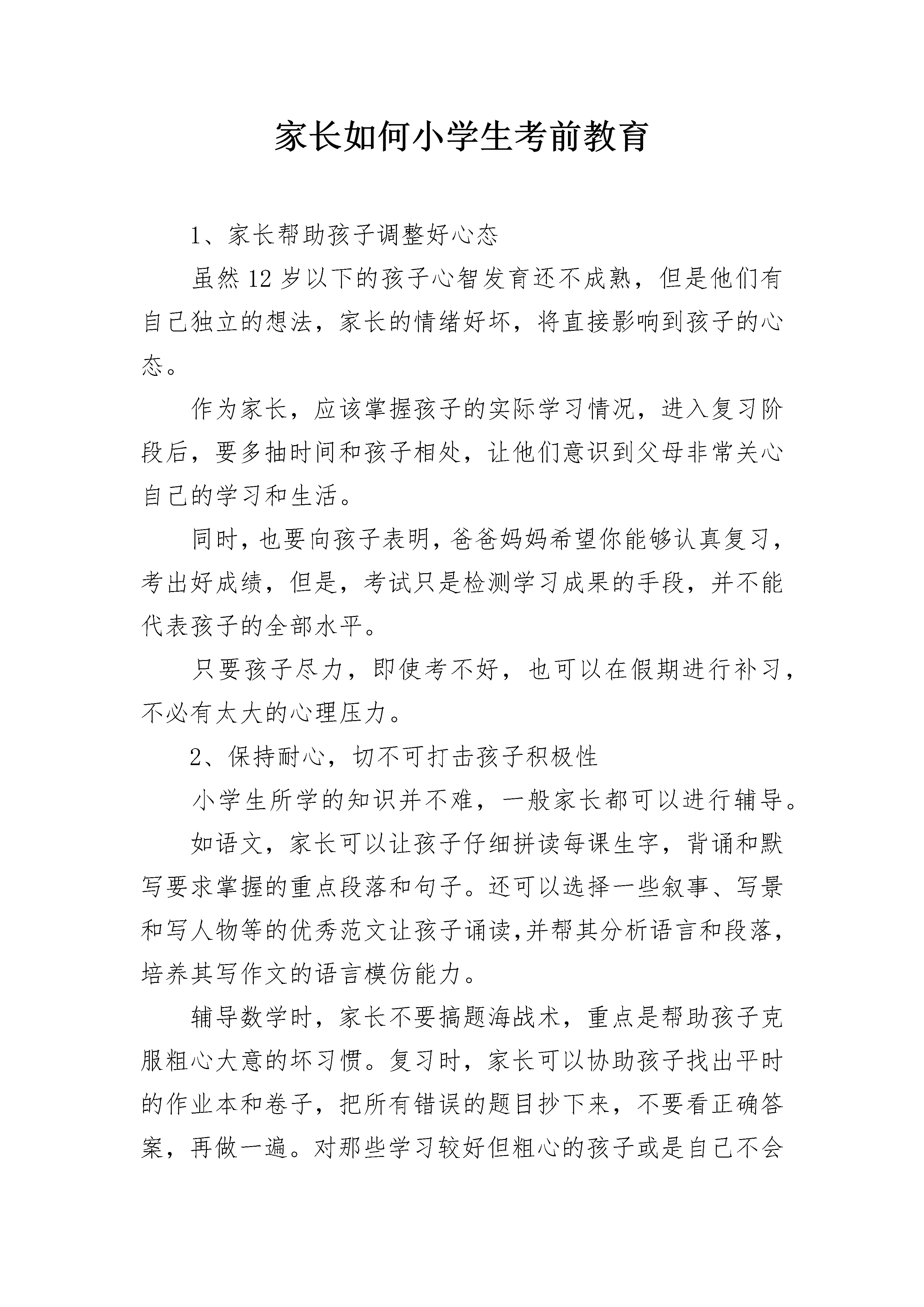 家长如何小学生考前教育1、家长帮助孩子调整好心态虽然12岁以下的孩子心智发育还不成熟,但是他们有自己独立的想法,家长的情绪好坏,将直接影响到孩子的心态。作为家长,应该掌握孩子的实际学习情况,进入复习阶段后,要多抽时间和孩子相处,让他们意识到父母非常关心自己的学习和生活。同时,也要向孩子表明,爸爸妈妈希望你能够认真复习,考出好成绩,但是,考试只是检测学习成果的手段,并不能代表孩子的全部水平。只要孩子尽力,即使考不好,也可以在假期进行补习,不必有太大的心理压力。2、保持耐心,切不可打击孩子积极性小学生所学的知识并不难,一般家长都可以进行辅导。如语文,家长可以让孩子仔细拼读每课生字,背诵和默写要求掌握的重点段落和句子。还可以选择一些叙事、写景和写人物等的优秀范文让孩子诵读,并帮其分析语言和段落,培养其写作文的语言模仿能力。辅导数学时,家长不要搞题海战术,重点是帮助孩子克服粗心大意的坏习惯。复习时,家长可以协助孩子找出平时的作业本和卷子,把所有错误的题目抄下来,不要看正确答案,再做一遍。对那些学习较好但粗心的孩子或是自己不会检查作业的孩子,可以让他们看自己曾做错的题,找出错在哪里。还有的孩子每次考试都会因书写潦草而扣卷面分,所以平时的作业也要注意书写,养成好习惯。英语复习的重点是单词,家长最好能够督促孩子每天听、说、读、写10个~20个单词,同时背诵和默写每课的重点句型。如果有时间,可以把这项复习放到早上晨读时进行,效果会更好。需要注意的是,孩子的记忆力是有限的,在复习过程中难免出现遗忘的情况,此时家长一定要有耐心,一遍不行再来一遍,千万不要发火,更不要说一些伤害孩子自尊的话,打击他们的积极性。3、调节孩子的饮食规律和作息时间家长不要在考试前注意荤素搭配,科学饮食即可,并让孩子保持规律的作息时间。不要让孩子熬夜复习,这会对孩子身体健康不利。4、劳逸结合,切不可熬夜复习如果有60分钟的复习内容,您是让孩子一下子复习完呢?还是分成几段间隔复习呢?心理学家很早就对这个问题进行了实验,实验的结果表明:分散复习要比长时间的集中复习效果好。对于小学的孩子来说,其身心发育的特点也要求采用分散复习的方式。所以,您不妨让孩子每次复习20分钟。中间休息之后再复习,这样孩子就不会疲劳,复习的效果也会更好。一、小学生考前复习方法:古语曰:“温故而知新”,这句话,强调了复习的重要作用。复习的方法有以下四点,供同学们参考:1.及时复习。人们对于刚学过的东西,总是一开始学得很快,但过一段时间就逐渐淡忘了。在期末的复习时老师会把知识点集中起来,让同学们进行复习,所以,利用这两天的时间再一次的把老师讲过的重点,再复习一遍。2.分散复习如果有60分钟的复习内容,还是分成几段间隔复习,心理学家很早就对这个问题进行了实验,实验的结果表明:分散复习要比长时间的集中复习效果好。不妨每次复习20分钟。中间休息之后再复习,这样不会疲劳,复习的效果也会更好。3.交叉复习比如:这20分钟复习语文,休息后换成数学,这样复习的好处是不会产生厌倦心理。4.灵活应变要尽可能根据自己的实际情况随时作出调整。如果发现某一部分的内容已掌握住,你就可以跳过这一段,复习下面的内容。期末主要复习,你之前不太会,不太明白的知识,如果已经做了几道这方面的问题仍然出错,就需要加强对这一部分的复习力度二、小学生考前心理准备:1、增强竞争意识。一定要看到自己的优势。并加强平日的勤练多思,提高思维的敏捷性。引发竞争机制,具有勇于上阵与强手比高低的竞技状态。如果遇到难题,千万不要去想“这下可完了”之类有害无益的事。因为这样在心理上首先败下阵来,思绪混乱,做题就会错上加错;而要善于自慰自励:“对我难,对别人也难,增强必胜信念。2、培养应变心理。教育学生要加强应试训练,遇到难题,多从不同角度思考,训练思维的变通性,以保持良好的心态,开阔思路。3、排除怯场心理。教育学生抓住以下环节,平衡心理,排除考试时的怯场心理。(1)、发卷之前,注意自我放松,尽力平衡下来,闭目养神,做几次深呼吸,想想以往愉快的事情,不要盯着发卷老师。(2)、试题倒手,要认真扫视全题:一看试卷标题,看题号栏中了解试卷共有几道题;二看试卷第一页最后一行,了解试卷共有几页;三看试卷印刷是否清楚不要急于细看哪些题会做,或不会做。,(3)、答完查卷,不要急于交卷,而要全卷进行细致检查。从某种意义说,这道环节比做一道题还要重要。三、期末考前家庭辅导:1、克服粗心的毛病首先要重视我们要做的事,比如说在做作业的时候,有好多同学认为写错字是小事一桩,只要自己会写就行了。又如在做计算题时,有些同学认为计算题难度不高,没有引起足够重视,所以就会产生把“加号”看成“减号”、点错小数点的现象等等。如果长期这样,粗心大意的坏习惯一旦形成,在作业或考试的时候,同学们也就容易因为这