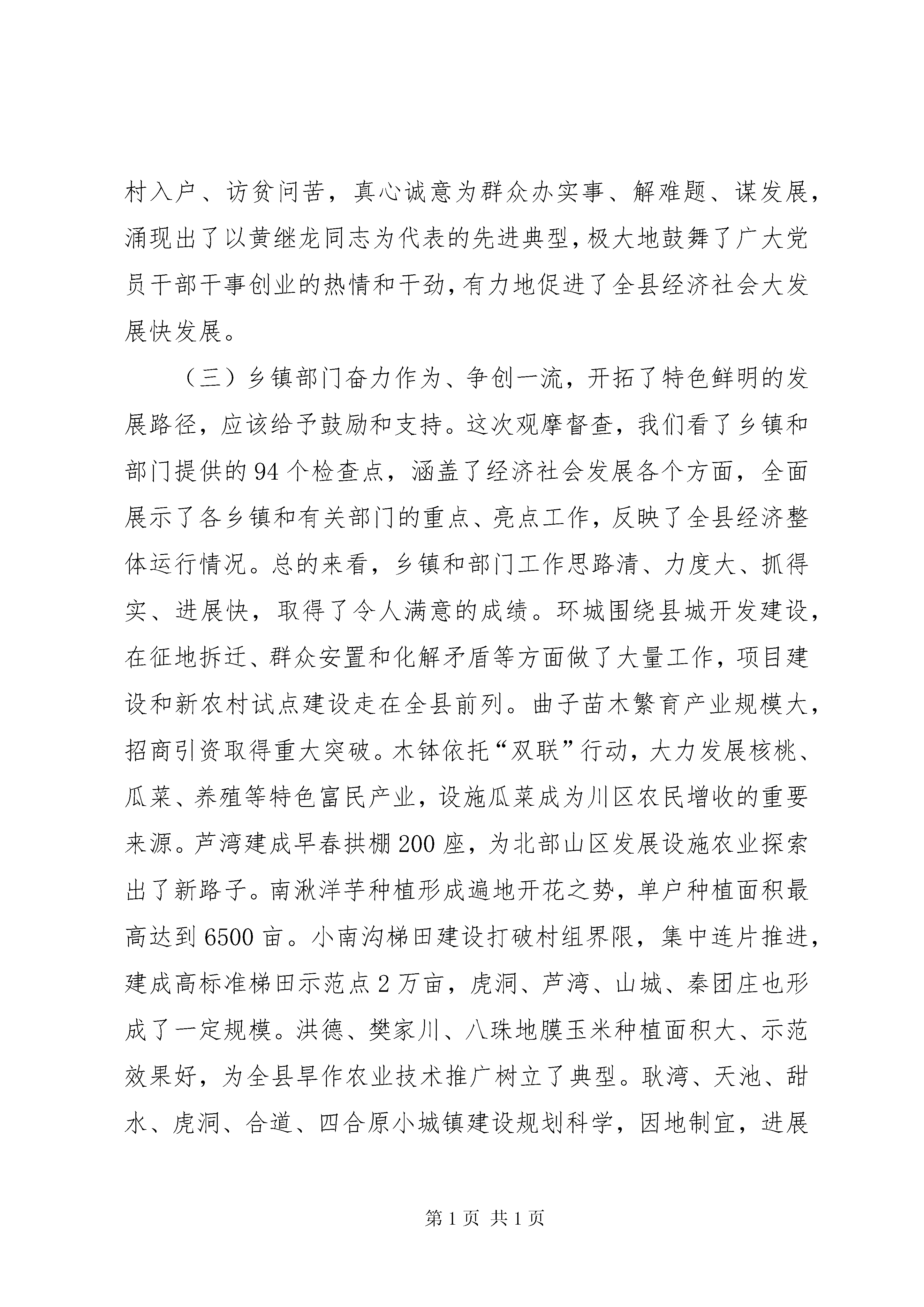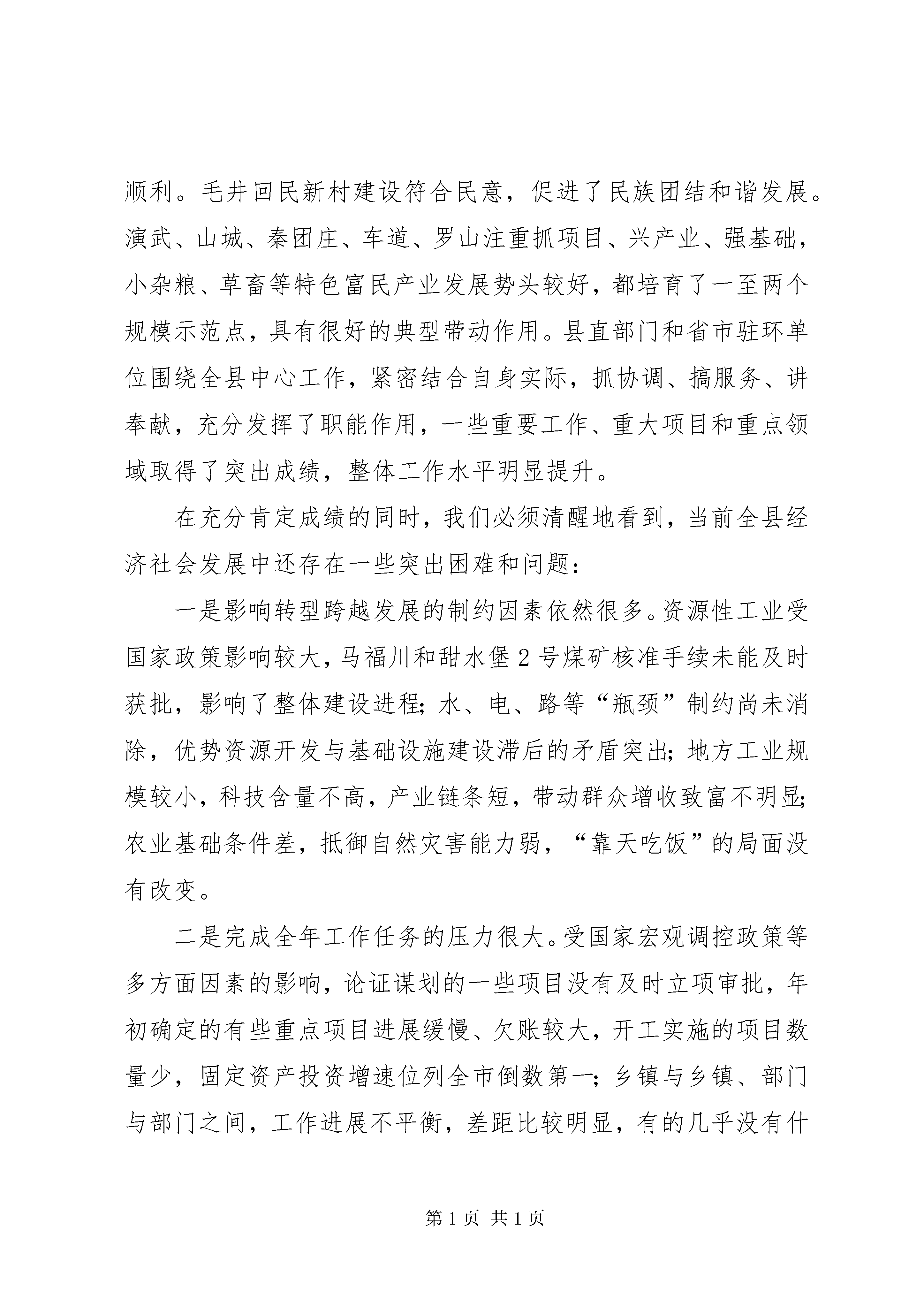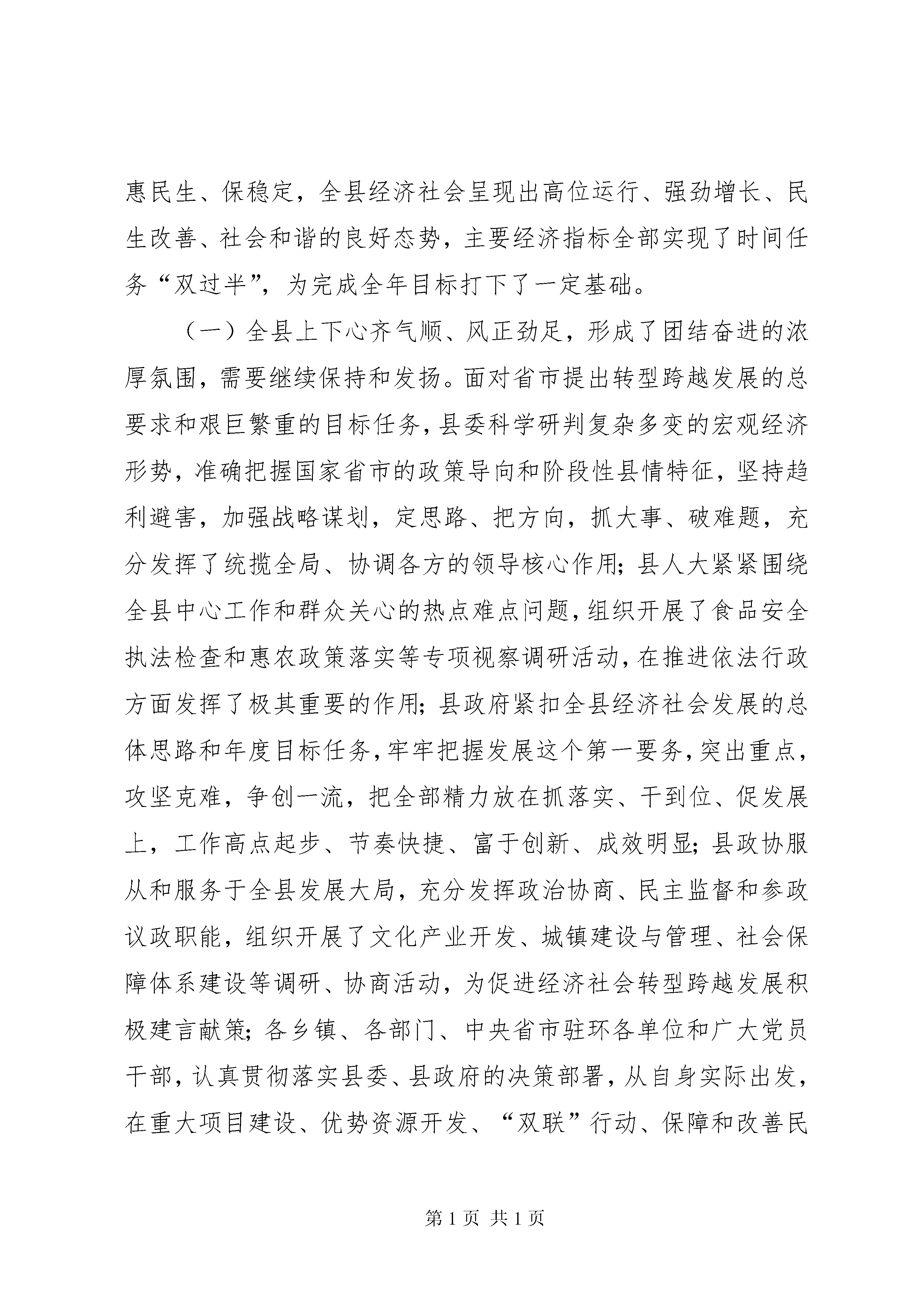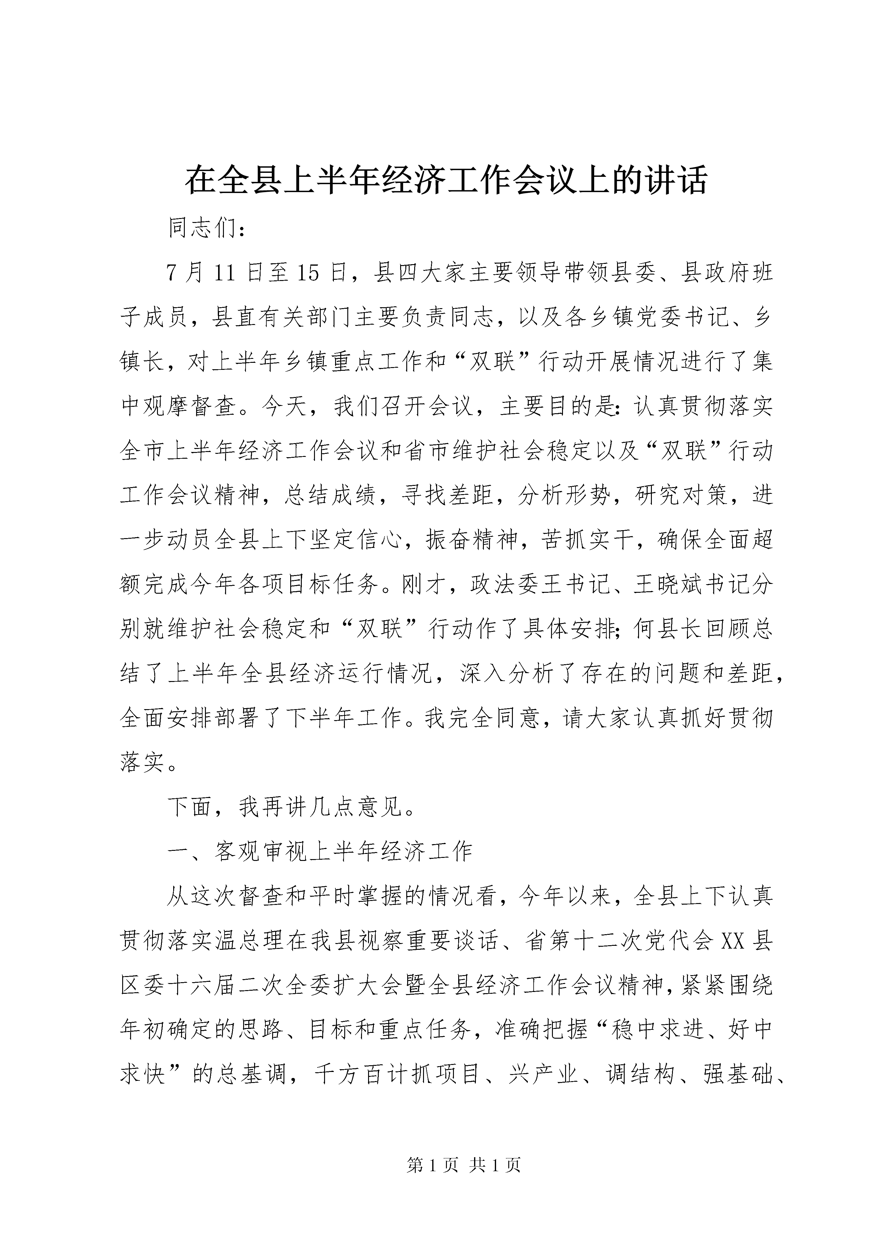 在全县上半年经济工作会议上的讲话同志们:7月11日至15日,县四大家主要领导带领县委、县政府班子成员,县直有关部门主要负责同志,以及各乡镇党委书记、乡镇长,对上半年乡镇重点工作和“双联”行动开展情况进行了集中观摩督查。今天,我们召开会议,主要目的是:认真贯彻落实全市上半年经济工作会议和省市维护社会稳定以及“双联”行动工作会议精神,总结成绩,寻找差距,分析形势,研究对策,进一步动员全县上下坚定信心,振奋精神,苦抓实干,确保全面超额完成今年各项目标任务。刚才,政法委王书记、王晓斌书记分别就维护社会稳定和“双联”行动作了具体安排;何县长回顾总结了上半年全县经济运行情况,深入分析了存在的问题和差距,全面安排部署了下半年工作。我完全同意,请大家认真抓好贯彻落实。下面,我再讲几点意见。一、客观审视上半年经济工作从这次督查和平时掌握的情况看,今年以来,全县上下认真贯彻落实温总理在我县视察重要谈话、省第十二次党代会XX县区委十六届二次全委扩大会暨全县经济工作会议精神,紧紧围绕年初确定的思路、目标和重点任务,准确把握“稳中求进、好中求快”的总基调,千方百计抓项目、兴产业、调结构、强基础、惠民生、保稳定,全县经济社会呈现出高位运行、强劲增长、民生改善、社会和谐的良好态势,主要经济指标全部实现了时间任务“双过半”,为完成全年目标打下了一定基础。(一)全县上下心齐气顺、风正劲足,形成了团结奋进的浓厚氛围,需要继续保持和发扬。面对省市提出转型跨越发展的总要求和艰巨繁重的目标任务,县委科学研判复杂多变的宏观经济形势,准确把握国家省市的政策导向和阶段性县情特征,坚持趋利避害,加强战略谋划,定思路、把方向,抓大事、破难题,充分发挥了统揽全局、协调各方的领导核心作用;县人大紧紧围绕全县中心工作和群众关心的热点难点问题,组织开展了食品安全执法检查和惠农政策落实等专项视察调研活动,在推进依法行政方面发挥了极其重要的作用;县政府紧扣全县经济社会发展的总体思路和年度目标任务,牢牢把握发展这个第一要务,突出重点,攻坚克难,争创一流,把全部精力放在抓落实、干到位、促发展上,工作高点起步、节奏快捷、富于创新、成效明显;县政协服从和服务于全县发展大局,充分发挥政治协商、民主监督和参政议政职能,组织开展了文化产业开发、城镇建设与管理、社会保障体系建设等调研、协商活动,为促进经济社会转型跨越发展积极建言献策;各乡镇、各部门、中央省市驻环各单位和广大党员干部,认真贯彻落实县委、县政府的决策部署,从自身实际出发,在重大项目建设、优势资源开发、“双联”行动、保障和改善民生等方面,履职尽责,创先争优,形成了同心同德抓工作、和衷共济谋发展的良好局面。(二)重点工作集中突破、取得成效,促进了经济平稳较快发展,值得充分肯定和总结。从主要经济指标看,8项主要经济指标均保持两位数以上的增长速度,超额完成了市上下达的目标任务,取得了生产总值、大(小)口径财政收入、社会消费品零售总额、农民人均现金收入“五个”全市第一和规模以上工业增加值、城镇居民人均可支配收入“两个”全市第三,创造了历史最好水平。从重大项目建设看,华电南湫风电一、二期工程实现并网发电,填补了庆阳市新能源开发的历史空白;刘园子和甜水堡1号煤矿10月份可建成试生产,将在全市率先出煤;年产400万吨新型干法特种水泥生产线及配套发电项目在兰洽会上成功签约,工程建设进入实质性阶段;县城规划区内河道整治、30里环江风情线脉园二区和情园一区建设进展较快;夏粮喜获丰收,全膜双垄沟播玉米种植完成112.1万亩,占全市总面积的一半,是全省3个百万亩大县之一。这几项工作走在全市前列,得到了市委、市政府的充分肯定。从重要活动开展看,创先争优活动、“联村联户、为民富民”行动、“效能风暴”行动、“保纯洁、正作风、强队伍、促发展”专项教育活动和基层组织建设年、政策落实年、项目突破年活动,主题突出、形式多样、内容丰富,取得了阶段性成效,特别是在“双联”行动中,全体帮联干部进村入户、访贫问苦,真心诚意为群众办实事、解难题、谋发展,涌现出了以黄继龙同志为代表的先进典型,极大地鼓舞了广大党员干部干事创业的热情和干劲,有力地促进了全县经济社会大发展快发展。(三)乡镇部门奋力作为、争创一流,开拓了特色鲜明的发展路径,应该给予鼓励和支持。这次观摩督查,我们看了乡镇和部门提供的94个检查点,涵盖了经济社会发展各个方面,全面展示了各乡镇和有关部门的重点、亮点工作,反映了全县经济整体运行情况。总的来看,乡镇和部门工作思路清、力度大、抓得实、进展快,取得了令人满意的成绩。环城围绕县城开发建设,在征地拆迁、群众安置和化解矛盾等方面做了大量工作,项目建设和新农村试点建设走在全县前列。曲子苗木繁育产业规模大,招商引资取得重大突破。木钵依托“双联”行动,大力发展核桃、