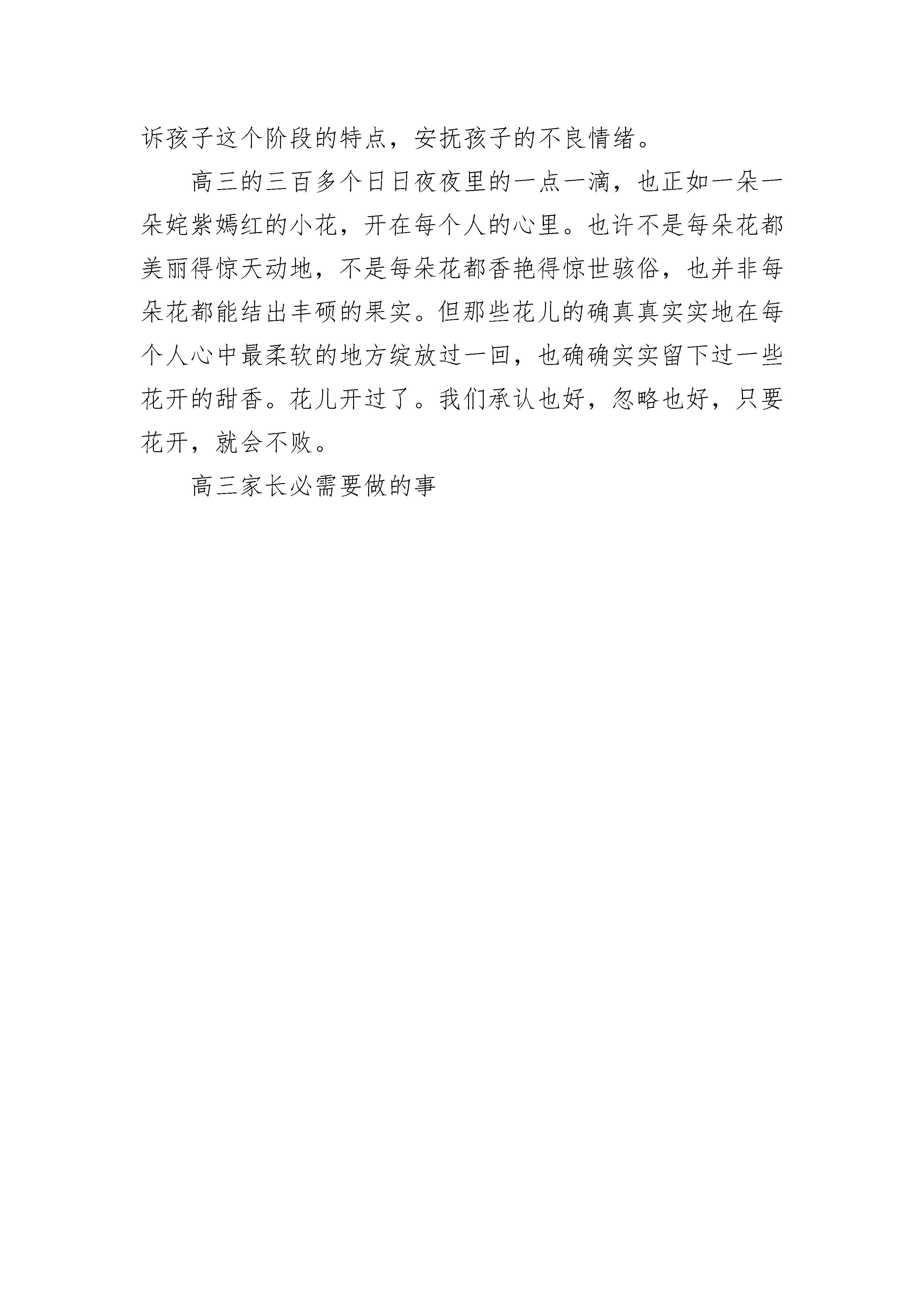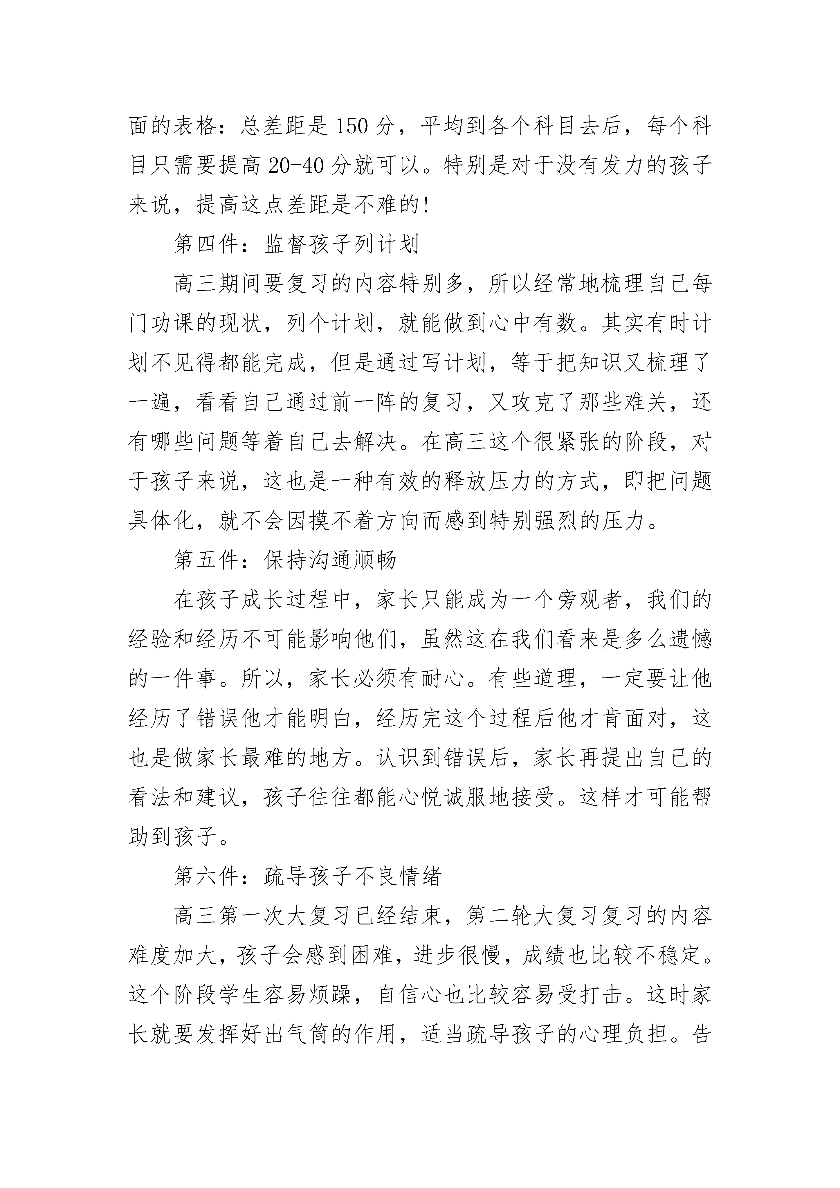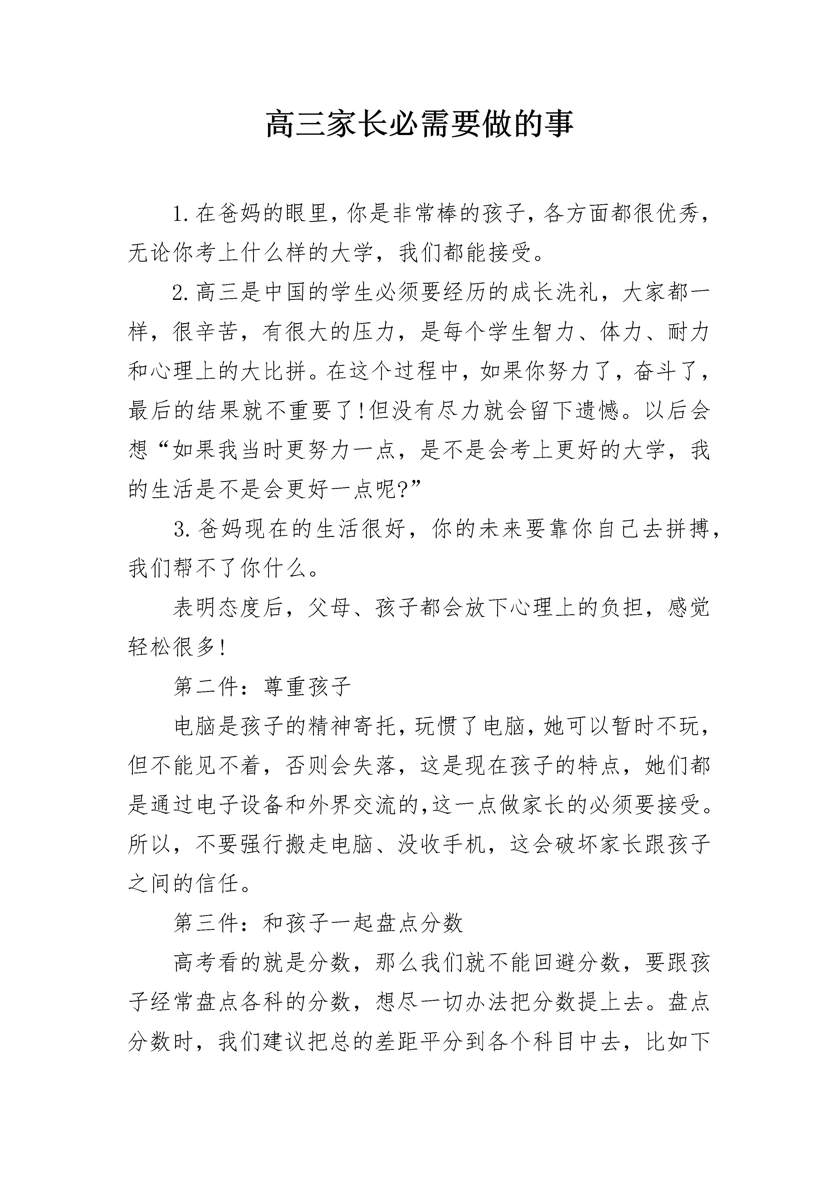 高三家长必需要做的事1.在爸妈的眼里,你是非常棒的孩子,各方面都很优秀,无论你考上什么样的大学,我们都能接受。2.高三是中国的学生必须要经历的成长洗礼,大家都一样,很辛苦,有很大的压力,是每个学生智力、体力、耐力和心理上的大比拼。在这个过程中,如果你努力了,奋斗了,最后的结果就不重要了!但没有尽力就会留下遗憾。以后会想“如果我当时更努力一点,是不是会考上更好的大学,我的生活是不是会更好一点呢?”3.爸妈现在的生活很好,你的未来要靠你自己去拼搏,我们帮不了你什么。表明态度后,父母、孩子都会放下心理上的负担,感觉轻松很多!第二件:尊重孩子电脑是孩子的精神寄托,玩惯了电脑,她可以暂时不玩,但不能见不着,否则会失落,这是现在孩子的特点,她们都是通过电子设备和外界交流的,这一点做家长的必须要接受。所以,不要强行搬走电脑、没收手机,这会破坏家长跟孩子之间的信任。第三件:和孩子一起盘点分数高考看的就是分数,那么我们就不能回避分数,要跟孩子经常盘点各科的分数,想尽一切办法把分数提上去。盘点分数时,我们建议把总的差距平分到各个科目中去,比如下面的表格:总差距是150分,平均到各个科目去后,每个科目只需要提高20-40分就可以。特别是对于没有发力的孩子来说,提高这点差距是不难的!第四件:监督孩子列计划高三期间要复习的内容特别多,所以经常地梳理自己每门功课的现状,列个计划,就能做到心中有数。其实有时计划不见得都能完成,但是通过写计划,等于把知识又梳理了一遍,看看自己通过前一阵的复习,又攻克了那些难关,还有哪些问题等着自己去解决。在高三这个很紧张的阶段,对于孩子来说,这也是一种有效的释放压力的方式,即把问题具体化,就不会因摸不着方向而感到特别强烈的压力。第五件:保持沟通顺畅在孩子成长过程中,家长只能成为一个旁观者,我们的经验和经历不可能影响他们,虽然这在我们看来是多么遗憾的一件事。所以,家长必须有耐心。有些道理,一定要让他经历了错误他才能明白,经历完这个过程后他才肯面对,这也是做家长最难的地方。认识到错误后,家长再提出自己的看法和建议,孩子往往都能心悦诚服地接受。这样才可能帮助到孩子。第六件:疏导孩子不良情绪高三第一次大复习已经结束,第二轮大复习复习的内容难度加大,孩子会感到困难,进步很慢,成绩也比较不稳定。这个阶段学生容易烦躁,自信心也比较容易受打击。这时家长就要发挥好出气筒的作用,适当疏导孩子的心理负担。告诉孩子这个阶段的特点,安抚孩子的不良情绪。高三的三百多个日日夜夜里的一点一滴,也正如一朵一朵姹紫嫣红的小花,开在每个人的心里。也许不是每朵花都美丽得惊天动地,不是每朵花都香艳得惊世骇俗,也并非每朵花都能结出丰硕的果实。但那些花儿的确真真实实地在每个人心中最柔软的地方绽放过一回,也确确实实留下过一些花开的甜香。花儿开过了。我们承认也好,忽略也好,只要花开,就会不败。高三家长必需要做的事