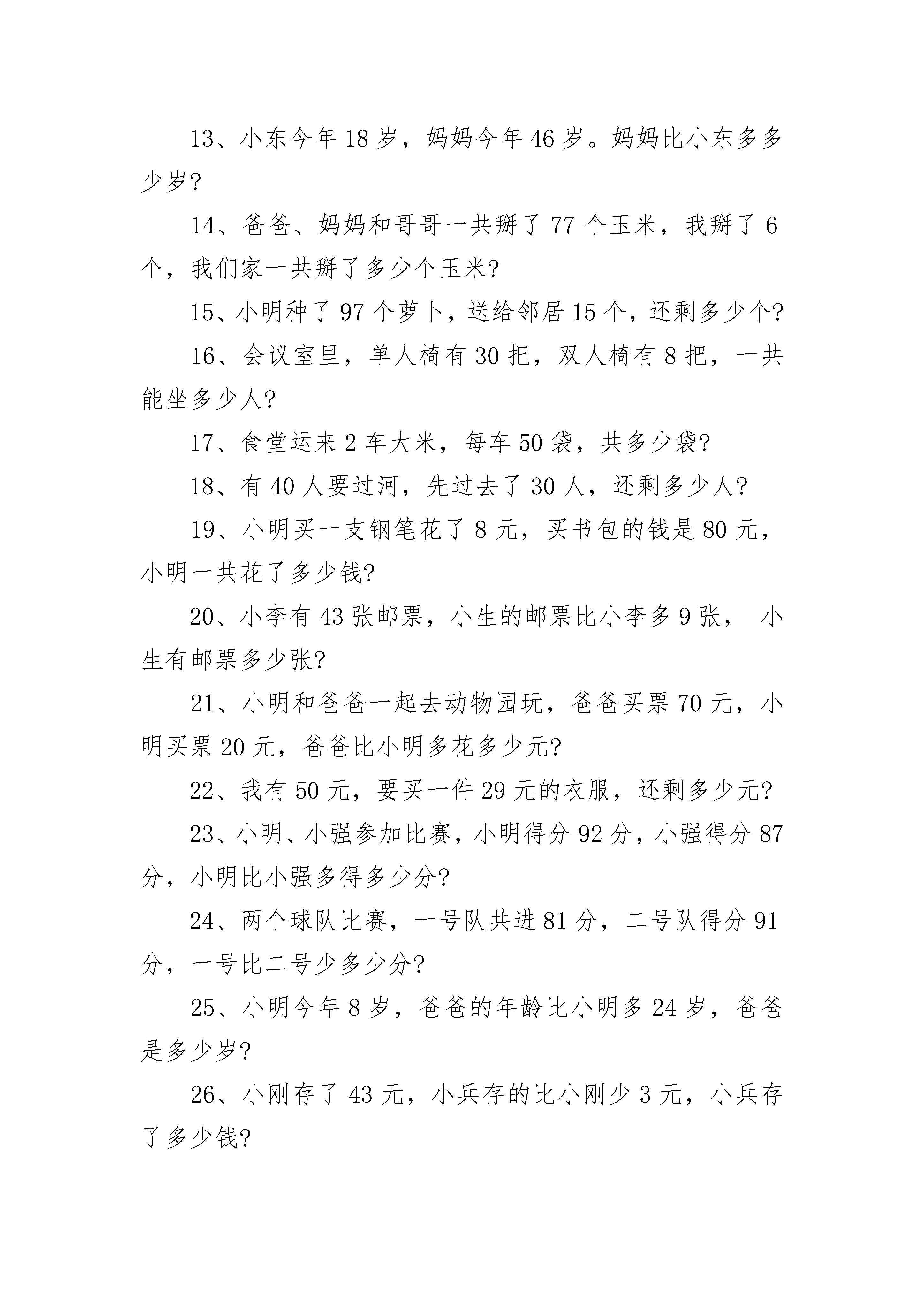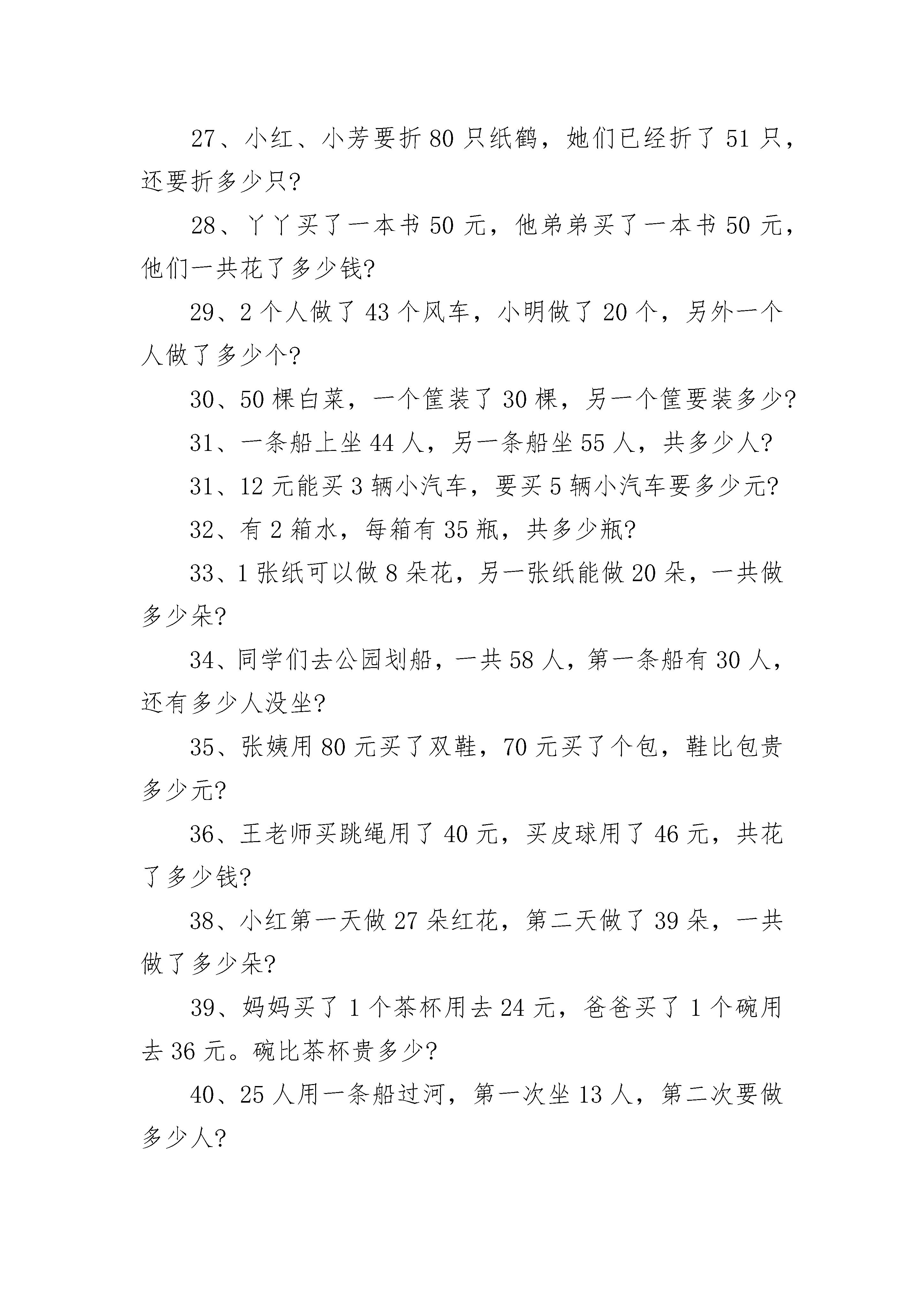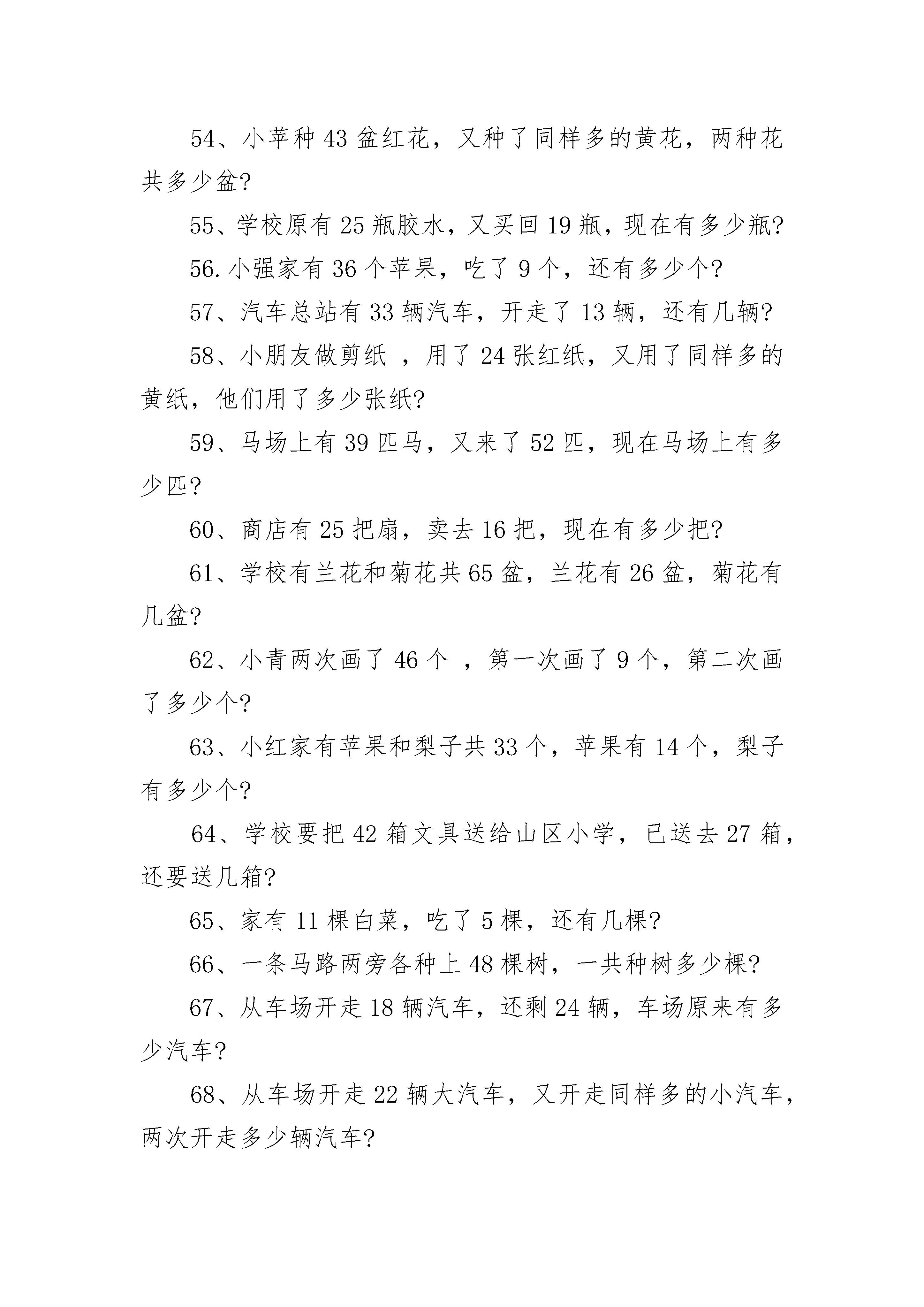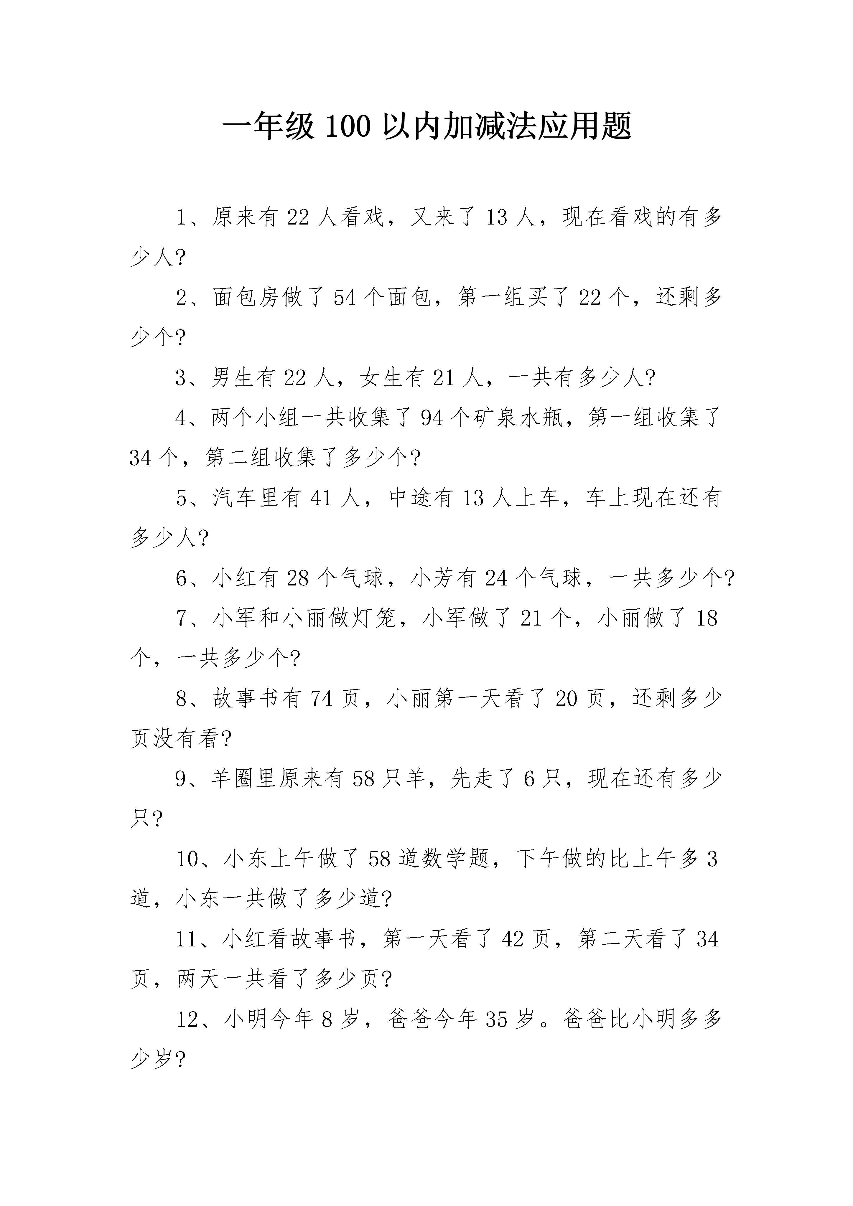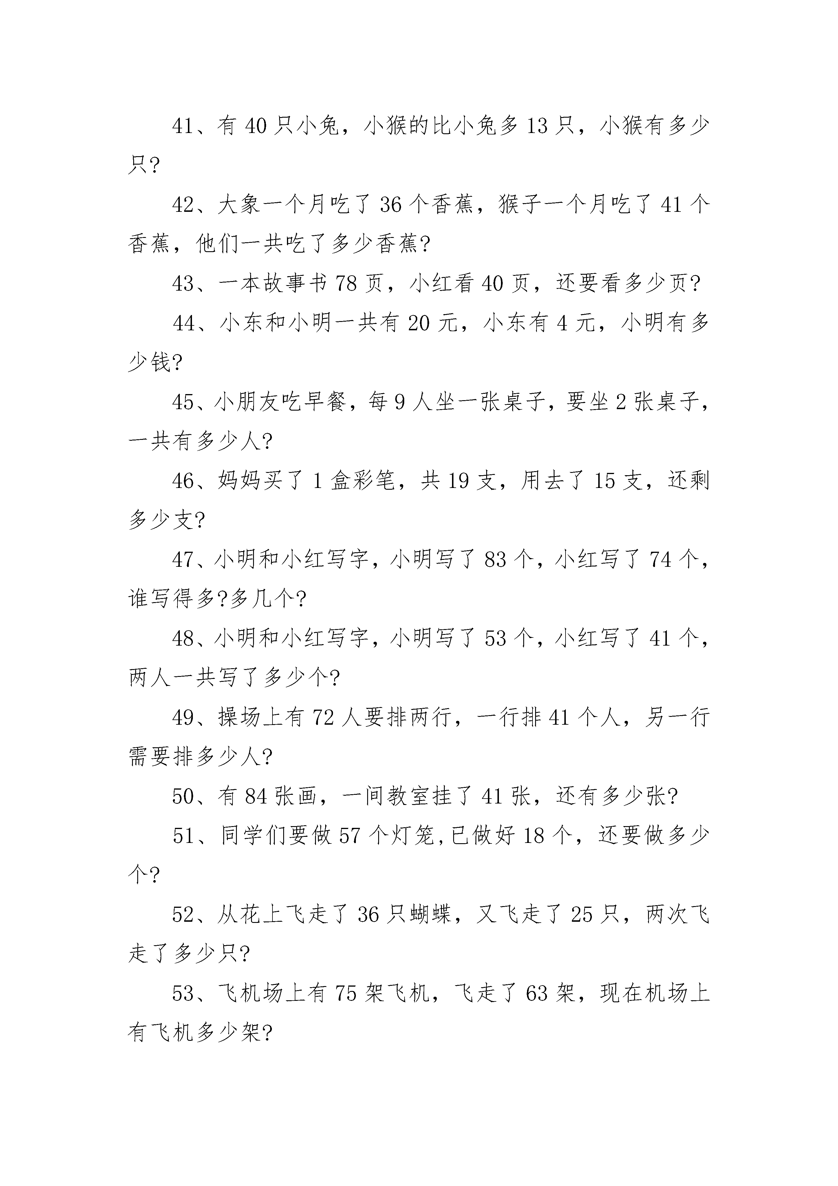 一年级100以内加减法应用题1、原来有22人看戏,又来了13人,现在看戏的有多少人?2、面包房做了54个面包,第一组买了22个,还剩多少个?3、男生有22人,女生有21人,一共有多少人?4、两个小组一共收集了94个矿泉水瓶,第一组收集了34个,第二组收集了多少个?5、汽车里有41人,中途有13人上车,车上现在还有多少人?6、小红有28个气球,小芳有24个气球,一共多少个?7、小军和小丽做灯笼,小军做了21个,小丽做了18个,一共多少个?8、故事书有74页,小丽第一天看了20页,还剩多少页没有看?9、羊圈里原来有58只羊,先走了6只,现在还有多少只?10、小东上午做了58道数学题,下午做的比上午多3道,小东一共做了多少道?11、小红看故事书,第一天看了42页,第二天看了34页,两天一共看了多少页?12、小明今年8岁,爸爸今年35岁。爸爸比小明多多少岁?13、小东今年18岁,妈妈今年46岁。妈妈比小东多多少岁?14、爸爸、妈妈和哥哥一共掰了77个玉米,我掰了6个,我们家一共掰了多少个玉米?15、小明种了97个萝卜,送给邻居15个,还剩多少个?16、会议室里,单人椅有30把,双人椅有8把,一共能坐多少人?17、食堂运来2车大米,每车50袋,共多少袋?18、有40人要过河,先过去了30人,还剩多少人?19、小明买一支钢笔花了8元,买书包的钱是80元,小明一共花了多少钱?20、小李有43张邮票,小生的邮票比小李多9张,小生有邮票多少张?21、小明和爸爸一起去动物园玩,爸爸买票70元,小明买票20元,爸爸比小明多花多少元?22、我有50元,要买一件29元的衣服,还剩多少元?23、小明、小强参加比赛,小明得分92分,小强得分87分,小明比小强多得多少分?24、两个球队比赛,一号队共进81分,二号队得分91分,一号比二号少多少分?25、小明今年8岁,爸爸的年龄比小明多24岁,爸爸是多少岁?26、小刚存了43元,小兵存的比小刚少3元,小兵存了多少钱?27、小红、小芳要折80只纸鹤,她们已经折了51只,还要折多少只?28、丫丫买了一本书50元,他弟弟买了一本书50元,他们一共花了多少钱?29、2个人做了43个风车,小明做了20个,另外一个人做了多少个?30、50棵白菜,一个筐装了30棵,另一个筐要装多少?31、一条船上坐44人,另一条船坐55人,共多少人?31、12元能买3辆小汽车,要买5辆小汽车要多少元?32、有2箱水,每箱有35瓶,共多少瓶?33、1张纸可以做8朵花,另一张纸能做20朵,一共做多少朵?34、同学们去公园划船,一共58人,第一条船有30人,还有多少人没坐?35、张姨用80元买了双鞋,70元买了个包,鞋比包贵多少元?36、王老师买跳绳用了40元,买皮球用了46元,共花了多少钱?38、小红第一天做27朵红花,第二天做了39朵,一共做了多少朵?39、妈妈买了1个茶杯用去24元,爸爸买了1个碗用去36元。碗比茶杯贵多少?40、25人用一条船过河,第一次坐13人,第二次要做多少人?41、有40只小兔,小猴的比小兔多13只,小猴有多少只?42、大象一个月吃了36个香蕉,猴子一个月吃了41个香蕉,他们一共吃了多少香蕉?43、一本故事书78页,小红看40页,还要看多少页?44、小东和小明一共有20元,小东有4元,小明有多少钱?45、小朋友吃早餐,每9人坐一张桌子,要坐2张桌子,一共有多少人?46、妈妈买了1盒彩笔,共19支,用去了15支,还剩多少支?47、小明和小红写字,小明写了83个,小红写了74个,谁写得多?多几个?48、小明和小红写字,小明写了53个,小红写了41个,两人一共写了多少个?49、操场上有72人要排两行,一行排41个人,另一行需要排多少人?50、有84张画,一间教室挂了41张,还有多少张?51、同学们要做57个灯笼,已做好18个,还要做多少个?52、从花上飞走了36只蝴蝶,又飞走了25只,两次飞走了多少只?53、飞机场上有75架飞机,飞走了63架,现在机场上有飞机多少架?54、小苹种43盆红花,又种了同样多的黄花,两种花共多少盆?55、学校原有25瓶胶水,又买回19瓶,现在有多少瓶?56.小强家有36个苹果,吃了9个,还有多少个?57、汽车总站有33辆汽车,开走了13辆,还有几辆?58、小朋友做剪纸,用了24张红纸,又用了同样多的黄纸,他们用了多少张纸?59、马场上有39匹马,又来了52匹,现在马场上有多少匹?60、商店有25把扇,卖去16把,现在有多少把?61、学校有兰花和菊花共65盆,兰花有26盆,菊花有几盆?62、小青两次画了46个,第一次画了9个,第二次画了多少个?63、小红家有苹果和梨子共33个,苹果有14个,梨子有多少个?64、学校要把42箱文具送给山区小学,已送去27箱,还要送几箱?65、家有11棵白菜,吃了