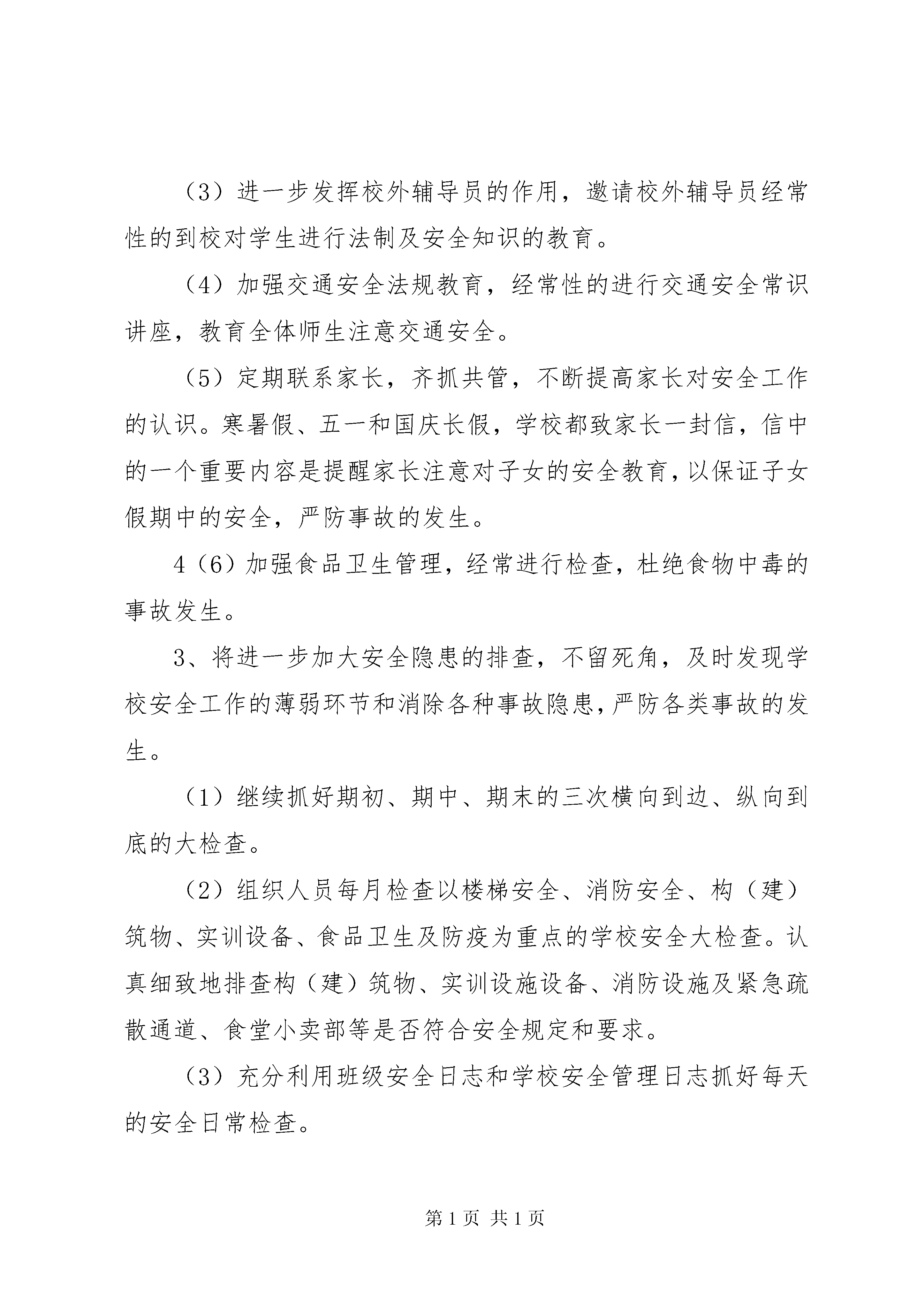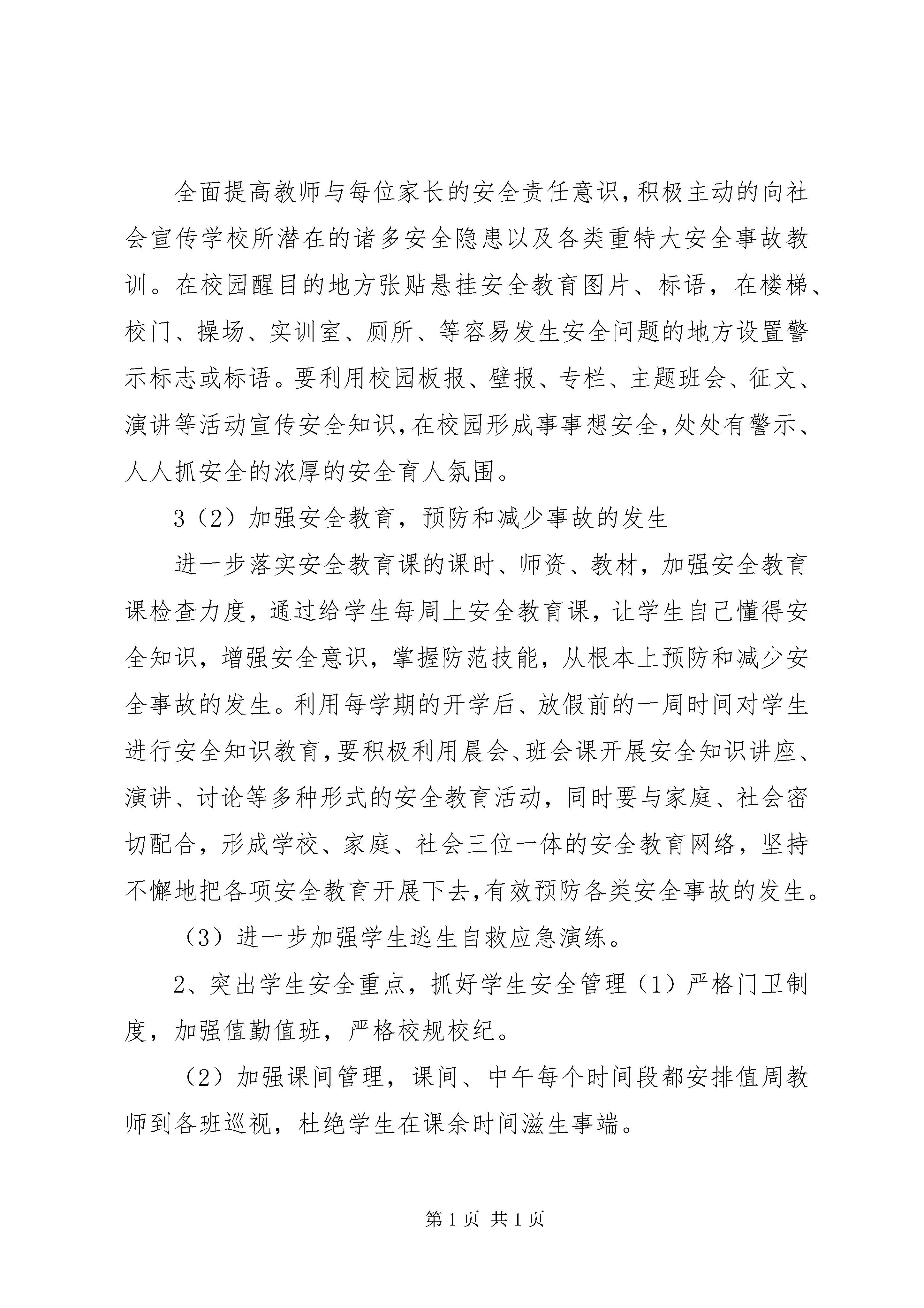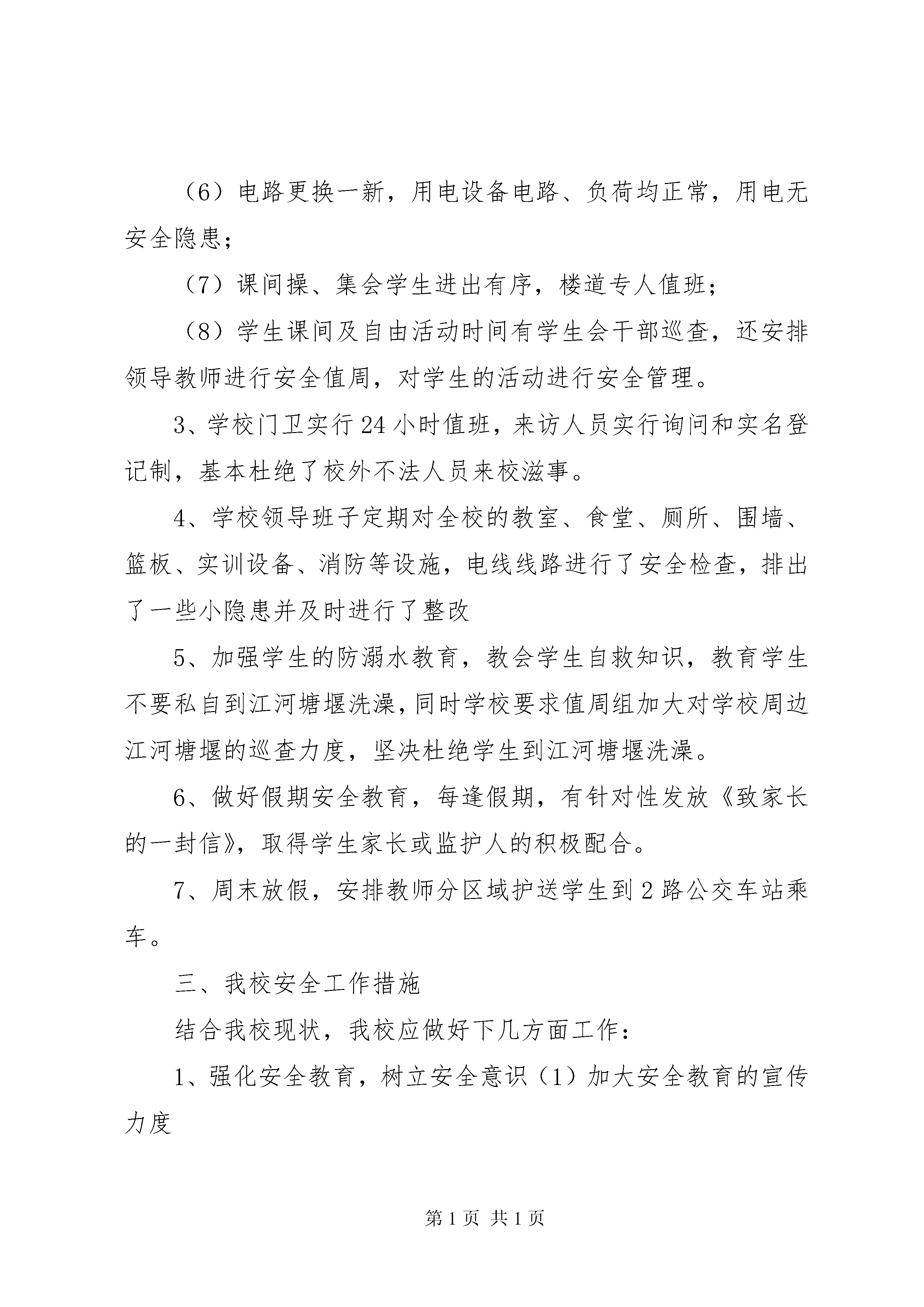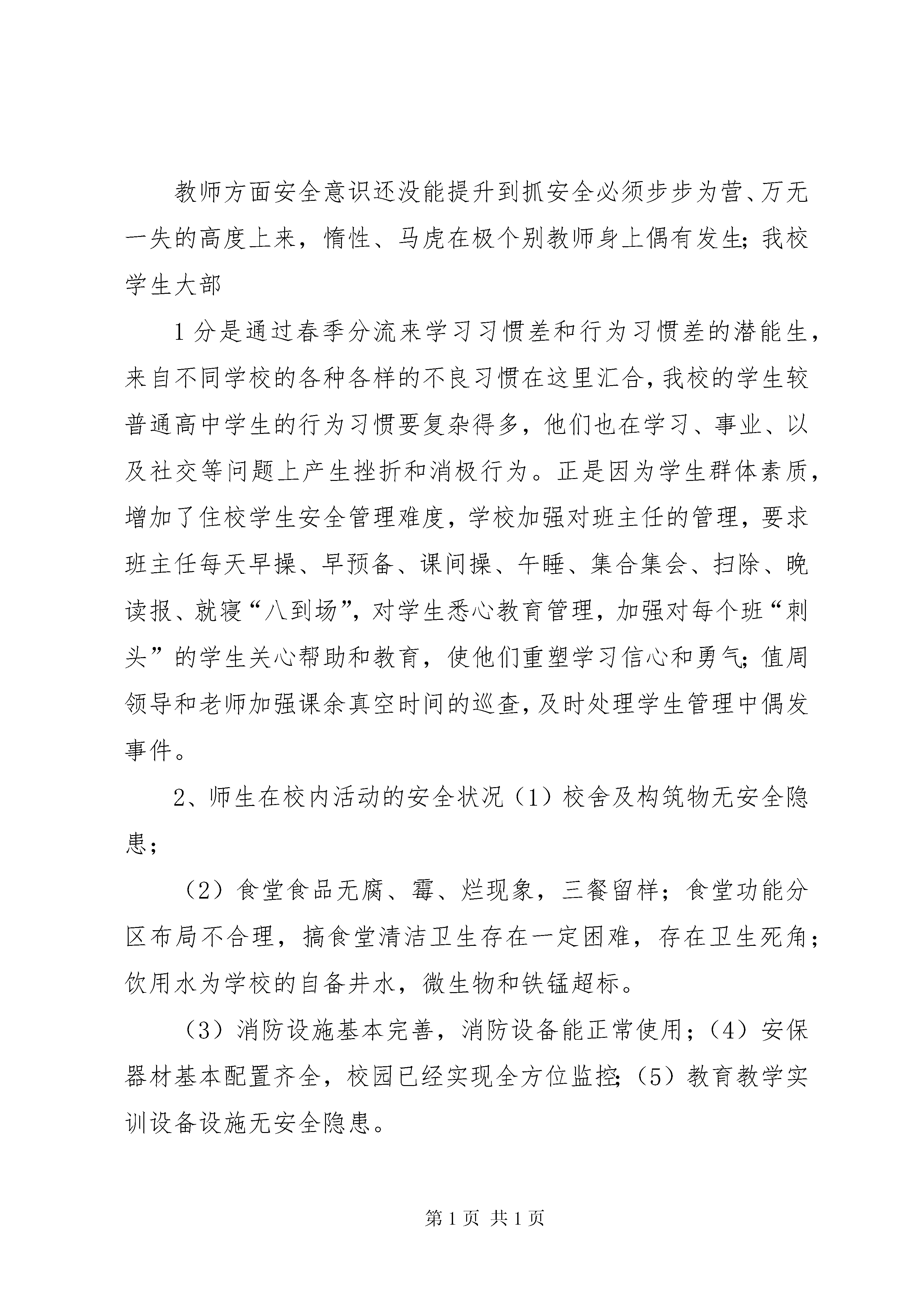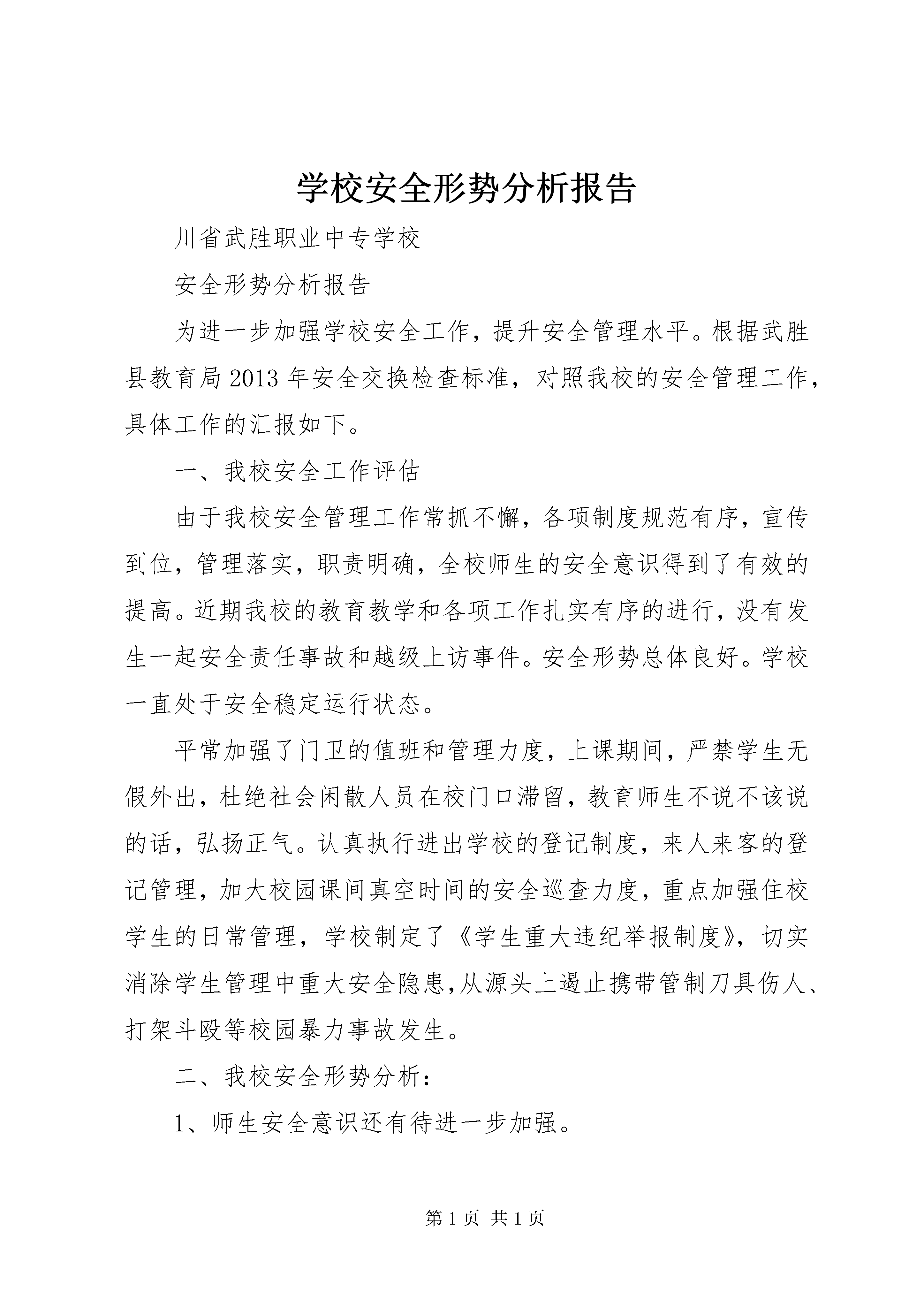 学校安全形势分析报告川省武胜职业中专学校安全形势分析报告为进一步加强学校安全工作,提升安全管理水平。根据武胜县教育局2013年安全交换检查标准,对照我校的安全管理工作,具体工作的汇报如下。一、我校安全工作评估由于我校安全管理工作常抓不懈,各项制度规范有序,宣传到位,管理落实,职责明确,全校师生的安全意识得到了有效的提高。近期我校的教育教学和各项工作扎实有序的进行,没有发生一起安全责任事故和越级上访事件。安全形势总体良好。学校一直处于安全稳定运行状态。平常加强了门卫的值班和管理力度,上课期间,严禁学生无假外出,杜绝社会闲散人员在校门口滞留,教育师生不说不该说的话,弘扬正气。认真执行进出学校的登记制度,来人来客的登记管理,加大校园课间真空时间的安全巡查力度,重点加强住校学生的日常管理,学校制定了《学生重大违纪举报制度》,切实消除学生管理中重大安全隐患,从源头上遏止携带管制刀具伤人、打架斗殴等校园暴力事故发生。二、我校安全形势分析:1、师生安全意识还有待进一步加强。教师方面安全意识还没能提升到抓安全必须步步为营、万无一失的高度上来,惰性、马虎在极个别教师身上偶有发生;我校学生大部1分是通过春季分流来学习习惯差和行为习惯差的潜能生,来自不同学校的各种各样的不良习惯在这里汇合,我校的学生较普通高中学生的行为习惯要复杂得多,他们也在学习、事业、以及社交等问题上产生挫折和消极行为。正是因为学生群体素质,增加了住校学生安全管理难度,学校加强对班主任的管理,要求班主任每天早操、早预备、课间操、午睡、集合集会、扫除、晚读报、就寝“八到场”,对学生悉心教育管理,加强对每个班“刺头”的学生关心帮助和教育,使他们重塑学习信心和勇气;值周领导和老师加强课余真空时间的巡查,及时处理学生管理中偶发事件。2、师生在校内活动的安全状况(1)校舍及构筑物无安全隐患;(2)食堂食品无腐、霉、烂现象,三餐留样;食堂功能分区布局不合理,搞食堂清洁卫生存在一定困难,存在卫生死角;饮用水为学校的自备井水,微生物和铁锰超标。(3)消防设施基本完善,消防设备能正常使用;(4)安保器材基本配置齐全,校园已经实现全方位监控;(5)教育教学实训设备设施无安全隐患。(6)电路更换一新,用电设备电路、负荷均正常,用电无安全隐患;(7)课间操、集会学生进出有序,楼道专人值班;(8)学生课间及自由活动时间有学生会干部巡查,还安排领导教师进行安全值周,对学生的活动进行安全管理。3、学校门卫实行24小时值班,来访人员实行询问和实名登记制,基本杜绝了校外不法人员来校滋事。4、学校领导班子定期对全校的教室、食堂、厕所、围墙、篮板、实训设备、消防等设施,电线线路进行了安全检查,排出了一些小隐患并及时进行了整改5、加强学生的防溺水教育,教会学生自救知识,教育学生不要私自到江河塘堰洗澡,同时学校要求值周组加大对学校周边江河塘堰的巡查力度,坚决杜绝学生到江河塘堰洗澡。6、做好假期安全教育,每逢假期,有针对性发放《致家长的一封信》,取得学生家长或监护人的积极配合。7、周末放假,安排教师分区域护送学生到2路公交车站乘车。三、我校安全工作措施结合我校现状,我校应做好下几方面工作:1、强化安全教育,树立安全意识(1)加大安全教育的宣传力度全面提高教师与每位家长的安全责任意识,积极主动的向社会宣传学校所潜在的诸多安全隐患以及各类重特大安全事故教训。在校园醒目的地方张贴悬挂安全教育图片、标语,在楼梯、校门、操场、实训室、厕所、等容易发生安全问题的地方设置警示标志或标语。要利用校园板报、壁报、专栏、主题班会、征文、演讲等活动宣传安全知识,在校园形成事事想安全,处处有警示、人人抓安全的浓厚的安全育人氛围。3(2)加强安全教育,预防和减少事故的发生进一步落实安全教育课的课时、师资、教材,加强安全教育课检查力度,通过给学生每周上安全教育课,让学生自己懂得安全知识,增强安全意识,掌握防范技能,从根本上预防和减少安全事故的发生。利用每学期的开学后、放假前的一周时间对学生进行安全知识教育,要积极利用晨会、班会课开展安全知识讲座、演讲、讨论等多种形式的安全教育活动,同时要与家庭、社会密切配合,形成学校、家庭、社会三位一体的安全教育网络,坚持不懈地把各项安全教育开展下去,有效预防各类安全事故的发生。(3)进一步加强学生逃生自救应急演练。2、突出学生安全重点,抓好学生安全管理(1)严格门卫制度,加强值勤值班,严格校规校纪。(2)加强课间管理,课间、中午每个时间段都安排值周教师到各班巡视,杜绝学生在课余时间滋生事端。(3)进一步发挥校外辅导员的作用,邀请校外辅导员经常性的到校对学生进行法制及安全知识的教育。(4)加强交通安全法规教育,经常性的进行交通安全常识讲座,教育全体师生注意交通安全。(5)定期联系家长,齐抓共