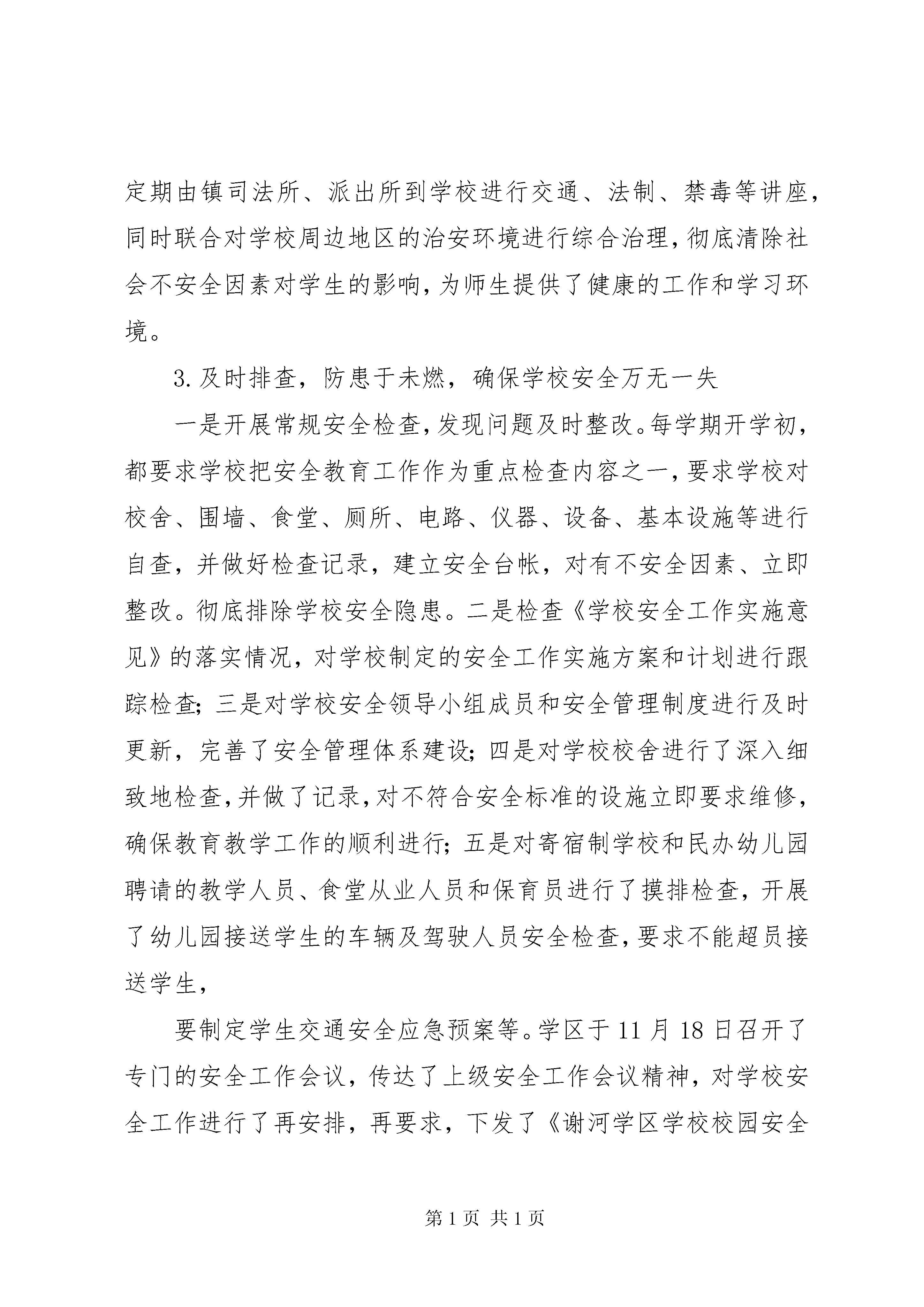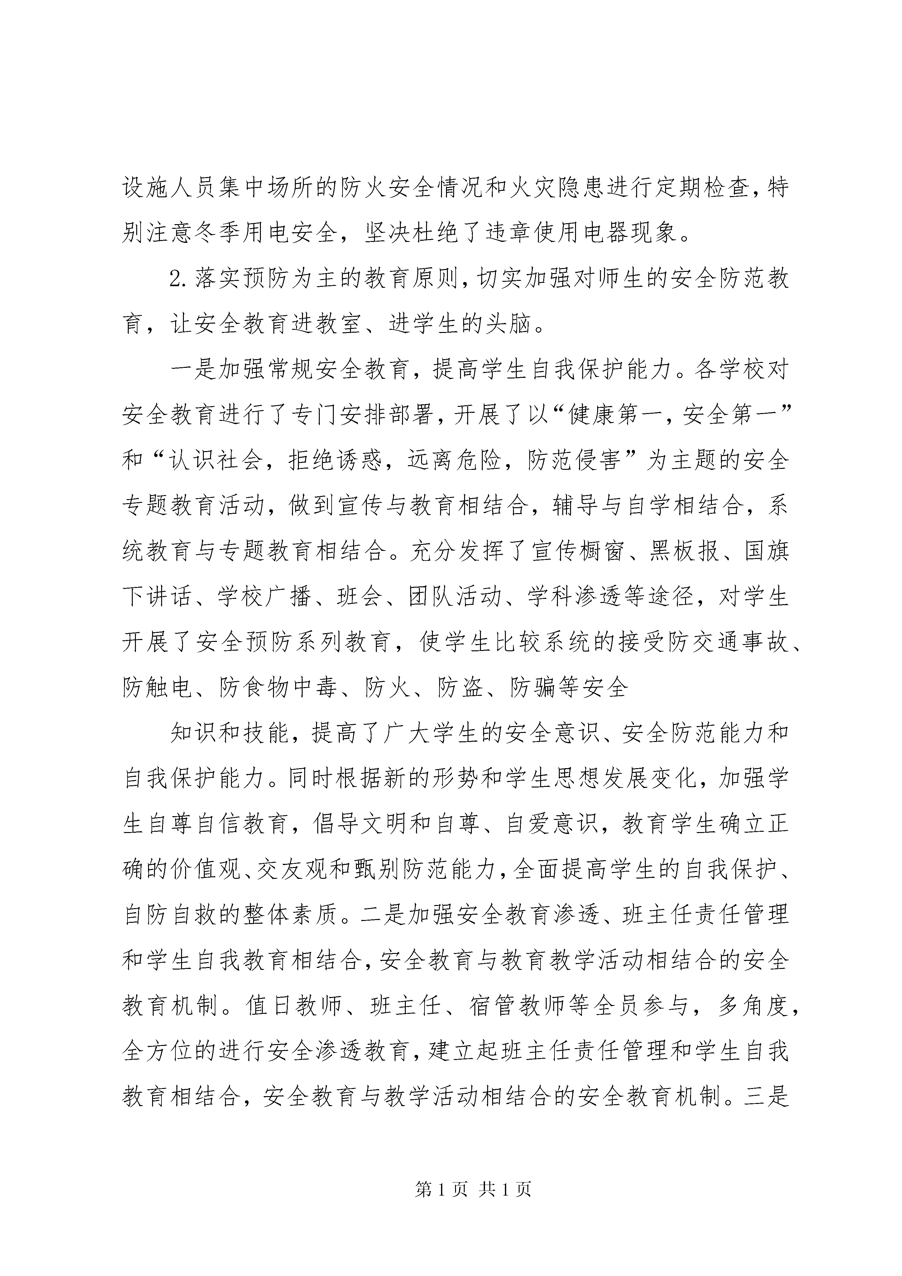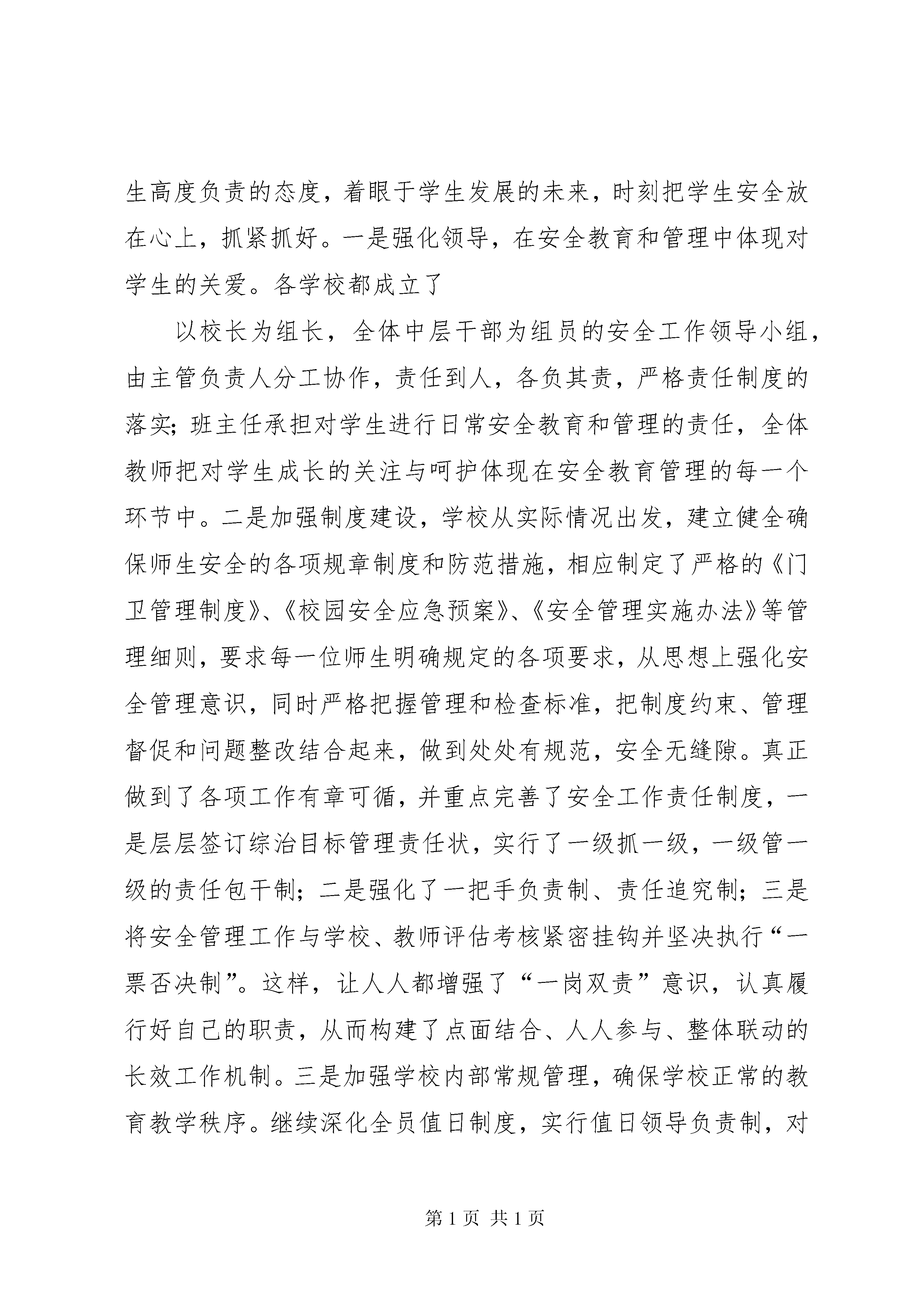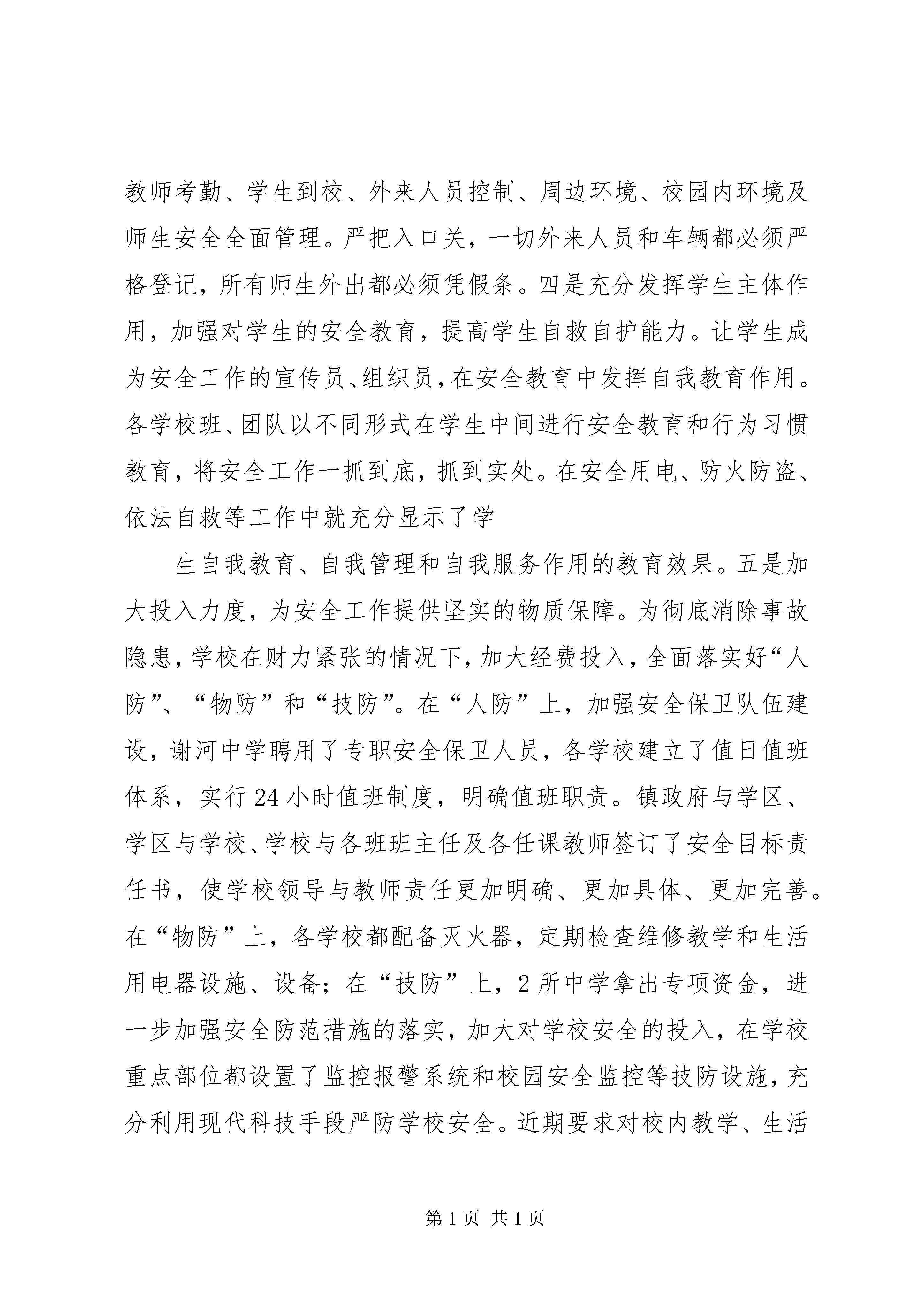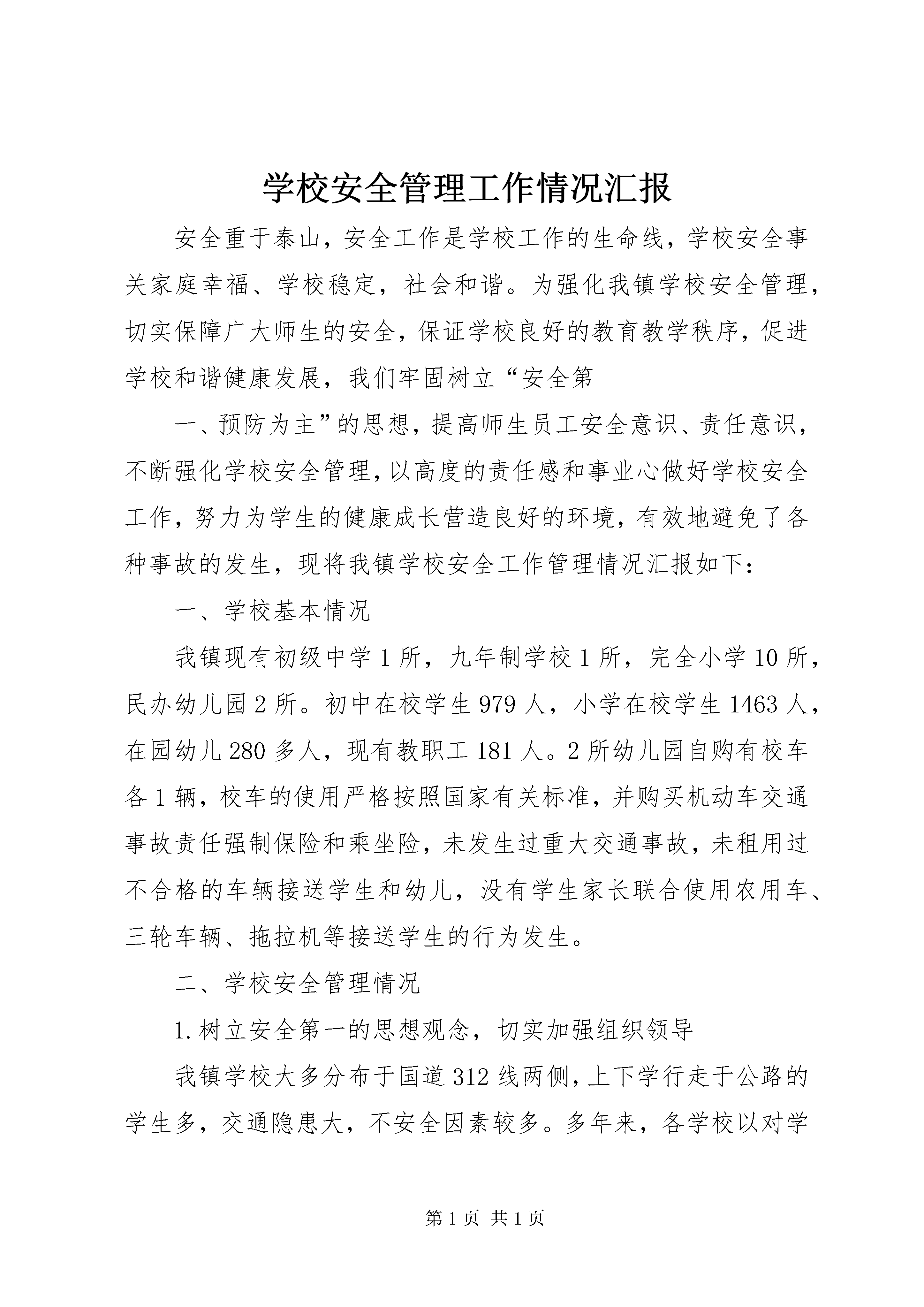 学校安全管理工作情况汇报安全重于泰山,安全工作是学校工作的生命线,学校安全事关家庭幸福、学校稳定,社会和谐。为强化我镇学校安全管理,切实保障广大师生的安全,保证学校良好的教育教学秩序,促进学校和谐健康发展,我们牢固树立“安全第一、预防为主”的思想,提高师生员工安全意识、责任意识,不断强化学校安全管理,以高度的责任感和事业心做好学校安全工作,努力为学生的健康成长营造良好的环境,有效地避免了各种事故的发生,现将我镇学校安全工作管理情况汇报如下:一、学校基本情况我镇现有初级中学1所,九年制学校1所,完全小学10所,民办幼儿园2所。初中在校学生979人,小学在校学生1463人,在园幼儿280多人,现有教职工181人。2所幼儿园自购有校车各1辆,校车的使用严格按照国家有关标准,并购买机动车交通事故责任强制保险和乘坐险,未发生过重大交通事故,未租用过不合格的车辆接送学生和幼儿,没有学生家长联合使用农用车、三轮车辆、拖拉机等接送学生的行为发生。二、学校安全管理情况1.树立安全第一的思想观念,切实加强组织领导我镇学校大多分布于国道312线两侧,上下学行走于公路的学生多,交通隐患大,不安全因素较多。多年来,各学校以对学生高度负责的态度,着眼于学生发展的未来,时刻把学生安全放在心上,抓紧抓好。一是强化领导,在安全教育和管理中体现对学生的关爱。各学校都成立了以校长为组长,全体中层干部为组员的安全工作领导小组,由主管负责人分工协作,责任到人,各负其责,严格责任制度的落实;班主任承担对学生进行日常安全教育和管理的责任,全体教师把对学生成长的关注与呵护体现在安全教育管理的每一个环节中。二是加强制度建设,学校从实际情况出发,建立健全确保师生安全的各项规章制度和防范措施,相应制定了严格的《门卫管理制度》、《校园安全应急预案》、《安全管理实施办法》等管理细则,要求每一位师生明确规定的各项要求,从思想上强化安全管理意识,同时严格把握管理和检查标准,把制度约束、管理督促和问题整改结合起来,做到处处有规范,安全无缝隙。真正做到了各项工作有章可循,并重点完善了安全工作责任制度,一是层层签订综治目标管理责任状,实行了一级抓一级,一级管一级的责任包干制;二是强化了一把手负责制、责任追究制;三是将安全管理工作与学校、教师评估考核紧密挂钩并坚决执行“一票否决制”。这样,让人人都增强了“一岗双责”意识,认真履行好自己的职责,从而构建了点面结合、人人参与、整体联动的长效工作机制。三是加强学校内部常规管理,确保学校正常的教育教学秩序。继续深化全员值日制度,实行值日领导负责制,对教师考勤、学生到校、外来人员控制、周边环境、校园内环境及师生安全全面管理。严把入口关,一切外来人员和车辆都必须严格登记,所有师生外出都必须凭假条。四是充分发挥学生主体作用,加强对学生的安全教育,提高学生自救自护能力。让学生成为安全工作的宣传员、组织员,在安全教育中发挥自我教育作用。各学校班、团队以不同形式在学生中间进行安全教育和行为习惯教育,将安全工作一抓到底,抓到实处。在安全用电、防火防盗、依法自救等工作中就充分显示了学生自我教育、自我管理和自我服务作用的教育效果。五是加大投入力度,为安全工作提供坚实的物质保障。为彻底消除事故隐患,学校在财力紧张的情况下,加大经费投入,全面落实好“人防”、“物防”和“技防”。在“人防”上,加强安全保卫队伍建设,谢河中学聘用了专职安全保卫人员,各学校建立了值日值班体系,实行24小时值班制度,明确值班职责。镇政府与学区、学区与学校、学校与各班班主任及各任课教师签订了安全目标责任书,使学校领导与教师责任更加明确、更加具体、更加完善。在“物防”上,各学校都配备灭火器,定期检查维修教学和生活用电器设施、设备;在“技防”上,2所中学拿出专项资金,进一步加强安全防范措施的落实,加大对学校安全的投入,在学校重点部位都设置了监控报警系统和校园安全监控等技防设施,充分利用现代科技手段严防学校安全。近期要求对校内教学、生活设施人员集中场所的防火安全情况和火灾隐患进行定期检查,特别注意冬季用电安全,坚决杜绝了违章使用电器现象。2.落实预防为主的教育原则,切实加强对师生的安全防范教育,让安全教育进教室、进学生的头脑。一是加强常规安全教育,提高学生自我保护能力。各学校对安全教育进行了专门安排部署,开展了以“健康第一,安全第一”和“认识社会,拒绝诱惑,远离危险,防范侵害”为主题的安全专题教育活动,做到宣传与教育相结合,辅导与自学相结合,系统教育与专题教育相结合。充分发挥了宣传橱窗、黑板报、国旗下讲话、学校广播、班会、团队活动、学科渗透等途径,对学生开展了安全预防系列教育,使学生比较系统的接受防交通事故、防触电、防食物中毒、防火、防盗、防骗等安全知识和技能,提高了广大学生的安全意
