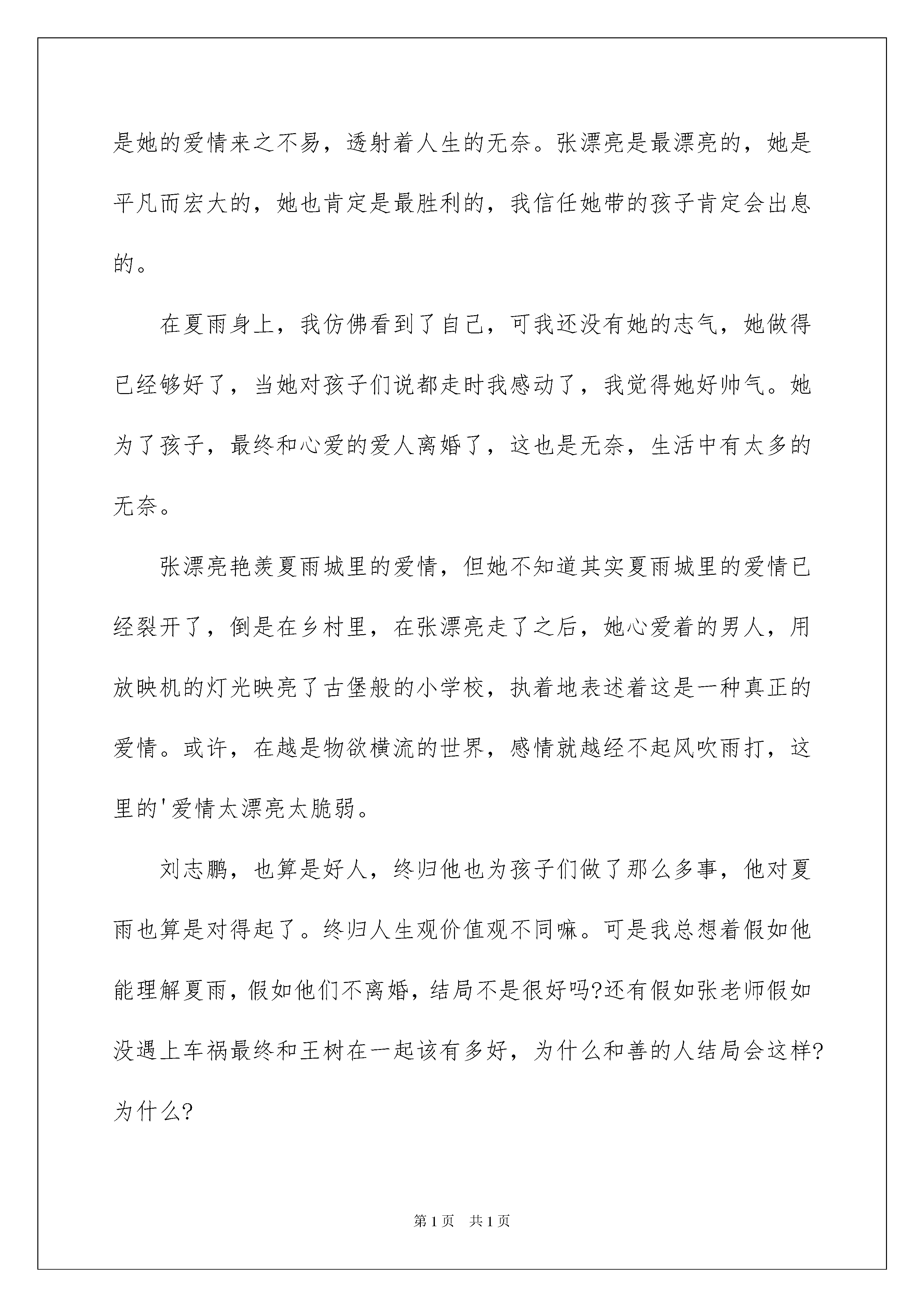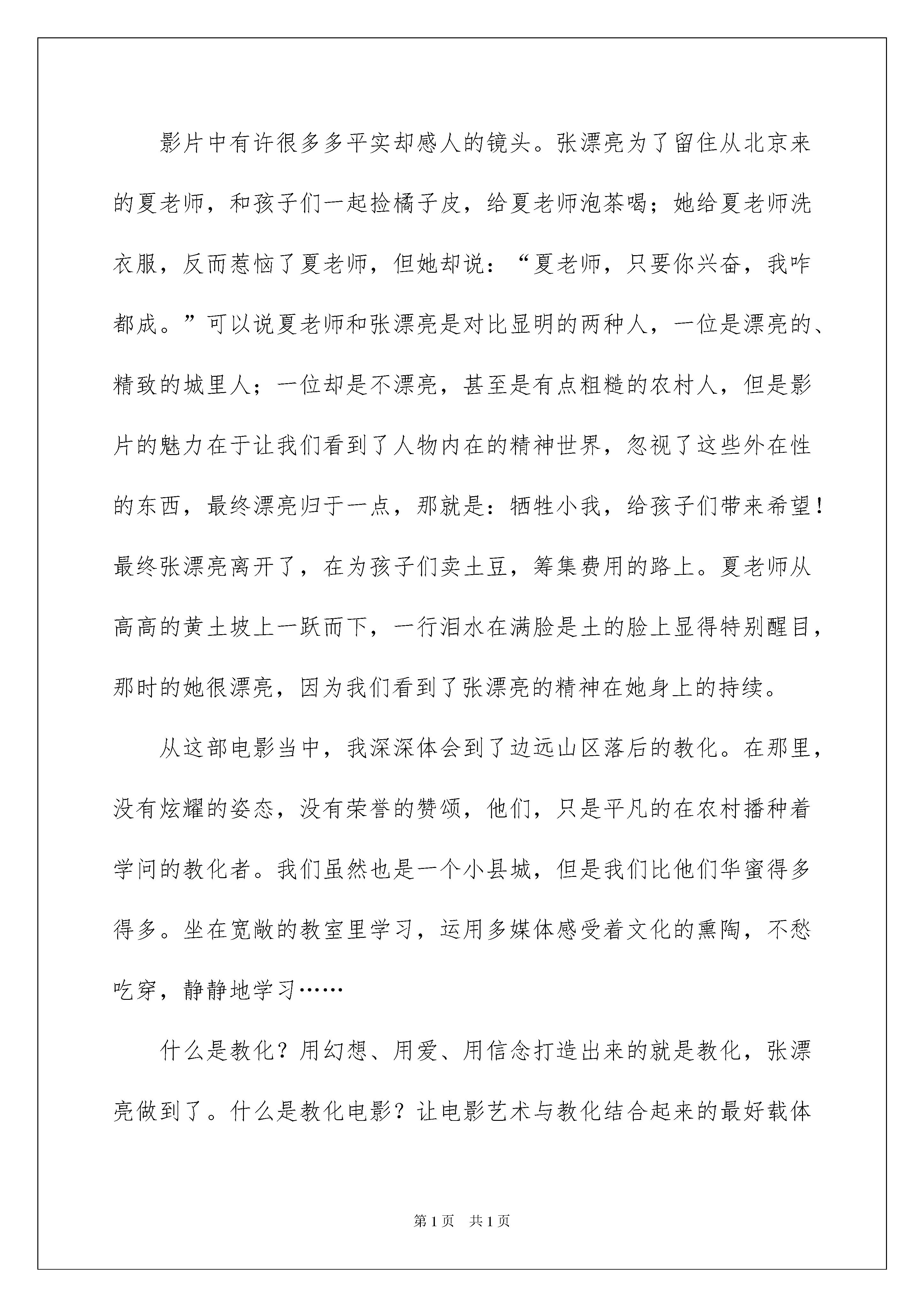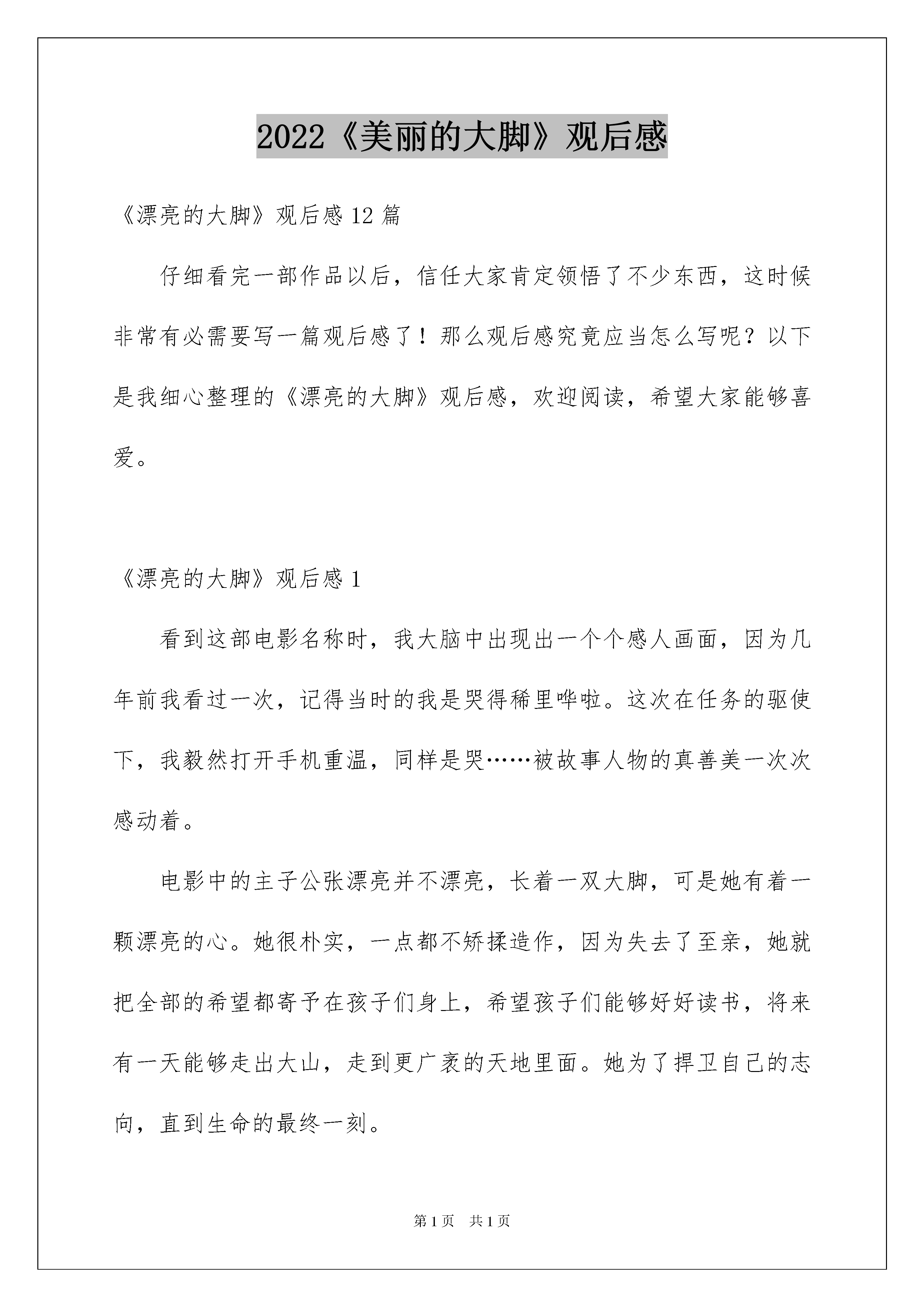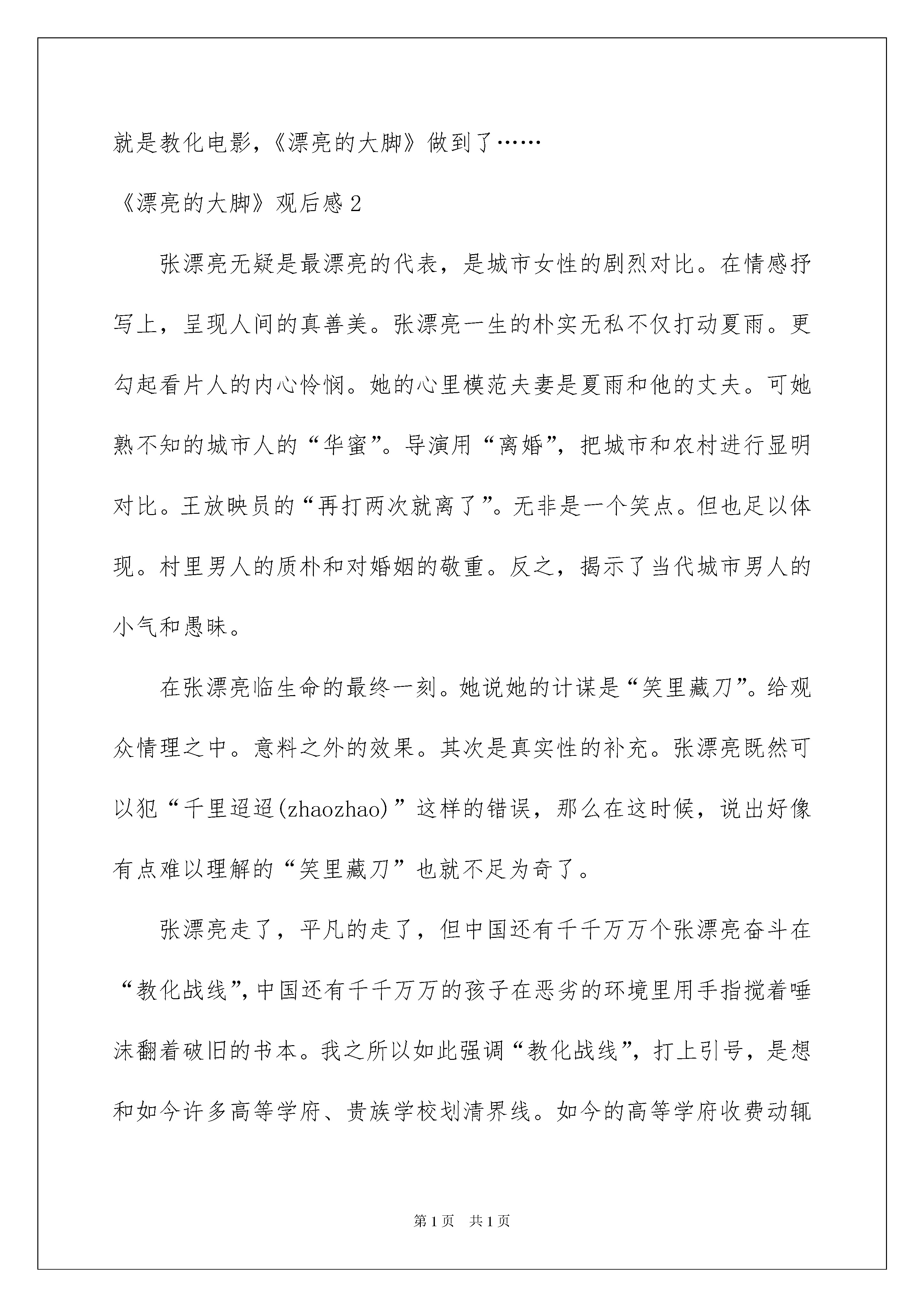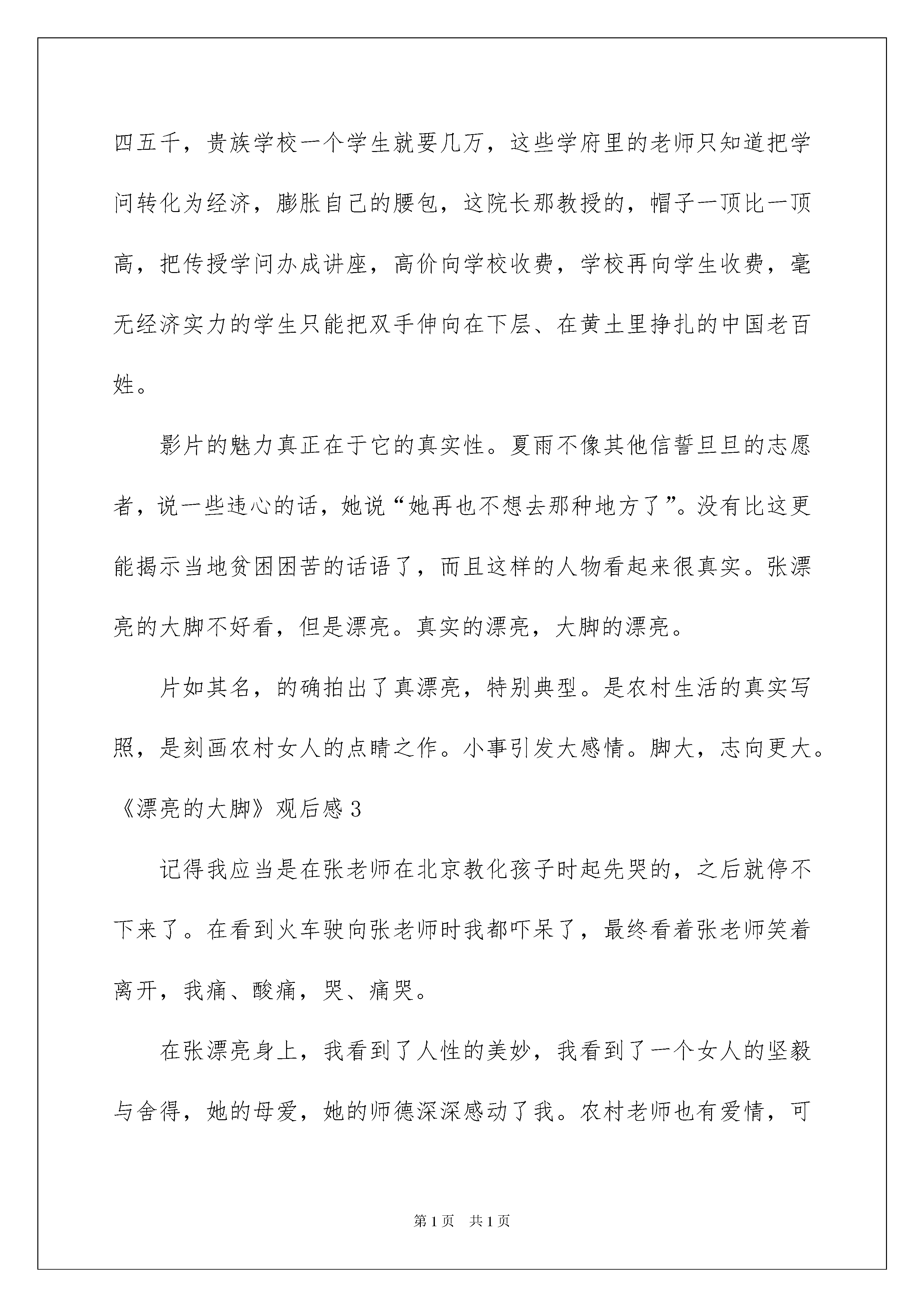 2022《美丽的大脚》观后感《漂亮的大脚》观后感12篇仔细看完一部作品以后,信任大家肯定领悟了不少东西,这时候非常有必需要写一篇观后感了!那么观后感究竟应当怎么写呢?以下是我细心整理的《漂亮的大脚》观后感,欢迎阅读,希望大家能够喜爱。《漂亮的大脚》观后感1看到这部电影名称时,我大脑中出现出一个个感人画面,因为几年前我看过一次,记得当时的我是哭得稀里哗啦。这次在任务的驱使下,我毅然打开手机重温,同样是哭……被故事人物的真善美一次次感动着。电影中的主子公张漂亮并不漂亮,长着一双大脚,可是她有着一颗漂亮的心。她很朴实,一点都不矫揉造作,因为失去了至亲,她就把全部的希望都寄予在孩子们身上,希望孩子们能够好好读书,将来有一天能够走出大山,走到更广袤的天地里面。她为了捍卫自己的志向,直到生命的最终一刻。影片中有许很多多平实却感人的镜头。张漂亮为了留住从北京来的夏老师,和孩子们一起捡橘子皮,给夏老师泡茶喝;她给夏老师洗衣服,反而惹恼了夏老师,但她却说:“夏老师,只要你兴奋,我咋都成。”可以说夏老师和张漂亮是对比显明的两种人,一位是漂亮的、精致的城里人;一位却是不漂亮,甚至是有点粗糙的农村人,但是影片的魅力在于让我们看到了人物内在的精神世界,忽视了这些外在性的东西,最终漂亮归于一点,那就是:牺牲小我,给孩子们带来希望!最终张漂亮离开了,在为孩子们卖土豆,筹集费用的路上。夏老师从高高的黄土坡上一跃而下,一行泪水在满脸是土的脸上显得特别醒目,那时的她很漂亮,因为我们看到了张漂亮的精神在她身上的持续。从这部电影当中,我深深体会到了边远山区落后的教化。在那里,没有炫耀的姿态,没有荣誉的赞颂,他们,只是平凡的在农村播种着学问的教化者。我们虽然也是一个小县城,但是我们比他们华蜜得多得多。坐在宽敞的教室里学习,运用多媒体感受着文化的熏陶,不愁吃穿,静静地学习……什么是教化?用幻想、用爱、用信念打造出来的就是教化,张漂亮做到了。什么是教化电影?让电影艺术与教化结合起来的最好载体就是教化电影,《漂亮的大脚》做到了……《漂亮的大脚》观后感2张漂亮无疑是最漂亮的代表,是城市女性的剧烈对比。在情感抒写上,呈现人间的真善美。张漂亮一生的朴实无私不仅打动夏雨。更勾起看片人的内心怜悯。她的心里模范夫妻是夏雨和他的丈夫。可她熟不知的城市人的“华蜜”。导演用“离婚”,把城市和农村进行显明对比。王放映员的“再打两次就离了”。无非是一个笑点。但也足以体现。村里男人的质朴和对婚姻的敬重。反之,揭示了当代城市男人的小气和愚昧。在张漂亮临生命的最终一刻。她说她的计谋是“笑里藏刀”。给观众情理之中。意料之外的效果。其次是真实性的补充。张漂亮既然可以犯“千里迢迢(zhaozhao)”这样的错误,那么在这时候,说出好像有点难以理解的“笑里藏刀”也就不足为奇了。张漂亮走了,平凡的走了,但中国还有千千万万个张漂亮奋斗在“教化战线”,中国还有千千万万的孩子在恶劣的环境里用手指搅着唾沫翻着破旧的书本。我之所以如此强调“教化战线”,打上引号,是想和如今许多高等学府、贵族学校划清界线。如今的高等学府收费动辄四五千,贵族学校一个学生就要几万,这些学府里的老师只知道把学问转化为经济,膨胀自己的腰包,这院长那教授的,帽子一顶比一顶高,把传授学问办成讲座,高价向学校收费,学校再向学生收费,毫无经济实力的学生只能把双手伸向在下层、在黄土里挣扎的中国老百姓。影片的魅力真正在于它的真实性。夏雨不像其他信誓旦旦的志愿者,说一些违心的话,她说“她再也不想去那种地方了”。没有比这更能揭示当地贫困困苦的话语了,而且这样的人物看起来很真实。张漂亮的大脚不好看,但是漂亮。真实的漂亮,大脚的漂亮。片如其名,的确拍出了真漂亮,特别典型。是农村生活的真实写照,是刻画农村女人的点睛之作。小事引发大感情。脚大,志向更大。《漂亮的大脚》观后感3记得我应当是在张老师在北京教化孩子时起先哭的,之后就停不下来了。在看到火车驶向张老师时我都吓呆了,最终看着张老师笑着离开,我痛、酸痛,哭、痛哭。在张漂亮身上,我看到了人性的美妙,我看到了一个女人的坚毅与舍得,她的母爱,她的师德深深感动了我。农村老师也有爱情,可是她的爱情来之不易,透射着人生的无奈。张漂亮是最漂亮的,她是平凡而宏大的,她也肯定是最胜利的,我信任她带的孩子肯定会出息的。在夏雨身上,我仿佛看到了自己,可我还没有她的志气,她做得已经够好了,当她对孩子们说都走时我感动了,我觉得她好帅气。她为了孩子,最终和心爱的爱人离婚了,这也是无奈,生活中有太多的无奈。张漂亮艳羡夏雨城里的爱情,但她不知道其实夏雨城里的爱情已经裂开了,倒是在乡村里,在张漂亮