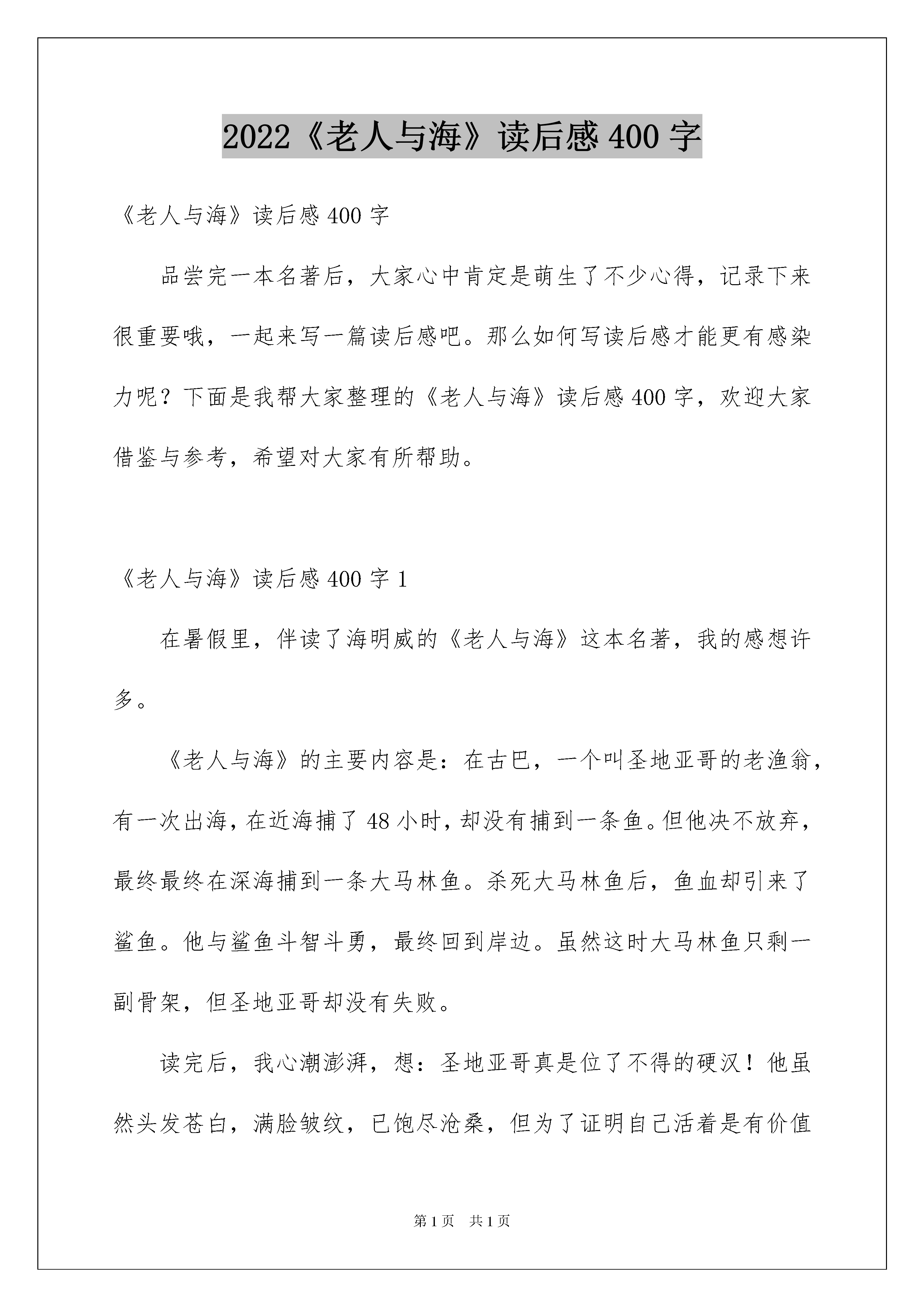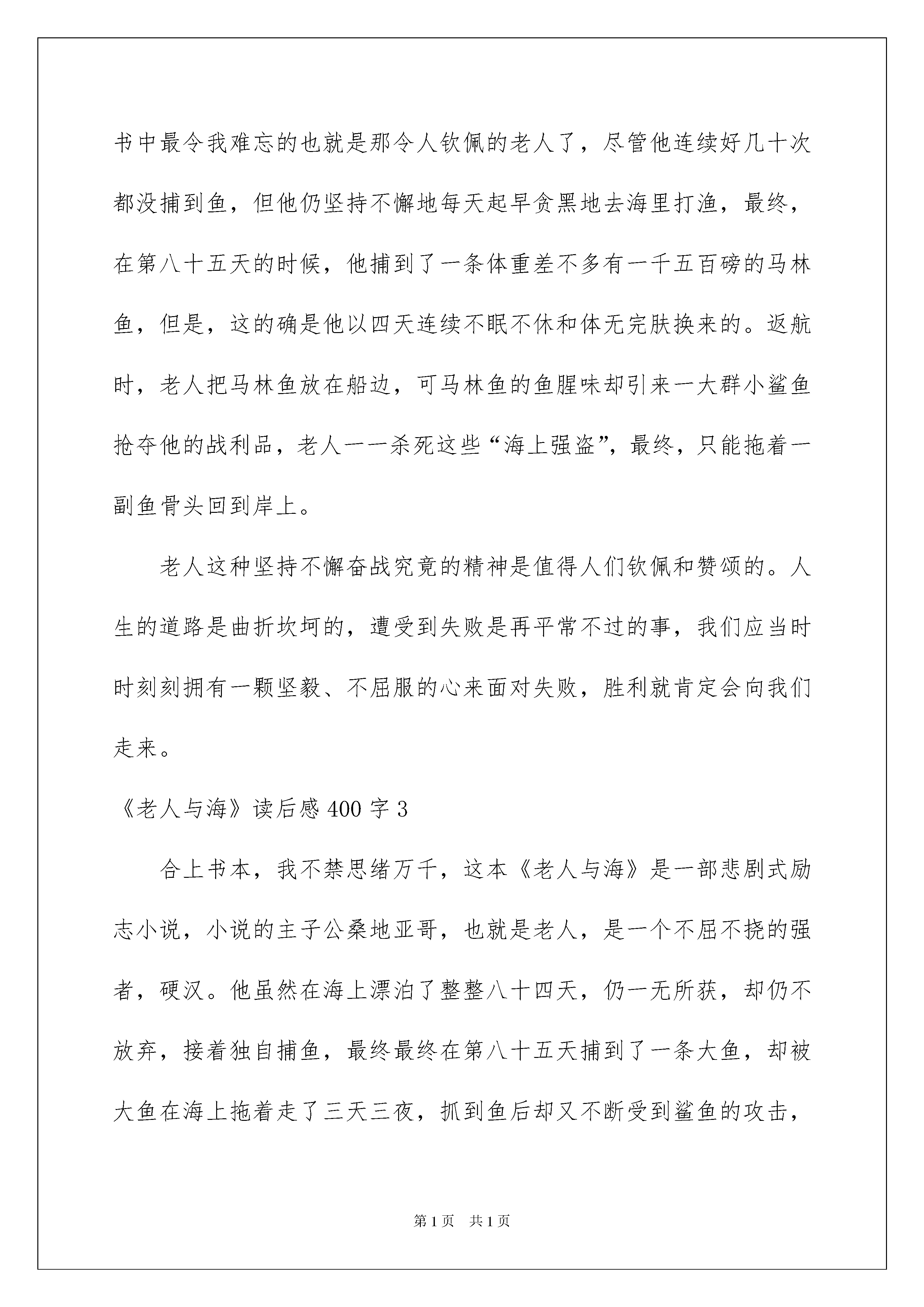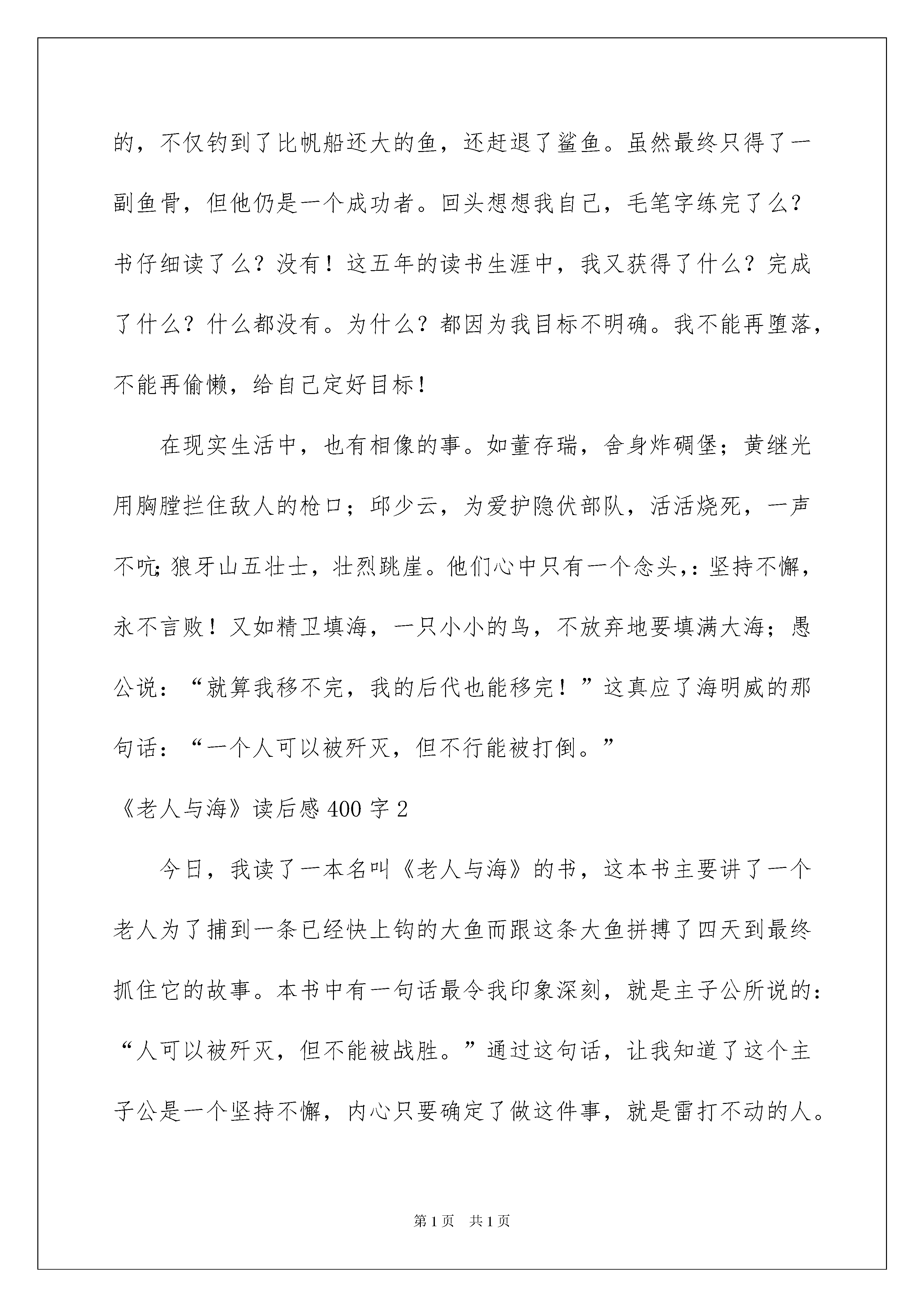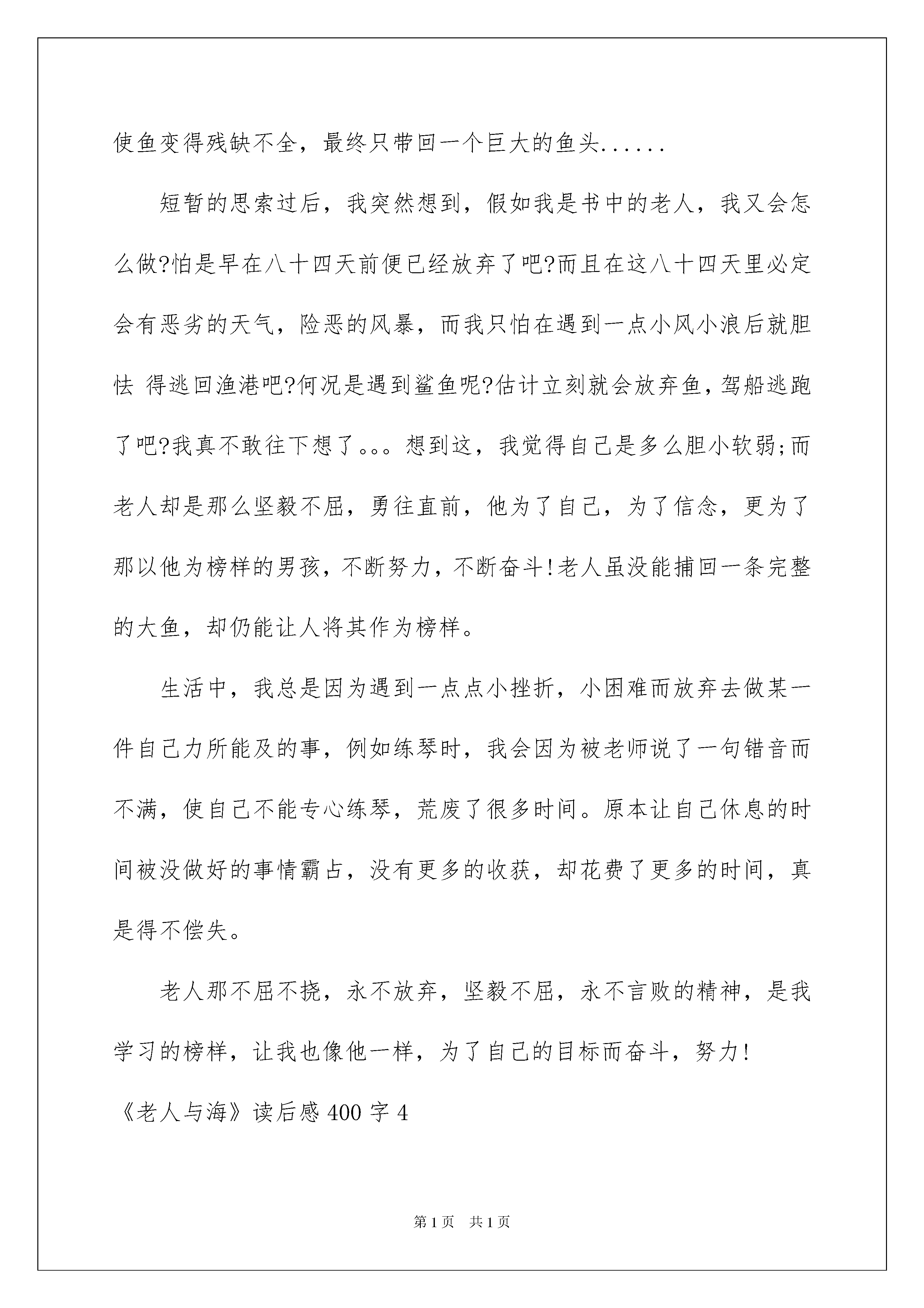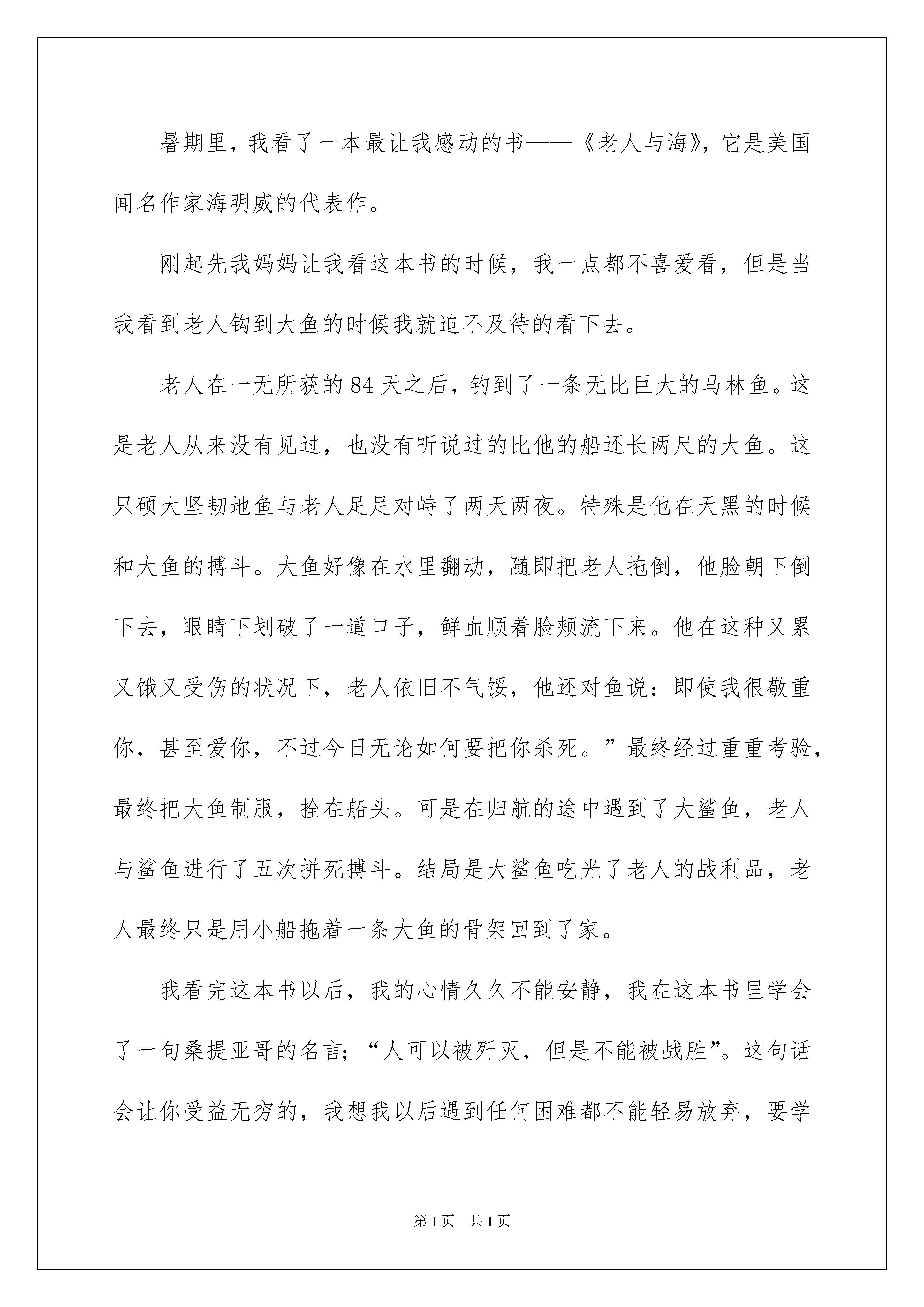2022《老人与海》读后感400字《老人与海》读后感400字品尝完一本名著后,大家心中肯定是萌生了不少心得,记录下来很重要哦,一起来写一篇读后感吧。那么如何写读后感才能更有感染力呢?下面是我帮大家整理的《老人与海》读后感400字,欢迎大家借鉴与参考,希望对大家有所帮助。《老人与海》读后感400字1在暑假里,伴读了海明威的《老人与海》这本名著,我的感想许多。《老人与海》的主要内容是:在古巴,一个叫圣地亚哥的老渔翁,有一次出海,在近海捕了48小时,却没有捕到一条鱼。但他决不放弃,最终最终在深海捕到一条大马林鱼。杀死大马林鱼后,鱼血却引来了鲨鱼。他与鲨鱼斗智斗勇,最终回到岸边。虽然这时大马林鱼只剩一副骨架,但圣地亚哥却没有失败。读完后,我心潮澎湃,想:圣地亚哥真是位了不得的硬汉!他虽然头发苍白,满脸皱纹,已饱尽沧桑,但为了证明自己活着是有价值的,不仅钓到了比帆船还大的鱼,还赶退了鲨鱼。虽然最终只得了一副鱼骨,但他仍是一个成功者。回头想想我自己,毛笔字练完了么?书仔细读了么?没有!这五年的读书生涯中,我又获得了什么?完成了什么?什么都没有。为什么?都因为我目标不明确。我不能再堕落,不能再偷懒,给自己定好目标!在现实生活中,也有相像的事。如董存瑞,舍身炸碉堡;黄继光用胸膛拦住敌人的枪口;邱少云,为爱护隐伏部队,活活烧死,一声不吭;狼牙山五壮士,壮烈跳崖。他们心中只有一个念头,:坚持不懈,永不言败!又如精卫填海,一只小小的鸟,不放弃地要填满大海;愚公说:“就算我移不完,我的后代也能移完!”这真应了海明威的那句话:“一个人可以被歼灭,但不行能被打倒。”《老人与海》读后感400字2今日,我读了一本名叫《老人与海》的书,这本书主要讲了一个老人为了捕到一条已经快上钩的大鱼而跟这条大鱼拼搏了四天到最终抓住它的故事。本书中有一句话最令我印象深刻,就是主子公所说的:“人可以被歼灭,但不能被战胜。”通过这句话,让我知道了这个主子公是一个坚持不懈,内心只要确定了做这件事,就是雷打不动的人。书中最令我难忘的也就是那令人钦佩的老人了,尽管他连续好几十次都没捕到鱼,但他仍坚持不懈地每天起早贪黑地去海里打渔,最终,在第八十五天的时候,他捕到了一条体重差不多有一千五百磅的马林鱼,但是,这的确是他以四天连续不眠不休和体无完肤换来的。返航时,老人把马林鱼放在船边,可马林鱼的鱼腥味却引来一大群小鲨鱼抢夺他的战利品,老人一一杀死这些“海上强盗”,最终,只能拖着一副鱼骨头回到岸上。老人这种坚持不懈奋战究竟的精神是值得人们钦佩和赞颂的。人生的道路是曲折坎坷的,遭受到失败是再平常不过的事,我们应当时时刻刻拥有一颗坚毅、不屈服的心来面对失败,胜利就肯定会向我们走来。《老人与海》读后感400字3合上书本,我不禁思绪万千,这本《老人与海》是一部悲剧式励志小说,小说的主子公桑地亚哥,也就是老人,是一个不屈不挠的强者,硬汉。他虽然在海上漂泊了整整八十四天,仍一无所获,却仍不放弃,接着独自捕鱼,最终最终在第八十五天捕到了一条大鱼,却被大鱼在海上拖着走了三天三夜,抓到鱼后却又不断受到鲨鱼的攻击,使鱼变得残缺不全,最终只带回一个巨大的鱼头......短暂的思索过后,我突然想到,假如我是书中的老人,我又会怎么做?怕是早在八十四天前便已经放弃了吧?而且在这八十四天里必定会有恶劣的天气,险恶的风暴,而我只怕在遇到一点小风小浪后就胆怯得逃回渔港吧?何况是遇到鲨鱼呢?估计立刻就会放弃鱼,驾船逃跑了吧?我真不敢往下想了。。。想到这,我觉得自己是多么胆小软弱;而老人却是那么坚毅不屈,勇往直前,他为了自己,为了信念,更为了那以他为榜样的男孩,不断努力,不断奋斗!老人虽没能捕回一条完整的大鱼,却仍能让人将其作为榜样。生活中,我总是因为遇到一点点小挫折,小困难而放弃去做某一件自己力所能及的事,例如练琴时,我会因为被老师说了一句错音而不满,使自己不能专心练琴,荒废了很多时间。原本让自己休息的时间被没做好的事情霸占,没有更多的收获,却花费了更多的时间,真是得不偿失。老人那不屈不挠,永不放弃,坚毅不屈,永不言败的精神,是我学习的榜样,让我也像他一样,为了自己的目标而奋斗,努力!《老人与海》读后感400字4暑期里,我看了一本最让我感动的书——《老人与海》,它是美国闻名作家海明威的代表作。刚起先我妈妈让我看这本书的时候,我一点都不喜爱看,但是当我看到老人钩到大鱼的时候我就迫不及待的看下去。老人在一无所获的84天之后,钓到了一条无比巨大的马林鱼。这是老人从来没有见过,也没有听说过的比他的船还长两尺的大鱼。这只硕大坚韧地鱼与老人足足对峙了两天两夜。特殊是他在天黑的时候和大鱼