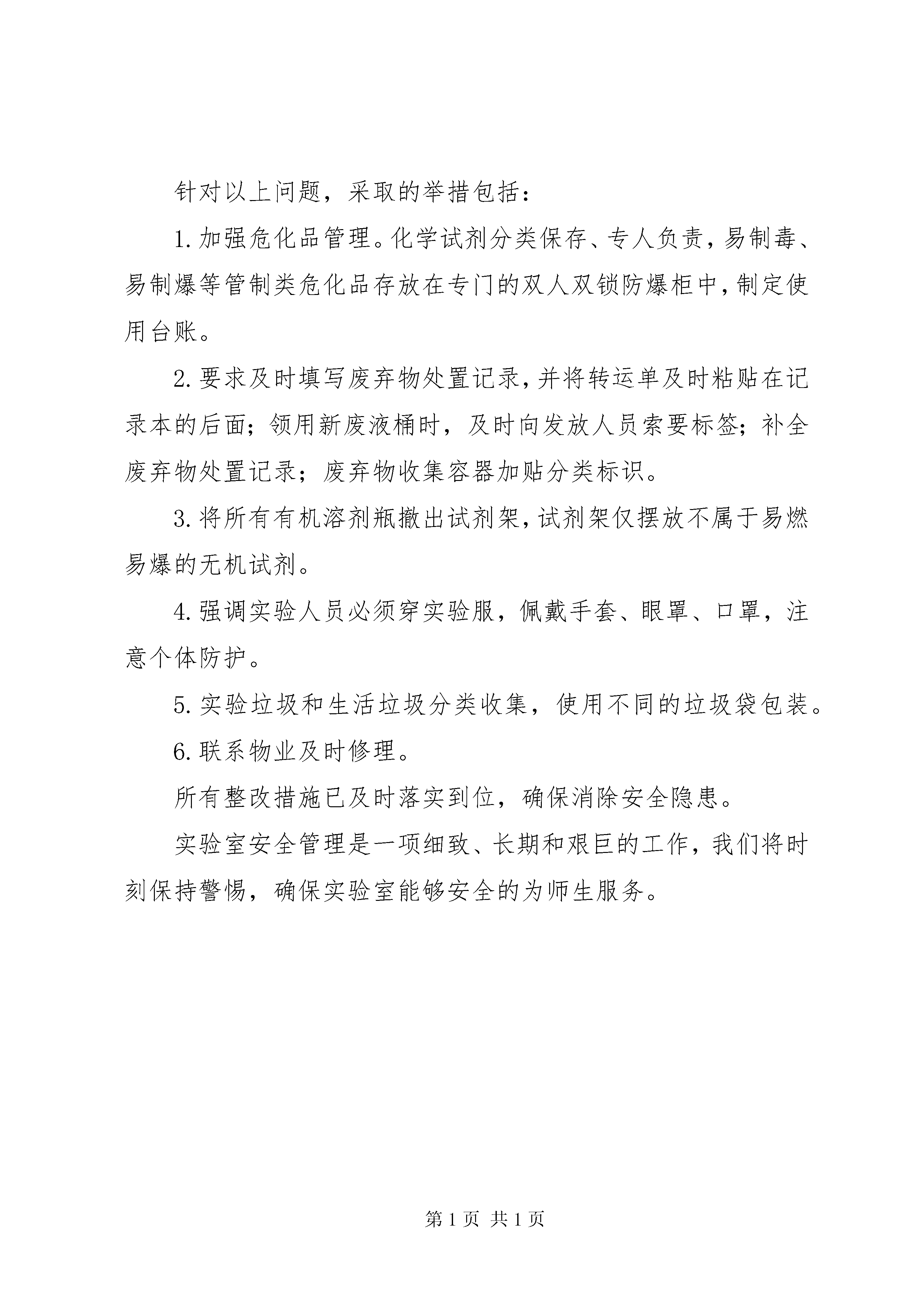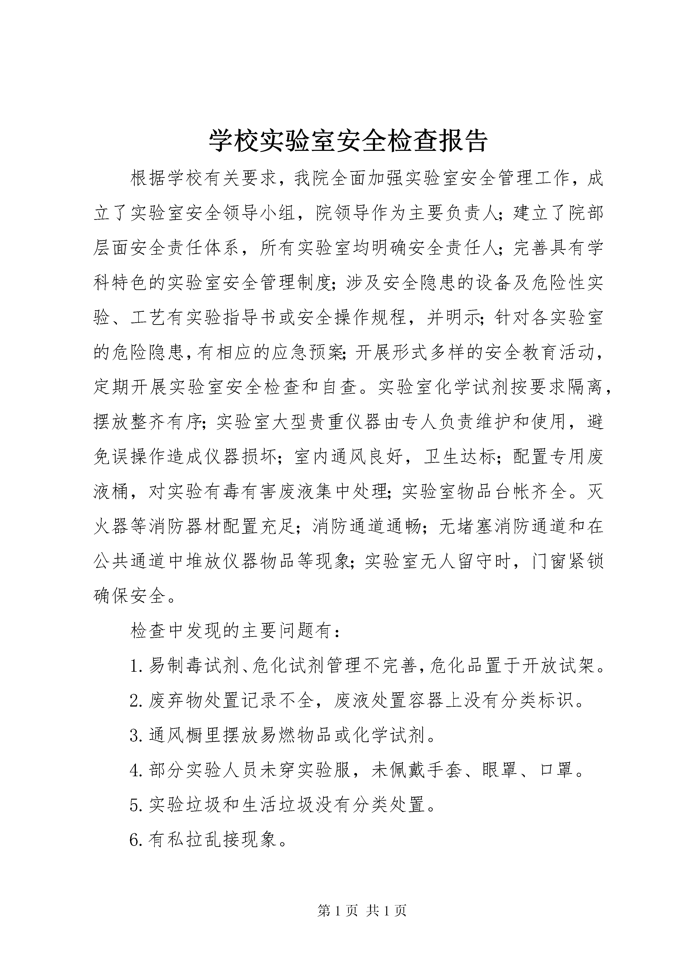 学校实验室安全检查报告根据学校有关要求,我院全面加强实验室安全管理工作,成立了实验室安全领导小组,院领导作为主要负责人;建立了院部层面安全责任体系,所有实验室均明确安全责任人;完善具有学科特色的实验室安全管理制度;涉及安全隐患的设备及危险性实验、工艺有实验指导书或安全操作规程,并明示;针对各实验室的危险隐患,有相应的应急预案;开展形式多样的安全教育活动,定期开展实验室安全检查和自查。实验室化学试剂按要求隔离,摆放整齐有序;实验室大型贵重仪器由专人负责维护和使用,避免误操作造成仪器损坏;室内通风良好,卫生达标;配置专用废液桶,对实验有毒有害废液集中处理;实验室物品台帐齐全。灭火器等消防器材配置充足;消防通道通畅;无堵塞消防通道和在公共通道中堆放仪器物品等现象;实验室无人留守时,门窗紧锁确保安全。检查中发现的主要问题有:1.易制毒试剂、危化试剂管理不完善,危化品置于开放试架。2.废弃物处置记录不全,废液处置容器上没有分类标识。3.通风橱里摆放易燃物品或化学试剂。4.部分实验人员未穿实验服,未佩戴手套、眼罩、口罩。5.实验垃圾和生活垃圾没有分类处置。6.有私拉乱接现象。针对以上问题,采取的举措包括:1.加强危化品管理。化学试剂分类保存、专人负责,易制毒、易制爆等管制类危化品存放在专门的双人双锁防爆柜中,制定使用台账。2.要求及时填写废弃物处置记录,并将转运单及时粘贴在记录本的后面;领用新废液桶时,及时向发放人员索要标签;补全废弃物处置记录;废弃物收集容器加贴分类标识。3.将所有有机溶剂瓶撤出试剂架,试剂架仅摆放不属于易燃易爆的无机试剂。4.强调实验人员必须穿实验服,佩戴手套、眼罩、口罩,注意个体防护。5.实验垃圾和生活垃圾分类收集,使用不同的垃圾袋包装。6.联系物业及时修理。所有整改措施已及时落实到位,确保消除安全隐患。实验室安全管理是一项细致、长期和艰巨的工作,我们将时刻保持警惕,确保实验室能够安全的为师生服务。