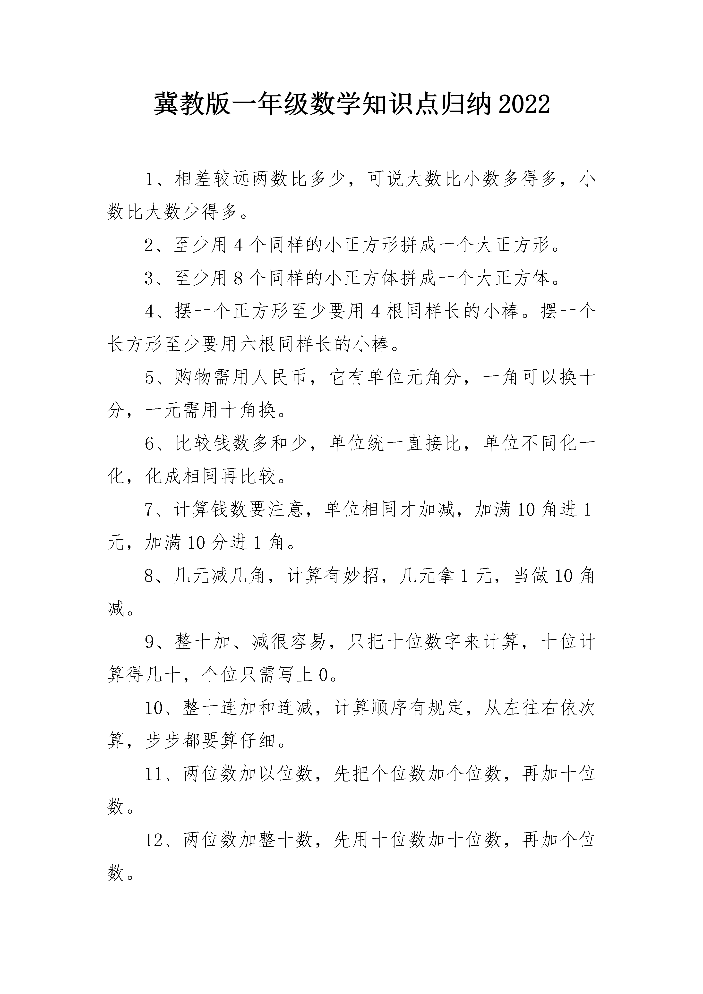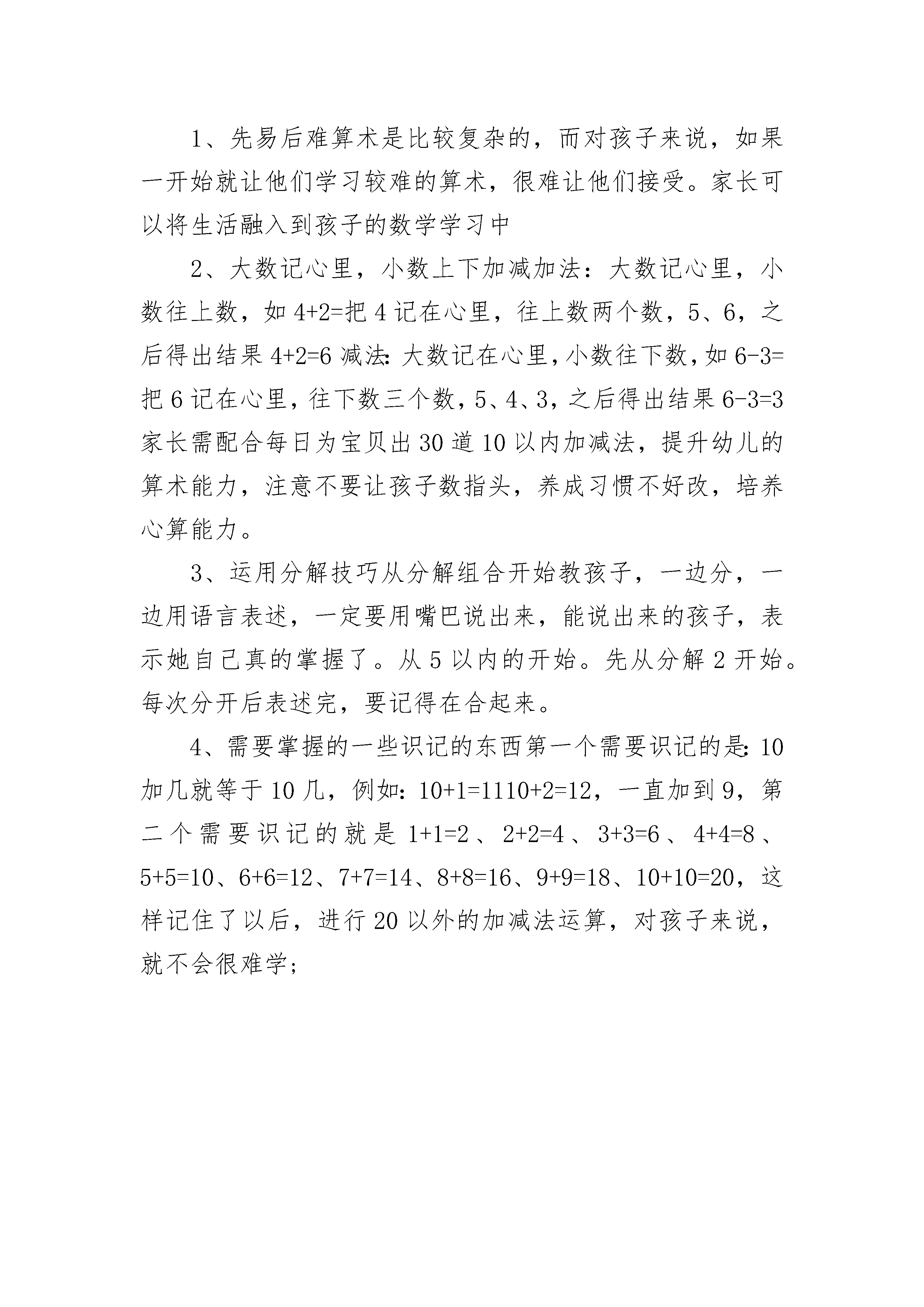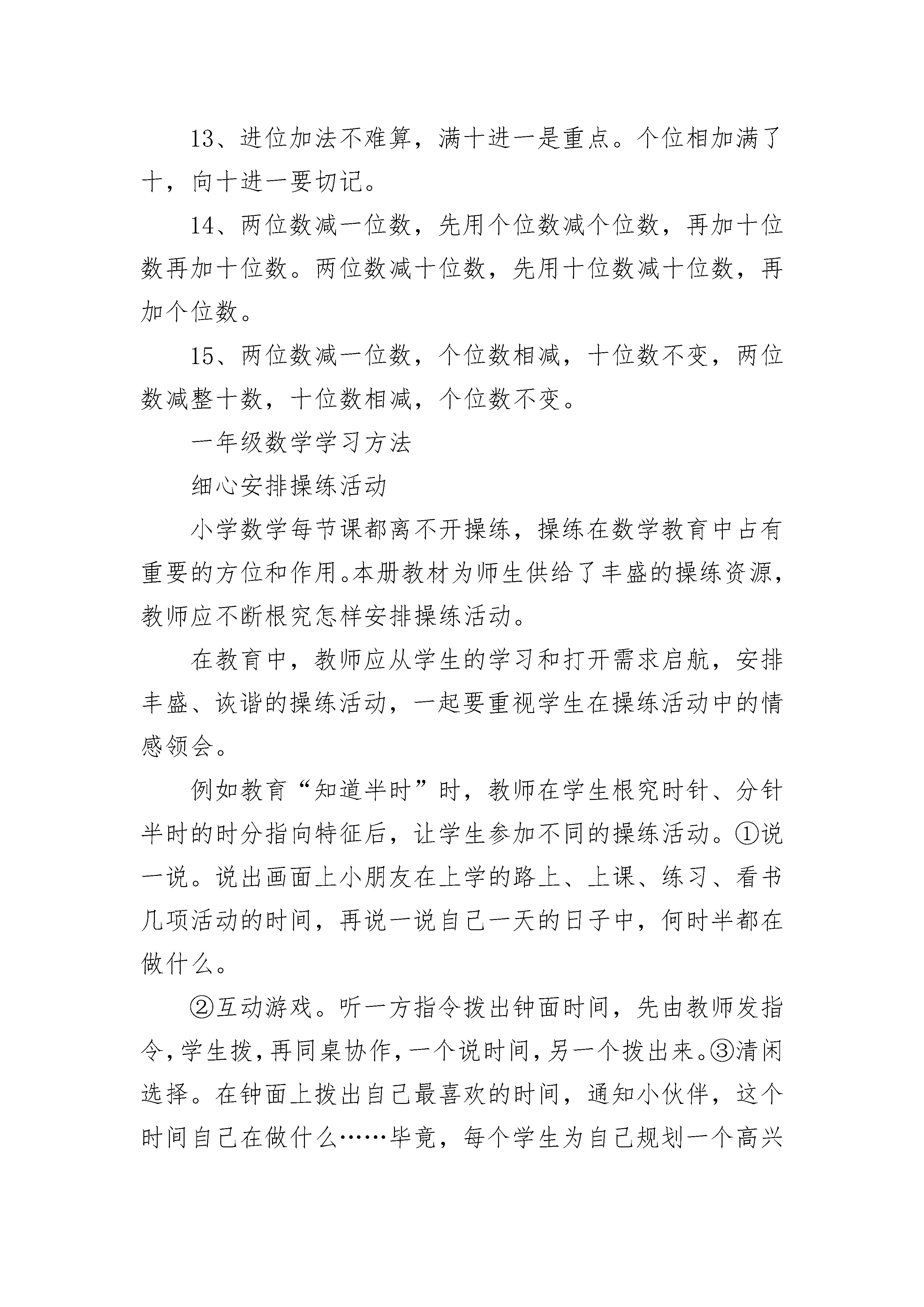冀教版一年级数学知识点归纳20221、相差较远两数比多少,可说大数比小数多得多,小数比大数少得多。2、至少用4个同样的小正方形拼成一个大正方形。3、至少用8个同样的小正方体拼成一个大正方体。4、摆一个正方形至少要用4根同样长的小棒。摆一个长方形至少要用六根同样长的小棒。5、购物需用人民币,它有单位元角分,一角可以换十分,一元需用十角换。6、比较钱数多和少,单位统一直接比,单位不同化一化,化成相同再比较。7、计算钱数要注意,单位相同才加减,加满10角进1元,加满10分进1角。8、几元减几角,计算有妙招,几元拿1元,当做10角减。9、整十加、减很容易,只把十位数字来计算,十位计算得几十,个位只需写上0。10、整十连加和连减,计算顺序有规定,从左往右依次算,步步都要算仔细。11、两位数加以位数,先把个位数加个位数,再加十位数。12、两位数加整十数,先用十位数加十位数,再加个位数。13、进位加法不难算,满十进一是重点。个位相加满了十,向十进一要切记。14、两位数减一位数,先用个位数减个位数,再加十位数再加十位数。两位数减十位数,先用十位数减十位数,再加个位数。15、两位数减一位数,个位数相减,十位数不变,两位数减整十数,十位数相减,个位数不变。一年级数学学习方法细心安排操练活动小学数学每节课都离不开操练,操练在数学教育中占有重要的方位和作用。本册教材为师生供给了丰盛的操练资源,教师应不断根究怎样安排操练活动。在教育中,教师应从学生的学习和打开需求启航,安排丰盛、诙谐的操练活动,一起要重视学生在操练活动中的情感领会。例如教育“知道半时”时,教师在学生根究时针、分针半时的时分指向特征后,让学生参加不同的操练活动。①说一说。说出画面上小朋友在上学的路上、上课、练习、看书几项活动的时间,再说一说自己一天的日子中,何时半都在做什么。②互动游戏。听一方指令拨出钟面时间,先由教师发指令,学生拨,再同桌协作,一个说时间,另一个拨出来。③清闲选择。在钟面上拨出自己最喜欢的时间,通知小伙伴,这个时间自己在做什么……毕竟,每个学生为自己规划一个高兴的星期天。每项活动环环紧扣,而且赋有日子情味。用实践活动安靖常识,使学生感触到日子中的数学;经过实践活动,激起学生学数学、用数学的喜欢,一起逐步构成实践知道和运用知道。重视超卓学习习气的培育学习习气直接影响着学生学习的好坏,影响着才华、性情的打开。学生的超卓学习习气,是在日复一日的学习活动中逐步构成的。它离不开教师的引导和帮助。每一位数学教师都应充沛重视学生超卓学习习气的构成,把对学生进行超卓学习习气的培育贯穿在教育的全进程。例如教育“数一数”时,教师捉住学生入学的第一节课,充沛运用“美丽的校园”的画面资源,教训学生看图数数。由学生清闲查询数数到有序查询数数,让学生领会数数的办法。在这个活动中,由教师重复提问“还有什么?”使学生了解要细心、细心地查询。而且,经过对学生的赞誉——“这些同学查询得很细心,干事很细心”,让学生领会到这些是超卓习气。再如教育写“0”时,教师让学生查询“0”,并用自己的言语描绘0的形状,给学生叙说、演示0的写法。之后,安排了书空,描0,独立写0,使学生逐步构成写0的技术。在写0的学习活动中,教师请学生对小伙伴写的0进行点评,使学生进一步清楚怎样才华写好。还特意安排了“你以为写0时应留神什么?”“想给咱班小朋友说些什么?”的沟通活动。学生把自己写0的经历领会,归纳进步,说给全班的同学。学生在写0的学习活动中,经过查询、倾听,了解0的写法,经过书写、点评、沟通清楚书写0的标准要求,一起经历领会要细心书写的行为要求。“写0”的教育活动打破了以往机械书写的格局,使学生在取得写0技术的一起,在数学考虑、言语沟通、情感心情和超卓行为习气方面都取得打开。小学一年级数学加减法方法技巧一1、首先要看看孩子的数学教科书,从书中可以知道孩子是通过哪种方式学习的。不要随便按自己的方式去教孩子,如果孩子理解能力强,他可能接受了,如果差一点,孩子只会更加混乱。2、多跟孩子聊聊,要让孩子明白什么是加法什么是减法,加减可以通过给孩子玩具来教他,给孩子一个玩具就是加,拿走一个玩具就是减。孩子理解加减的能力可以在平时的生活中多加渗透。3、在做题时和孩子沟通,了解他对哪些题不懂,具体到某一类题,然后多对这一类题进行讲解。在讲题的过程中,要有耐心,不要因为孩子理解不了就批评孩子,或者骂孩子笨,这是最不可取的。4、平时要多对孩子鼓励,锻炼孩子的理解能力,还要提高孩子的专注力,孩子不一定不会,只是上课不认真听讲,导致课程跟不上,失掉信心了。二1、先易后难算术是比较复杂的,而对孩子来说,如果一开始就让他们学习较难的算术,很难让他们接受。家长可以将生活融入到孩子的数学学习中2、大数记心里,小数上下加减加法:大数记心里,小数往上数,如