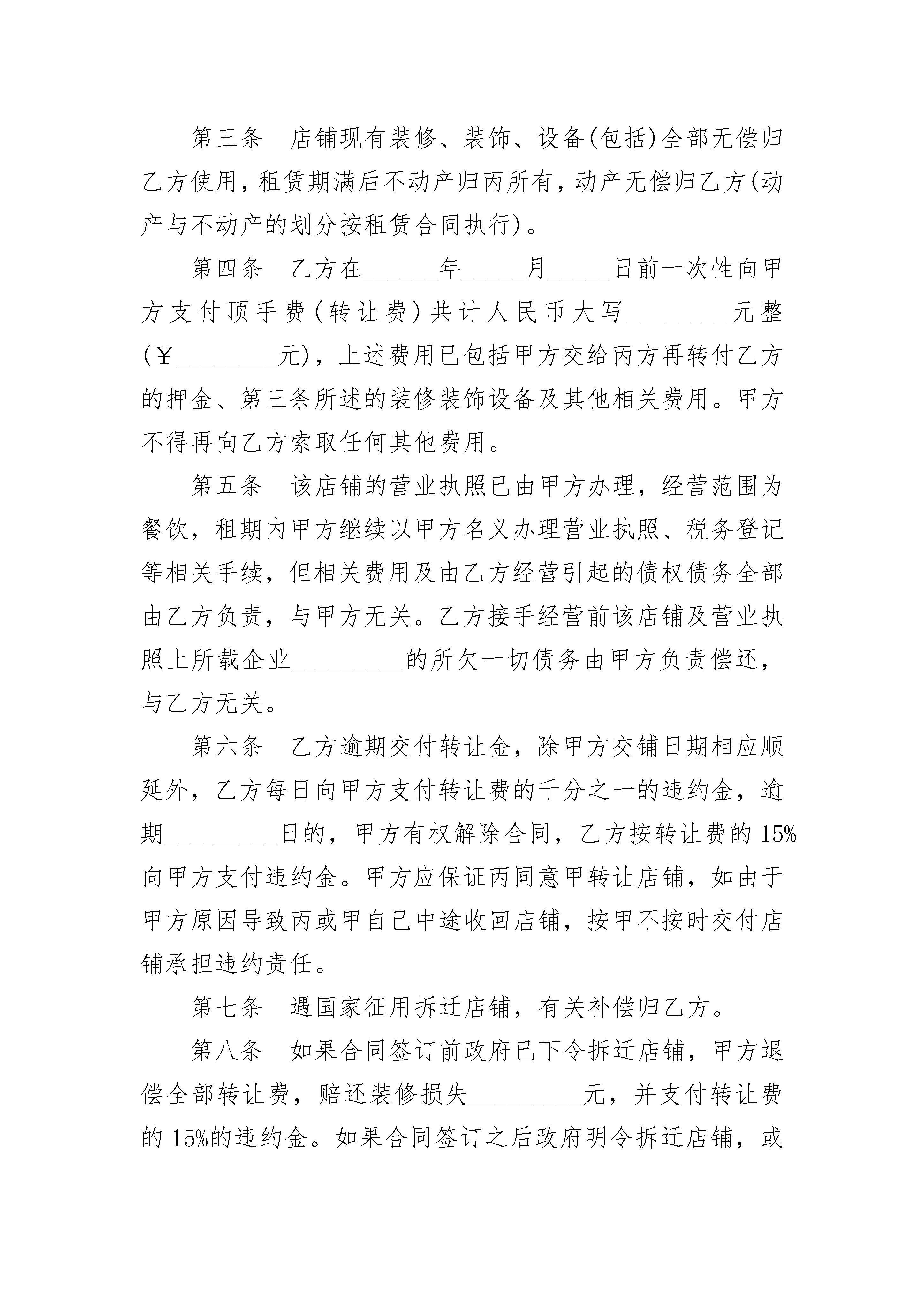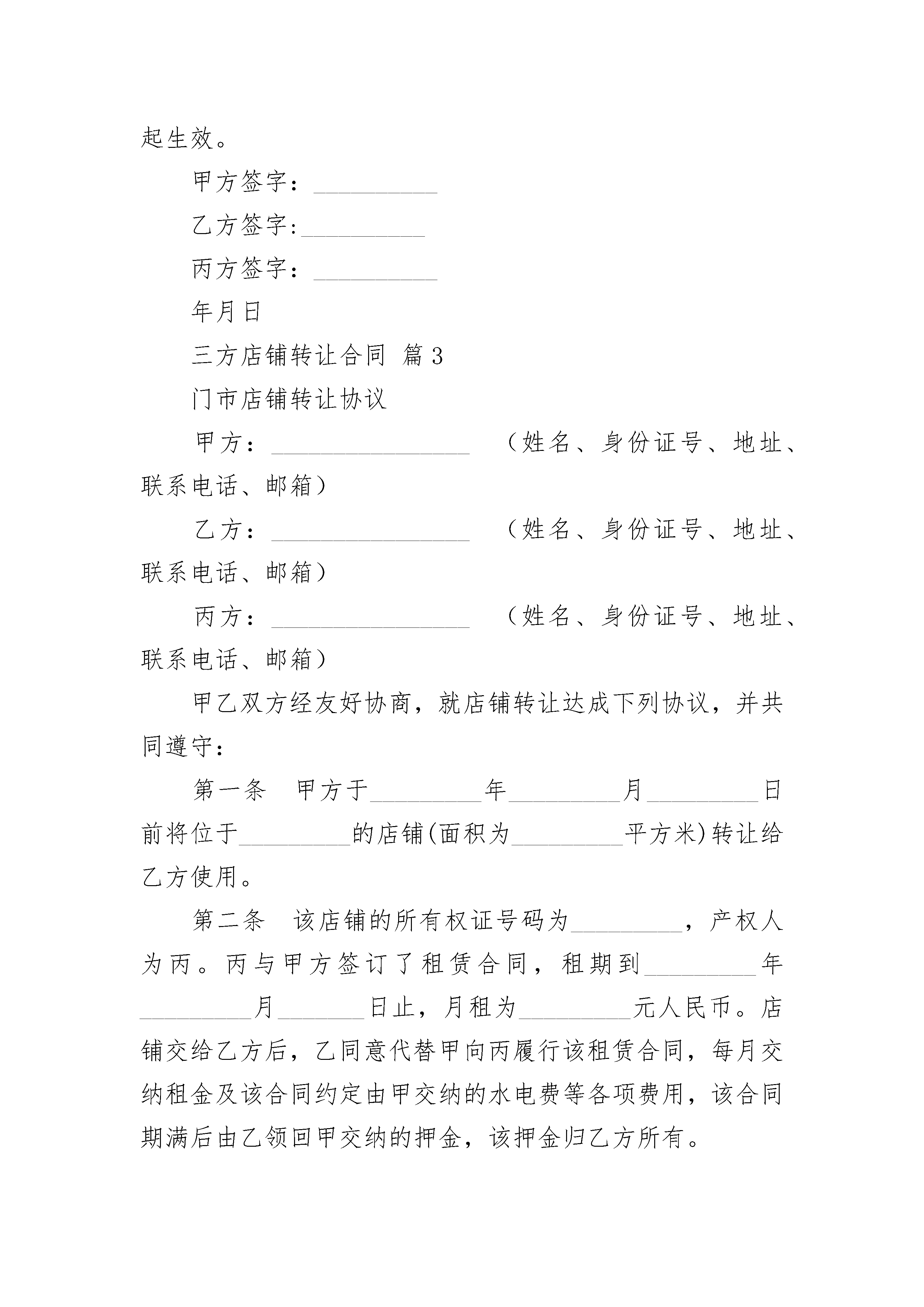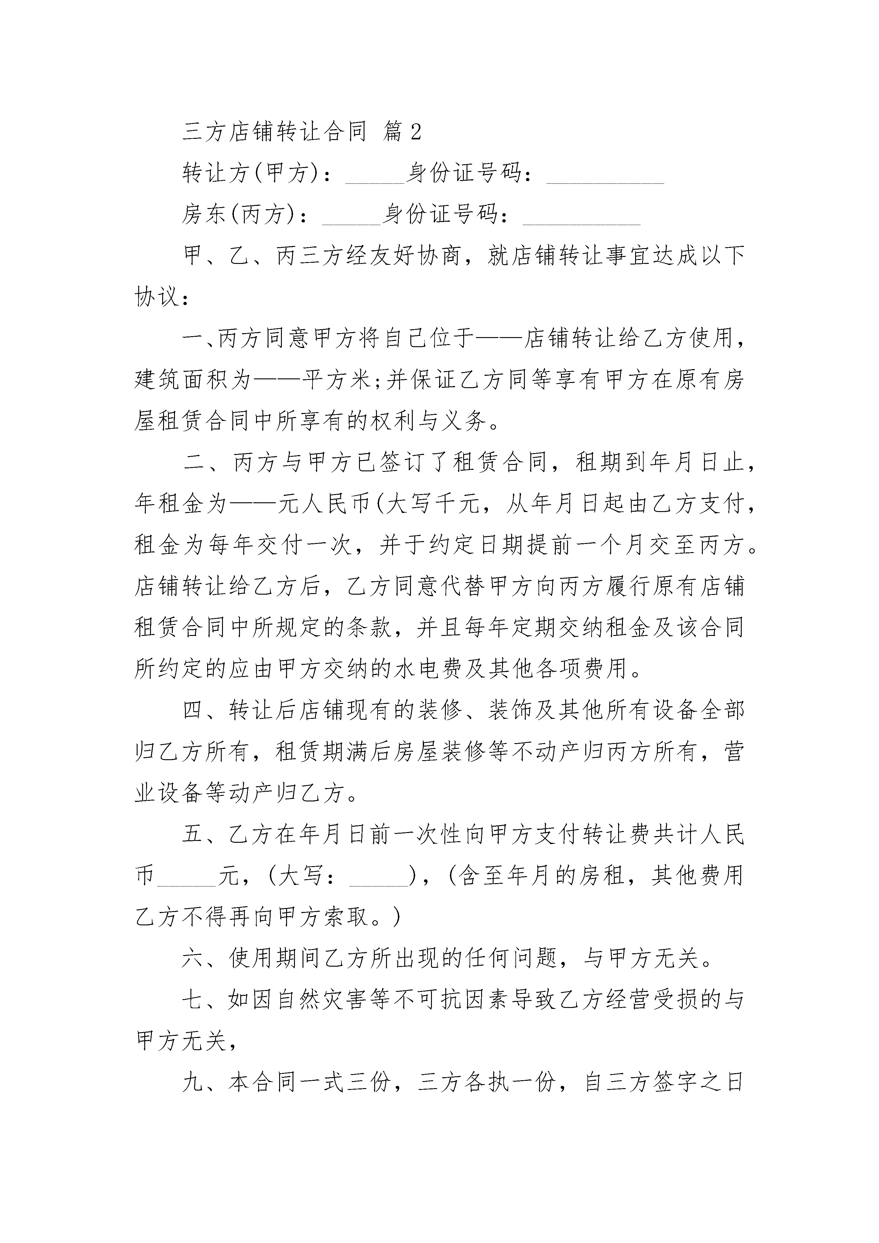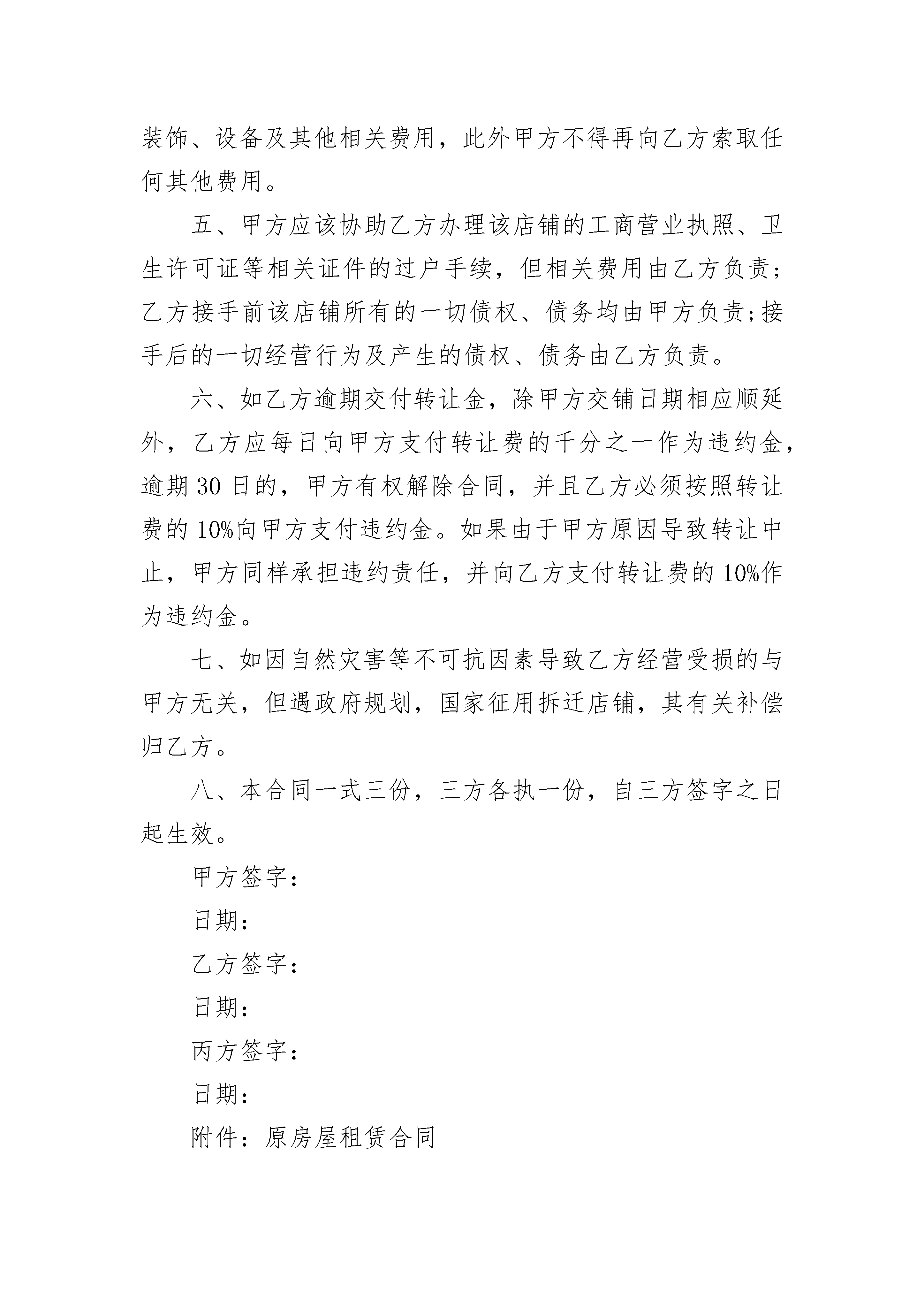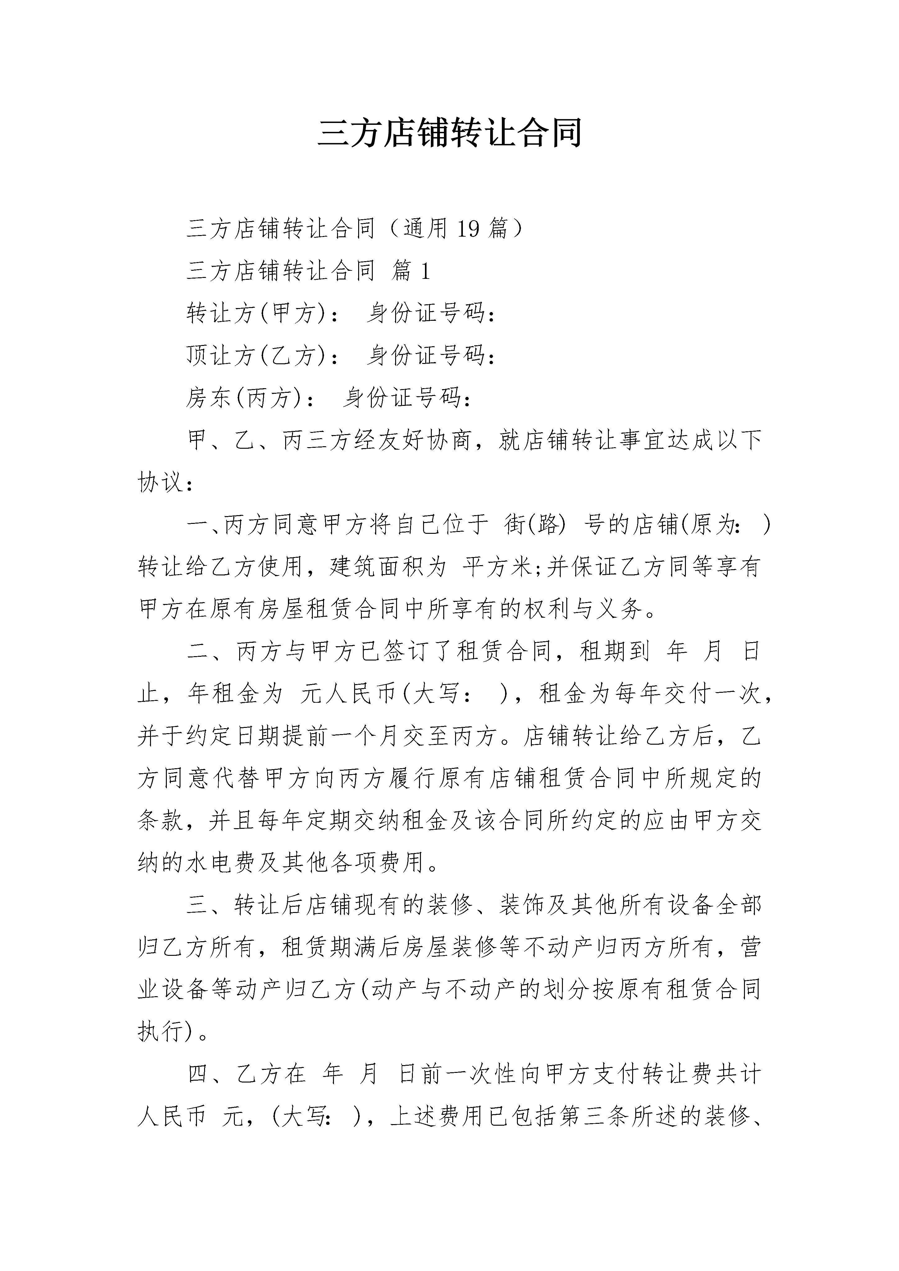 三方店铺转让合同三方店铺转让合同(通用19篇)三方店铺转让合同篇1转让方(甲方):身份证号码:顶让方(乙方):身份证号码:房东(丙方):身份证号码:甲、乙、丙三方经友好协商,就店铺转让事宜达成以下协议:一、丙方同意甲方将自己位于街(路)号的店铺(原为:)转让给乙方使用,建筑面积为平方米;并保证乙方同等享有甲方在原有房屋租赁合同中所享有的权利与义务。二、丙方与甲方已签订了租赁合同,租期到年月日止,年租金为元人民币(大写:),租金为每年交付一次,并于约定日期提前一个月交至丙方。店铺转让给乙方后,乙方同意代替甲方向丙方履行原有店铺租赁合同中所规定的条款,并且每年定期交纳租金及该合同所约定的应由甲方交纳的水电费及其他各项费用。三、转让后店铺现有的装修、装饰及其他所有设备全部归乙方所有,租赁期满后房屋装修等不动产归丙方所有,营业设备等动产归乙方(动产与不动产的划分按原有租赁合同执行)。四、乙方在年月日前一次性向甲方支付转让费共计人民币元,(大写:),上述费用已包括第三条所述的装修、装饰、设备及其他相关费用,此外甲方不得再向乙方索取任何其他费用。五、甲方应该协助乙方办理该店铺的工商营业执照、卫生许可证等相关证件的过户手续,但相关费用由乙方负责;乙方接手前该店铺所有的一切债权、债务均由甲方负责;接手后的一切经营行为及产生的债权、债务由乙方负责。六、如乙方逾期交付转让金,除甲方交铺日期相应顺延外,乙方应每日向甲方支付转让费的千分之一作为违约金,逾期30日的,甲方有权解除合同,并且乙方必须按照转让费的10%向甲方支付违约金。如果由于甲方原因导致转让中止,甲方同样承担违约责任,并向乙方支付转让费的10%作为违约金。七、如因自然灾害等不可抗因素导致乙方经营受损的与甲方无关,但遇政府规划,国家征用拆迁店铺,其有关补偿归乙方。八、本合同一式三份,三方各执一份,自三方签字之日起生效。甲方签字:日期:乙方签字:日期:丙方签字:日期:附件:原房屋租赁合同三方店铺转让合同篇2转让方(甲方):_____身份证号码:__________房东(丙方):_____身份证号码:__________甲、乙、丙三方经友好协商,就店铺转让事宜达成以下协议:一、丙方同意甲方将自己位于——店铺转让给乙方使用,建筑面积为——平方米;并保证乙方同等享有甲方在原有房屋租赁合同中所享有的权利与义务。二、丙方与甲方已签订了租赁合同,租期到年月日止,年租金为——元人民币(大写千元,从年月日起由乙方支付,租金为每年交付一次,并于约定日期提前一个月交至丙方。店铺转让给乙方后,乙方同意代替甲方向丙方履行原有店铺租赁合同中所规定的条款,并且每年定期交纳租金及该合同所约定的应由甲方交纳的水电费及其他各项费用。四、转让后店铺现有的装修、装饰及其他所有设备全部归乙方所有,租赁期满后房屋装修等不动产归丙方所有,营业设备等动产归乙方。五、乙方在年月日前一次性向甲方支付转让费共计人民币_____元,(大写:_____),(含至年月的房租,其他费用乙方不得再向甲方索取。)六、使用期间乙方所出现的任何问题,与甲方无关。七、如因自然灾害等不可抗因素导致乙方经营受损的与甲方无关,九、本合同一式三份,三方各执一份,自三方签字之日起生效。甲方签字:__________乙方签字:__________丙方签字:__________年月日三方店铺转让合同篇3门市店铺转让协议甲方:________________(姓名、身份证号、地址、联系电话、邮箱)乙方:________________(姓名、身份证号、地址、联系电话、邮箱)丙方:________________(姓名、身份证号、地址、联系电话、邮箱)甲乙双方经友好协商,就店铺转让达成下列协议,并共同遵守:第一条甲方于_________年_________月_________日前将位于_________的店铺(面积为_________平方米)转让给乙方使用。第二条该店铺的所有权证号码为_________,产权人为丙。丙与甲方签订了租赁合同,租期到_________年_________月_______日止,月租为_________元人民币。店铺交给乙方后,乙同意代替甲向丙履行该租赁合同,每月交纳租金及该合同约定由甲交纳的水电费等各项费用,该合同期满后由乙领回甲交纳的押金,该押金归乙方所有。第三条店铺现有装修、装饰、设备(包括)全部无偿归乙方使用,租赁期满后不动产归丙所有,动产无偿归乙方(动产与不动产的划分按租赁合同执行)。第四条乙方在______年_____月_____日前一次性向甲方支付顶手费(转让费)共计人民币大写________元整(¥________元),上述费用已包括甲方交给丙方再转付乙方的押金、第三条所述的装修装饰设备及其他相关费用。甲方不