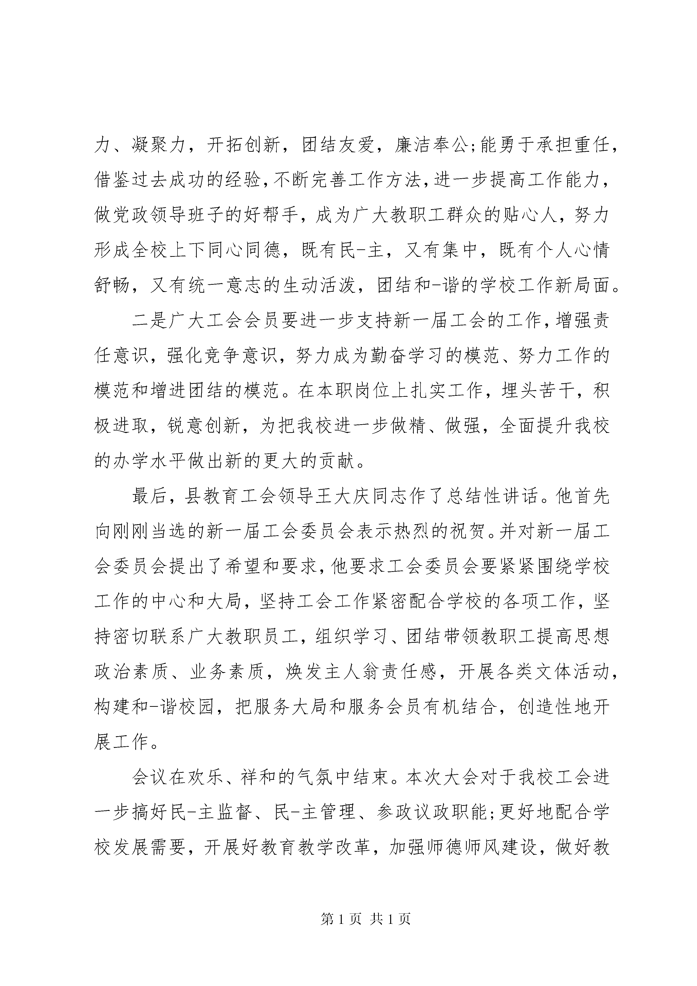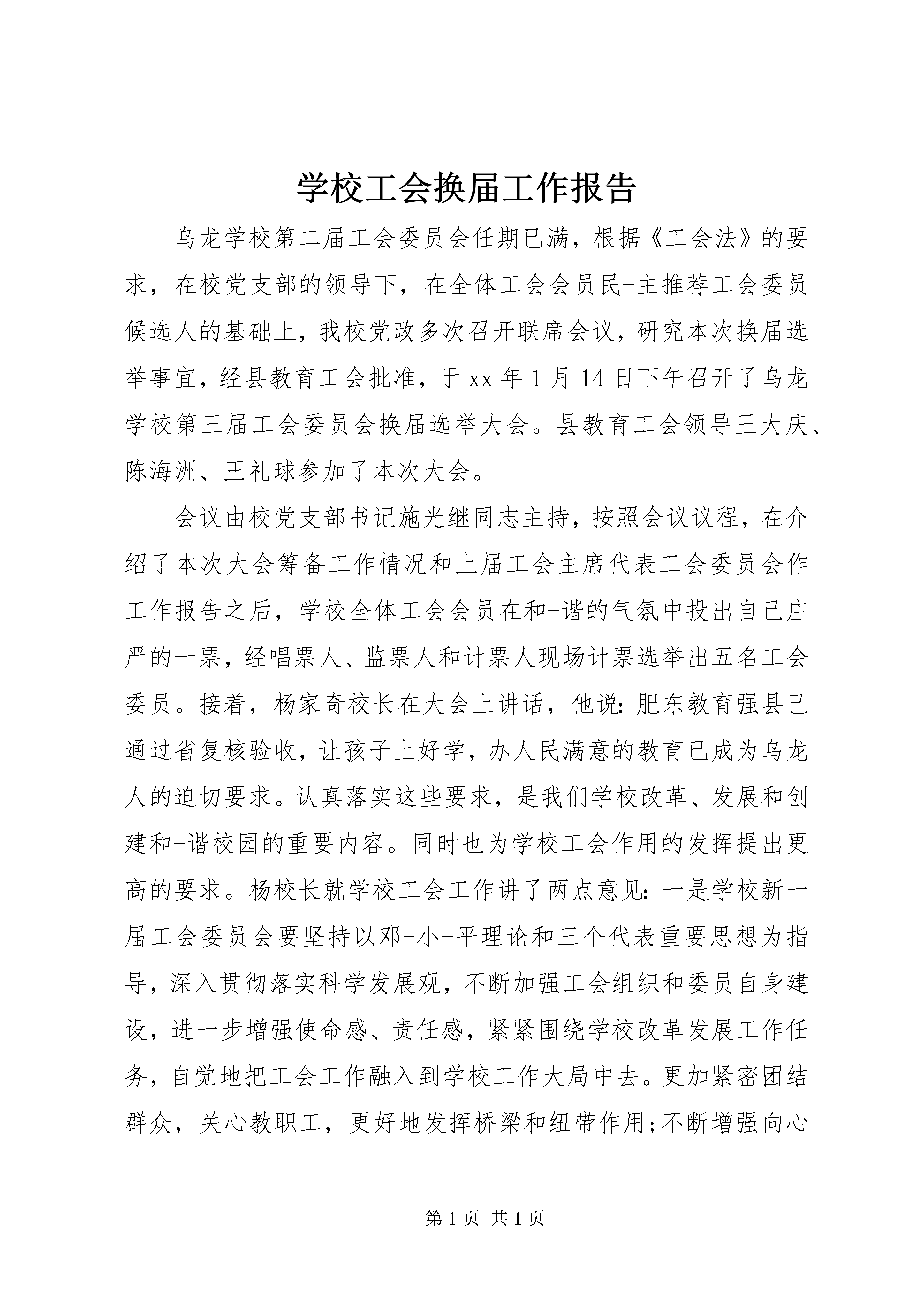 学校工会换届工作报告乌龙学校第二届工会委员会任期已满,根据《工会法》的要求,在校党支部的领导下,在全体工会会员民-主推荐工会委员候选人的基础上,我校党政多次召开联席会议,研究本次换届选举事宜,经县教育工会批准,于xx年1月14日下午召开了乌龙学校第三届工会委员会换届选举大会。县教育工会领导王大庆、陈海洲、王礼球参加了本次大会。会议由校党支部书记施光继同志主持,按照会议议程,在介绍了本次大会筹备工作情况和上届工会主席代表工会委员会作工作报告之后,学校全体工会会员在和-谐的气氛中投出自己庄严的一票,经唱票人、监票人和计票人现场计票选举出五名工会委员。接着,杨家奇校长在大会上讲话,他说:肥东教育强县已通过省复核验收,让孩子上好学,办人民满意的教育已成为乌龙人的迫切要求。认真落实这些要求,是我们学校改革、发展和创建和-谐校园的重要内容。同时也为学校工会作用的发挥提出更高的要求。杨校长就学校工会工作讲了两点意见:一是学校新一届工会委员会要坚持以邓-小-平理论和三个代表重要思想为指导,深入贯彻落实科学发展观,不断加强工会组织和委员自身建设,进一步增强使命感、责任感,紧紧围绕学校改革发展工作任务,自觉地把工会工作融入到学校工作大局中去。更加紧密团结群众,关心教职工,更好地发挥桥梁和纽带作用;不断增强向心力、凝聚力,开拓创新,团结友爱,廉洁奉公;能勇于承担重任,借鉴过去成功的经验,不断完善工作方法,进一步提高工作能力,做党政领导班子的好帮手,成为广大教职工群众的贴心人,努力形成全校上下同心同德,既有民-主,又有集中,既有个人心情舒畅,又有统一意志的生动活泼,团结和-谐的学校工作新局面。二是广大工会会员要进一步支持新一届工会的工作,增强责任意识,强化竞争意识,努力成为勤奋学习的模范、努力工作的模范和增进团结的模范。在本职岗位上扎实工作,埋头苦干,积极进取,锐意创新,为把我校进一步做精、做强,全面提升我校的办学水平做出新的更大的贡献。最后,县教育工会领导王大庆同志作了总结性讲话。他首先向刚刚当选的新一届工会委员会表示热烈的祝贺。并对新一届工会委员会提出了希望和要求,他要求工会委员会要紧紧围绕学校工作的中心和大局,坚持工会工作紧密配合学校的各项工作,坚持密切联系广大教职员工,组织学习、团结带领教职工提高思想政治素质、业务素质,焕发主人翁责任感,开展各类文体活动,构建和-谐校园,把服务大局和服务会员有机结合,创造性地开展工作。会议在欢乐、祥和的气氛中结束。本次大会对于我校工会进一步搞好民-主监督、民-主管理、参政议政职能;更好地配合学校发展需要,开展好教育教学改革,加强师德师风建设,做好教职工思想政治工作,营造与时俱进的校园文化,提高我校的办学质量都具有极大的推动作用。