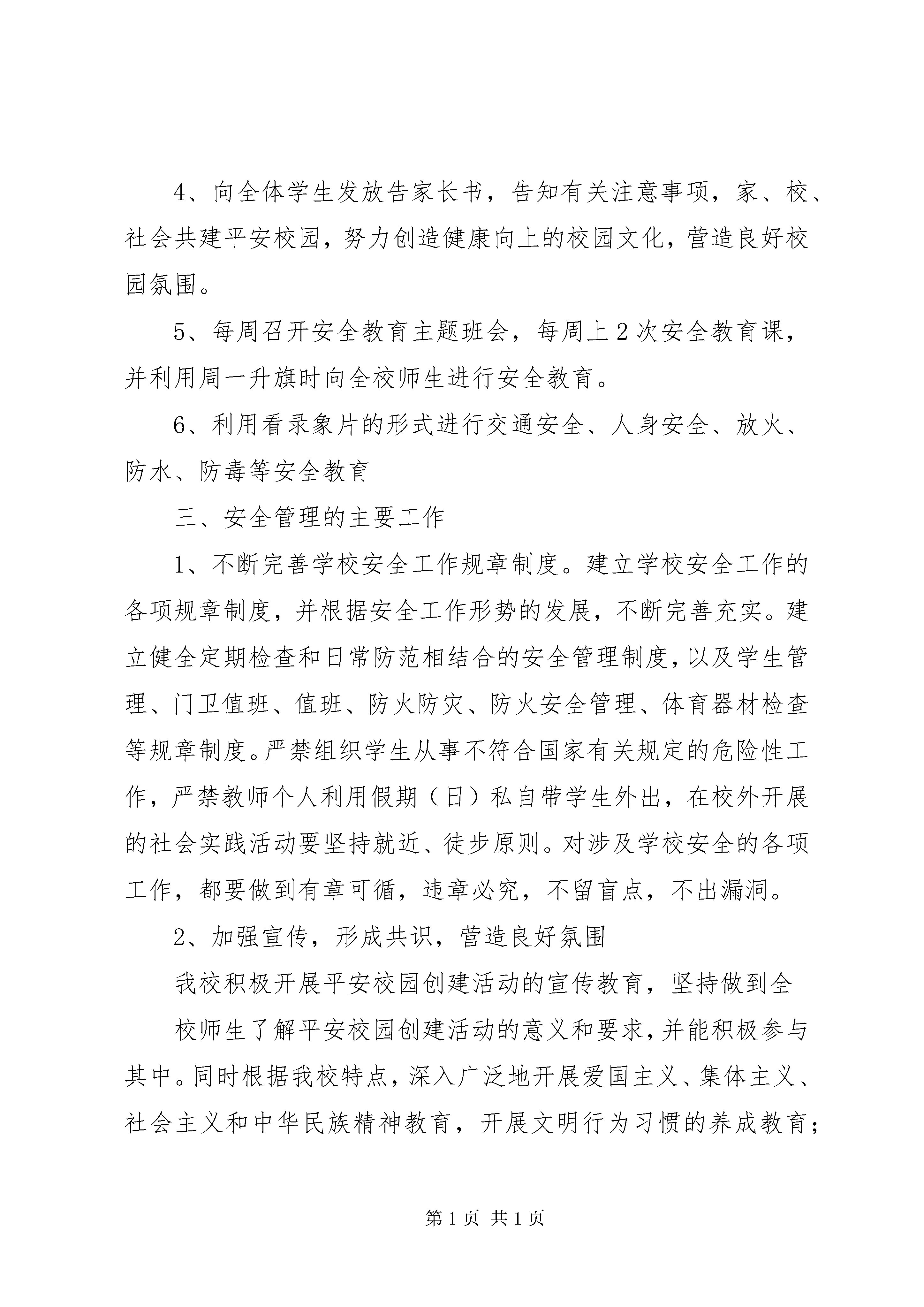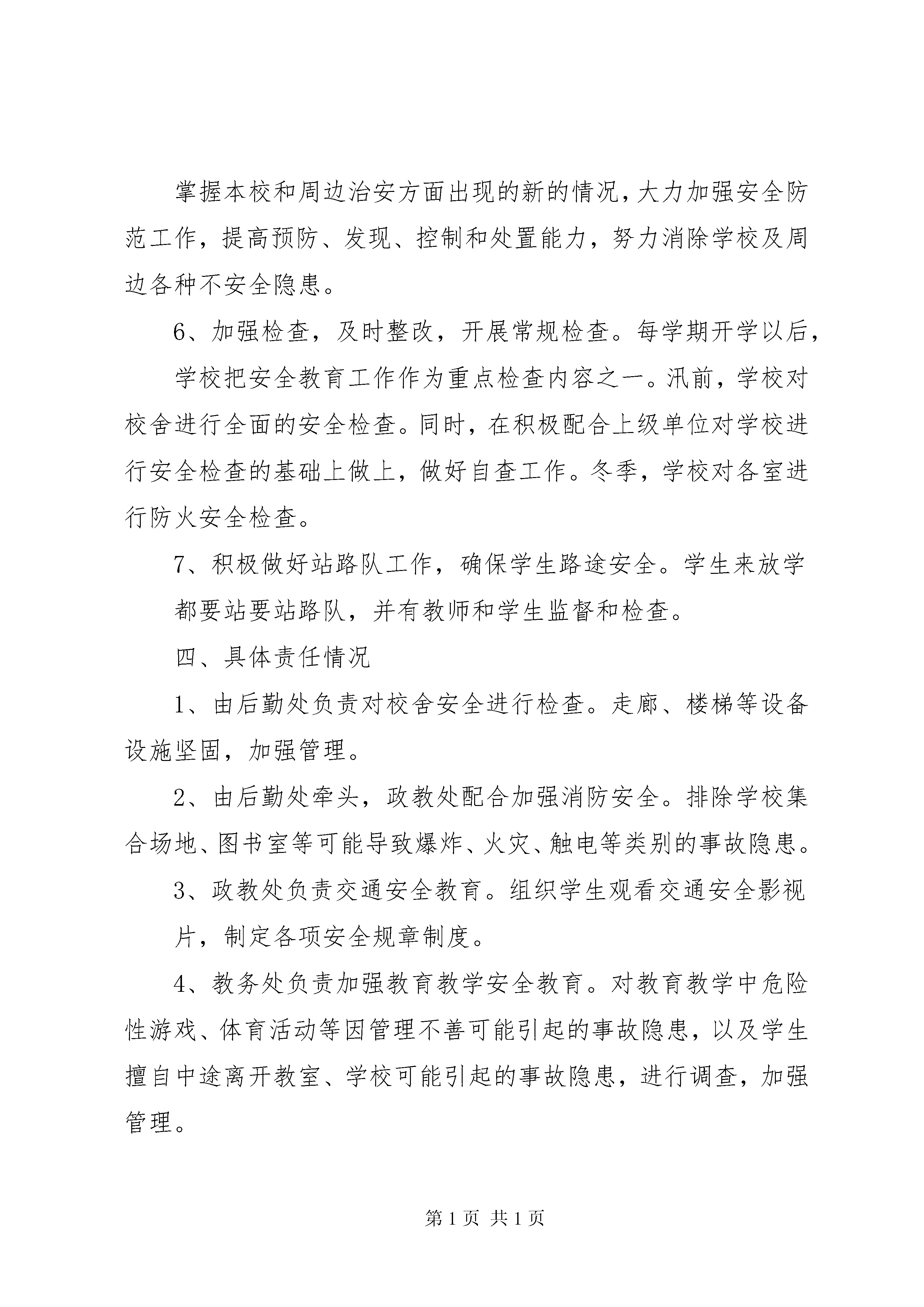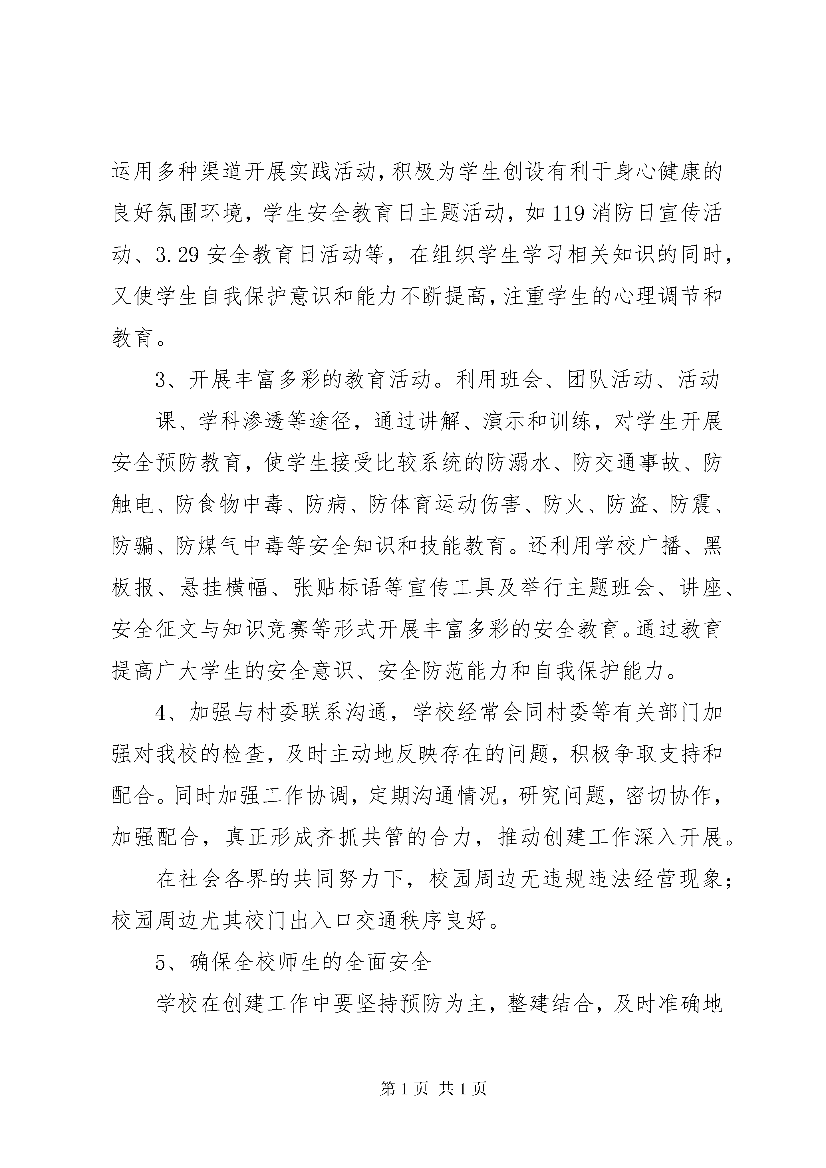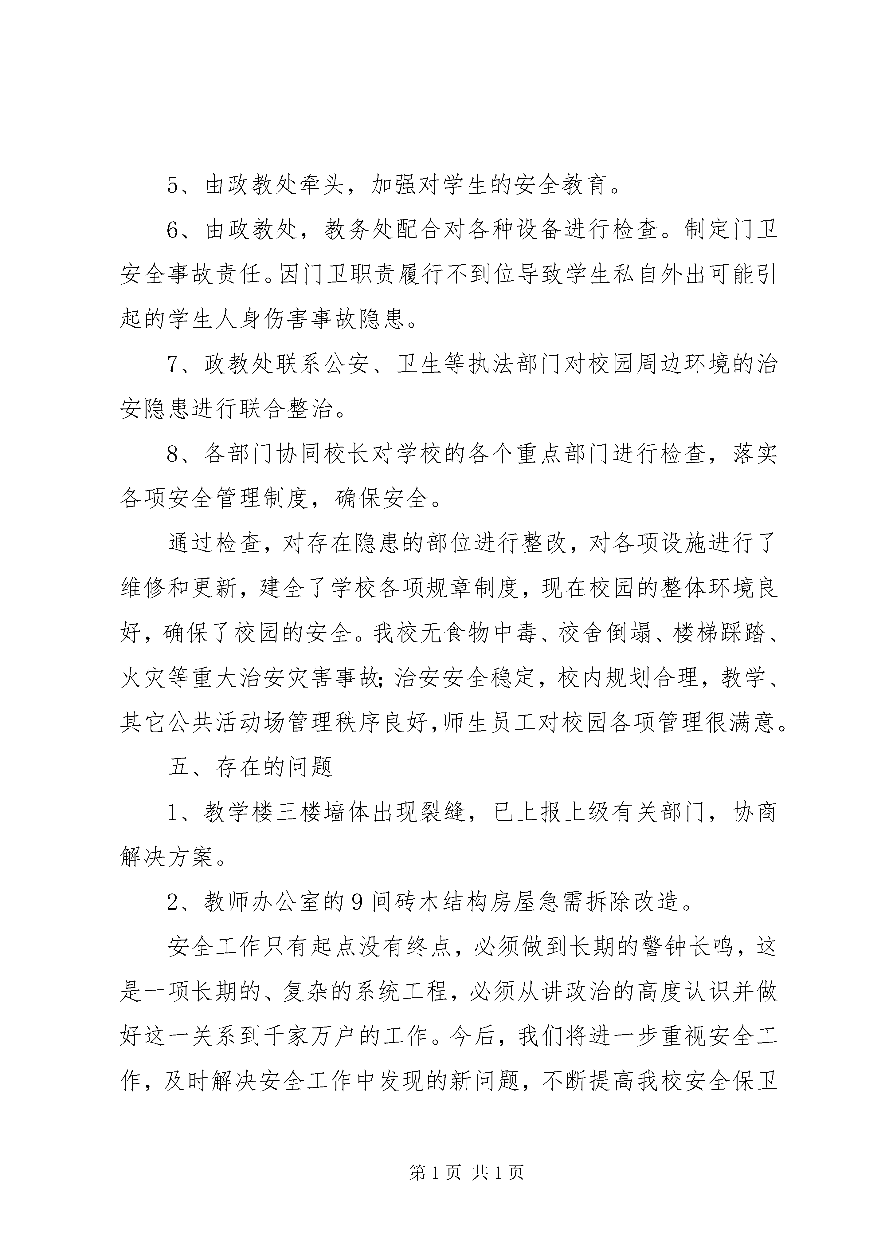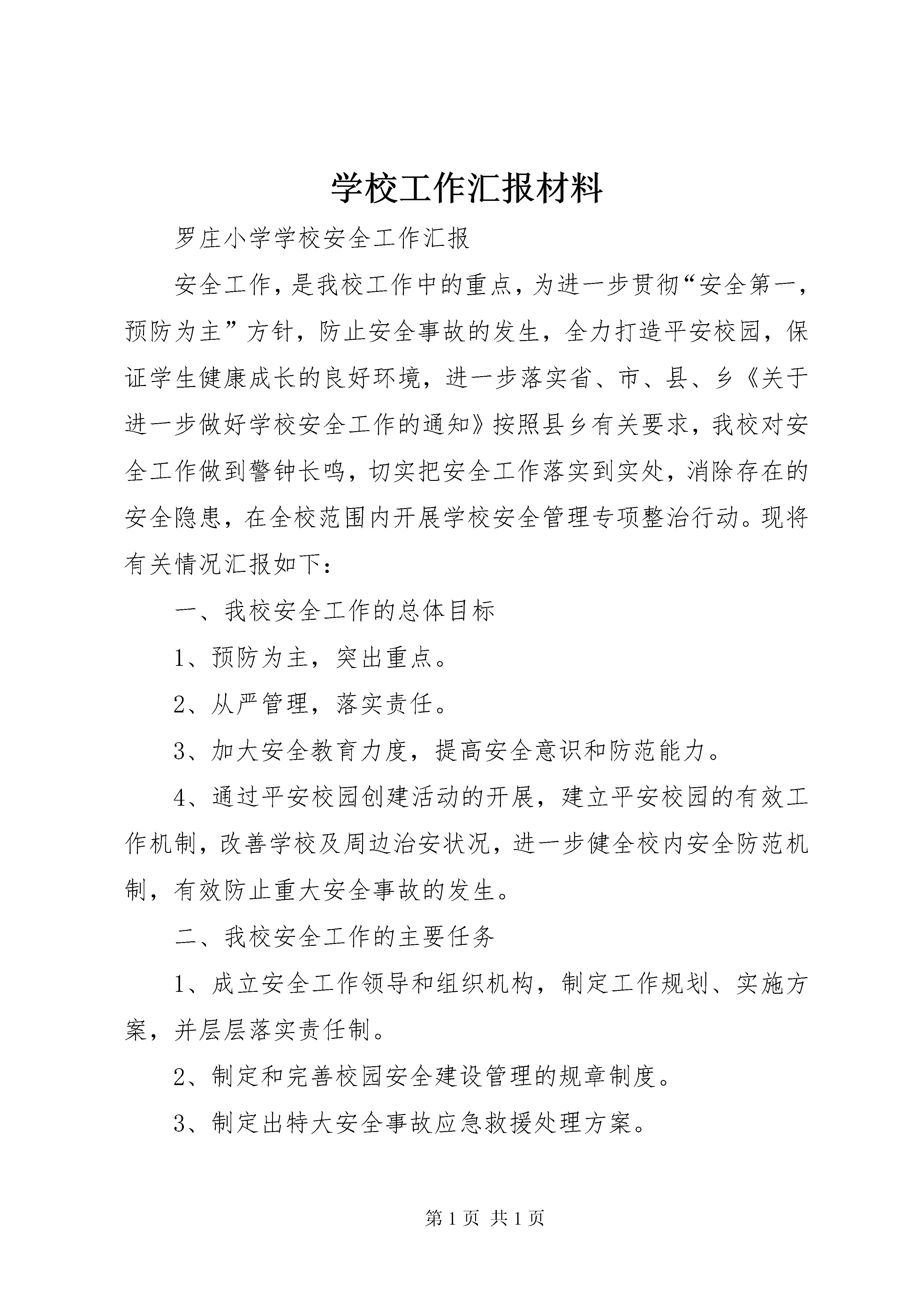学校工作汇报材料罗庄小学学校安全工作汇报安全工作,是我校工作中的重点,为进一步贯彻“安全第一,预防为主”方针,防止安全事故的发生,全力打造平安校园,保证学生健康成长的良好环境,进一步落实省、市、县、乡《关于进一步做好学校安全工作的通知》按照县乡有关要求,我校对安全工作做到警钟长鸣,切实把安全工作落实到实处,消除存在的安全隐患,在全校范围内开展学校安全管理专项整治行动。现将有关情况汇报如下:一、我校安全工作的总体目标1、预防为主,突出重点。2、从严管理,落实责任。3、加大安全教育力度,提高安全意识和防范能力。4、通过平安校园创建活动的开展,建立平安校园的有效工作机制,改善学校及周边治安状况,进一步健全校内安全防范机制,有效防止重大安全事故的发生。二、我校安全工作的主要任务1、成立安全工作领导和组织机构,制定工作规划、实施方案,并层层落实责任制。2、制定和完善校园安全建设管理的规章制度。3、制定出特大安全事故应急救援处理方案。4、向全体学生发放告家长书,告知有关注意事项,家、校、社会共建平安校园,努力创造健康向上的校园文化,营造良好校园氛围。5、每周召开安全教育主题班会,每周上2次安全教育课,并利用周一升旗时向全校师生进行安全教育。6、利用看录象片的形式进行交通安全、人身安全、放火、防水、防毒等安全教育三、安全管理的主要工作1、不断完善学校安全工作规章制度。建立学校安全工作的各项规章制度,并根据安全工作形势的发展,不断完善充实。建立健全定期检查和日常防范相结合的安全管理制度,以及学生管理、门卫值班、值班、防火防灾、防火安全管理、体育器材检查等规章制度。严禁组织学生从事不符合国家有关规定的危险性工作,严禁教师个人利用假期(日)私自带学生外出,在校外开展的社会实践活动要坚持就近、徒步原则。对涉及学校安全的各项工作,都要做到有章可循,违章必究,不留盲点,不出漏洞。2、加强宣传,形成共识,营造良好氛围我校积极开展平安校园创建活动的宣传教育,坚持做到全校师生了解平安校园创建活动的意义和要求,并能积极参与其中。同时根据我校特点,深入广泛地开展爱国主义、集体主义、社会主义和中华民族精神教育,开展文明行为习惯的养成教育;运用多种渠道开展实践活动,积极为学生创设有利于身心健康的良好氛围环境,学生安全教育日主题活动,如119消防日宣传活动、3.29安全教育日活动等,在组织学生学习相关知识的同时,又使学生自我保护意识和能力不断提高,注重学生的心理调节和教育。3、开展丰富多彩的教育活动。利用班会、团队活动、活动课、学科渗透等途径,通过讲解、演示和训练,对学生开展安全预防教育,使学生接受比较系统的防溺水、防交通事故、防触电、防食物中毒、防病、防体育运动伤害、防火、防盗、防震、防骗、防煤气中毒等安全知识和技能教育。还利用学校广播、黑板报、悬挂横幅、张贴标语等宣传工具及举行主题班会、讲座、安全征文与知识竞赛等形式开展丰富多彩的安全教育。通过教育提高广大学生的安全意识、安全防范能力和自我保护能力。4、加强与村委联系沟通,学校经常会同村委等有关部门加强对我校的检查,及时主动地反映存在的问题,积极争取支持和配合。同时加强工作协调,定期沟通情况,研究问题,密切协作,加强配合,真正形成齐抓共管的合力,推动创建工作深入开展。在社会各界的共同努力下,校园周边无违规违法经营现象;校园周边尤其校门出入口交通秩序良好。5、确保全校师生的全面安全学校在创建工作中要坚持预防为主,整建结合,及时准确地掌握本校和周边治安方面出现的新的情况,大力加强安全防范工作,提高预防、发现、控制和处置能力,努力消除学校及周边各种不安全隐患。6、加强检查,及时整改,开展常规检查。每学期开学以后,学校把安全教育工作作为重点检查内容之一。汛前,学校对校舍进行全面的安全检查。同时,在积极配合上级单位对学校进行安全检查的基础上做上,做好自查工作。冬季,学校对各室进行防火安全检查。7、积极做好站路队工作,确保学生路途安全。学生来放学都要站要站路队,并有教师和学生监督和检查。四、具体责任情况1、由后勤处负责对校舍安全进行检查。走廊、楼梯等设备设施坚固,加强管理。2、由后勤处牵头,政教处配合加强消防安全。排除学校集合场地、图书室等可能导致爆炸、火灾、触电等类别的事故隐患。3、政教处负责交通安全教育。组织学生观看交通安全影视片,制定各项安全规章制度。4、教务处负责加强教育教学安全教育。对教育教学中危险性游戏、体育活动等因管理不善可能引起的事故隐患,以及学生擅自中途离开教室、学校可能引起的事故隐患,进行调查,加强管理。5、由政教处牵头,加强对学生的安全教育。6、由政教处,教务处配合对各种设备进行检查。制定门卫安全事故责任。因门卫职责履行不到位导致学生私自外出可能引起的学生人身伤害事故隐患。7、政