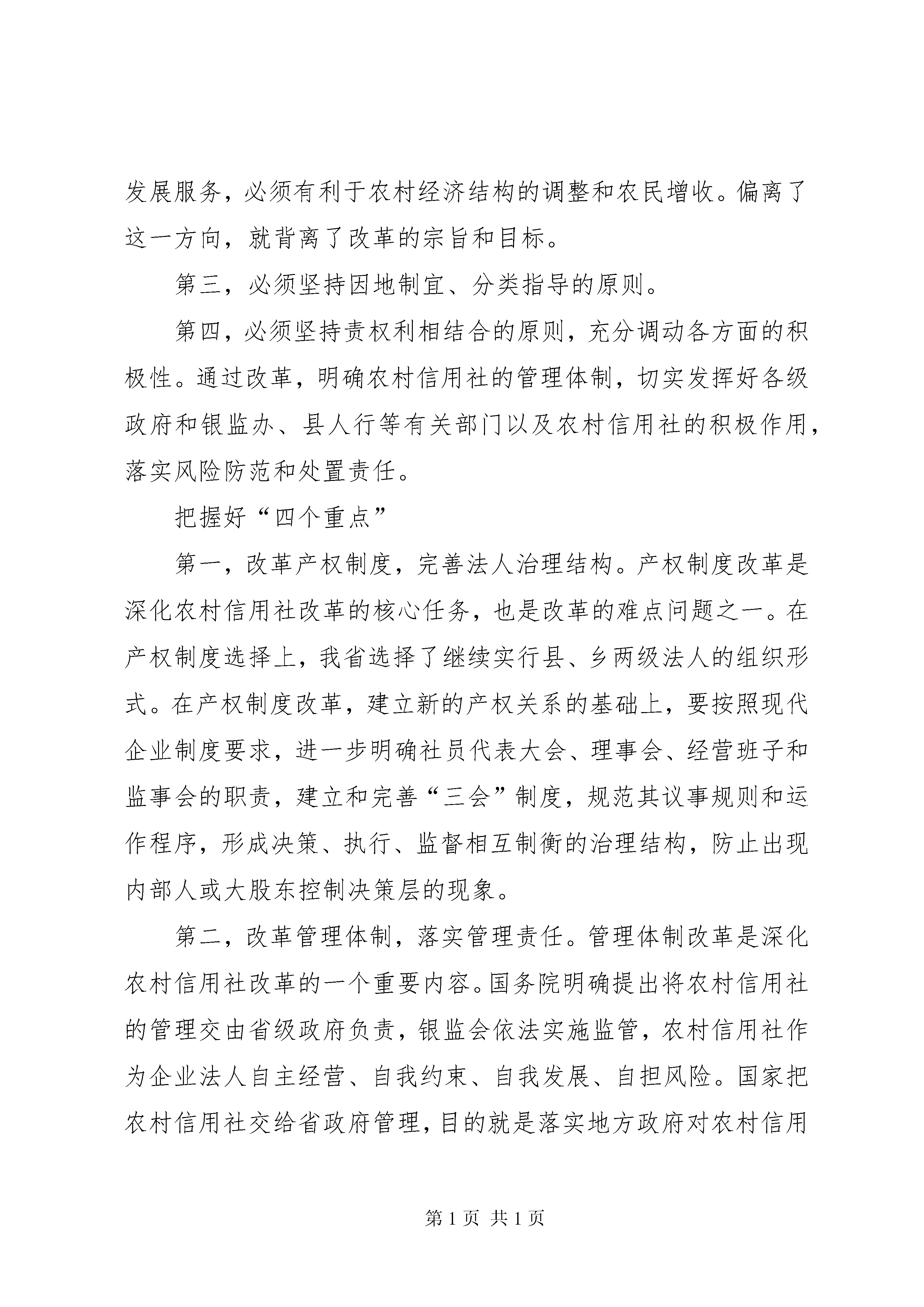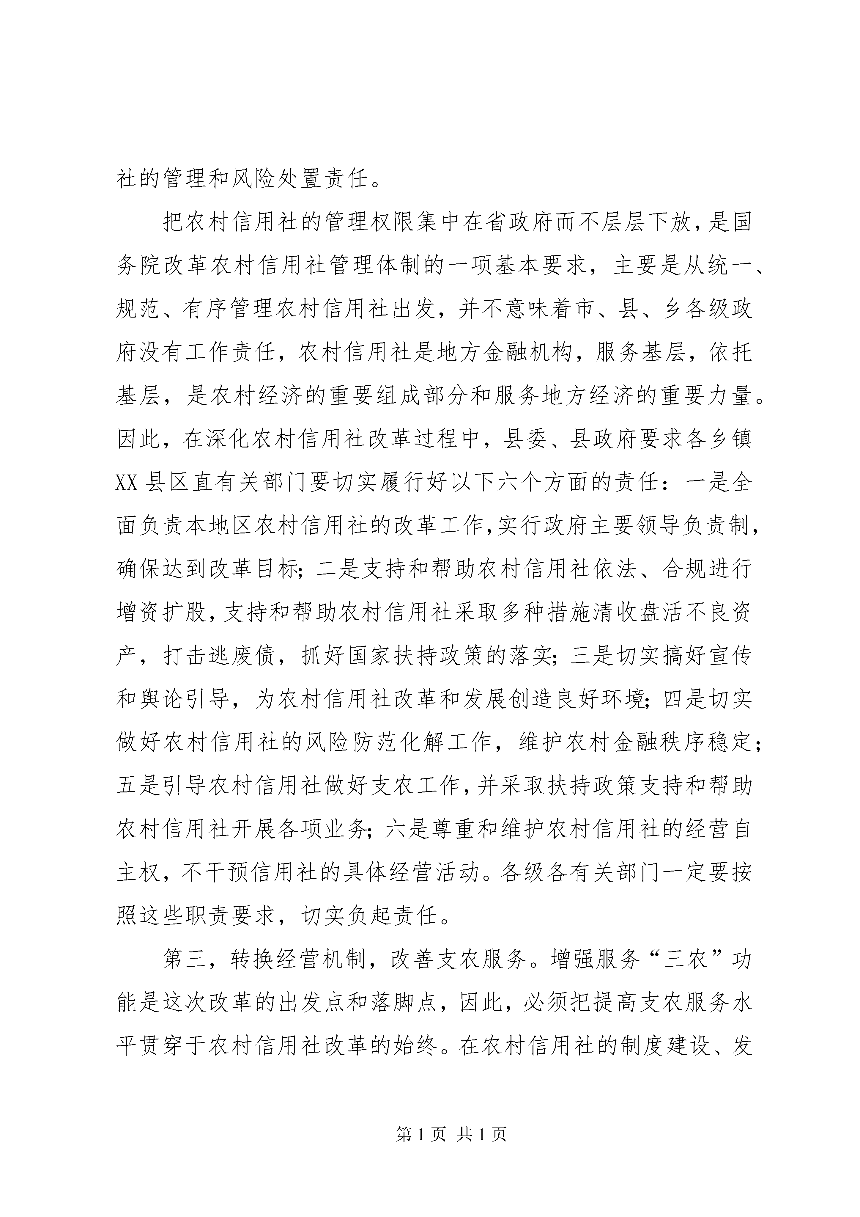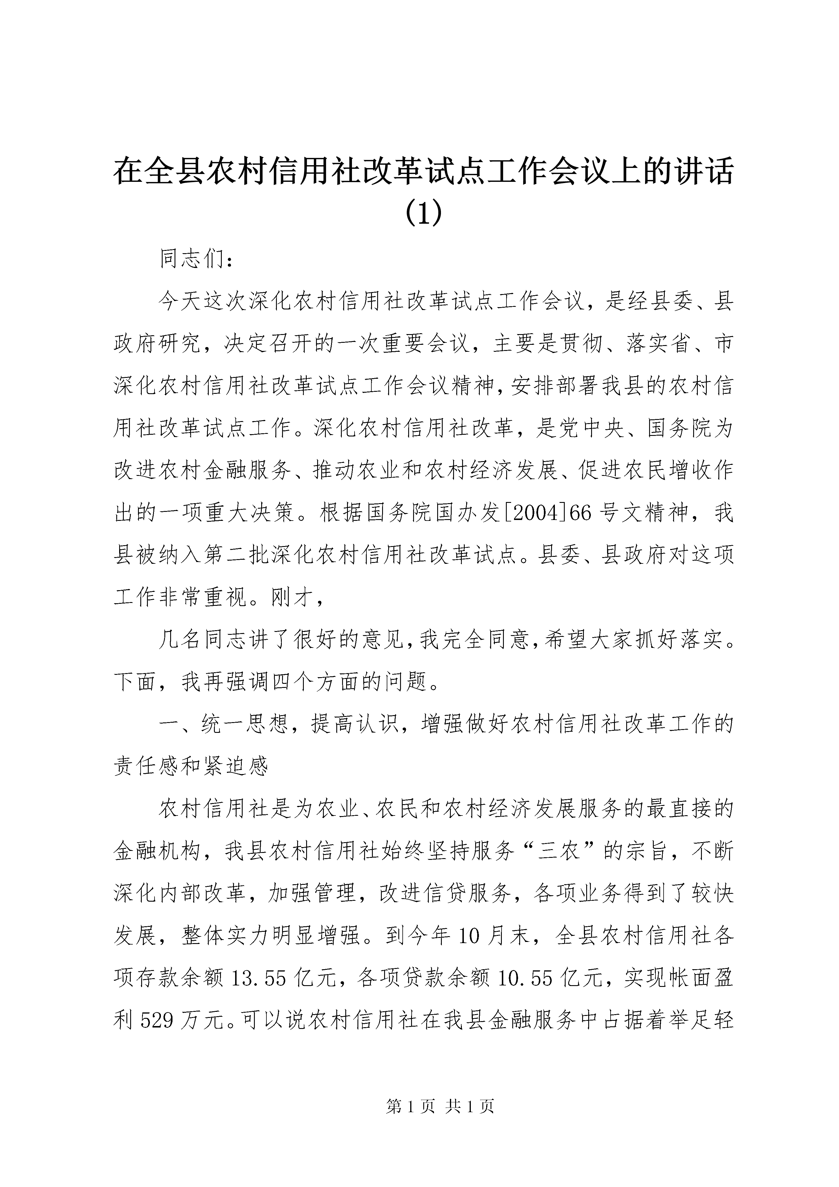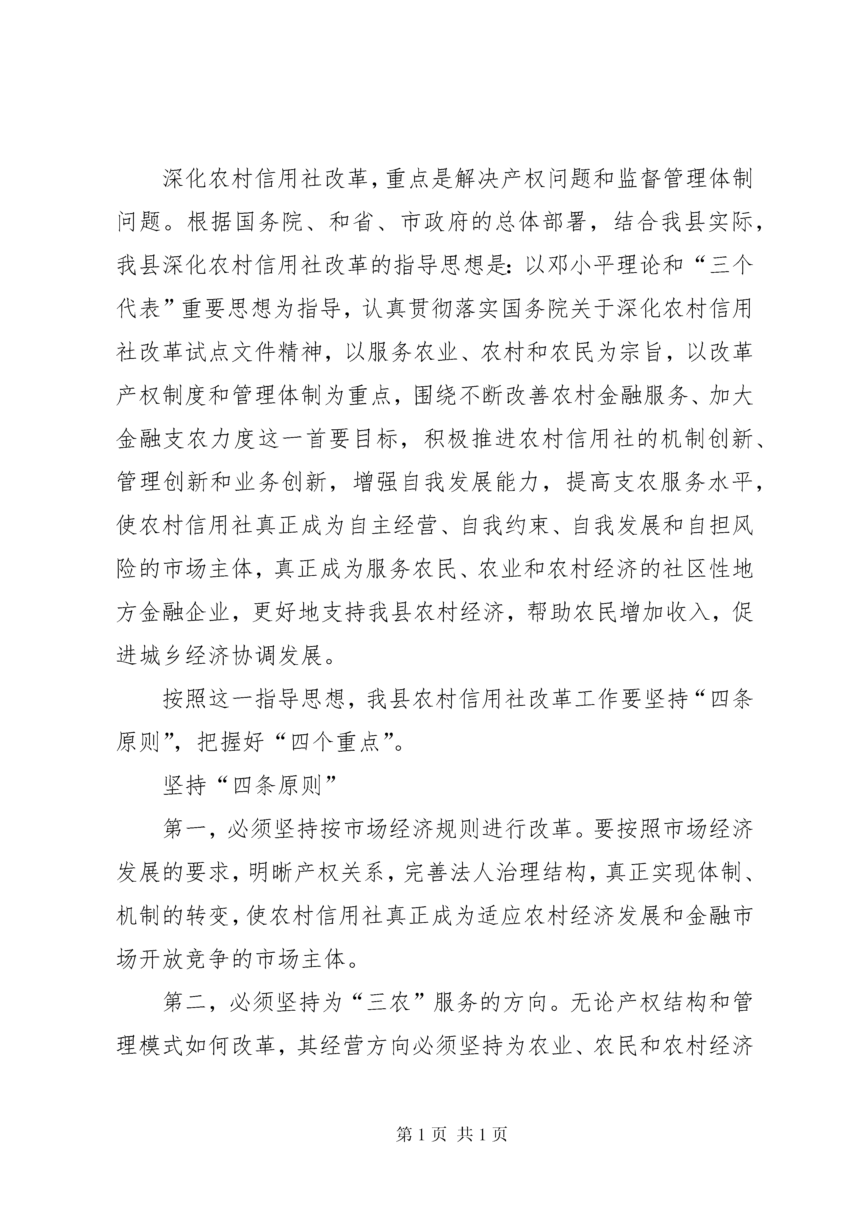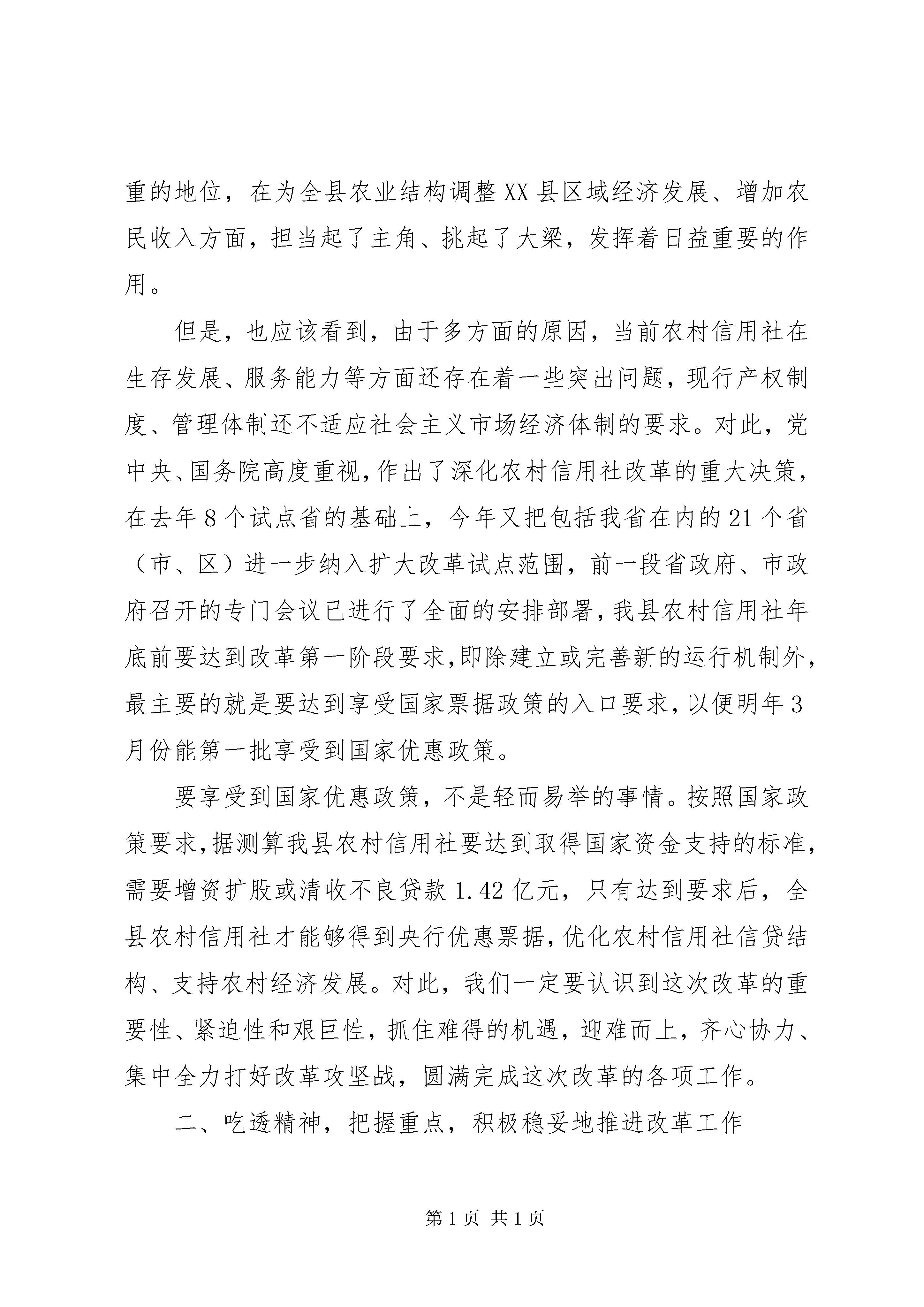 在全县农村信用社改革试点工作会议上的讲话(1)同志们:今天这次深化农村信用社改革试点工作会议,是经县委、县政府研究,决定召开的一次重要会议,主要是贯彻、落实省、市深化农村信用社改革试点工作会议精神,安排部署我县的农村信用社改革试点工作。深化农村信用社改革,是党中央、国务院为改进农村金融服务、推动农业和农村经济发展、促进农民增收作出的一项重大决策。根据国务院国办发[2004]66号文精神,我县被纳入第二批深化农村信用社改革试点。县委、县政府对这项工作非常重视。刚才,几名同志讲了很好的意见,我完全同意,希望大家抓好落实。下面,我再强调四个方面的问题。一、统一思想,提高认识,增强做好农村信用社改革工作的责任感和紧迫感农村信用社是为农业、农民和农村经济发展服务的最直接的金融机构,我县农村信用社始终坚持服务“三农”的宗旨,不断深化内部改革,加强管理,改进信贷服务,各项业务得到了较快发展,整体实力明显增强。到今年10月末,全县农村信用社各项存款余额13.55亿元,各项贷款余额10.55亿元,实现帐面盈利529万元。可以说农村信用社在我县金融服务中占据着举足轻重的地位,在为全县农业结构调整XX县区域经济发展、增加农民收入方面,担当起了主角、挑起了大梁,发挥着日益重要的作用。但是,也应该看到,由于多方面的原因,当前农村信用社在生存发展、服务能力等方面还存在着一些突出问题,现行产权制度、管理体制还不适应社会主义市场经济体制的要求。对此,党中央、国务院高度重视,作出了深化农村信用社改革的重大决策,在去年8个试点省的基础上,今年又把包括我省在内的21个省(市、区)进一步纳入扩大改革试点范围,前一段省政府、市政府召开的专门会议已进行了全面的安排部署,我县农村信用社年底前要达到改革第一阶段要求,即除建立或完善新的运行机制外,最主要的就是要达到享受国家票据政策的入口要求,以便明年3月份能第一批享受到国家优惠政策。要享受到国家优惠政策,不是轻而易举的事情。按照国家政策要求,据测算我县农村信用社要达到取得国家资金支持的标准,需要增资扩股或清收不良贷款1.42亿元,只有达到要求后,全县农村信用社才能够得到央行优惠票据,优化农村信用社信贷结构、支持农村经济发展。对此,我们一定要认识到这次改革的重要性、紧迫性和艰巨性,抓住难得的机遇,迎难而上,齐心协力、集中全力打好改革攻坚战,圆满完成这次改革的各项工作。二、吃透精神,把握重点,积极稳妥地推进改革工作深化农村信用社改革,重点是解决产权问题和监督管理体制问题。根据国务院、和省、市政府的总体部署,结合我县实际,我县深化农村信用社改革的指导思想是:以邓小平理论和“三个代表”重要思想为指导,认真贯彻落实国务院关于深化农村信用社改革试点文件精神,以服务农业、农村和农民为宗旨,以改革产权制度和管理体制为重点,围绕不断改善农村金融服务、加大金融支农力度这一首要目标,积极推进农村信用社的机制创新、管理创新和业务创新,增强自我发展能力,提高支农服务水平,使农村信用社真正成为自主经营、自我约束、自我发展和自担风险的市场主体,真正成为服务农民、农业和农村经济的社区性地方金融企业,更好地支持我县农村经济,帮助农民增加收入,促进城乡经济协调发展。按照这一指导思想,我县农村信用社改革工作要坚持“四条原则”,把握好“四个重点”。坚持“四条原则”第一,必须坚持按市场经济规则进行改革。要按照市场经济发展的要求,明晰产权关系,完善法人治理结构,真正实现体制、机制的转变,使农村信用社真正成为适应农村经济发展和金融市场开放竞争的市场主体。第二,必须坚持为“三农”服务的方向。无论产权结构和管理模式如何改革,其经营方向必须坚持为农业、农民和农村经济发展服务,必须有利于农村经济结构的调整和农民增收。偏离了这一方向,就背离了改革的宗旨和目标。第三,必须坚持因地制宜、分类指导的原则。第四,必须坚持责权利相结合的原则,充分调动各方面的积极性。通过改革,明确农村信用社的管理体制,切实发挥好各级政府和银监办、县人行等有关部门以及农村信用社的积极作用,落实风险防范和处置责任。把握好“四个重点”第一,改革产权制度,完善法人治理结构。产权制度改革是深化农村信用社改革的核心任务,也是改革的难点问题之一。在产权制度选择上,我省选择了继续实行县、乡两级法人的组织形式。在产权制度改革,建立新的产权关系的基础上,要按照现代企业制度要求,进一步明确社员代表大会、理事会、经营班子和监事会的职责,建立和完善“三会”制度,规范其议事规则和运作程序,形成决策、执行、监督相互制衡的治理结构,防止出现内部人或大股东控制决策层的现象。第二,改革管理体制,落实管理责任。管理体制改革是深化农村信用社改革的一个重要内容。国务院明确提出将农村信用社的管理交由省级政府负责,银监会依法实