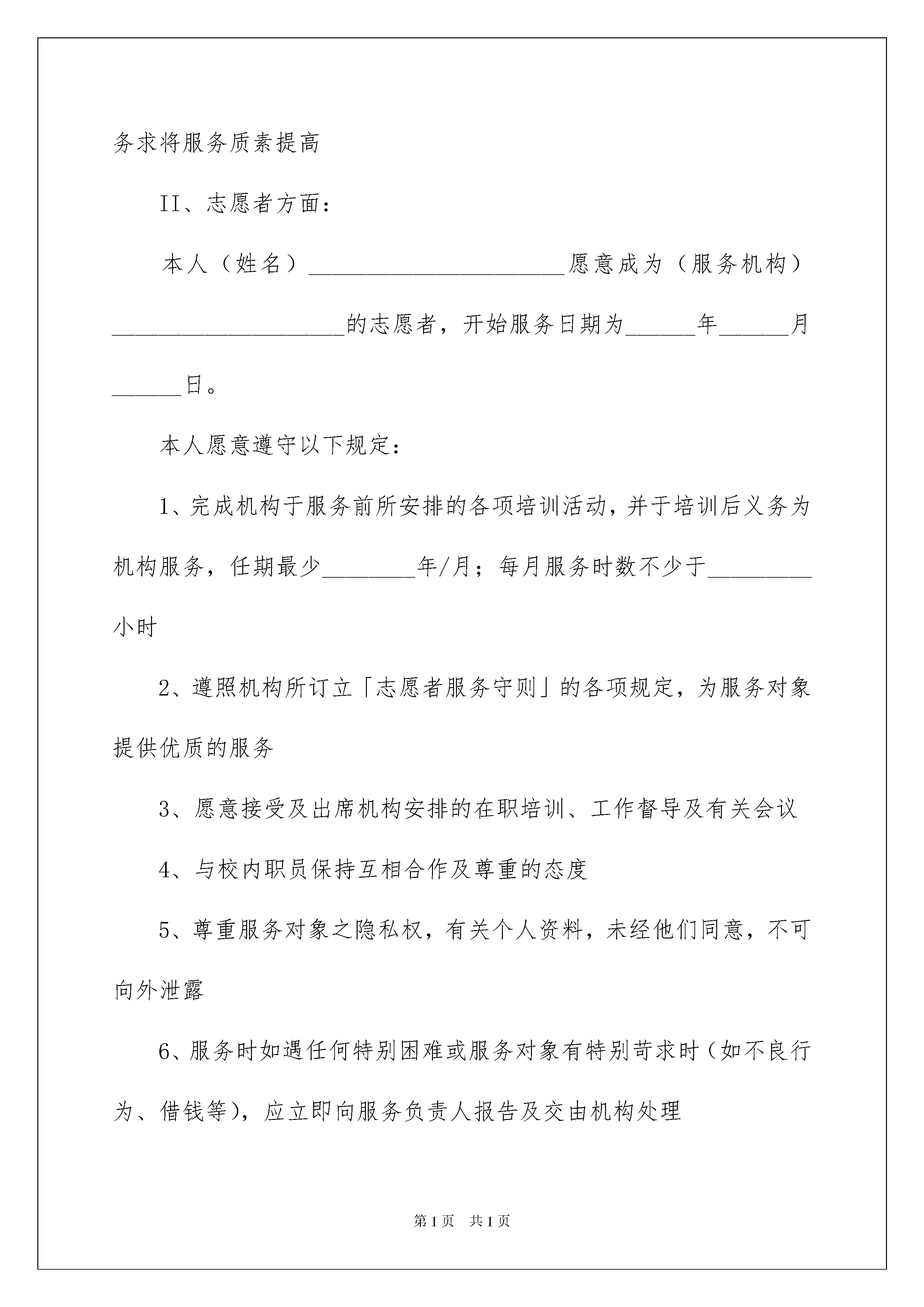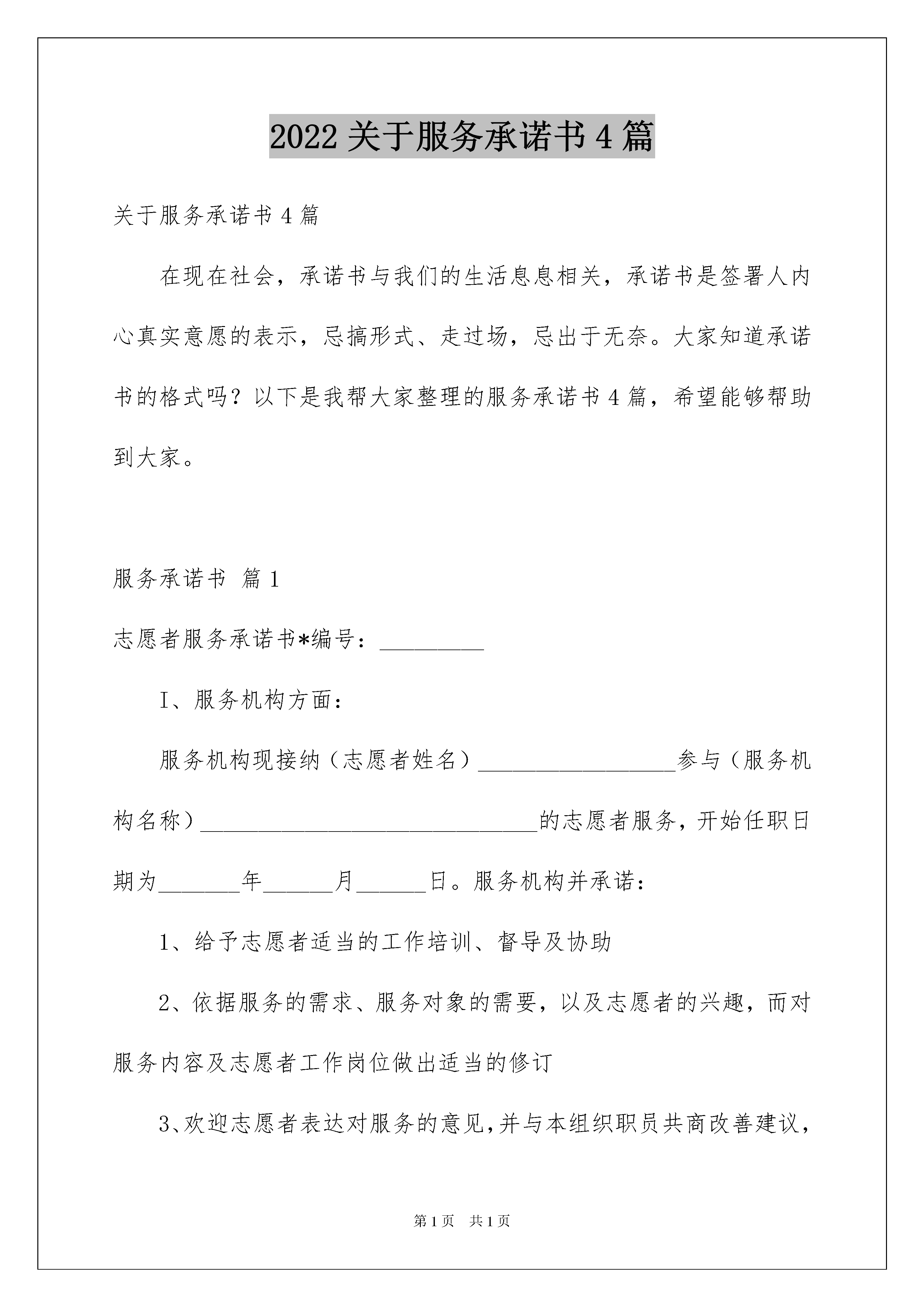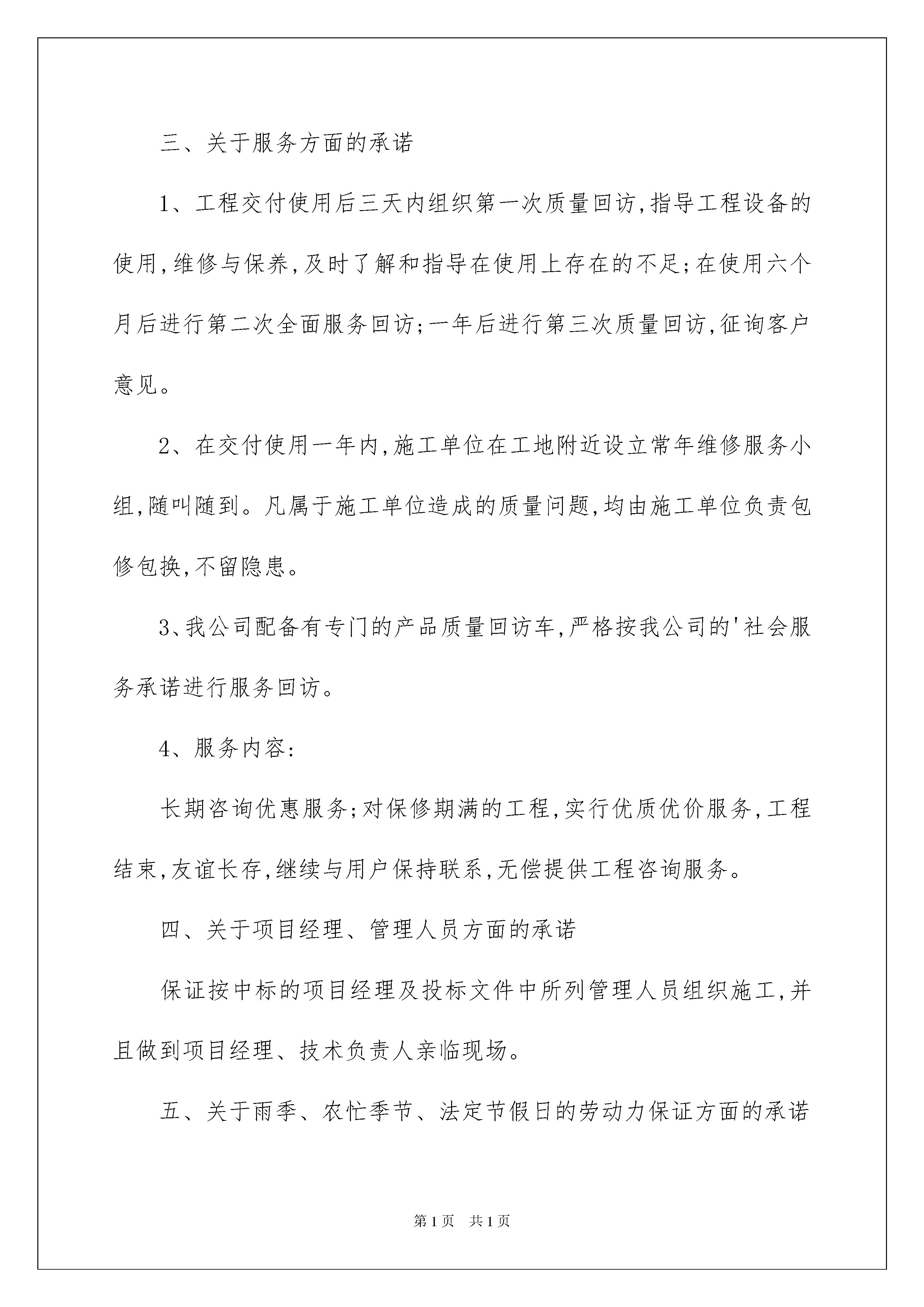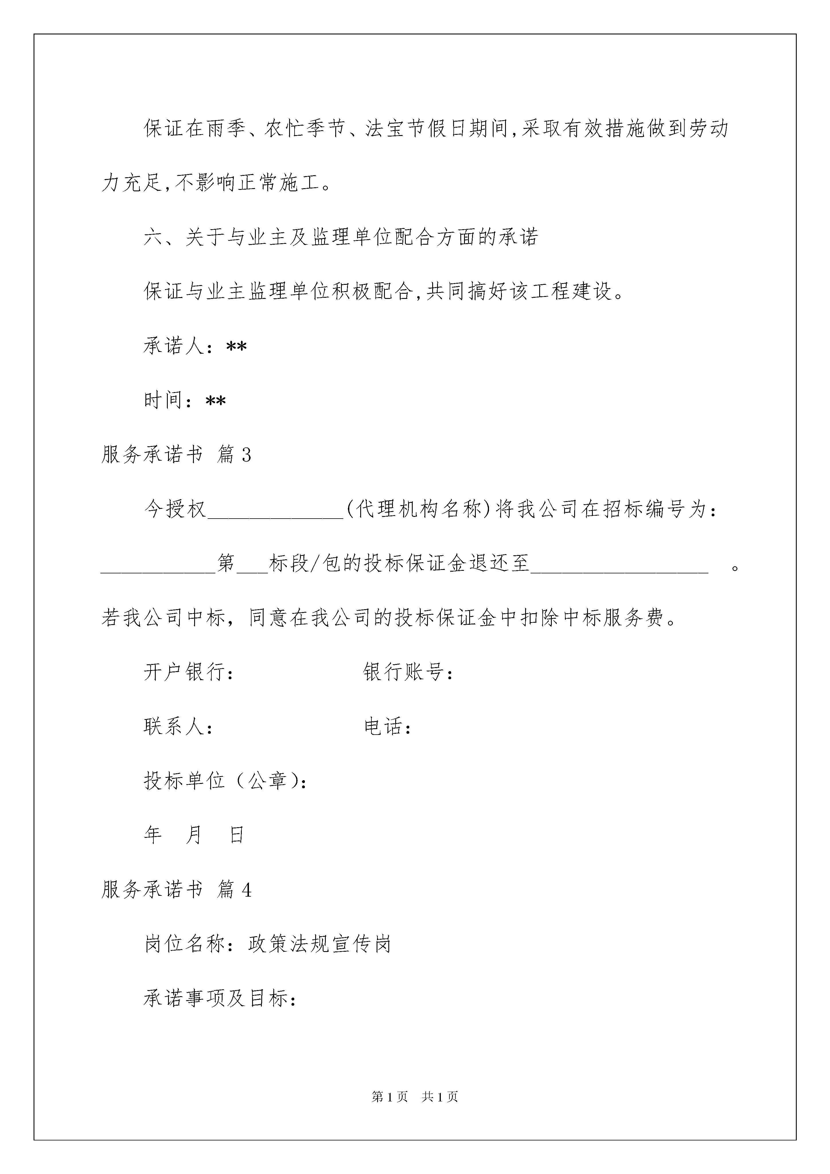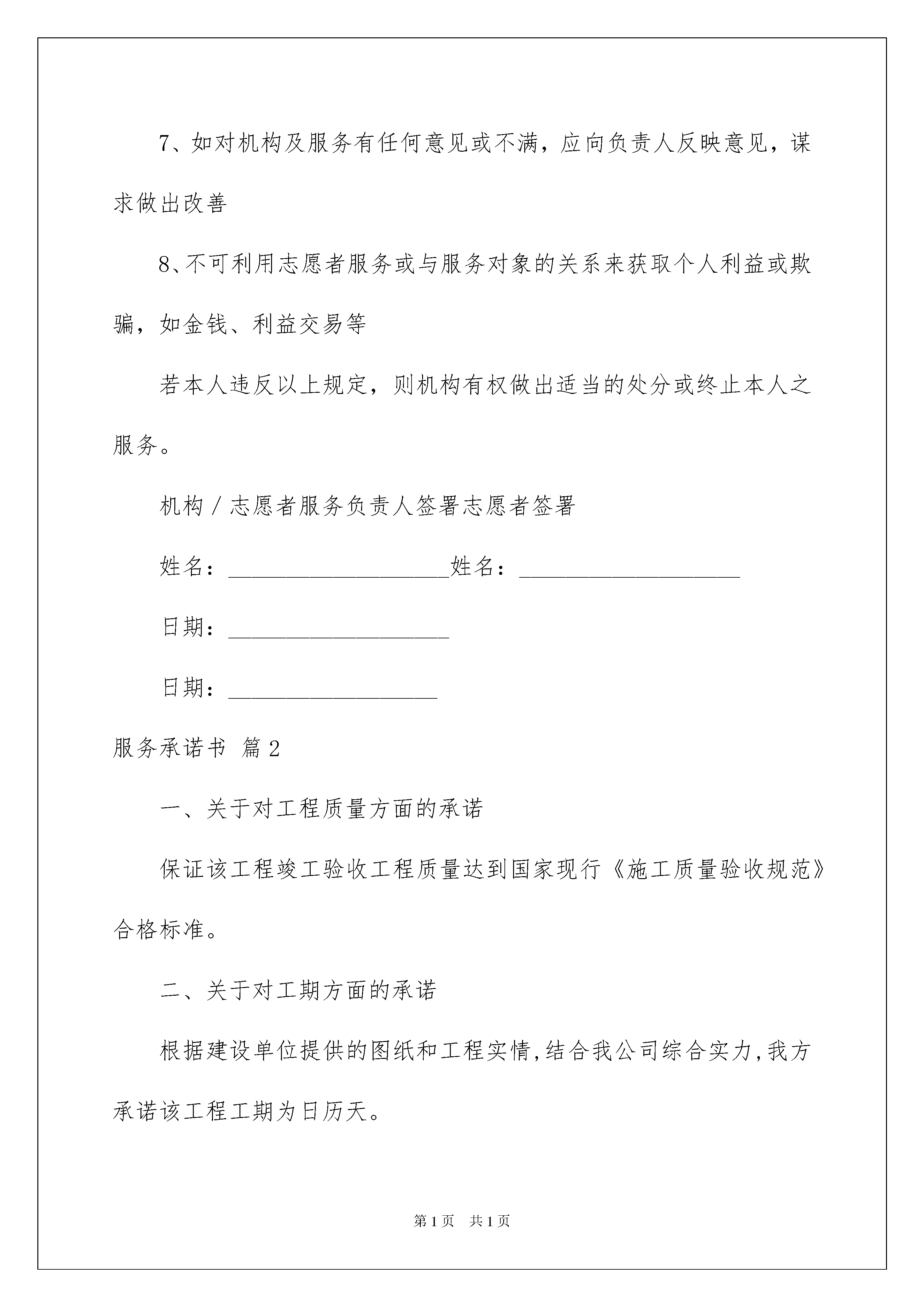 2022关于服务承诺书4篇关于服务承诺书4篇在现在社会,承诺书与我们的生活息息相关,承诺书是签署人内心真实意愿的表示,忌搞形式、走过场,忌出于无奈。大家知道承诺书的格式吗?以下是我帮大家整理的服务承诺书4篇,希望能够帮助到大家。服务承诺书篇1志愿者服务承诺书*编号:_________I、服务机构方面:服务机构现接纳(志愿者姓名)_________________参与(服务机构名称)_____________________________的志愿者服务,开始任职日期为_______年______月______日。服务机构并承诺:1、给予志愿者适当的工作培训、督导及协助2、依据服务的需求、服务对象的需要,以及志愿者的兴趣,而对服务内容及志愿者工作岗位做出适当的修订3、欢迎志愿者表达对服务的意见,并与本组织职员共商改善建议,务求将服务质素提高II、志愿者方面:本人(姓名)______________________愿意成为(服务机构)____________________的志愿者,开始服务日期为______年______月______日。本人愿意遵守以下规定:1、完成机构于服务前所安排的各项培训活动,并于培训后义务为机构服务,任期最少________年/月;每月服务时数不少于_________小时2、遵照机构所订立「志愿者服务守则」的各项规定,为服务对象提供优质的服务3、愿意接受及出席机构安排的在职培训、工作督导及有关会议4、与校内职员保持互相合作及尊重的态度5、尊重服务对象之隐私权,有关个人资料,未经他们同意,不可向外泄露6、服务时如遇任何特别困难或服务对象有特别苛求时(如不良行为、借钱等),应立即向服务负责人报告及交由机构处理7、如对机构及服务有任何意见或不满,应向负责人反映意见,谋求做出改善8、不可利用志愿者服务或与服务对象的关系来获取个人利益或欺骗,如金钱、利益交易等若本人违反以上规定,则机构有权做出适当的处分或终止本人之服务。机构/志愿者服务负责人签署志愿者签署姓名:___________________姓名:___________________日期:___________________日期:__________________服务承诺书篇2一、关于对工程质量方面的承诺保证该工程竣工验收工程质量达到国家现行《施工质量验收规范》合格标准。二、关于对工期方面的承诺根据建设单位提供的图纸和工程实情,结合我公司综合实力,我方承诺该工程工期为日历天。三、关于服务方面的承诺1、工程交付使用后三天内组织第一次质量回访,指导工程设备的使用,维修与保养,及时了解和指导在使用上存在的不足;在使用六个月后进行第二次全面服务回访;一年后进行第三次质量回访,征询客户意见。2、在交付使用一年内,施工单位在工地附近设立常年维修服务小组,随叫随到。凡属于施工单位造成的质量问题,均由施工单位负责包修包换,不留隐患。3、我公司配备有专门的产品质量回访车,严格按我公司的'社会服务承诺进行服务回访。4、服务内容:长期咨询优惠服务;对保修期满的工程,实行优质优价服务,工程结束,友谊长存,继续与用户保持联系,无偿提供工程咨询服务。四、关于项目经理、管理人员方面的承诺保证按中标的项目经理及投标文件中所列管理人员组织施工,并且做到项目经理、技术负责人亲临现场。五、关于雨季、农忙季节、法定节假日的劳动力保证方面的承诺保证在雨季、农忙季节、法宝节假日期间,采取有效措施做到劳动力充足,不影响正常施工。六、关于与业主及监理单位配合方面的承诺保证与业主监理单位积极配合,共同搞好该工程建设。承诺人:**时间:**服务承诺书篇3今授权_____________(代理机构名称)将我公司在招标编号为:___________第___标段/包的投标保证金退还至_________________。若我公司中标,同意在我公司的投标保证金中扣除中标服务费。开户银行:银行账号:联系人:电话:投标单位(公章):年月日服务承诺书篇4岗位名称:政策法规宣传岗承诺事项及目标:为及时把党的方针,政策宣传到基层社区,让群众了解党的方针,政策,我认定政策宣传岗,并承诺:1、积极向群众宣传党的路线,方针,政策,使党的方针,政策深入人心;2、带头执行党的路线,方针,政策,在群众中做好样子;3、协助党组织做好群众的思想政治工作,统一大家思想,发挥先锋模范作用;4、积极参与支部有关重大事项的决策,帮助党支部出点子,想办法.采取措施:1、加强政治理论学习和研究,不断增强政治敏锐性。2、把党的路线,方针,政策通过各种途径及时向群众宣传。3、积极为部门领导出谋划策,