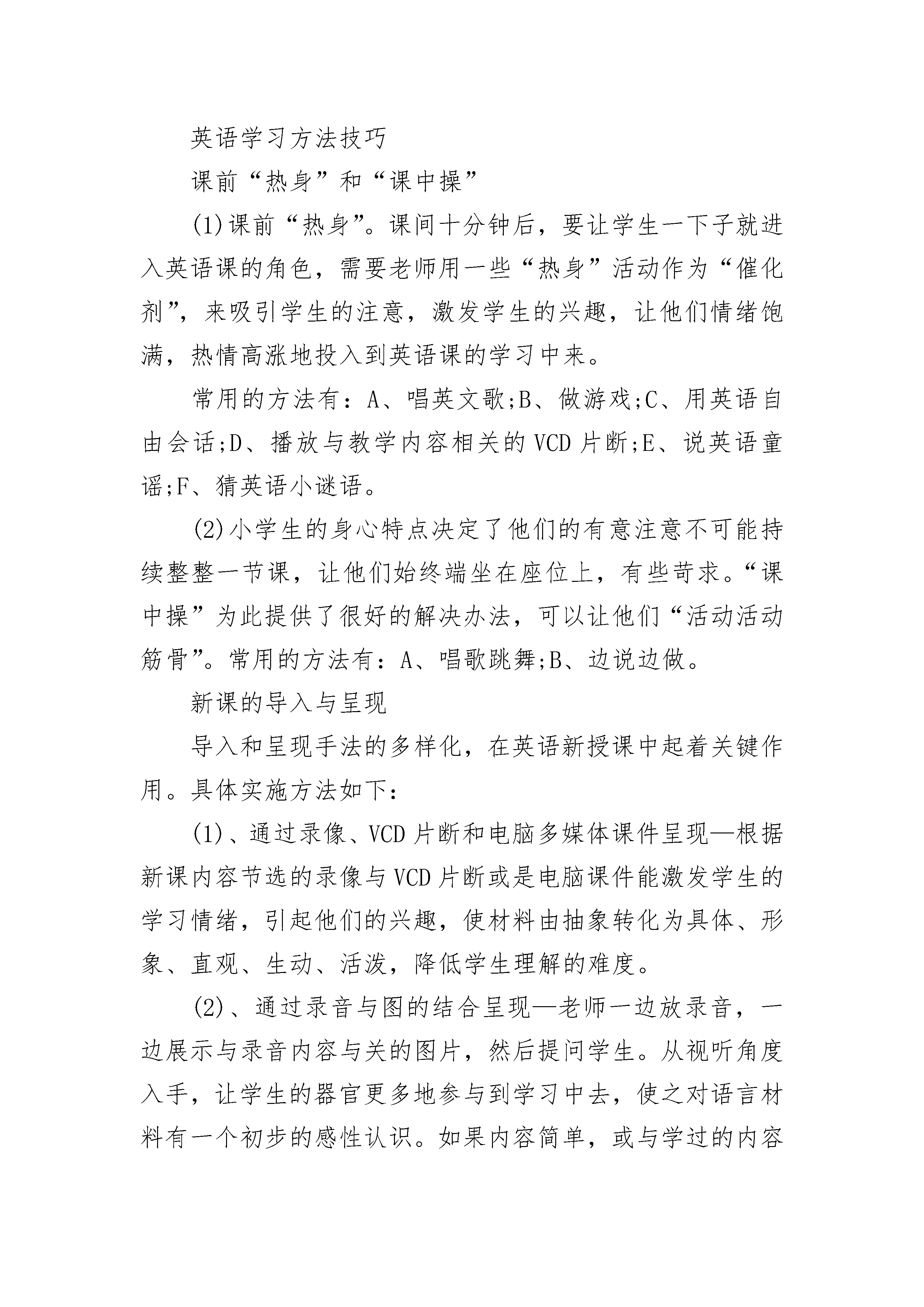2022小学一年级英语基础知识点一般过去时表示发生在过去的事情或存在的状态,常与justnow;amomentago;…ago;yesterday;last(week;month;year;Monday;weekend);thismorning等词连用。结构是主语+be动词的过去式(was;were)或主语+动词的过去式。注意:be动词与动词过去式不可同时使用。如:Myearphoneswereonthegroundjustnow.我的耳机刚刚还在呢。Wherewereyoulastweek?Iwasatacamp.你上个星期去哪了?我去野营了Whatdidyoudoyesterday?Ivisitedafarm你昨天去干嘛了?我去参观农场了。问句有be动词将be动词移前,没有be动词借助于did,后面动词还原;否定句有be动词在后面加not,没有借助于didn't后面动词还原小学一年级英语10个知识点归纳1.动词be(is,am,are)的用法我(I)用am,你(you)用are,is跟着他(he),她(she),它(it)。单数名词用is,复数名词全用are。变否定,更容易,be后not加上去。变疑问,往前提,句末问号莫丢弃。还有一条须注意,句首大写莫忘记。2.this,that和it用法(1)this和that是指示代词,it是人称代词。(2)距离说话人近的人或物用this,距离说话人远的人或物用that。如:Thisisaflower.这是一朵花。(近处)Thatisatree.那是一棵树。(远处)(3)放在一起的两样东西,先说this,后说that。如:Thisisapen.Thatisapencil.这是一支钢笔。那是一支铅笔。(4)向别人介绍某人时说Thisis…,不说Thatis…。如:ThisisHelen.Helen,thisisTom.这是海伦,海伦,这是汤姆。(5)Thisis不能缩写,而Thatis可以缩写。如:Thisisabike.That’sacar.这是一辆自行车。那是一辆轿车。(6)打电话时,介绍自己用this,询问对方用that。如:-Hello!IsthatMissGreen?喂,是格林小姐吗?-Yes,thisis.Who’sthat?是的,我是,你是谁?注意:虽然汉语中使用“我”和“你”,但英语中打电话时绝不可以说:Iam…,Areyou…?/Whoareyou?(7)在回答this或that作主语的疑问句时,要用it代替this或that。如:①-Isthisanotebook?这是笔记本吗?-Yes,itis.是的,它是。②-What’sthat?那是什么?-It’sakite.是只风筝。3.these和those用法this,that,these和those是指示代词,these是this的复数形式,指时间,距离较近的或下面要提到的人或事;those是that的复数形式,指时间、距离较远或前面已经提到过的人或事物。①Thisismybed.ThatisLily’sbed.这是我的床。那是莉莉的床。②Thesepicturesaregood.那些画很好。③Arethoseappletrees?那些是苹果树吗?在回答主语是these或those的疑问句时,通常用they代替these或those以避免重复。如:④Arethese/thoseyourapples?这些(那些)是你的苹果吗?Yes,theyare.是的,他们是。4.名词+’s所有格单数名词后直接加“’s”:Jim’scoat吉姆的外套Jeff’smother杰夫的妈妈以s结尾的复数名词,只加“’”Teachers’Day教师节thetwins’books双胞胎的书不以s结尾的不规则的名词复数,加“’s”Children’sDay儿童节men’sshoes男式鞋表示两者共同拥有时,只在最后一个名词后加’sLucyandLily’smother露茜和莉莉的妈妈(共同的妈妈,一个妈妈)表示两者各自拥有时,要在每个名词后加’sLucy’sandKate’srooms露茜和凯特的房间(各自的房间,两间房子)英语学习方法技巧课前“热身”和“课中操”(1)课前“热身”。课间十分钟后,要让学生一下子就进入英语课的角色,需要老师用一些“热身”活动作为“催化剂”,来吸引学生的注意,激发学生的兴趣,让他们情绪饱满,热情高涨地投入到英语课的学习中来。常用的方法有:A、唱英文歌;B、做游戏;C、用英语自由会话;D、播放与教学内容相关的VCD片断;E、说英语童谣;F、猜英语小谜语。(2)小学生的身心特点决定了他们的有意注意不可能持续整整一节课,让他们始终端坐在座位上,有些苛求。“课中操”为此提供了很好的解决办法,可以让他们“活动活动筋骨”。常