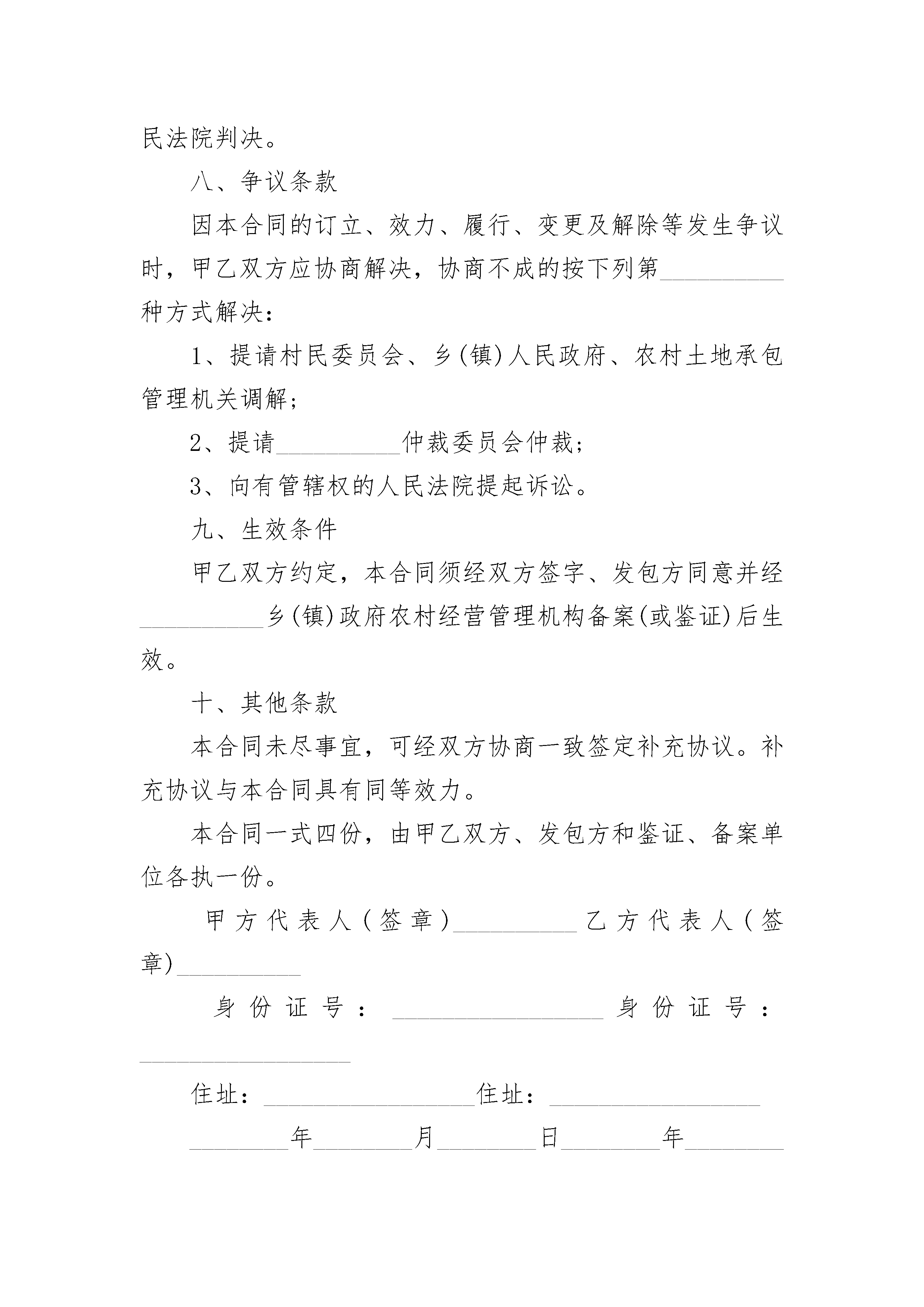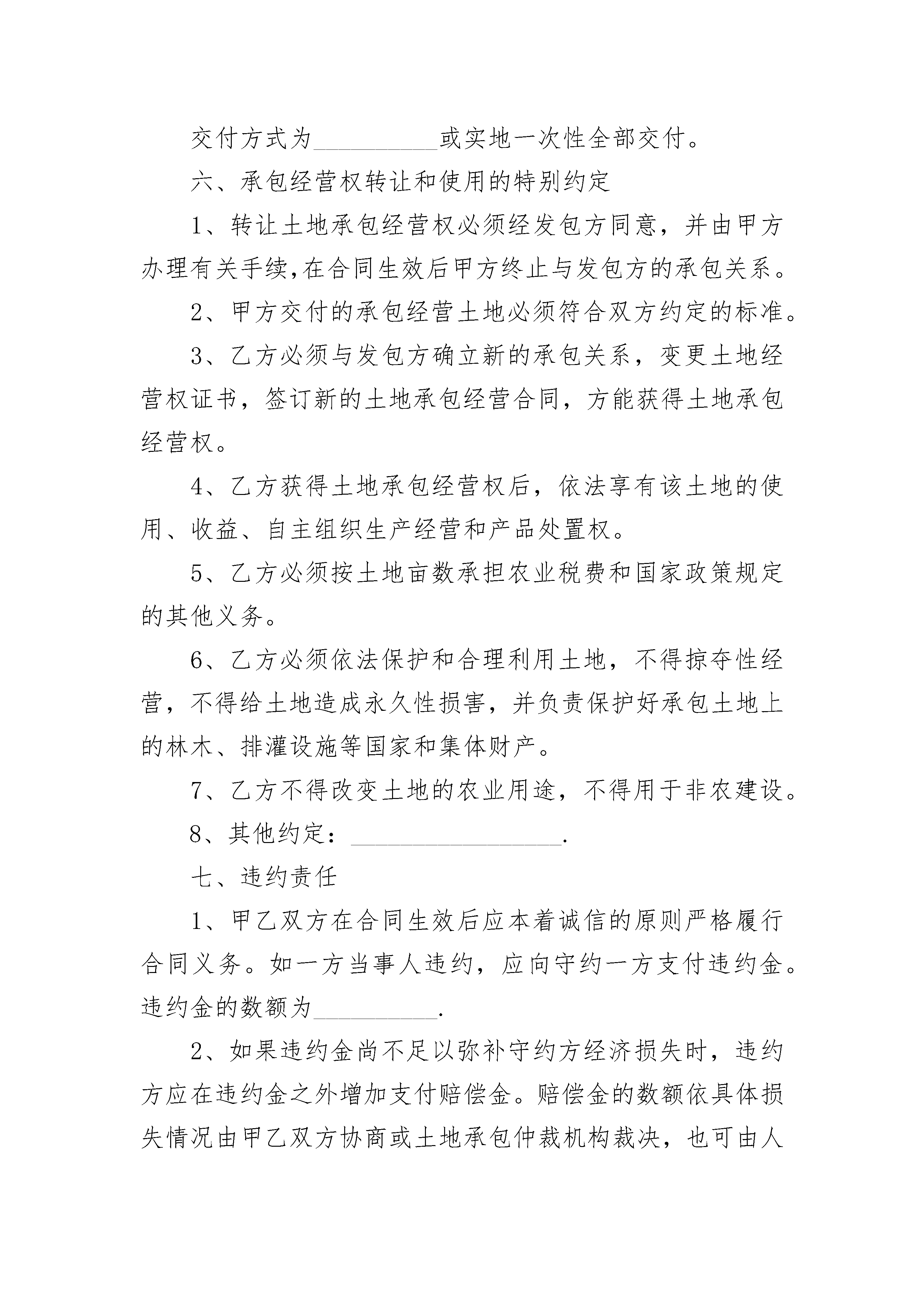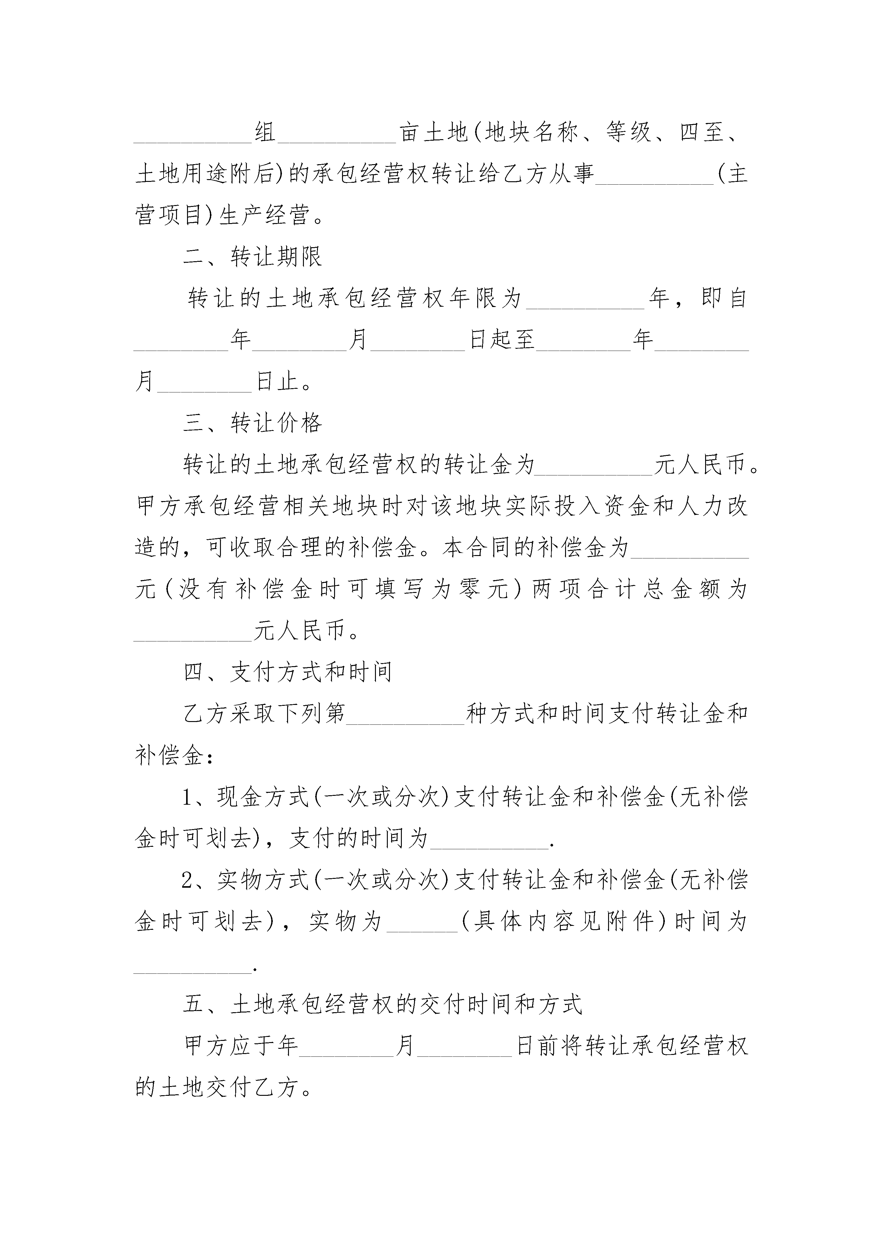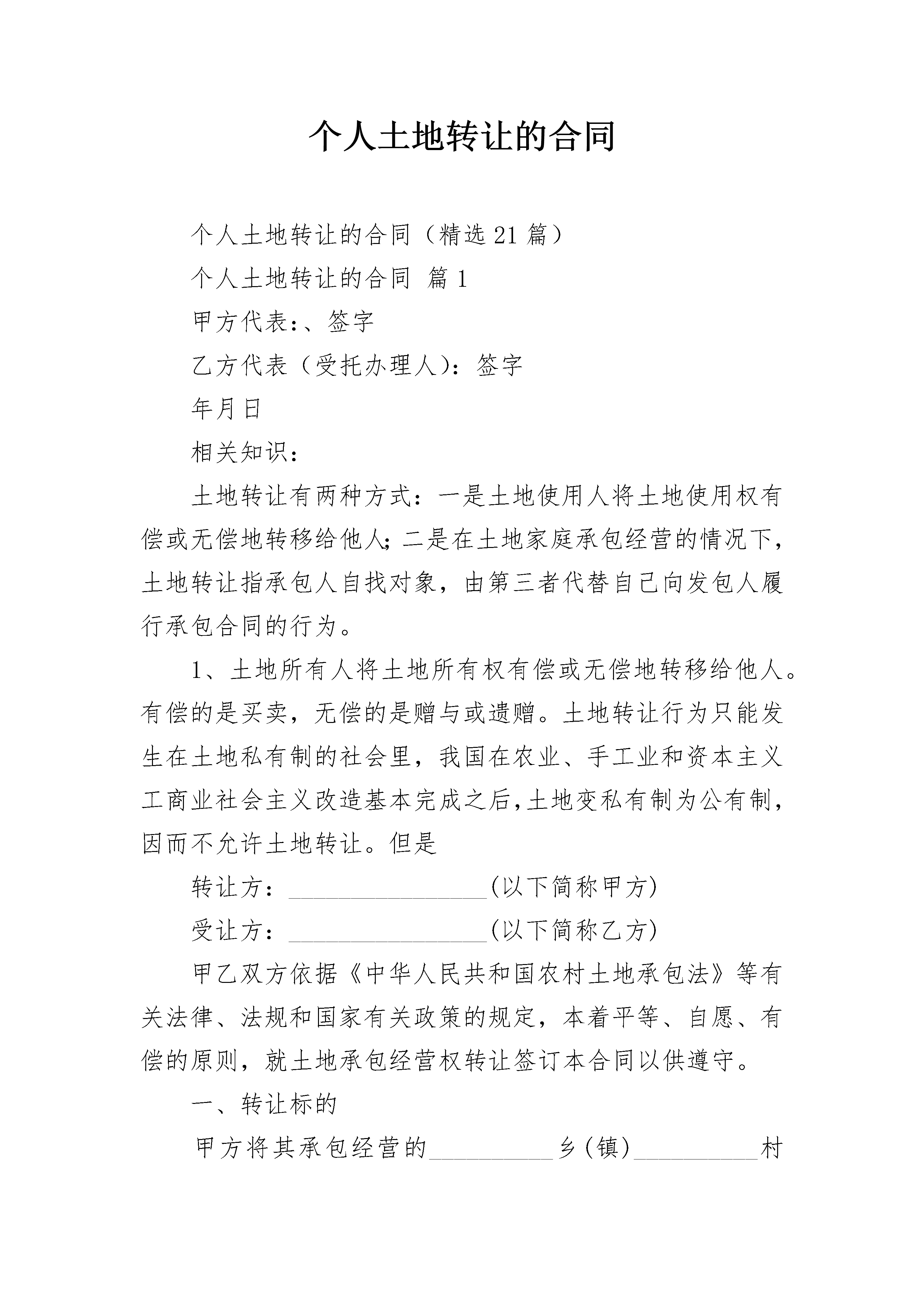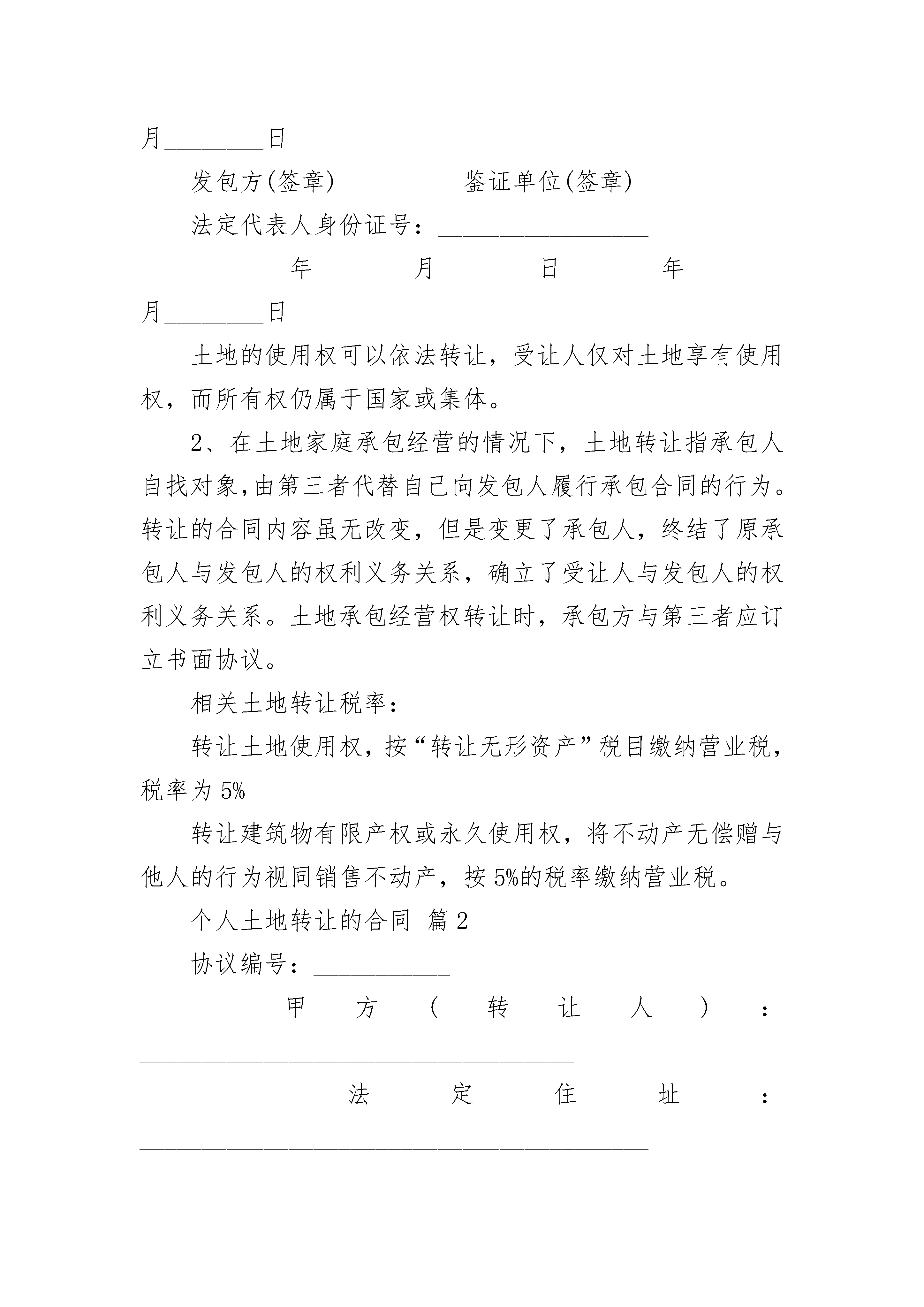 个人土地转让的合同个人土地转让的合同(精选21篇)个人土地转让的合同篇1甲方代表:、签字乙方代表(受托办理人):签字年月日相关知识:土地转让有两种方式:一是土地使用人将土地使用权有偿或无偿地转移给他人;二是在土地家庭承包经营的情况下,土地转让指承包人自找对象,由第三者代替自己向发包人履行承包合同的行为。1、土地所有人将土地所有权有偿或无偿地转移给他人。有偿的是买卖,无偿的是赠与或遗赠。土地转让行为只能发生在土地私有制的社会里,我国在农业、手工业和资本主义工商业社会主义改造基本完成之后,土地变私有制为公有制,因而不允许土地转让。但是转让方:________________(以下简称甲方)受让方:________________(以下简称乙方)甲乙双方依据《中华人民共和国农村土地承包法》等有关法律、法规和国家有关政策的规定,本着平等、自愿、有偿的原则,就土地承包经营权转让签订本合同以供遵守。一、转让标的甲方将其承包经营的__________乡(镇)__________村__________组__________亩土地(地块名称、等级、四至、土地用途附后)的承包经营权转让给乙方从事__________(主营项目)生产经营。二、转让期限转让的土地承包经营权年限为__________年,即自________年________月________日起至________年________月________日止。三、转让价格转让的土地承包经营权的转让金为__________元人民币。甲方承包经营相关地块时对该地块实际投入资金和人力改造的,可收取合理的补偿金。本合同的补偿金为__________元(没有补偿金时可填写为零元)两项合计总金额为__________元人民币。四、支付方式和时间乙方采取下列第__________种方式和时间支付转让金和补偿金:1、现金方式(一次或分次)支付转让金和补偿金(无补偿金时可划去),支付的时间为__________.2、实物方式(一次或分次)支付转让金和补偿金(无补偿金时可划去),实物为______(具体内容见附件)时间为__________.五、土地承包经营权的交付时间和方式甲方应于年________月________日前将转让承包经营权的土地交付乙方。交付方式为__________或实地一次性全部交付。六、承包经营权转让和使用的特别约定1、转让土地承包经营权必须经发包方同意,并由甲方办理有关手续,在合同生效后甲方终止与发包方的承包关系。2、甲方交付的承包经营土地必须符合双方约定的标准。3、乙方必须与发包方确立新的承包关系,变更土地经营权证书,签订新的土地承包经营合同,方能获得土地承包经营权。4、乙方获得土地承包经营权后,依法享有该土地的使用、收益、自主组织生产经营和产品处置权。5、乙方必须按土地亩数承担农业税费和国家政策规定的其他义务。6、乙方必须依法保护和合理利用土地,不得掠夺性经营,不得给土地造成永久性损害,并负责保护好承包土地上的林木、排灌设施等国家和集体财产。7、乙方不得改变土地的农业用途,不得用于非农建设。8、其他约定:_________________.七、违约责任1、甲乙双方在合同生效后应本着诚信的原则严格履行合同义务。如一方当事人违约,应向守约一方支付违约金。违约金的数额为__________.2、如果违约金尚不足以弥补守约方经济损失时,违约方应在违约金之外增加支付赔偿金。赔偿金的数额依具体损失情况由甲乙双方协商或土地承包仲裁机构裁决,也可由人民法院判决。八、争议条款因本合同的订立、效力、履行、变更及解除等发生争议时,甲乙双方应协商解决,协商不成的按下列第__________种方式解决:1、提请村民委员会、乡(镇)人民政府、农村土地承包管理机关调解;2、提请__________仲裁委员会仲裁;3、向有管辖权的人民法院提起诉讼。九、生效条件甲乙双方约定,本合同须经双方签字、发包方同意并经__________乡(镇)政府农村经营管理机构备案(或鉴证)后生效。十、其他条款本合同未尽事宜,可经双方协商一致签定补充协议。补充协议与本合同具有同等效力。本合同一式四份,由甲乙双方、发包方和鉴证、备案单位各执一份。甲方代表人(签章)__________乙方代表人(签章)__________身份证号:_________________身份证号:_________________住址:_________________住址:_________________________年________月________日________年________月________日发包方(签章)__________鉴证单位(签章)__________法定代表人身份证号:_________________________年___