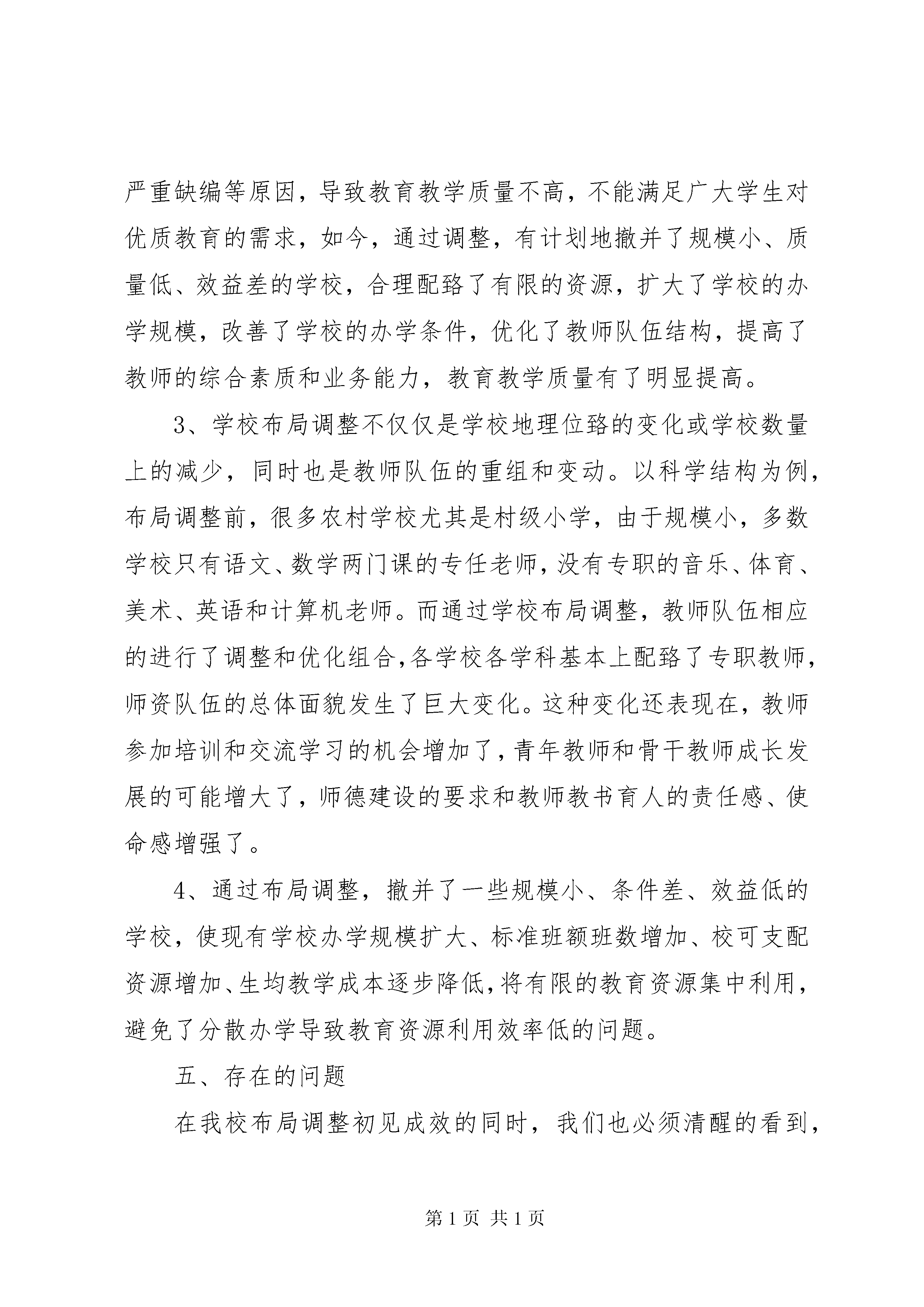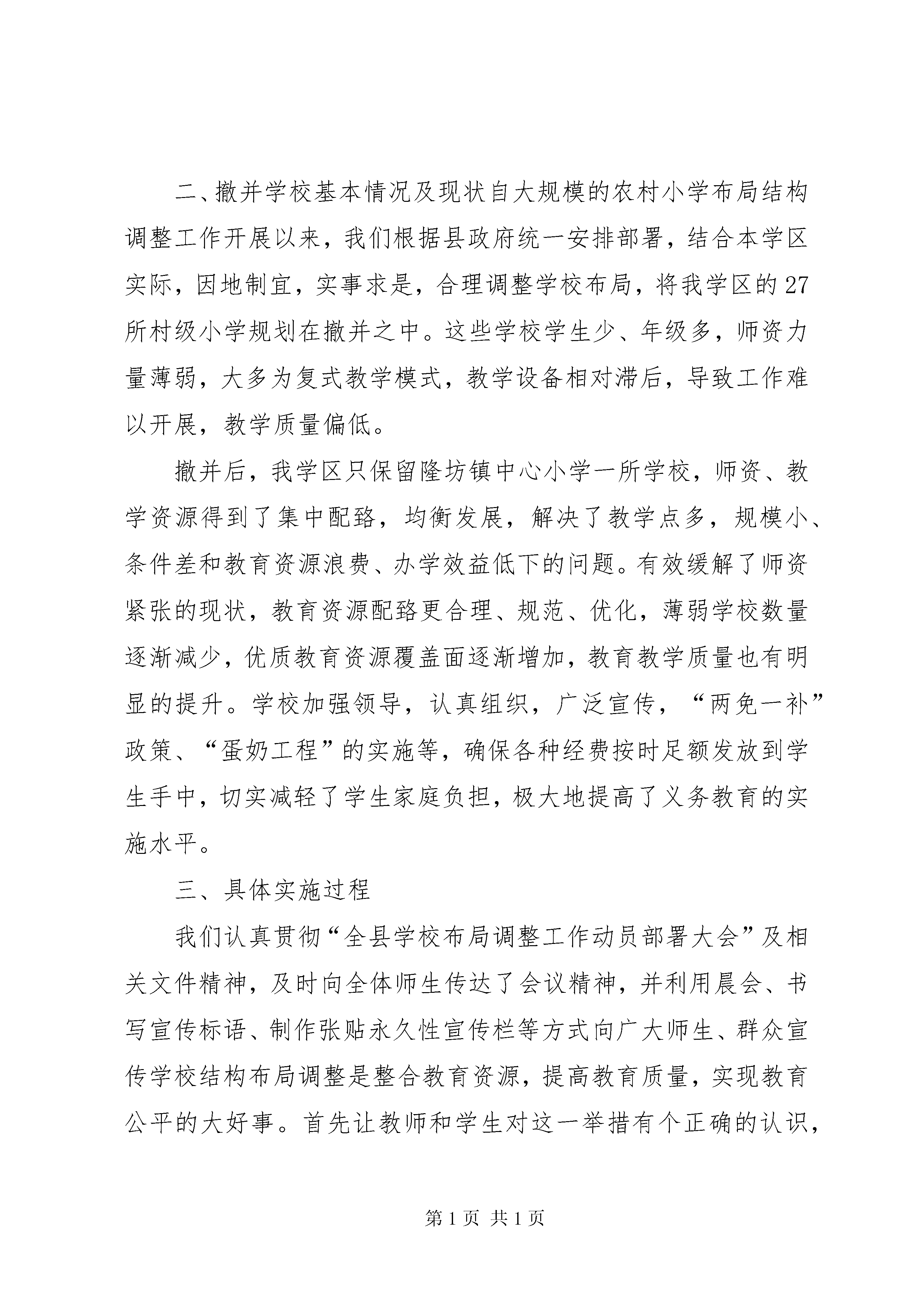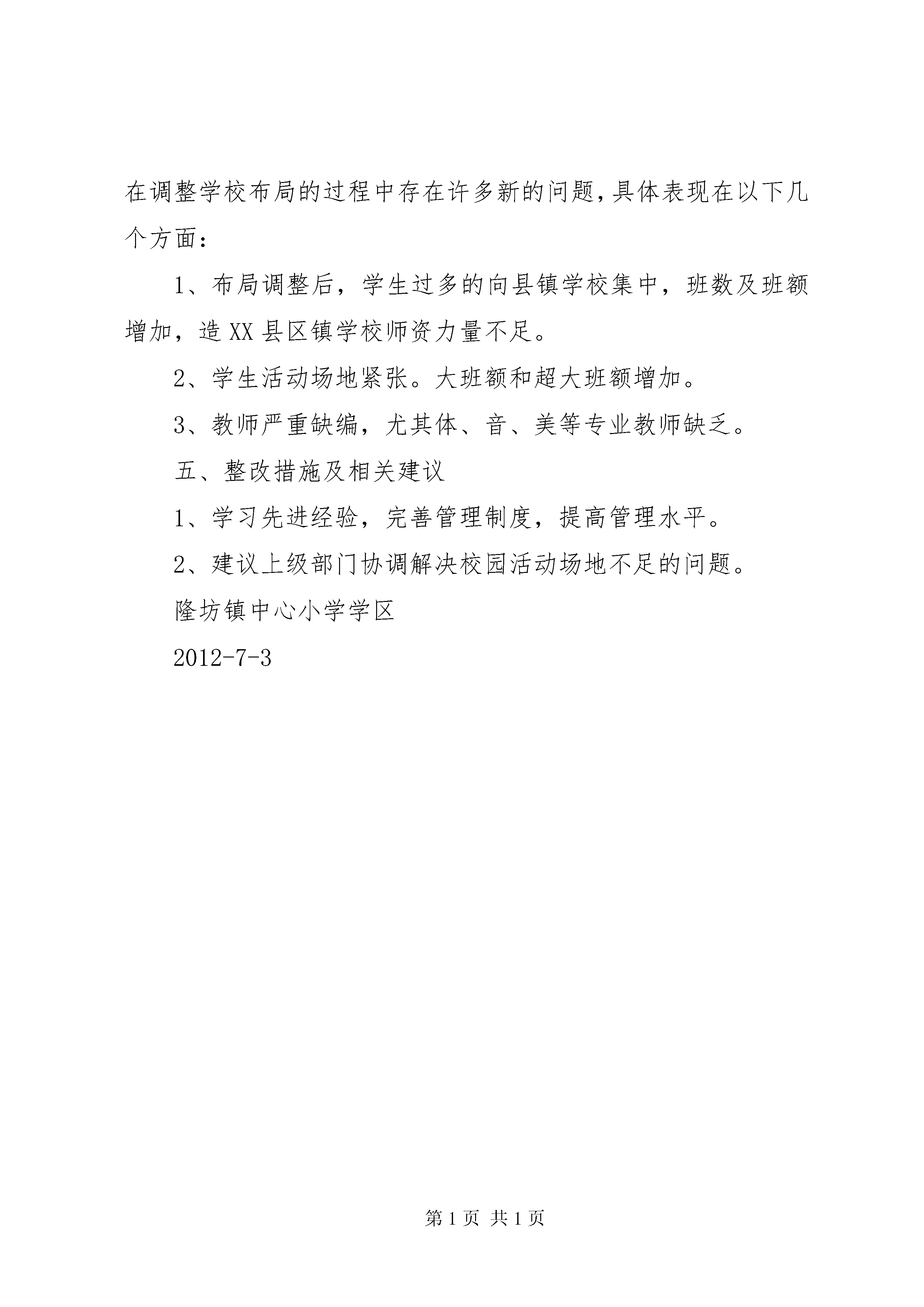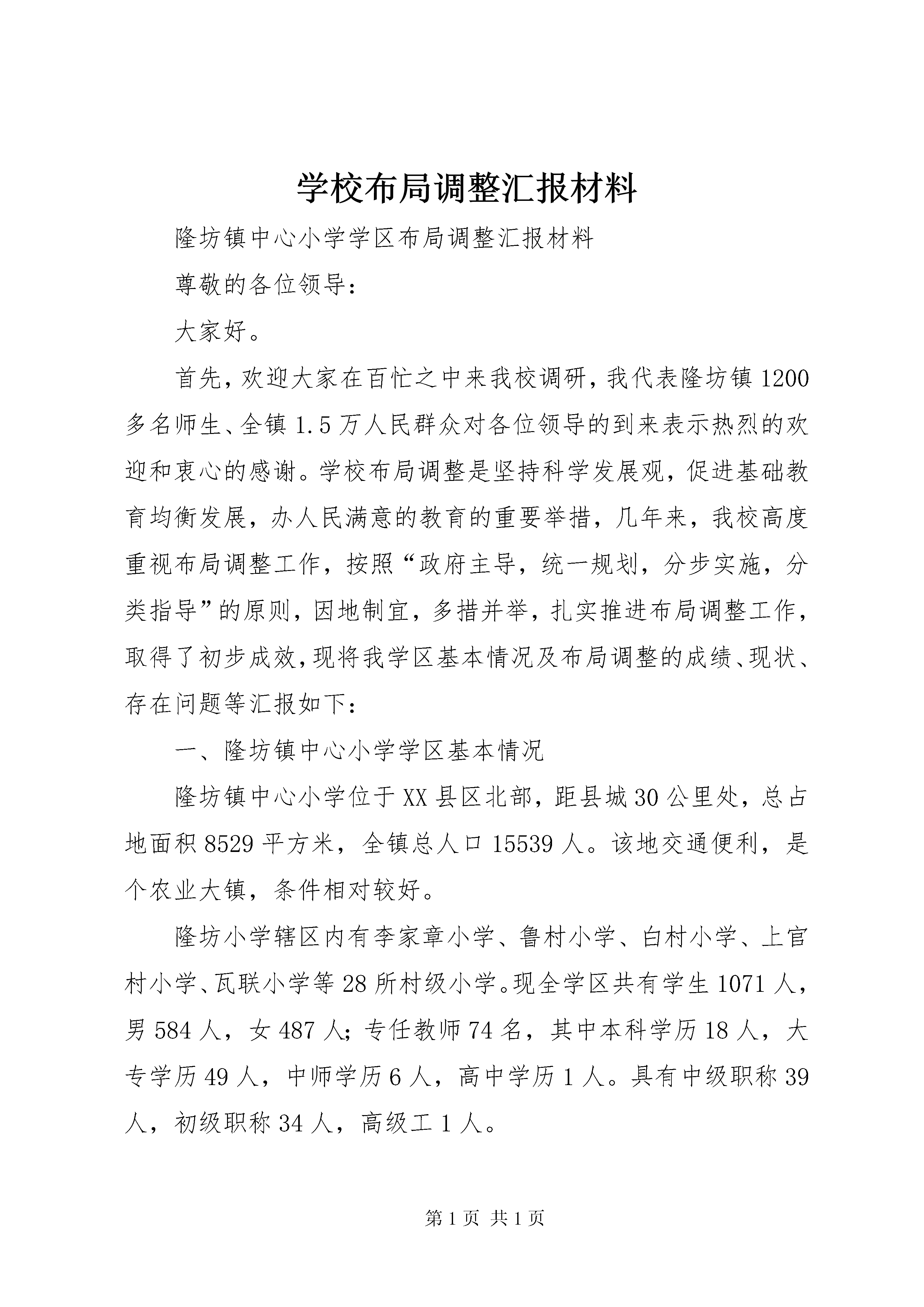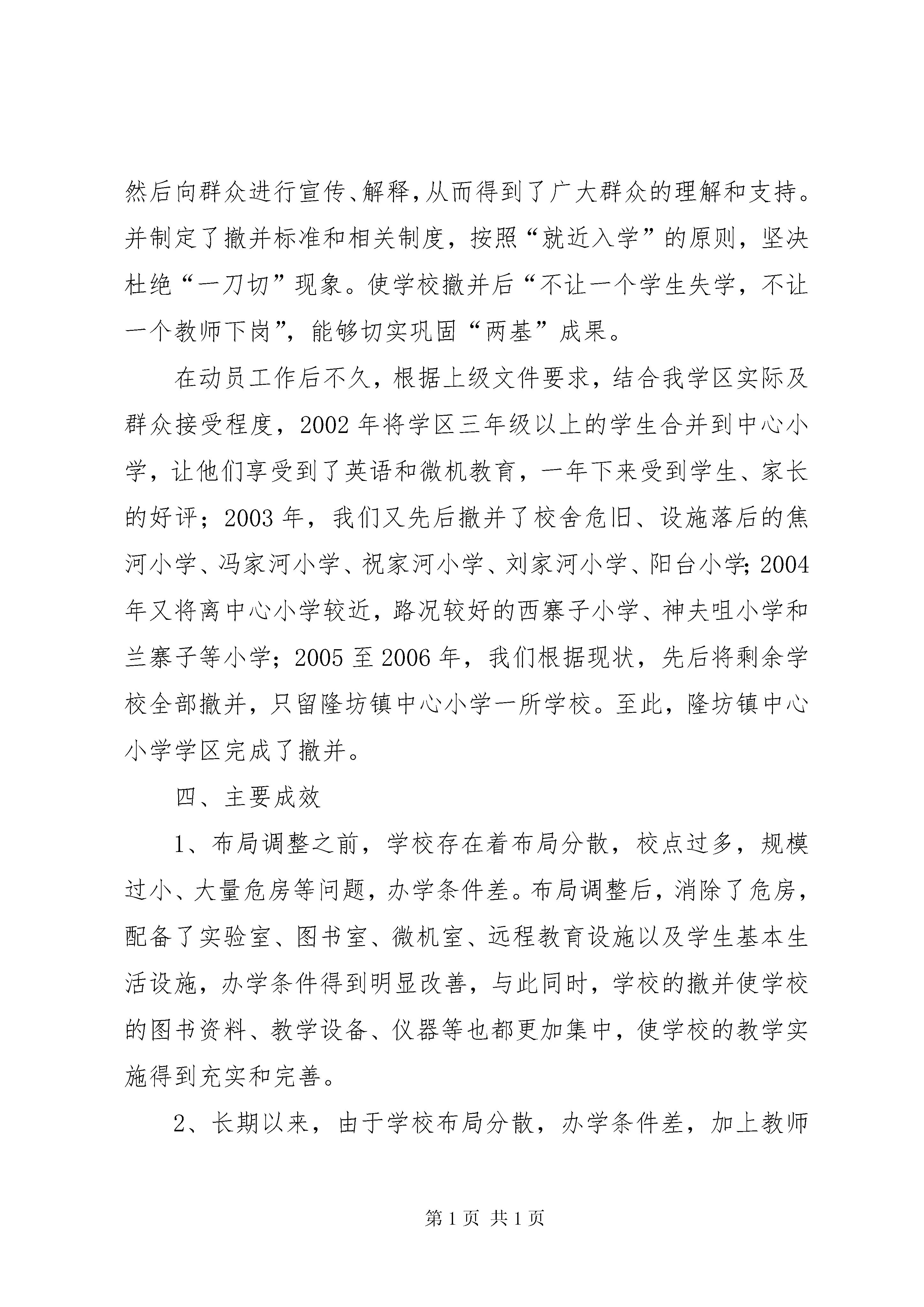 学校布局调整汇报材料隆坊镇中心小学学区布局调整汇报材料尊敬的各位领导:大家好。首先,欢迎大家在百忙之中来我校调研,我代表隆坊镇1200多名师生、全镇1.5万人民群众对各位领导的到来表示热烈的欢迎和衷心的感谢。学校布局调整是坚持科学发展观,促进基础教育均衡发展,办人民满意的教育的重要举措,几年来,我校高度重视布局调整工作,按照“政府主导,统一规划,分步实施,分类指导”的原则,因地制宜,多措并举,扎实推进布局调整工作,取得了初步成效,现将我学区基本情况及布局调整的成绩、现状、存在问题等汇报如下:一、隆坊镇中心小学学区基本情况隆坊镇中心小学位于XX县区北部,距县城30公里处,总占地面积8529平方米,全镇总人口15539人。该地交通便利,是个农业大镇,条件相对较好。隆坊小学辖区内有李家章小学、鲁村小学、白村小学、上官村小学、瓦联小学等28所村级小学。现全学区共有学生1071人,男584人,女487人;专任教师74名,其中本科学历18人,大专学历49人,中师学历6人,高中学历1人。具有中级职称39人,初级职称34人,高级工1人。二、撤并学校基本情况及现状自大规模的农村小学布局结构调整工作开展以来,我们根据县政府统一安排部署,结合本学区实际,因地制宜,实事求是,合理调整学校布局,将我学区的27所村级小学规划在撤并之中。这些学校学生少、年级多,师资力量薄弱,大多为复式教学模式,教学设备相对滞后,导致工作难以开展,教学质量偏低。撤并后,我学区只保留隆坊镇中心小学一所学校,师资、教学资源得到了集中配臵,均衡发展,解决了教学点多,规模小、条件差和教育资源浪费、办学效益低下的问题。有效缓解了师资紧张的现状,教育资源配臵更合理、规范、优化,薄弱学校数量逐渐减少,优质教育资源覆盖面逐渐增加,教育教学质量也有明显的提升。学校加强领导,认真组织,广泛宣传,“两免一补”政策、“蛋奶工程”的实施等,确保各种经费按时足额发放到学生手中,切实减轻了学生家庭负担,极大地提高了义务教育的实施水平。三、具体实施过程我们认真贯彻“全县学校布局调整工作动员部署大会”及相关文件精神,及时向全体师生传达了会议精神,并利用晨会、书写宣传标语、制作张贴永久性宣传栏等方式向广大师生、群众宣传学校结构布局调整是整合教育资源,提高教育质量,实现教育公平的大好事。首先让教师和学生对这一举措有个正确的认识,然后向群众进行宣传、解释,从而得到了广大群众的理解和支持。并制定了撤并标准和相关制度,按照“就近入学”的原则,坚决杜绝“一刀切”现象。使学校撤并后“不让一个学生失学,不让一个教师下岗”,能够切实巩固“两基”成果。在动员工作后不久,根据上级文件要求,结合我学区实际及群众接受程度,2002年将学区三年级以上的学生合并到中心小学,让他们享受到了英语和微机教育,一年下来受到学生、家长的好评;2003年,我们又先后撤并了校舍危旧、设施落后的焦河小学、冯家河小学、祝家河小学、刘家河小学、阳台小学;2004年又将离中心小学较近,路况较好的西寨子小学、神夫咀小学和兰寨子等小学;2005至2006年,我们根据现状,先后将剩余学校全部撤并,只留隆坊镇中心小学一所学校。至此,隆坊镇中心小学学区完成了撤并。四、主要成效1、布局调整之前,学校存在着布局分散,校点过多,规模过小、大量危房等问题,办学条件差。布局调整后,消除了危房,配备了实验室、图书室、微机室、远程教育设施以及学生基本生活设施,办学条件得到明显改善,与此同时,学校的撤并使学校的图书资料、教学设备、仪器等也都更加集中,使学校的教学实施得到充实和完善。2、长期以来,由于学校布局分散,办学条件差,加上教师严重缺编等原因,导致教育教学质量不高,不能满足广大学生对优质教育的需求,如今,通过调整,有计划地撤并了规模小、质量低、效益差的学校,合理配臵了有限的资源,扩大了学校的办学规模,改善了学校的办学条件,优化了教师队伍结构,提高了教师的综合素质和业务能力,教育教学质量有了明显提高。3、学校布局调整不仅仅是学校地理位臵的变化或学校数量上的减少,同时也是教师队伍的重组和变动。以科学结构为例,布局调整前,很多农村学校尤其是村级小学,由于规模小,多数学校只有语文、数学两门课的专任老师,没有专职的音乐、体育、美术、英语和计算机老师。而通过学校布局调整,教师队伍相应的进行了调整和优化组合,各学校各学科基本上配臵了专职教师,师资队伍的总体面貌发生了巨大变化。这种变化还表现在,教师参加培训和交流学习的机会增加了,青年教师和骨干教师成长发展的可能增大了,师德建设的要求和教师教书育人的责任感、使命感增强了。4、通过布局调整,撤并了一些规模小、条件差、效益低的学校,使现有学校办学规模扩大、标准班额班数增加、校可支配资源增加、生均教学成本逐步降低,将有限的教育