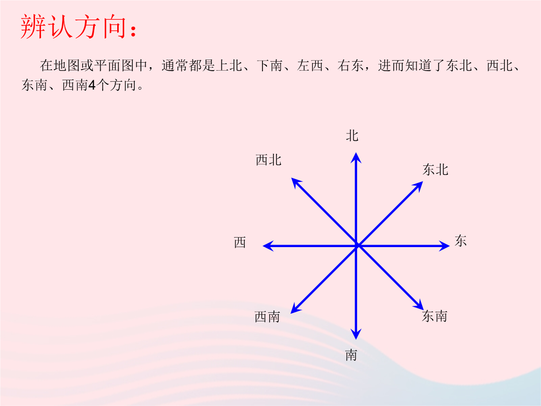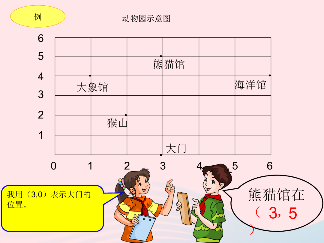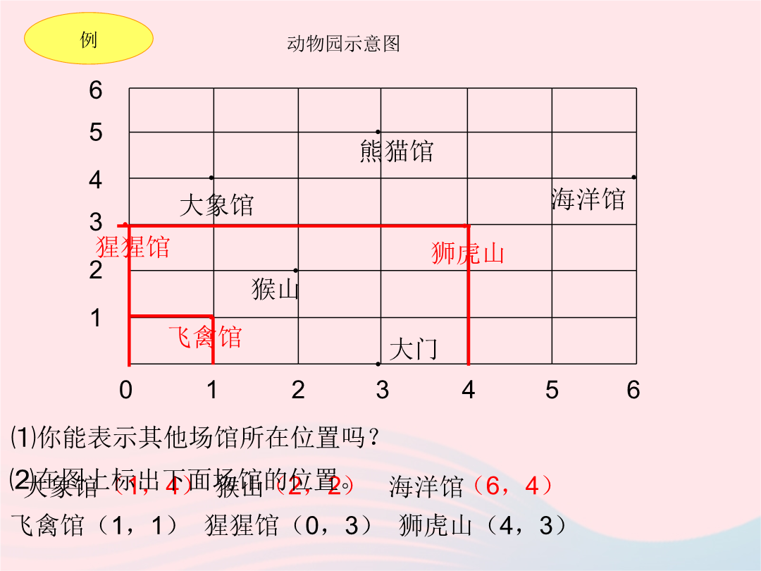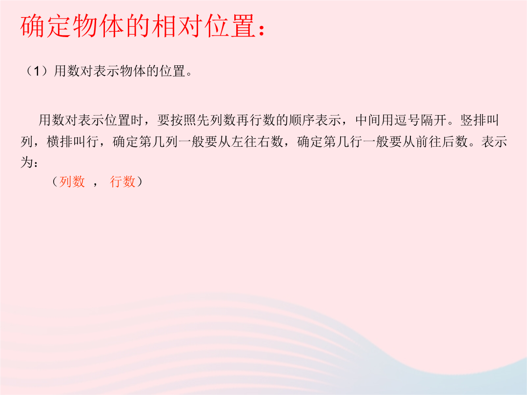 整理与复习辨认方向:确定物体的相对位置:确定物体的相对位置:观察上图。学校在小明家()偏()()的方向上,距离约是()。课⑴用数对表示物体的位置,要先确定(),再确定()。⑷刘强和王兵在教室里的位置可以用点(4,1)和点(2,7)表示,(4,1)中的4表示第4列,则1表示(),(2,7)表明王兵坐在第()列第()行。