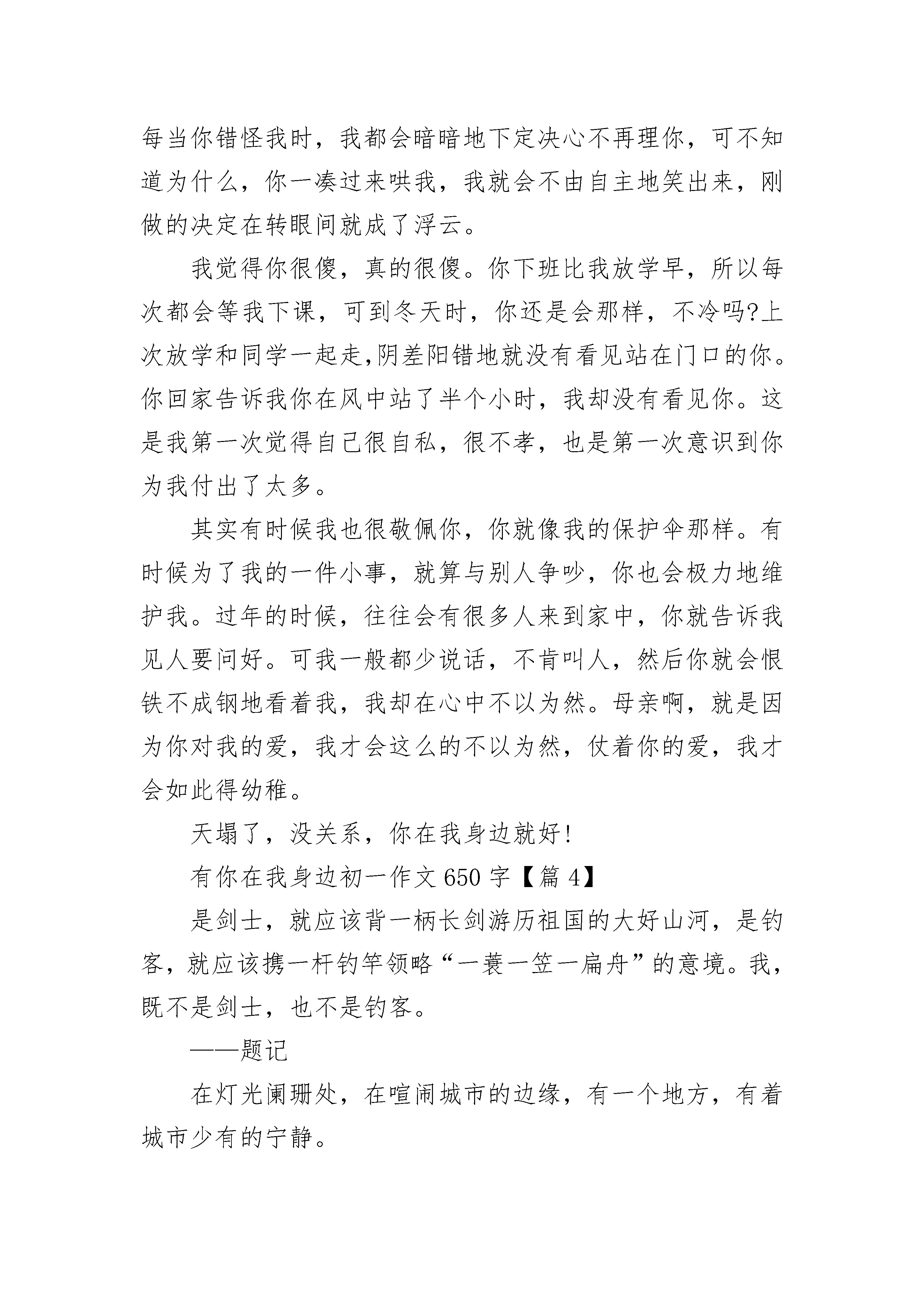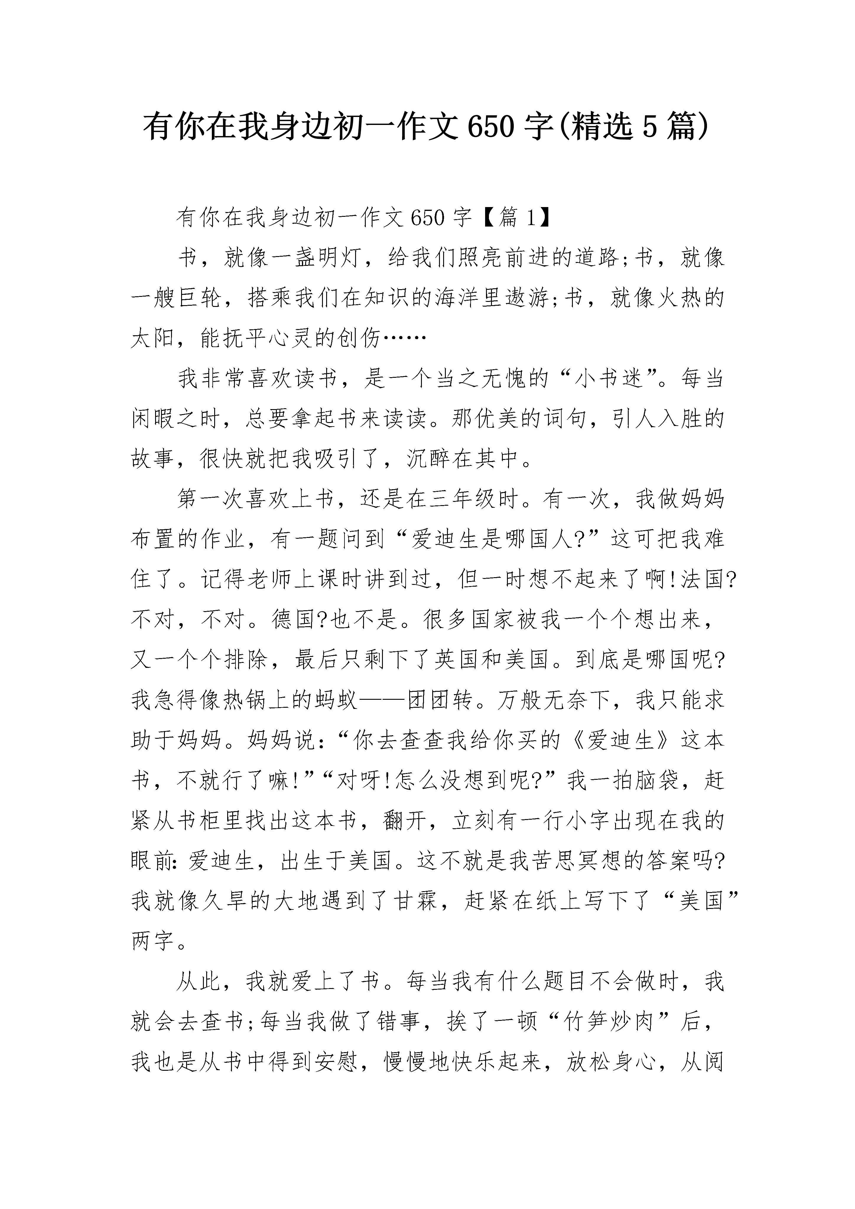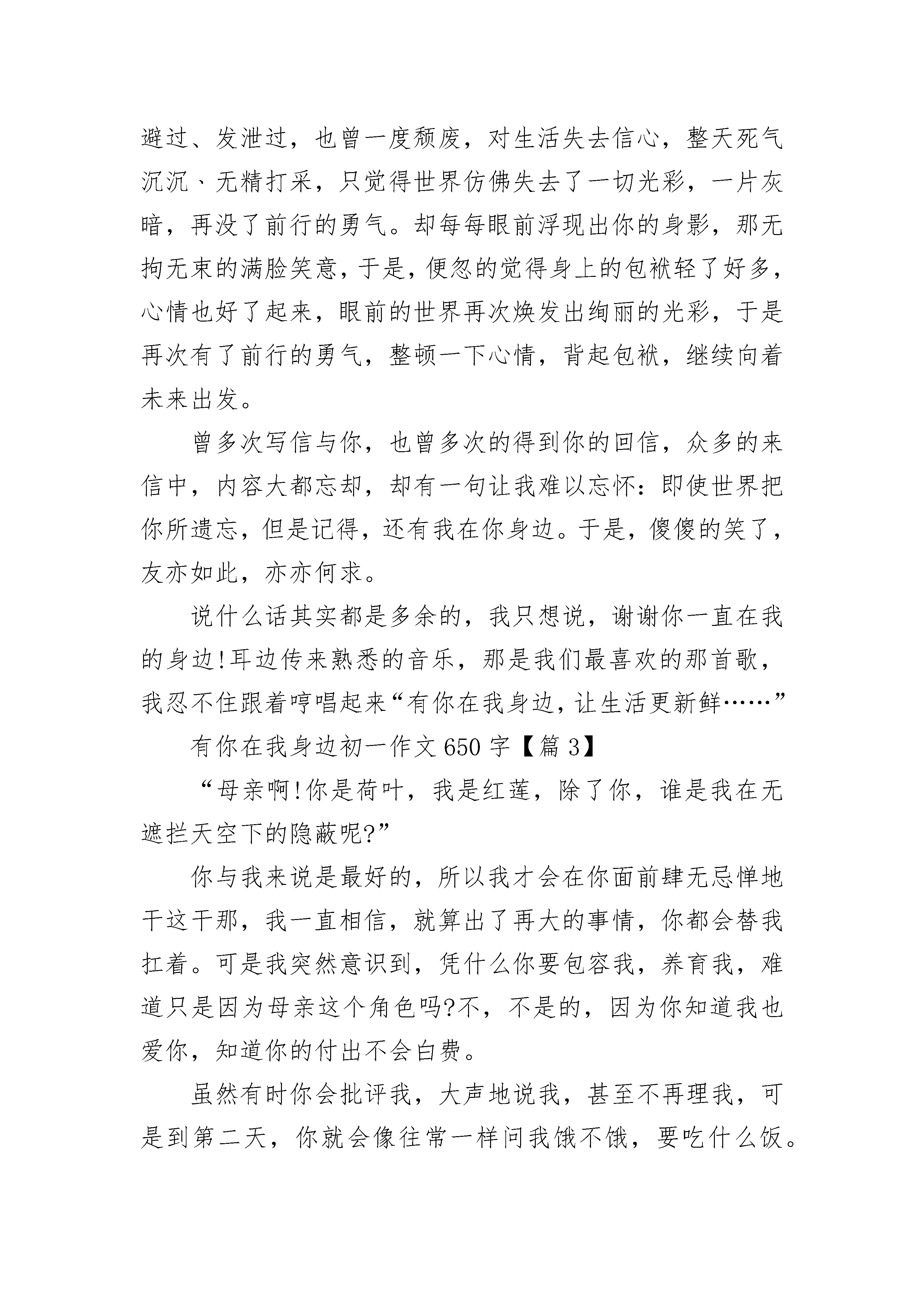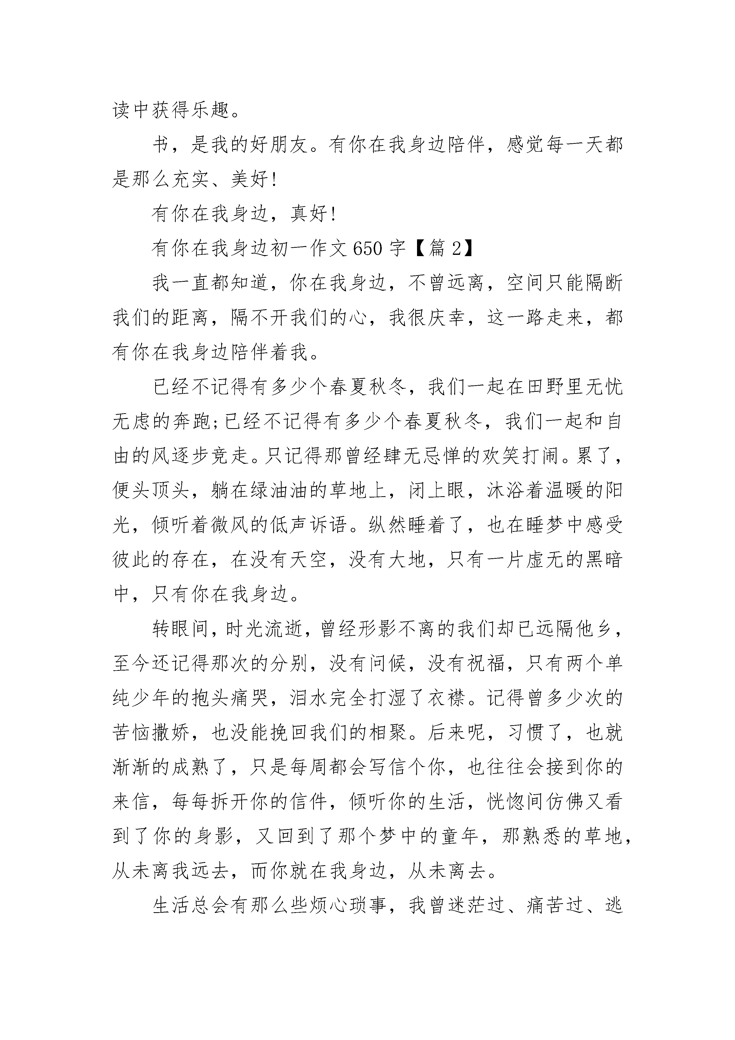 有你在我身边初一作文650字(精选5篇)有你在我身边初一作文650字【篇1】书,就像一盏明灯,给我们照亮前进的道路;书,就像一艘巨轮,搭乘我们在知识的海洋里遨游;书,就像火热的太阳,能抚平心灵的创伤……我非常喜欢读书,是一个当之无愧的“小书迷”。每当闲暇之时,总要拿起书来读读。那优美的词句,引人入胜的故事,很快就把我吸引了,沉醉在其中。第一次喜欢上书,还是在三年级时。有一次,我做妈妈布置的作业,有一题问到“爱迪生是哪国人?”这可把我难住了。记得老师上课时讲到过,但一时想不起来了啊!法国?不对,不对。德国?也不是。很多国家被我一个个想出来,又一个个排除,最后只剩下了英国和美国。到底是哪国呢?我急得像热锅上的蚂蚁——团团转。万般无奈下,我只能求助于妈妈。妈妈说:“你去查查我给你买的《爱迪生》这本书,不就行了嘛!”“对呀!怎么没想到呢?”我一拍脑袋,赶紧从书柜里找出这本书,翻开,立刻有一行小字出现在我的眼前:爱迪生,出生于美国。这不就是我苦思冥想的答案吗?我就像久旱的大地遇到了甘霖,赶紧在纸上写下了“美国”两字。从此,我就爱上了书。每当我有什么题目不会做时,我就会去查书;每当我做了错事,挨了一顿“竹笋炒肉”后,我也是从书中得到安慰,慢慢地快乐起来,放松身心,从阅读中获得乐趣。书,是我的好朋友。有你在我身边陪伴,感觉每一天都是那么充实、美好!有你在我身边,真好!有你在我身边初一作文650字【篇2】我一直都知道,你在我身边,不曾远离,空间只能隔断我们的距离,隔不开我们的心,我很庆幸,这一路走来,都有你在我身边陪伴着我。已经不记得有多少个春夏秋冬,我们一起在田野里无忧无虑的奔跑;已经不记得有多少个春夏秋冬,我们一起和自由的风逐步竞走。只记得那曾经肆无忌惮的欢笑打闹。累了,便头顶头,躺在绿油油的草地上,闭上眼,沐浴着温暖的阳光,倾听着微风的低声诉语。纵然睡着了,也在睡梦中感受彼此的存在,在没有天空,没有大地,只有一片虚无的黑暗中,只有你在我身边。转眼间,时光流逝,曾经形影不离的我们却已远隔他乡,至今还记得那次的分别,没有问候,没有祝福,只有两个单纯少年的抱头痛哭,泪水完全打湿了衣襟。记得曾多少次的苦恼撒娇,也没能挽回我们的相聚。后来呢,习惯了,也就渐渐的成熟了,只是每周都会写信个你,也往往会接到你的来信,每每拆开你的信件,倾听你的生活,恍惚间仿佛又看到了你的身影,又回到了那个梦中的童年,那熟悉的草地,从未离我远去,而你就在我身边,从未离去。生活总会有那么些烦心琐事,我曾迷茫过、痛苦过、逃避过、发泄过,也曾一度颓废,对生活失去信心,整天死气沉沉﹑无精打采,只觉得世界仿佛失去了一切光彩,一片灰暗,再没了前行的勇气。却每每眼前浮现出你的身影,那无拘无束的满脸笑意,于是,便忽的觉得身上的包袱轻了好多,心情也好了起来,眼前的世界再次焕发出绚丽的光彩,于是再次有了前行的勇气,整顿一下心情,背起包袱,继续向着未来出发。曾多次写信与你,也曾多次的得到你的回信,众多的来信中,内容大都忘却,却有一句让我难以忘怀:即使世界把你所遗忘,但是记得,还有我在你身边。于是,傻傻的笑了,友亦如此,亦亦何求。说什么话其实都是多余的,我只想说,谢谢你一直在我的身边!耳边传来熟悉的音乐,那是我们最喜欢的那首歌,我忍不住跟着哼唱起来“有你在我身边,让生活更新鲜……”有你在我身边初一作文650字【篇3】“母亲啊!你是荷叶,我是红莲,除了你,谁是我在无遮拦天空下的隐蔽呢?”你与我来说是最好的,所以我才会在你面前肆无忌惮地干这干那,我一直相信,就算出了再大的事情,你都会替我扛着。可是我突然意识到,凭什么你要包容我,养育我,难道只是因为母亲这个角色吗?不,不是的,因为你知道我也爱你,知道你的付出不会白费。虽然有时你会批评我,大声地说我,甚至不再理我,可是到第二天,你就会像往常一样问我饿不饿,要吃什么饭。每当你错怪我时,我都会暗暗地下定决心不再理你,可不知道为什么,你一凑过来哄我,我就会不由自主地笑出来,刚做的决定在转眼间就成了浮云。我觉得你很傻,真的很傻。你下班比我放学早,所以每次都会等我下课,可到冬天时,你还是会那样,不冷吗?上次放学和同学一起走,阴差阳错地就没有看见站在门口的你。你回家告诉我你在风中站了半个小时,我却没有看见你。这是我第一次觉得自己很自私,很不孝,也是第一次意识到你为我付出了太多。其实有时候我也很敬佩你,你就像我的保护伞那样。有时候为了我的一件小事,就算与别人争吵,你也会极力地维护我。过年的时候,往往会有很多人来到家中,你就告诉我见人要问好。可我一般都少说话,不肯叫人,然后你就会恨铁不成钢地看着我,我却在心中不以为然。母亲啊,就是因为你对我的爱,我才会这么的不以为然,仗着你的爱,我才会如此得幼稚。天塌了,没关系,你在我身边就好!有你在我身边初一作文650字【篇4】