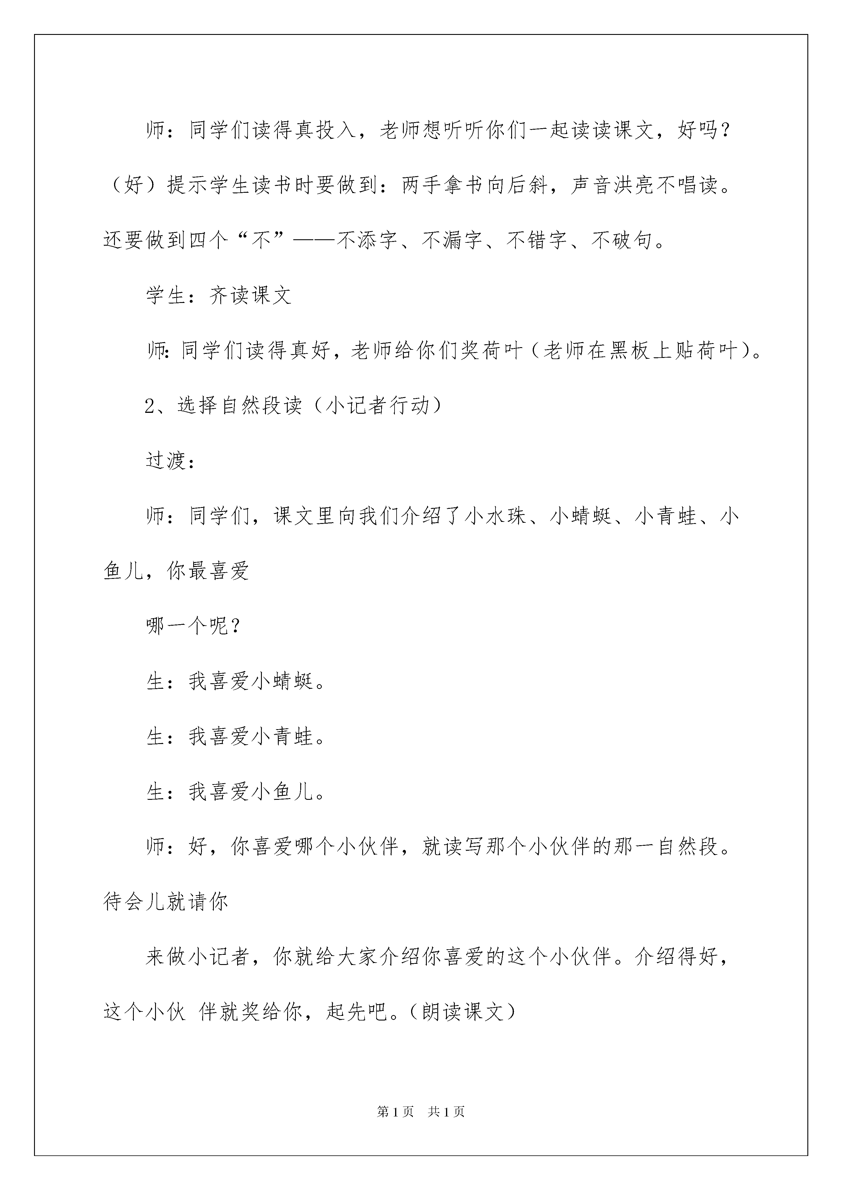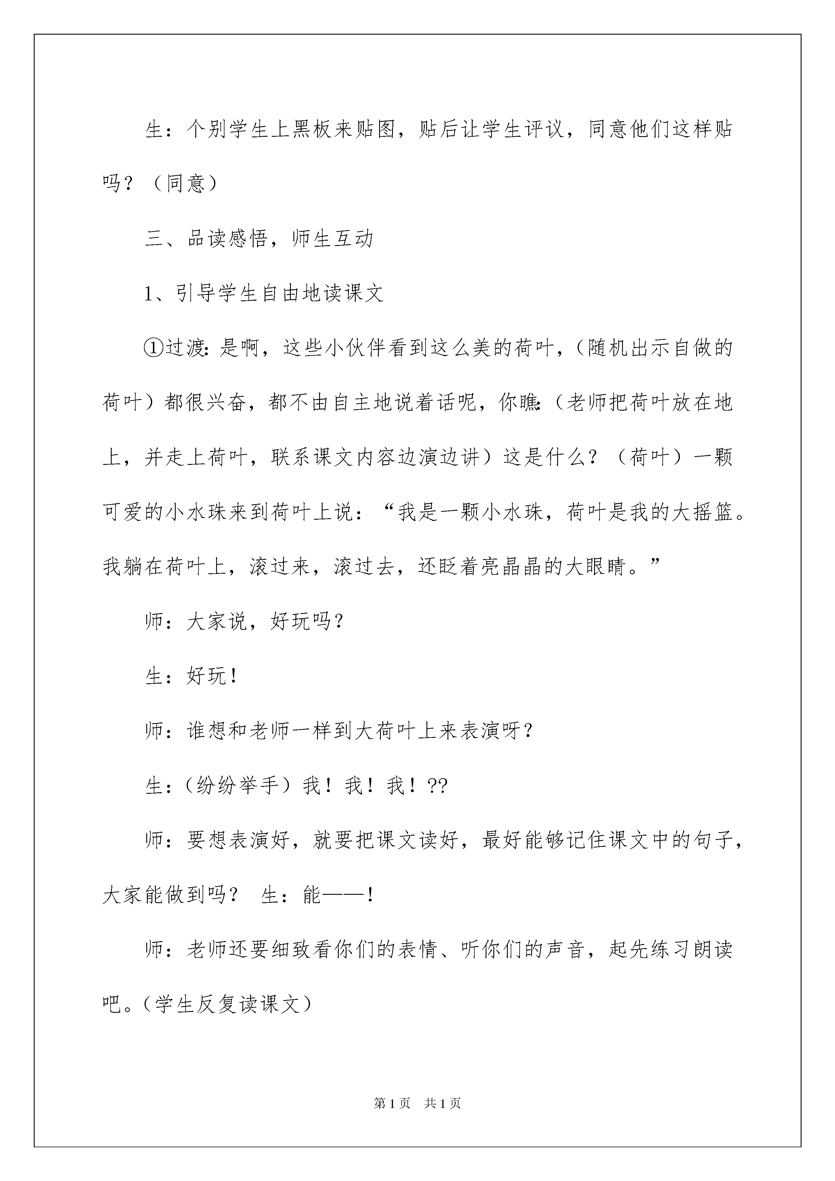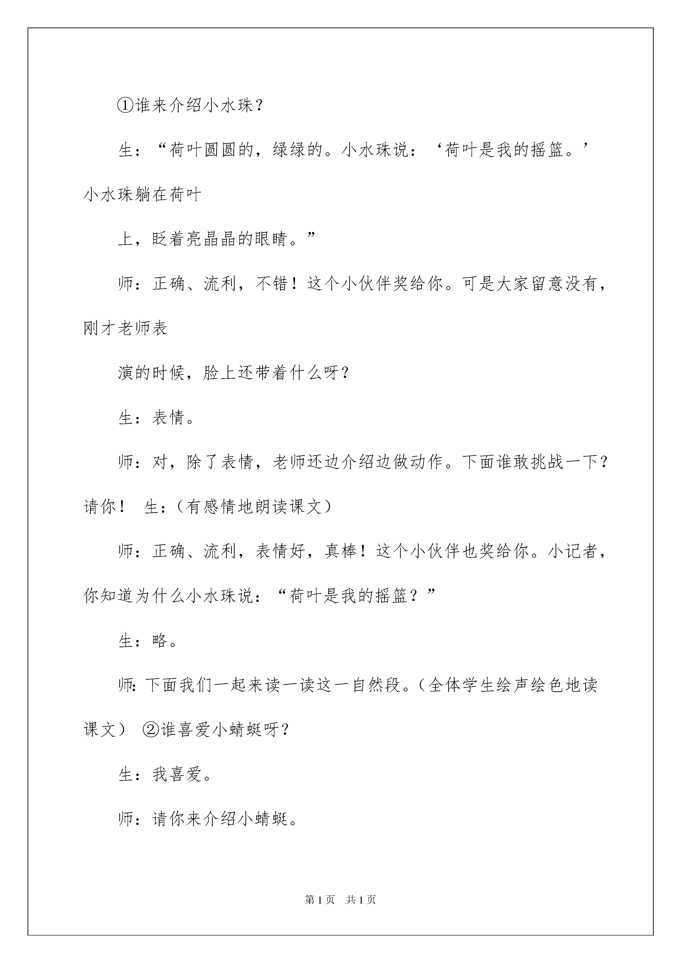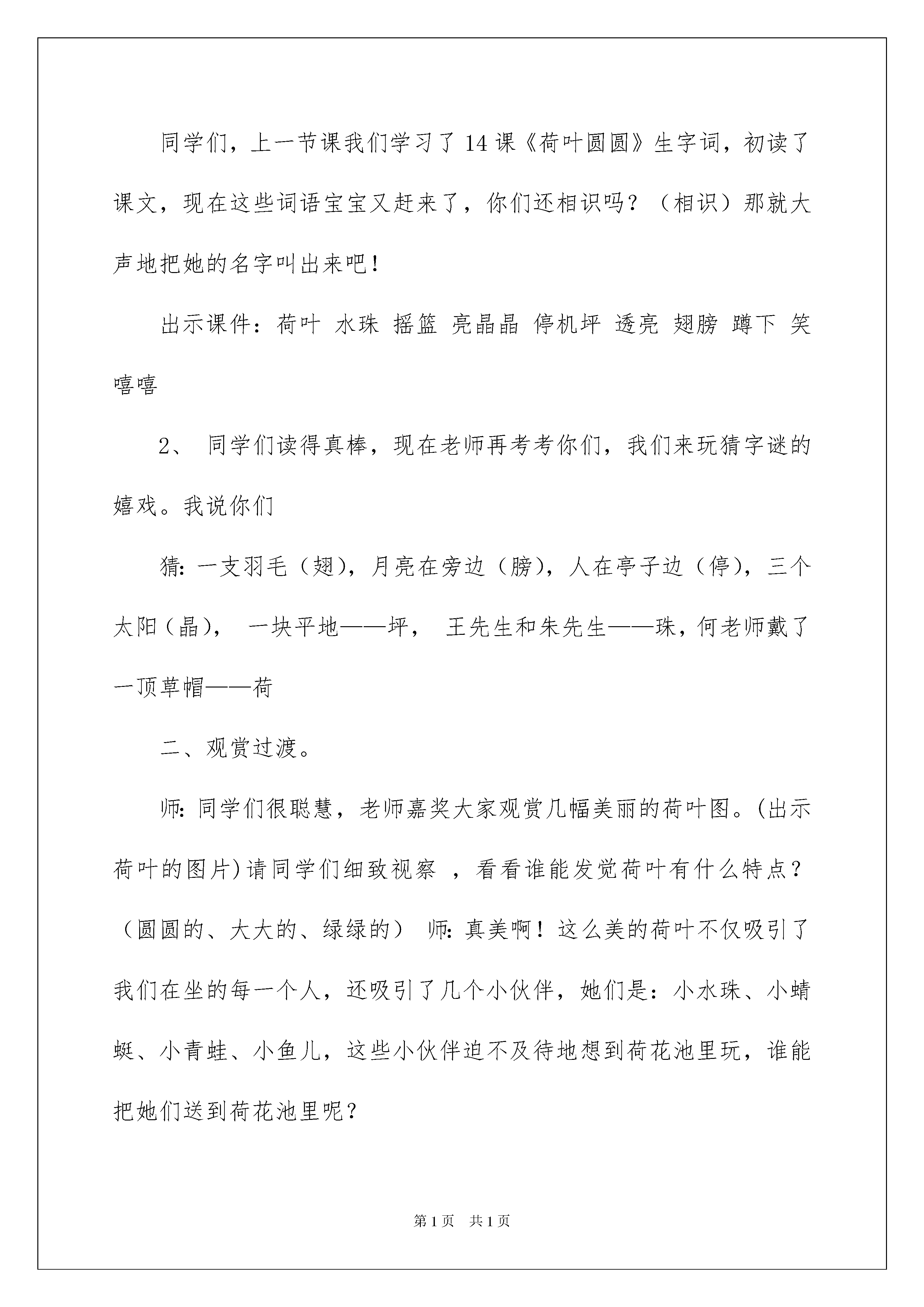 2022《荷叶圆圆》教案好用的《荷叶圆圆》教案3篇作为一位杰出的老师,就难以避开地要打算教案,借助教案可以更好地组织教学活动。那么什么样的教案才是好的呢?下面是我细心整理的《荷叶圆圆》教案3篇,希望对大家有所帮助。《荷叶圆圆》教案篇1学习目标:1、复习巩固12个生字,会写“机”和“朵”2、有感情地朗读、背诵课文3、能依据生活实际,运用多种方式了解文中词句的意思,在阅读中积累语言4、感受夏天的美妙,激发对大自然,对美的憧憬,从而树立爱护大自然的意识教学过程:教学过程:一、复习引入。1、复习生字同学们,上一节课我们学习了14课《荷叶圆圆》生字词,初读了课文,现在这些词语宝宝又赶来了,你们还相识吗?(相识)那就大声地把她的名字叫出来吧!出示课件:荷叶水珠摇篮亮晶晶停机坪透亮翅膀蹲下笑嘻嘻2、同学们读得真棒,现在老师再考考你们,我们来玩猜字谜的嬉戏。我说你们猜:一支羽毛(翅),月亮在旁边(膀),人在亭子边(停),三个太阳(晶),一块平地——坪,王先生和朱先生——珠,何老师戴了一顶草帽——荷二、观赏过渡。师:同学们很聪慧,老师嘉奖大家观赏几幅美丽的荷叶图。(出示荷叶的图片)请同学们细致视察,看看谁能发觉荷叶有什么特点?(圆圆的、大大的、绿绿的)师:真美啊!这么美的荷叶不仅吸引了我们在坐的每一个人,还吸引了几个小伙伴,她们是:小水珠、小蜻蜓、小青蛙、小鱼儿,这些小伙伴迫不及待地想到荷花池里玩,谁能把她们送到荷花池里呢?生:个别学生上黑板来贴图,贴后让学生评议,同意他们这样贴吗?(同意)三、品读感悟,师生互动1、引导学生自由地读课文①过渡:是啊,这些小伙伴看到这么美的荷叶,(随机出示自做的荷叶)都很兴奋,都不由自主地说着话呢,你瞧:(老师把荷叶放在地上,并走上荷叶,联系课文内容边演边讲)这是什么?(荷叶)一颗可爱的小水珠来到荷叶上说:“我是一颗小水珠,荷叶是我的大摇篮。我躺在荷叶上,滚过来,滚过去,还眨着亮晶晶的大眼睛。”师:大家说,好玩吗?生:好玩!师:谁想和老师一样到大荷叶上来表演呀?生:(纷纷举手)我!我!我!??师:要想表演好,就要把课文读好,最好能够记住课文中的句子,大家能做到吗?生:能——!师:老师还要细致看你们的表情、听你们的声音,起先练习朗读吧。(学生反复读课文)师:同学们读得真投入,老师想听听你们一起读读课文,好吗?(好)提示学生读书时要做到:两手拿书向后斜,声音洪亮不唱读。还要做到四个“不”——不添字、不漏字、不错字、不破句。学生:齐读课文师:同学们读得真好,老师给你们奖荷叶(老师在黑板上贴荷叶)。2、选择自然段读(小记者行动)过渡:师:同学们,课文里向我们介绍了小水珠、小蜻蜓、小青蛙、小鱼儿,你最喜爱哪一个呢?生:我喜爱小蜻蜓。生:我喜爱小青蛙。生:我喜爱小鱼儿。师:好,你喜爱哪个小伙伴,就读写那个小伙伴的那一自然段。待会儿就请你来做小记者,你就给大家介绍你喜爱的这个小伙伴。介绍得好,这个小伙伴就奖给你,起先吧。(朗读课文)①谁来介绍小水珠?生:“荷叶圆圆的,绿绿的。小水珠说:‘荷叶是我的摇篮。’小水珠躺在荷叶上,眨着亮晶晶的眼睛。”师:正确、流利,不错!这个小伙伴奖给你。可是大家留意没有,刚才老师表演的时候,脸上还带着什么呀?生:表情。师:对,除了表情,老师还边介绍边做动作。下面谁敢挑战一下?请你!生:(有感情地朗读课文)师:正确、流利,表情好,真棒!这个小伙伴也奖给你。小记者,你知道为什么小水珠说:“荷叶是我的摇篮?”生:略。师:下面我们一起来读一读这一自然段。(全体学生绘声绘色地读课文)②谁喜爱小蜻蜓呀?生:我喜爱。师:请你来介绍小蜻蜓。生:“荷叶圆圆的,绿绿的。小蜻蜓说:‘荷叶是我的停机坪。’小蜻蜓立在荷叶上,绽开柔嫩的翅膀。”师:不错,这个小伙伴奖给你。不过要留意一个字,“翅膀”的“翅”字要翘舌。请跟我读一遍:“翅膀”。生:翅膀。师:全班一起来:翅膀。生:翅膀。师:小记者,你能告知大家,为什么小青蛙说:“荷叶是我的停机坪?”生:略师:(指着黑板上未绽开的“荷叶”和“小蜻蜓”)问:“看到这未绽开的荷叶和蜻蜓,大家想到了哪句诗?生:“小荷才露尖尖角,早有蜻蜓立上头。”师:这是我们前一课学的古诗《小池》,我们大家一起来把这首古诗背一遍,好吗?生:好!师:“立”是什么意思,你能找一个词换一换吗?生:“站”。师:“绽开”又可以找什么词来换呢?生:“张开”。师:我们一起来读读这一段。生:学生齐读这一段。③谁来介绍小青蛙?生:我来介绍。师:好啊!大家留意听他(她)读,留意看他(她)的表情。生:“荷叶圆圆的,绿绿的。小青蛙说:‘荷叶是我的歌台。’小青蛙蹲在荷叶上,呱呱地